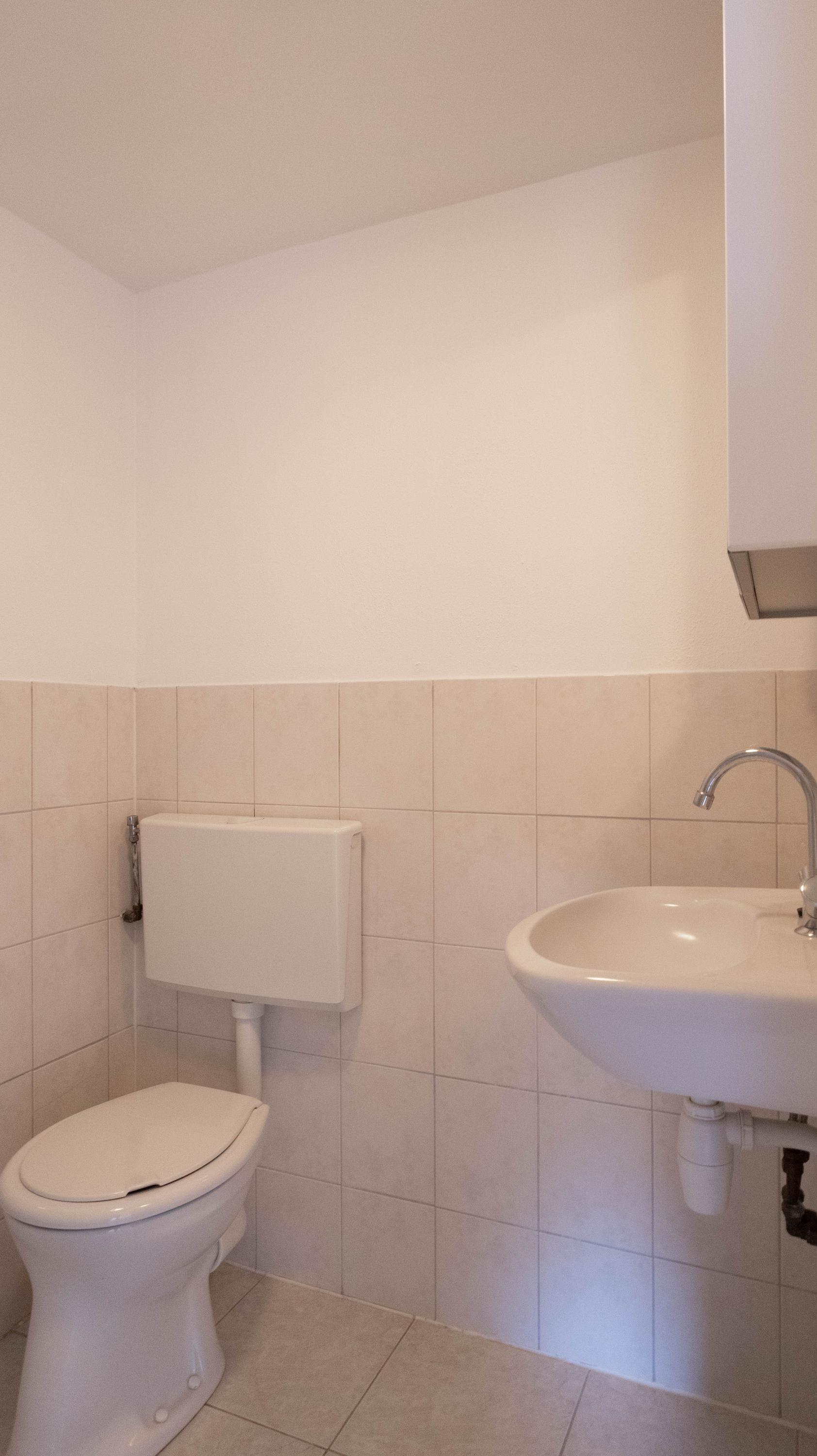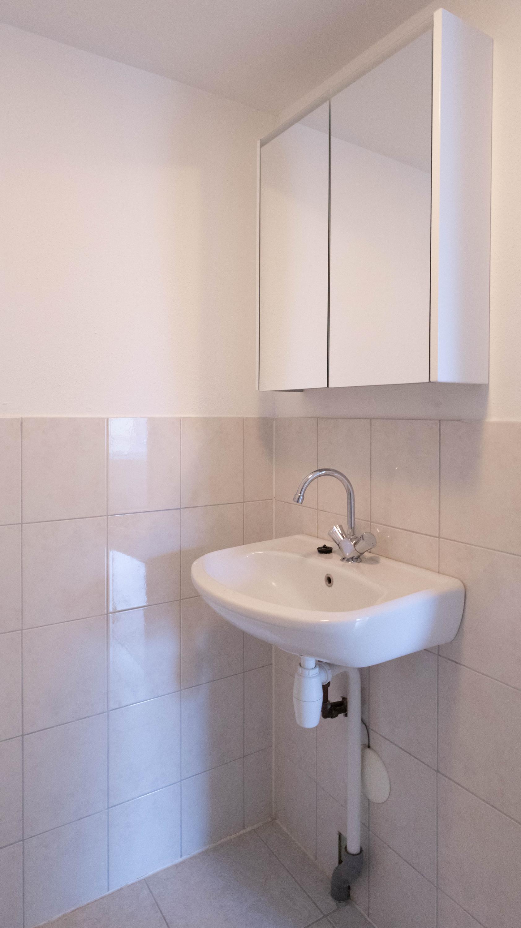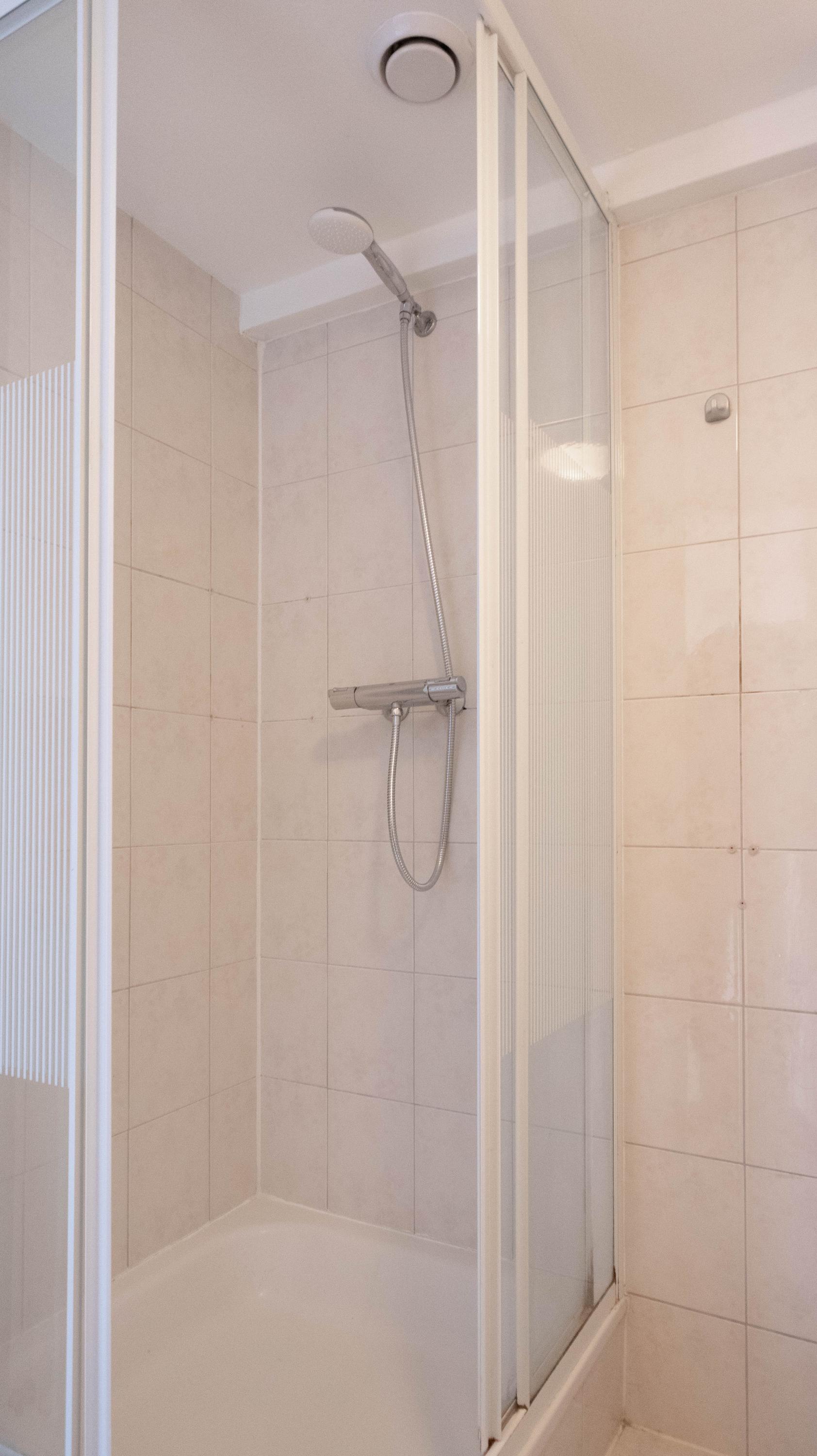 The apartment is accessed via the shared entrance and staircase. Upon entering, you will find a welcoming living room with large windows that provide plenty of natural light. The open kitchen is practical in layout and equipped with the necessary appliances. The bedroom offers ample space and features built-in wardrobe storage. The bathroom is neatly finished and fitted with a shower, toilet, and washbasin.
