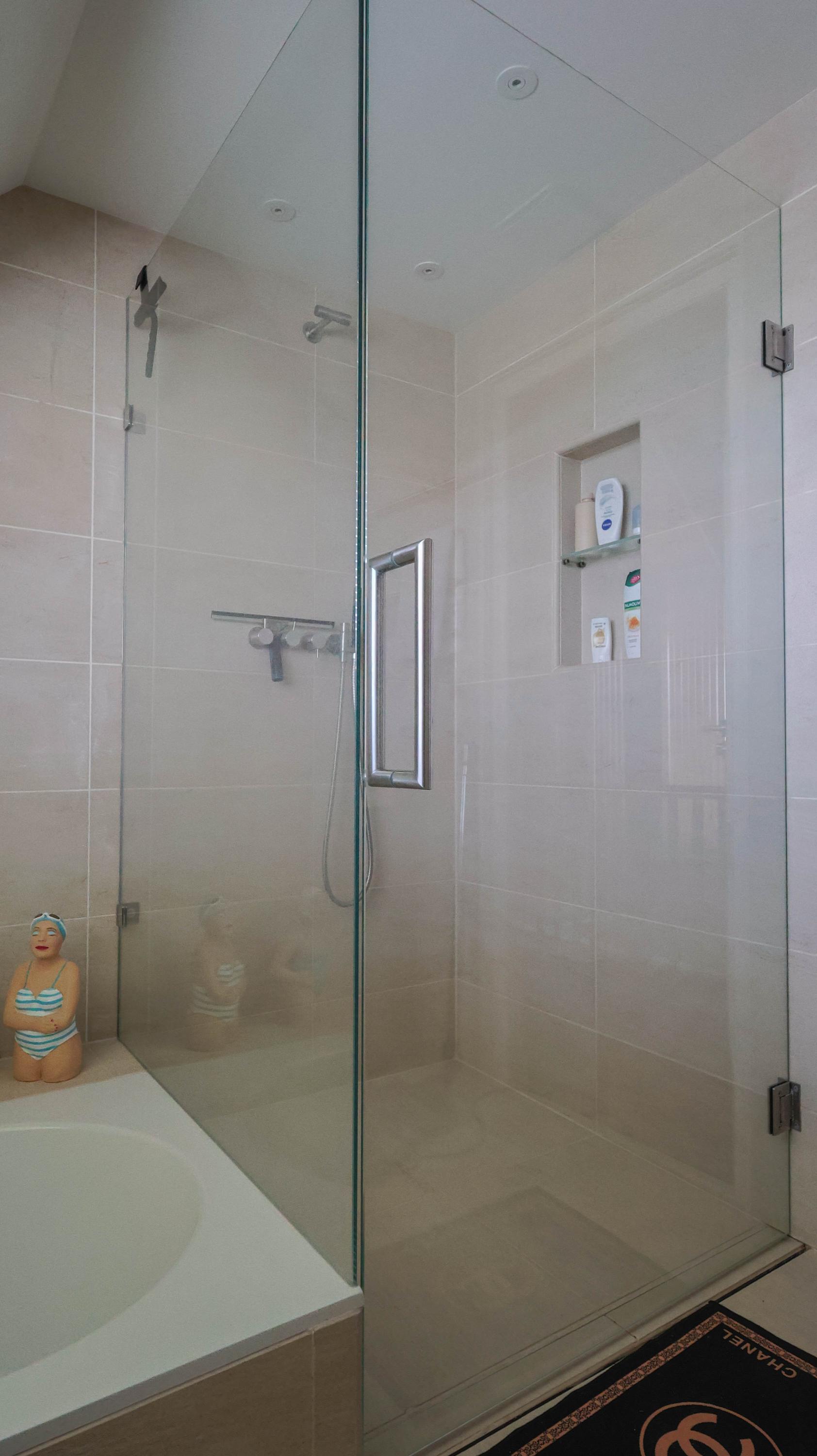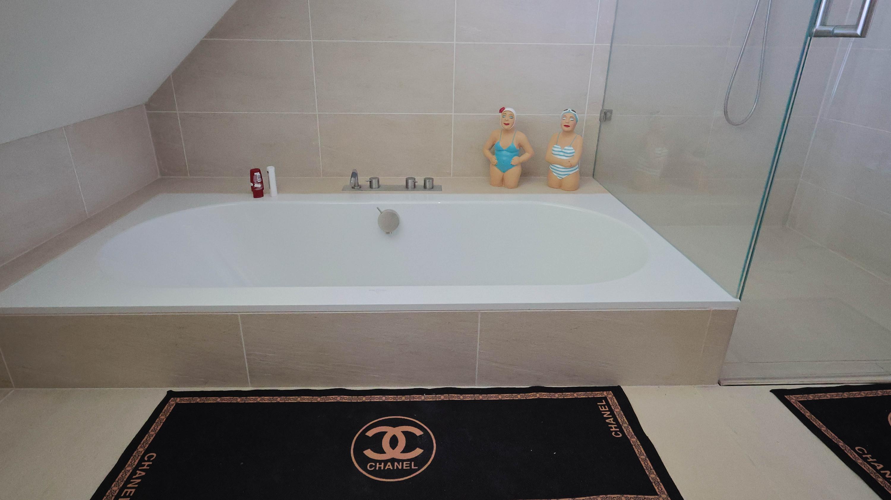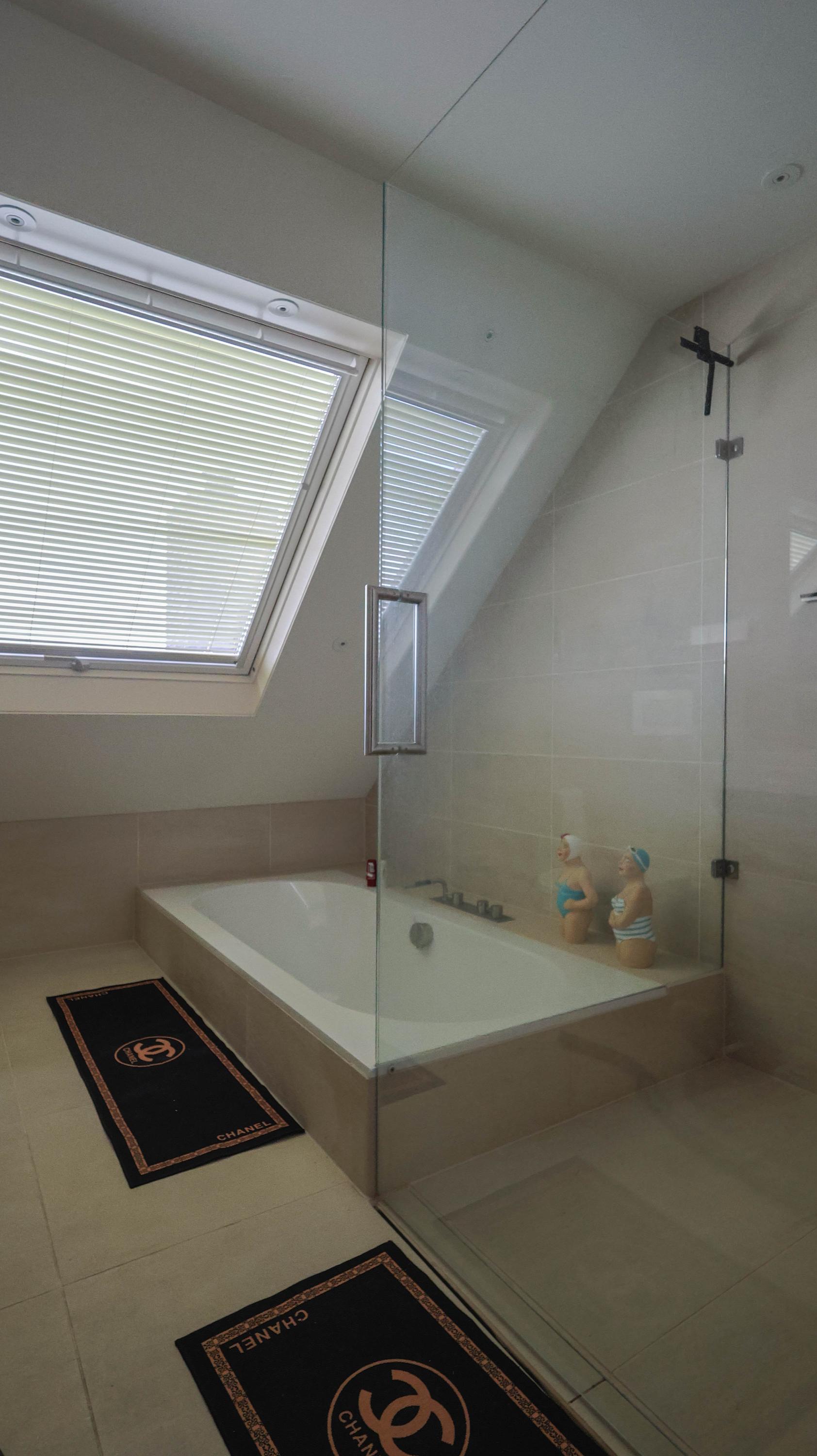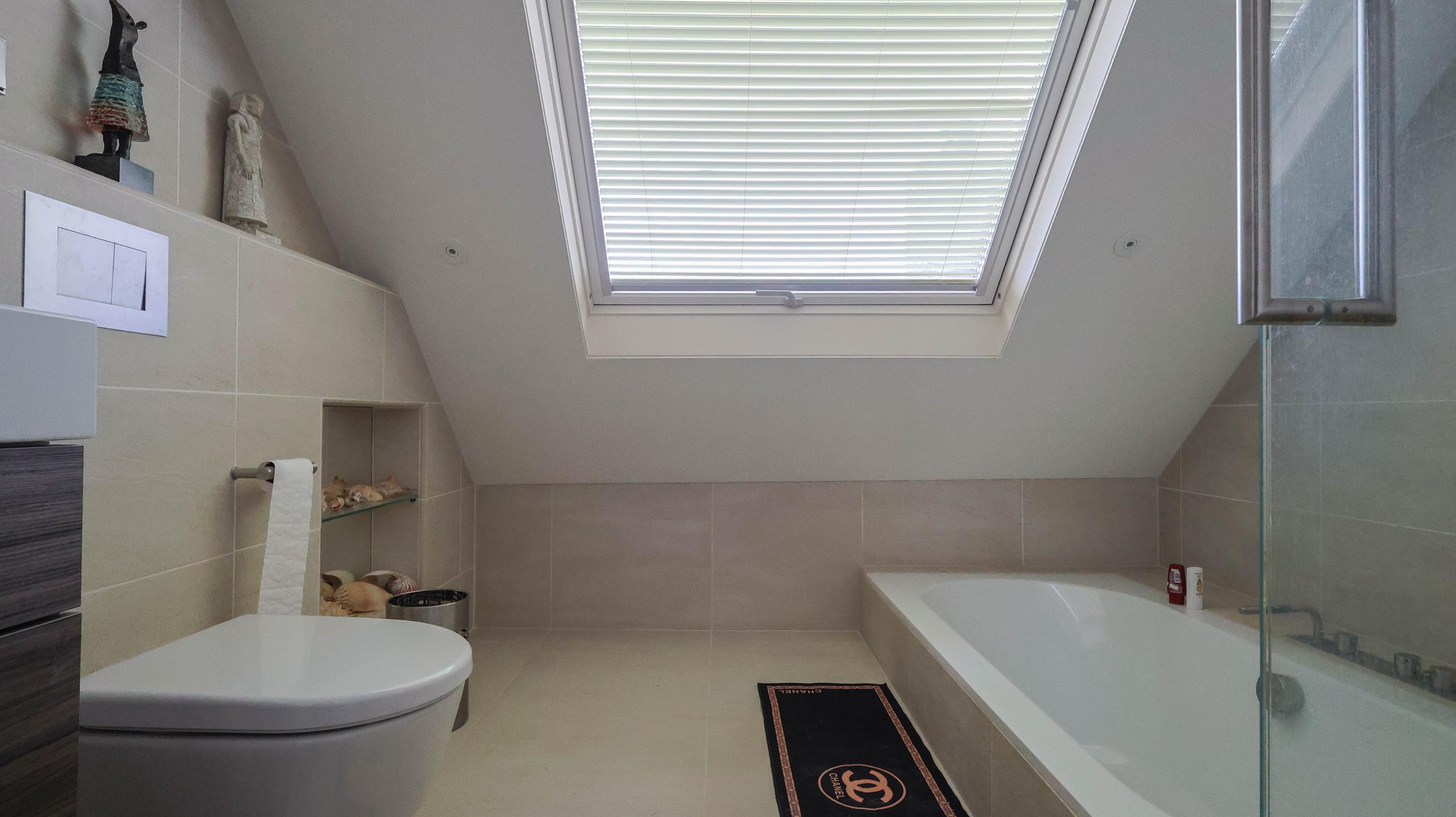 The first floor hosts four surprisingly spacious bedrooms, each filled with natural daylight and offering plenty of layout options. The bathroom completes the floor with a recessed bathtub, shower, washbasin unit and toilet. A practical linen closet provides additional storage, and a loft ladder leads to the generous attic, perfect for storing seasonal items and more.