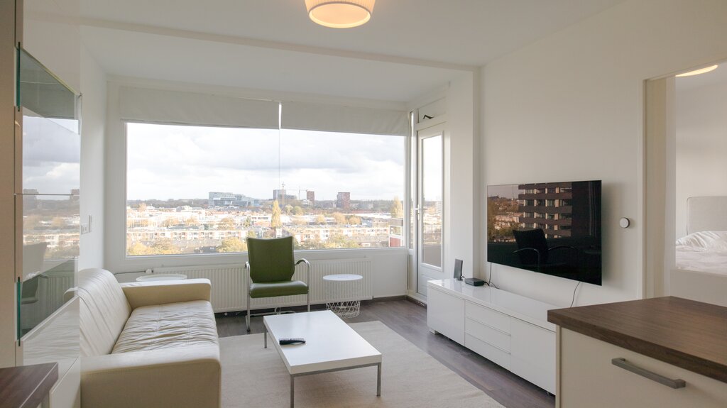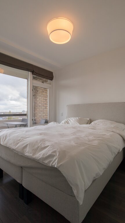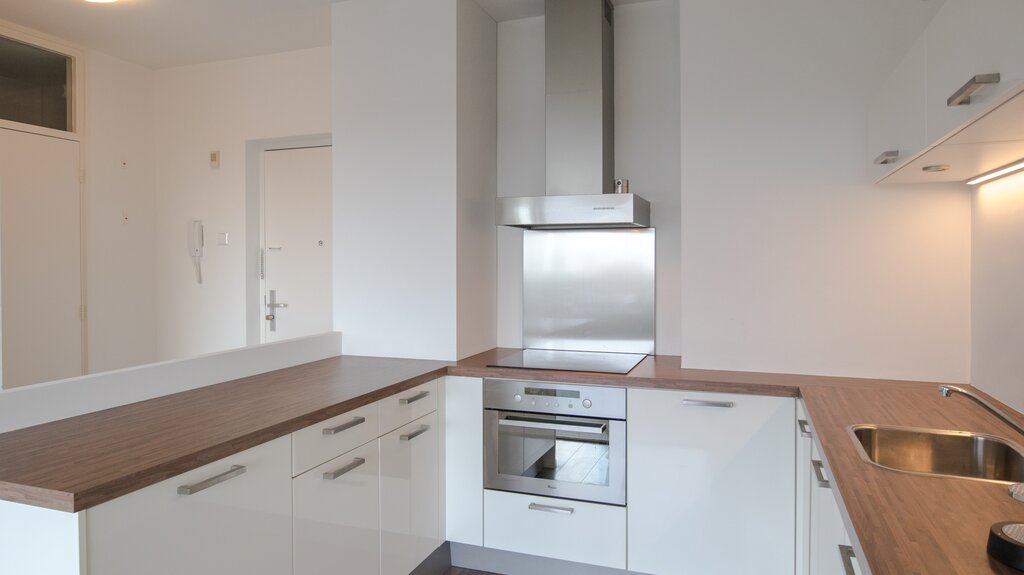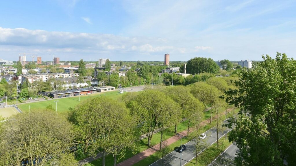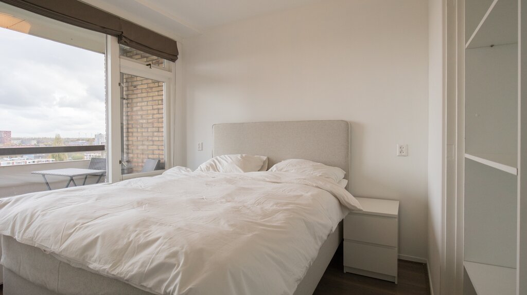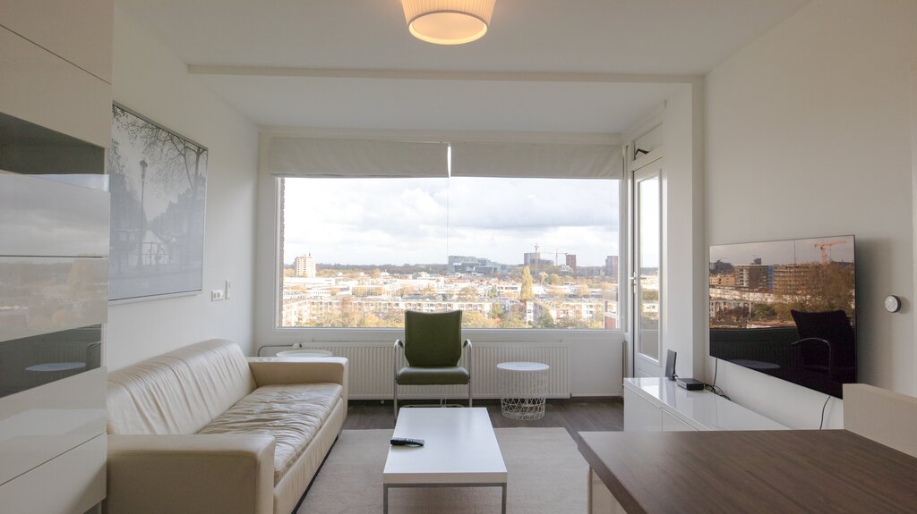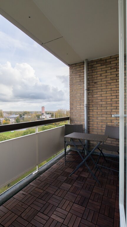 houden appartementencomplex. Middels lift of trap is de woonetage te bereiken. De entree komt uit in de lichte woonkamer met ruime moderne open keuken voorzien van elektrische kookplaat, inbouw koelkast, wasmachine en voldoende opbergmogelijkheden. De woonkamer voorziet en prettige zithoek en is met groot formaat flat screen tv. Het balkon is voorzien van houten terras tegels en geeft weidse uitzichten richting het centrum van Leiden. De badkamer is volledig vernieuwd en is met toilet, wastafel met meubel en spiegelkast alsmede ruime inloopdouche met glazen vouwwand. De slaapkamer is voorzien van groot twee persoons box spring bed en inbouw kleding kast. Op de overloop van de 9e etage is een privé berging kast, een ruime privé berging bevindt zich op de begane grond evenals de gezamenlijke fietsenberging. Het centrum van Leiden is op korte fietsafstand, openbaar vervoer is voor de deur en het winkelcentrum Luifelbaan is op loopafstand.