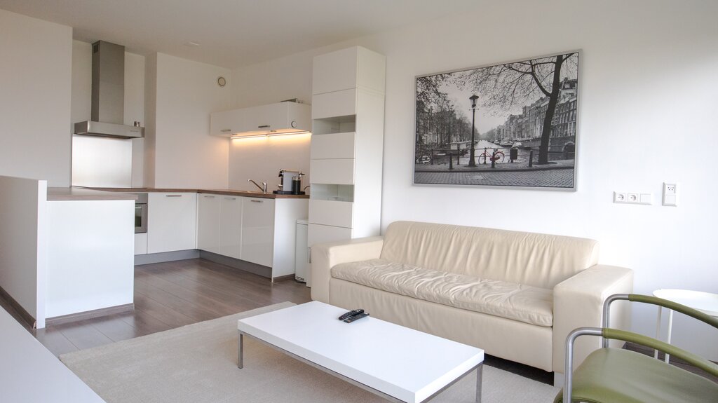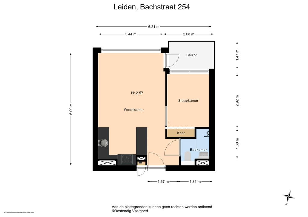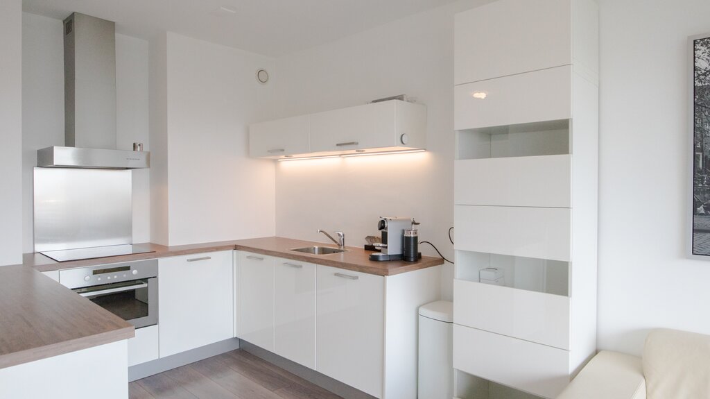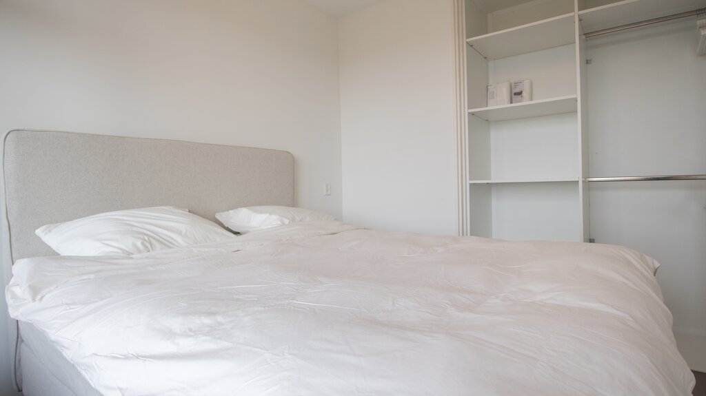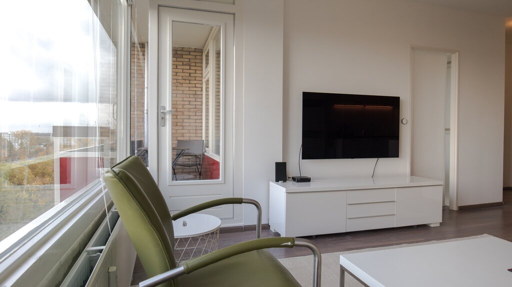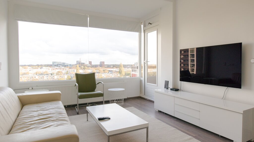 houden appartementencomplex. Middels lift of trap is de woonetage te bereiken. De entree komt uit in de lichte woonkamer met ruime moderne open keuken voorzien van elektrische kookplaat, inbouw koelkast, wasmachine en voldoende opbergmogelijkheden. De woonkamer voorziet en prettige zithoek en is met groot formaat flat screen tv. Het balkon is voorzien van houten terras tegels en geeft weidse uitzichten richting het centrum van Leiden. De badkamer is volledig vernieuwd en is met toilet, wastafel met meubel en spiegelkast alsmede ruime inloopdouche met glazen vouwwand. De slaapkamer is voorzien van groot twee persoons box spring bed en inbouw kleding kast. Op de overloop van de 9e etage is een privé berging kast, een ruime privé berging bevindt zich op de begane grond evenals de gezamenlijke fietsenberging. Het centrum van Leiden is op korte fietsafstand, openbaar vervoer is voor de deur en het winkelcentrum Luifelbaan is op loopafstand.