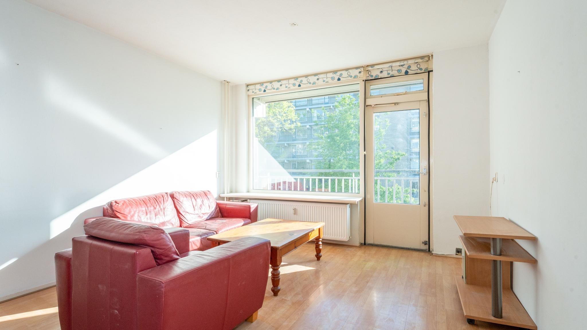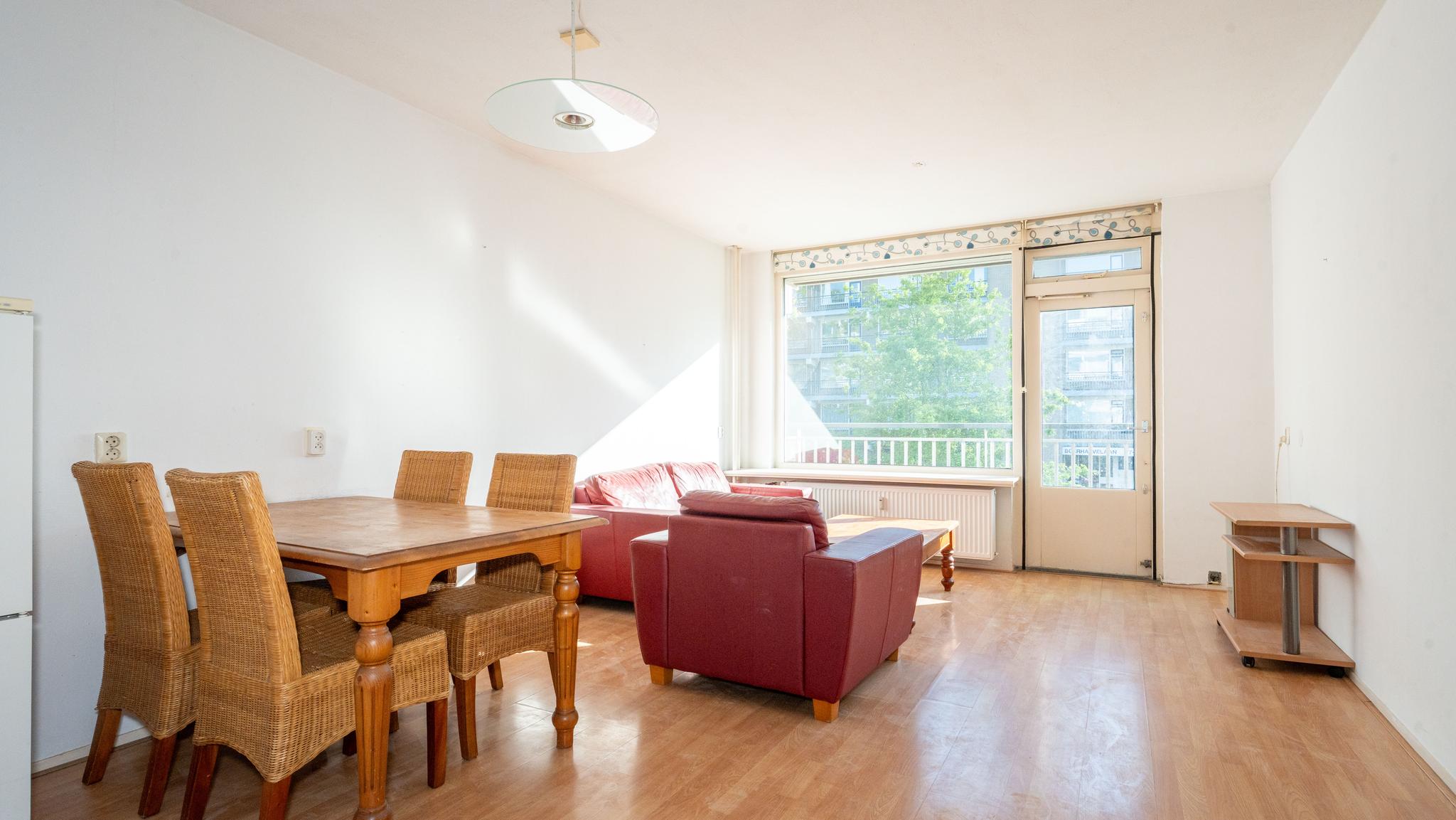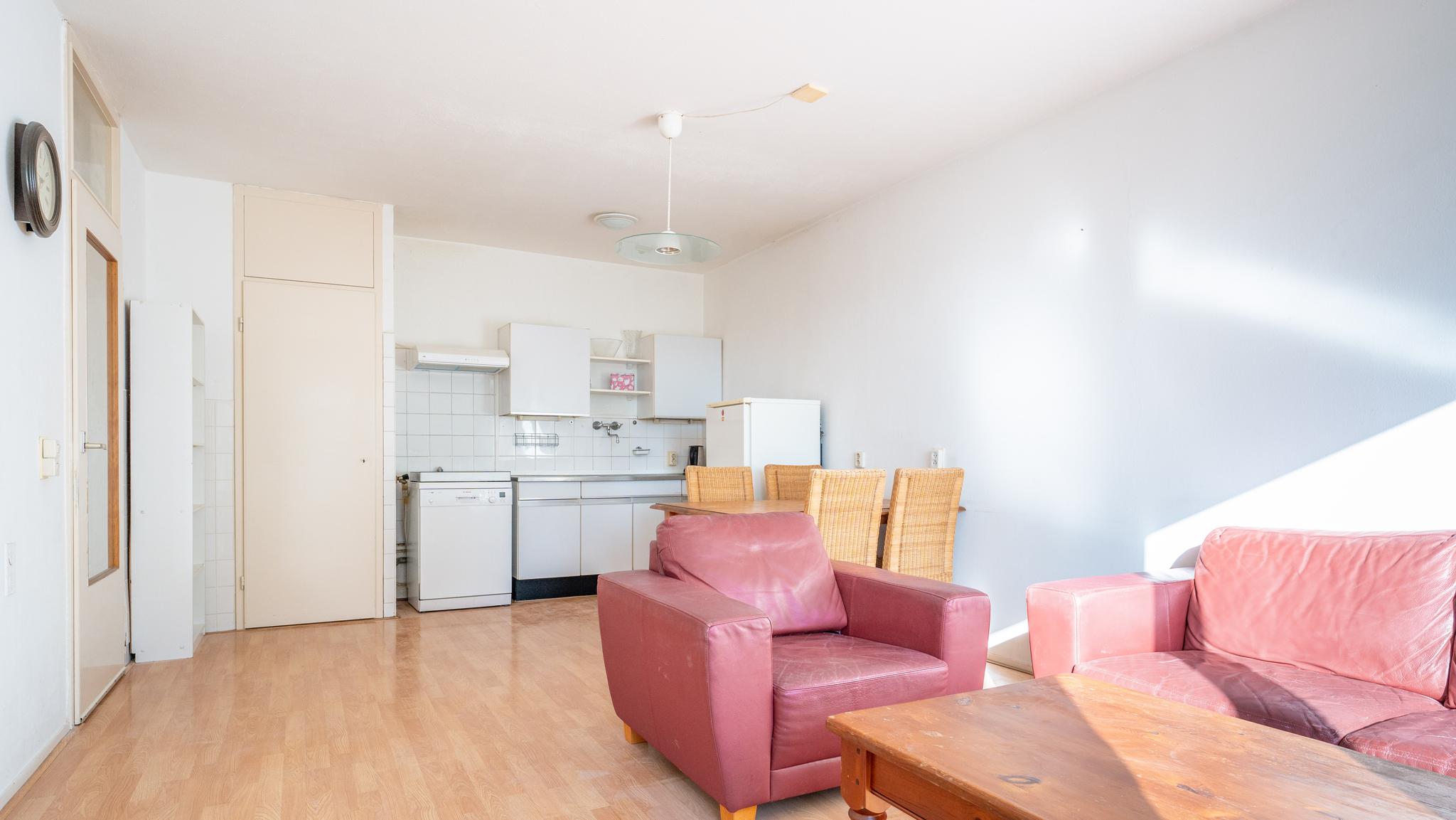 De woonkamer met open keuken is een fijne, open ruimte waar je je al snel thuis voelt. Dankzij de grote raampartij op het zuidwesten valt het daglicht mooi naar binnen, en via de openslaande deur stap je zo het balkon op. Een perfecte plek voor een kop koffie in de zon of een ontspannen avond buiten.