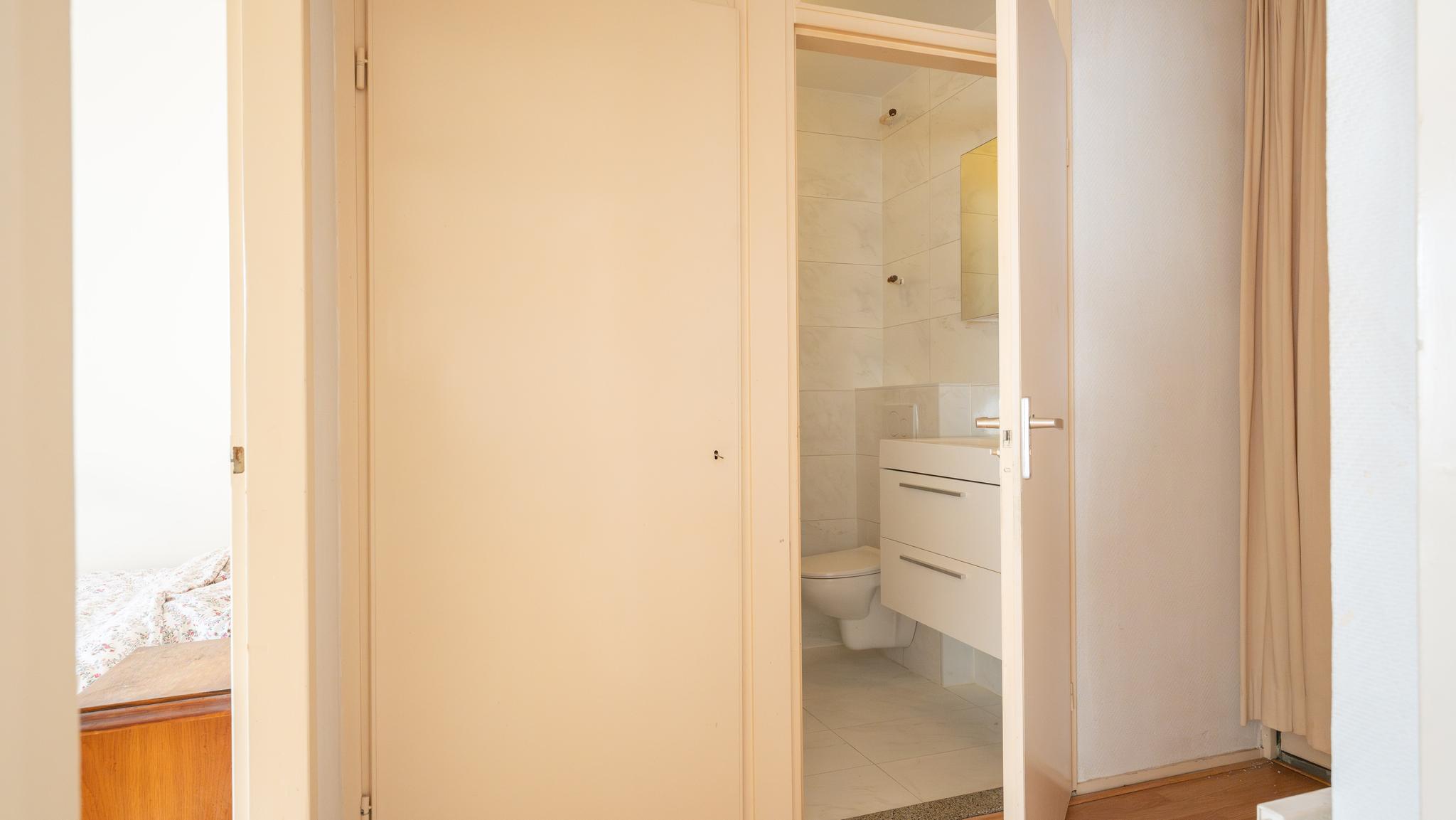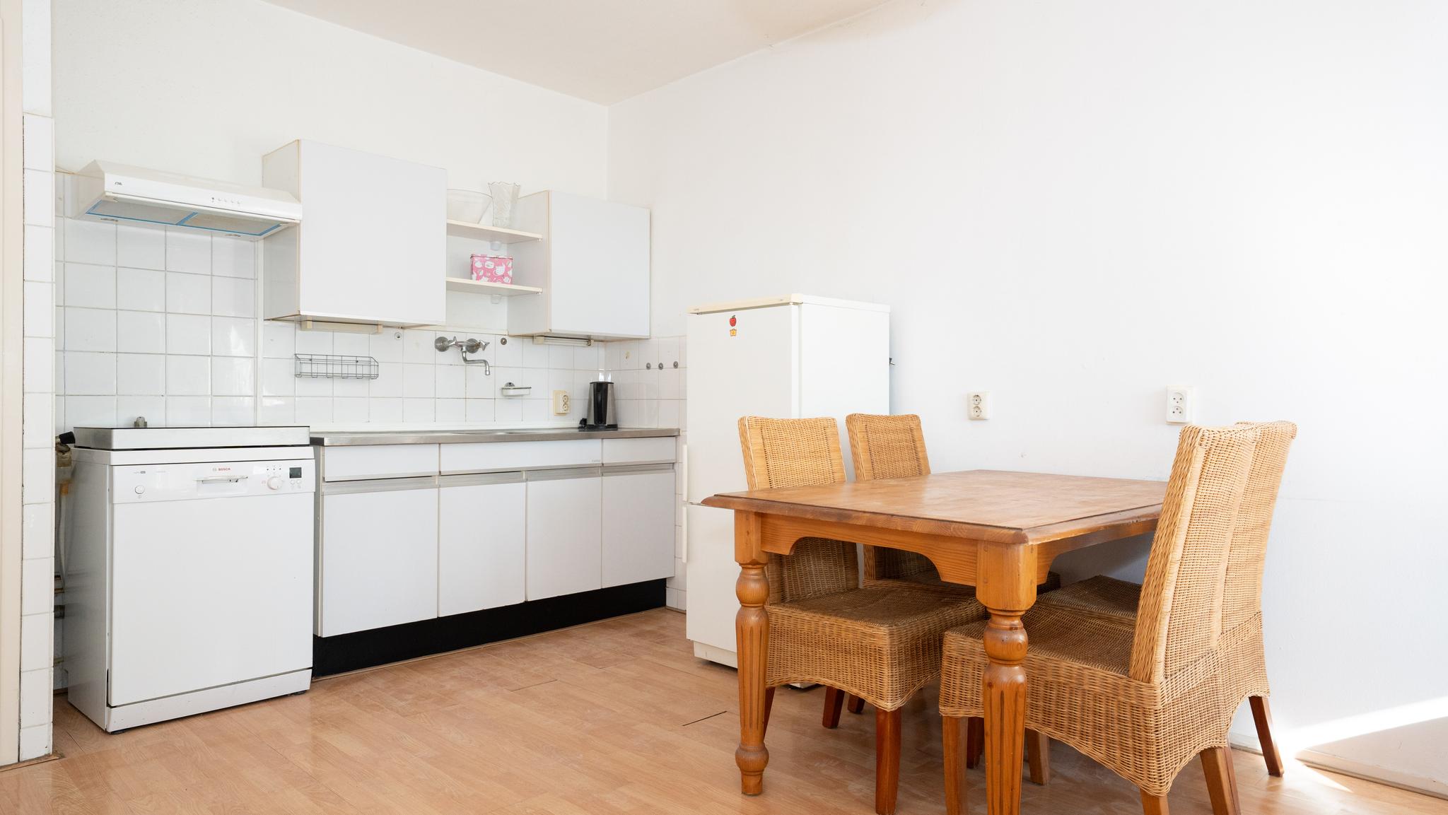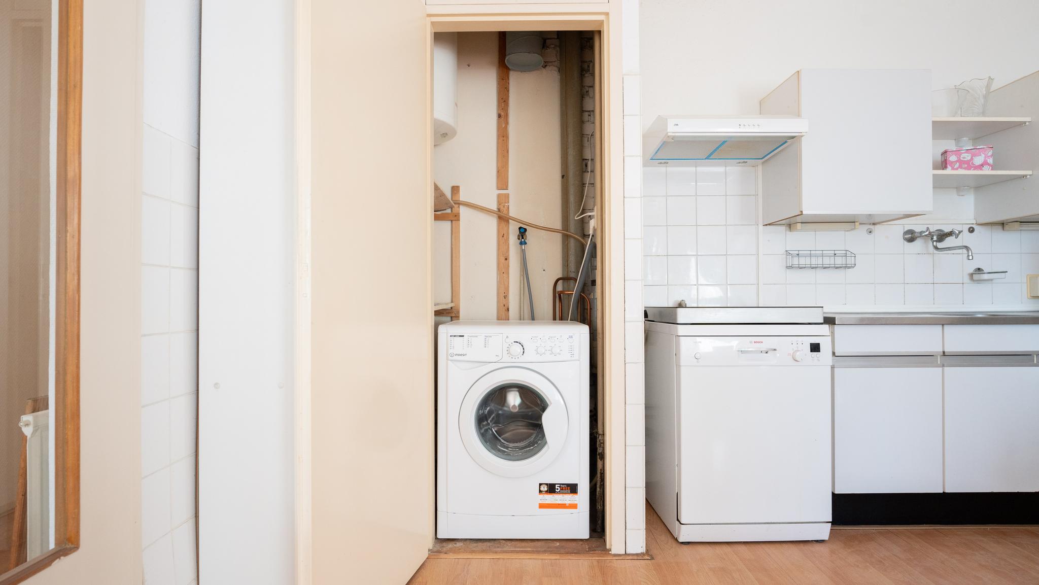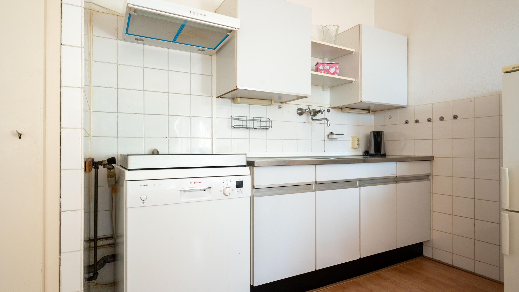 De keuken is praktisch ingericht met een vaatwasser, kookplaat, afzuigkap, wastafel en voldoende kastruimte. Daarnaast vind je er een aparte kast met wasmachineaansluiting en plek voor extra opslag. De slaapkamer biedt ook lekker veel licht en genoeg ruimte voor een groot bed én een flinke kledingkast. De badkamer is netjes betegeld en voorzien van een douche, wastafelmeubel en een hangend toilet.