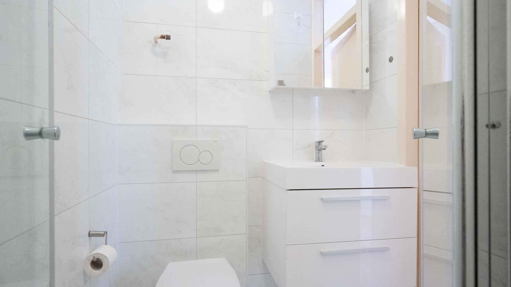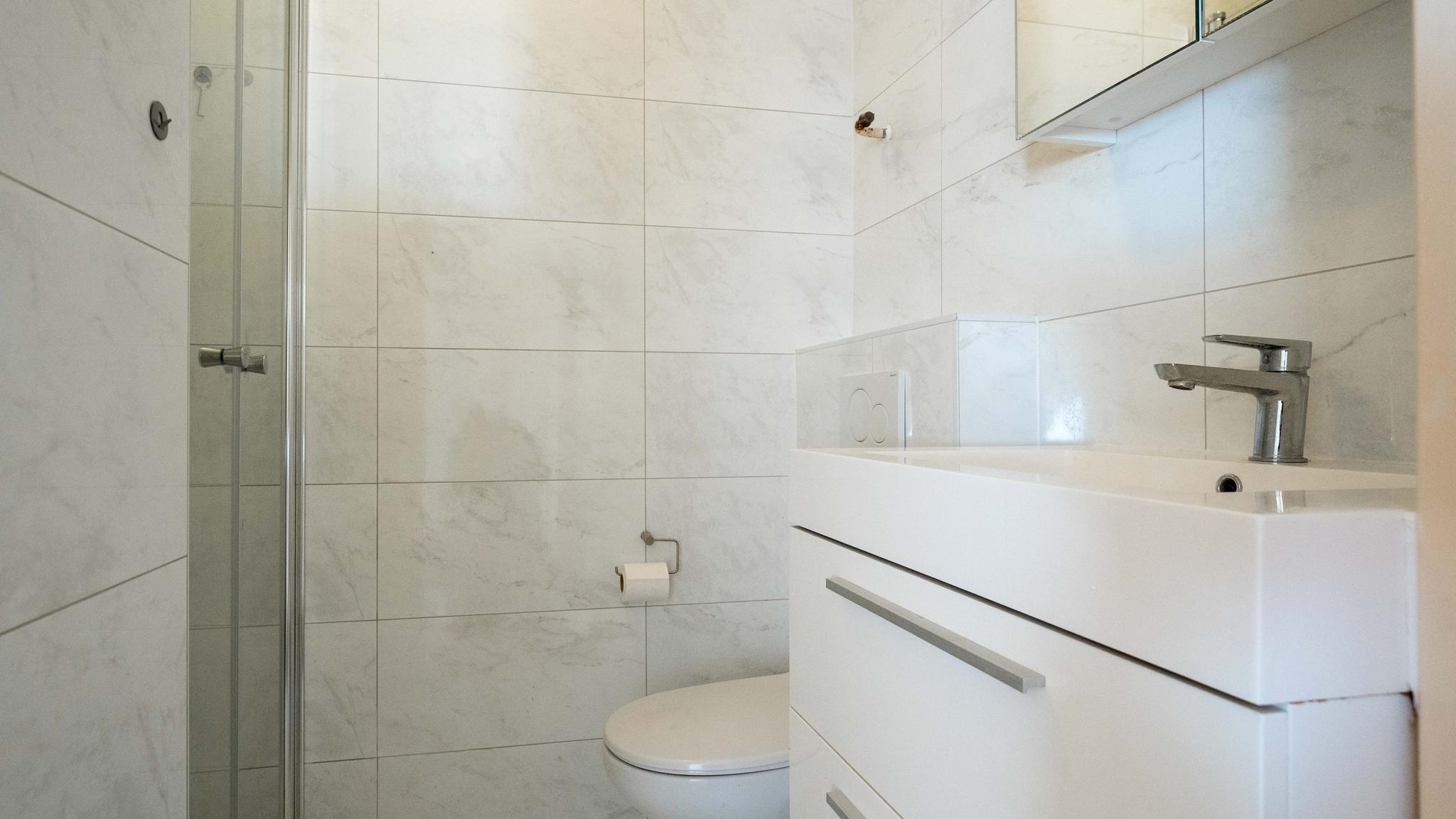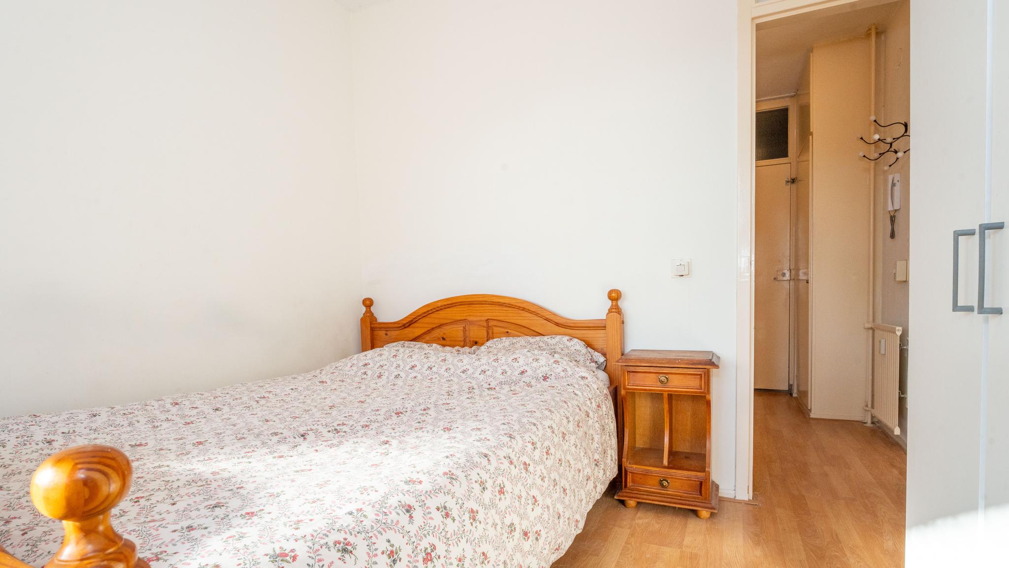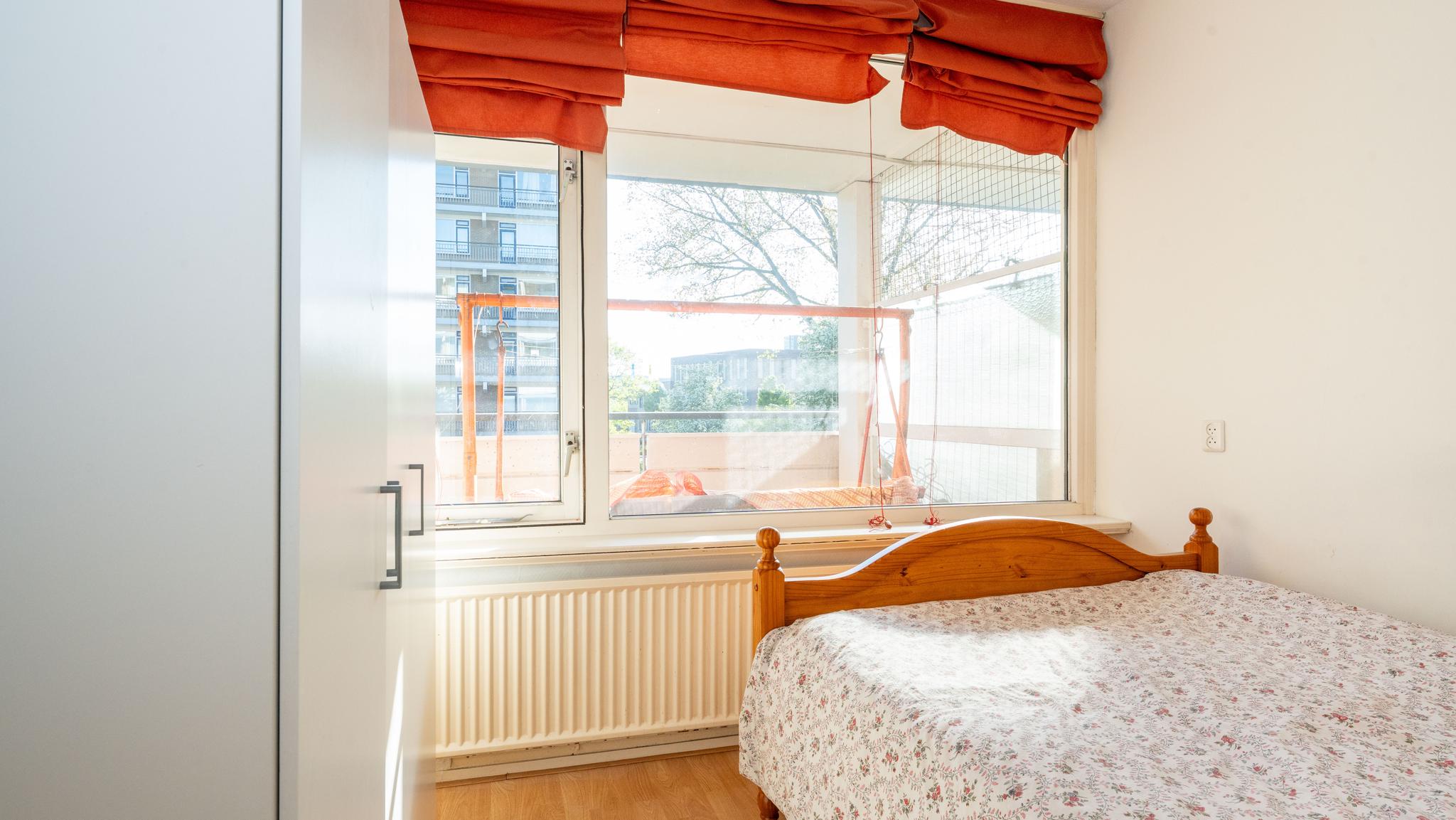 De keuken is praktisch ingericht met een vaatwasser, kookplaat, afzuigkap, wastafel en voldoende kastruimte. Daarnaast vind je er een aparte kast met wasmachineaansluiting en plek voor extra opslag. De slaapkamer biedt ook lekker veel licht en genoeg ruimte voor een groot bed én een flinke kledingkast. De badkamer is netjes betegeld en voorzien van een douche, wastafelmeubel en een hangend toilet.