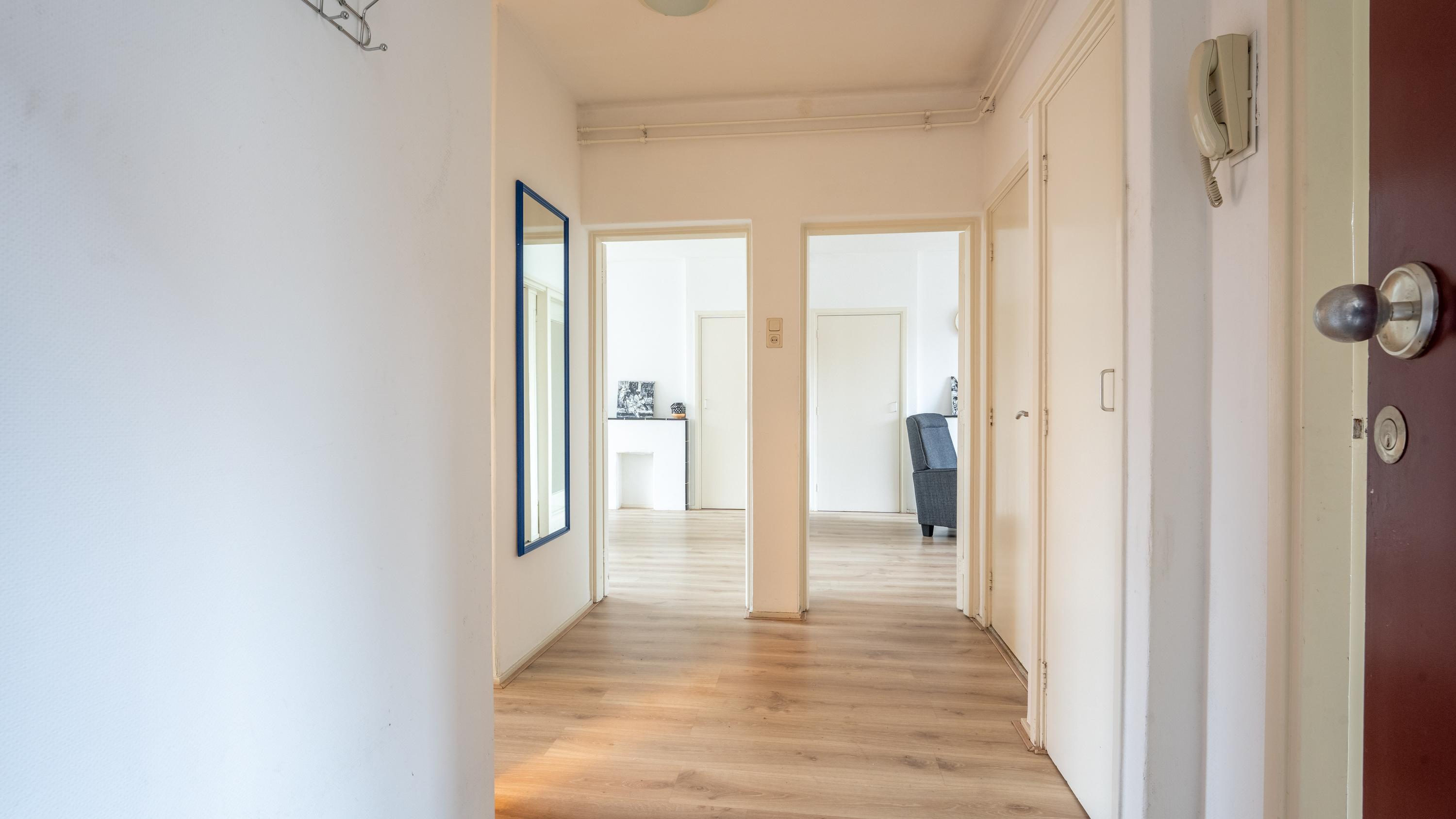 Binnenkomst in de hal met toegang tot alle ruimtes. De gesloten keuken ligt direct aan de entree en heeft toegang tot een eigen balkon—een fijne plek voor een ochtendkoffie. Verder zijn er een separaat toilet en een douche/badkamer.