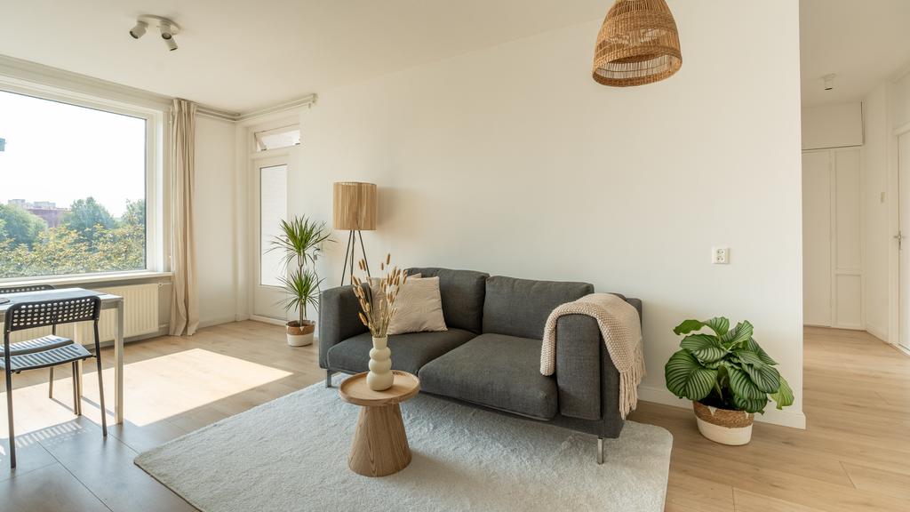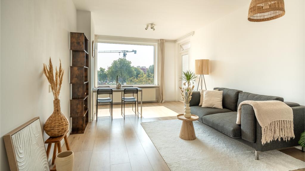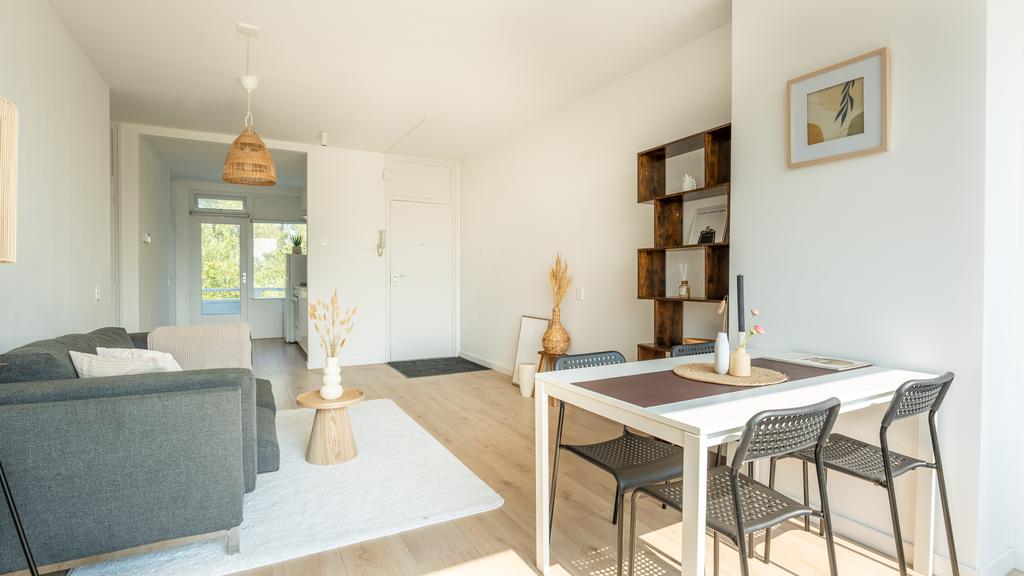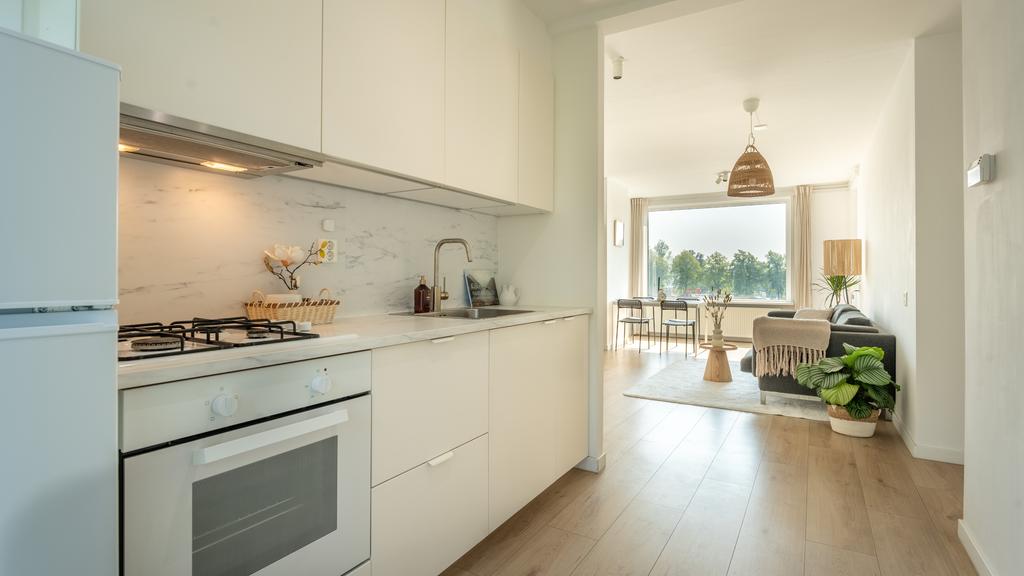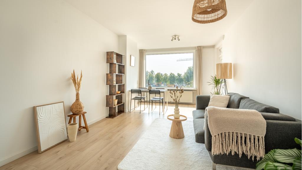 Eenmaal aangekomen op de twee etage zal het eerste wat je zal opvallen aan het appartement dat er sprake is van een moderne, nette afwerking. Het fijne is dat de woning volledig gemeubileerd opgeleverd kan worden waardoor de woning gelijk te betrekken valt. Bij het betreden van de woning begeef je jezelf in de woonkamer. Met een grote raampartij op het zuiden geniet je van een fijne lichtinval. Via de woonkamer heb je toegang tot het balkon gericht op het zuiden, toilet, installatieruimte en de twee slaapkamers. Ook heeft de woonkamer een open doorgang met de moderne keuken, voorzien van een ingebouwde oven en een gaskookplaat. De keuken biedt toegang tot het tweede balkon, gericht op het noorden. Hierdoor is het mogelijk om gedurende de hele dag van de zon te kunnen genieten.