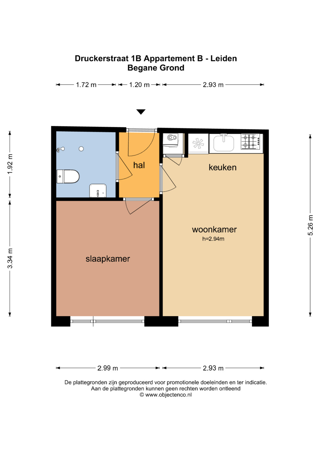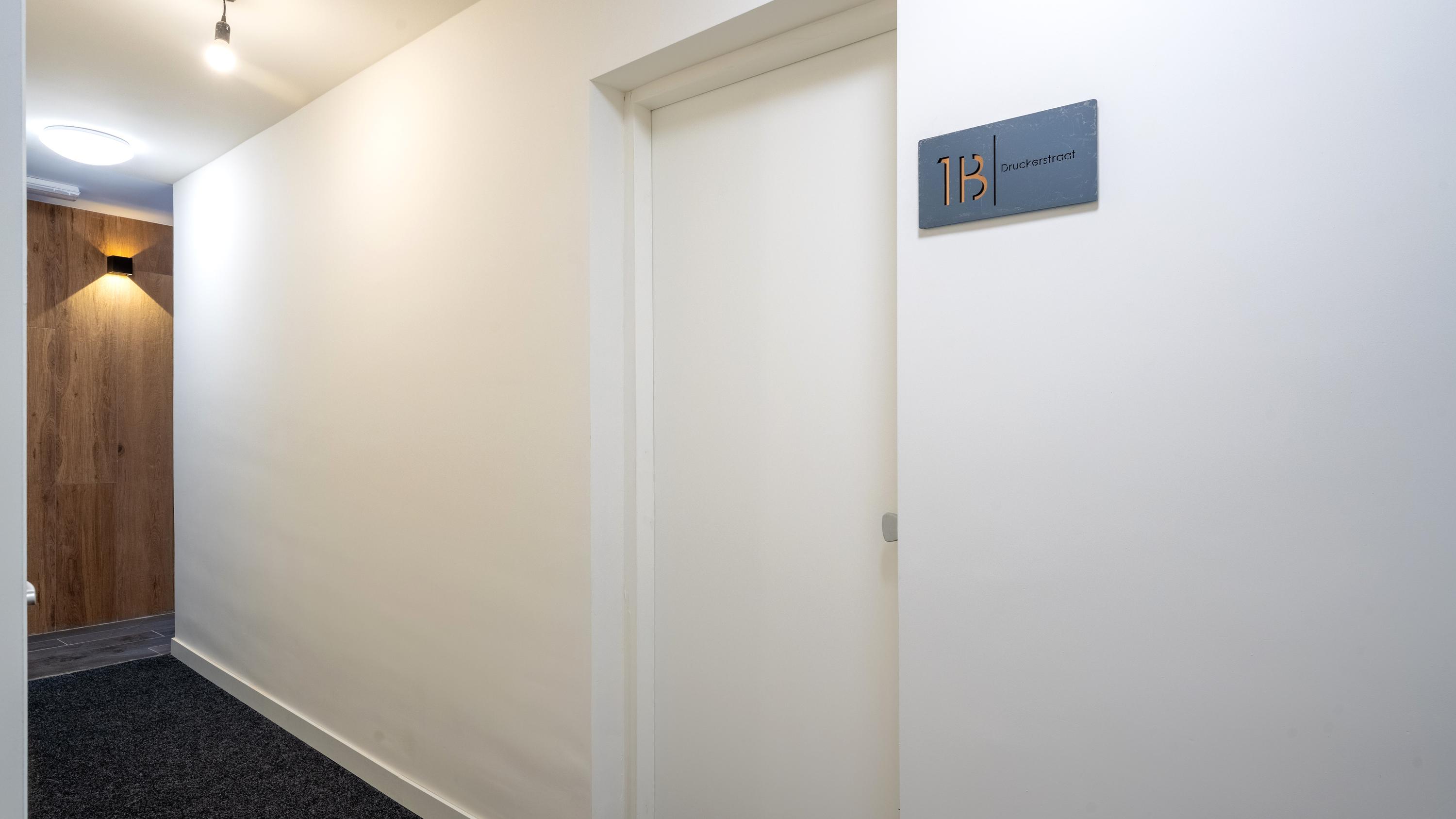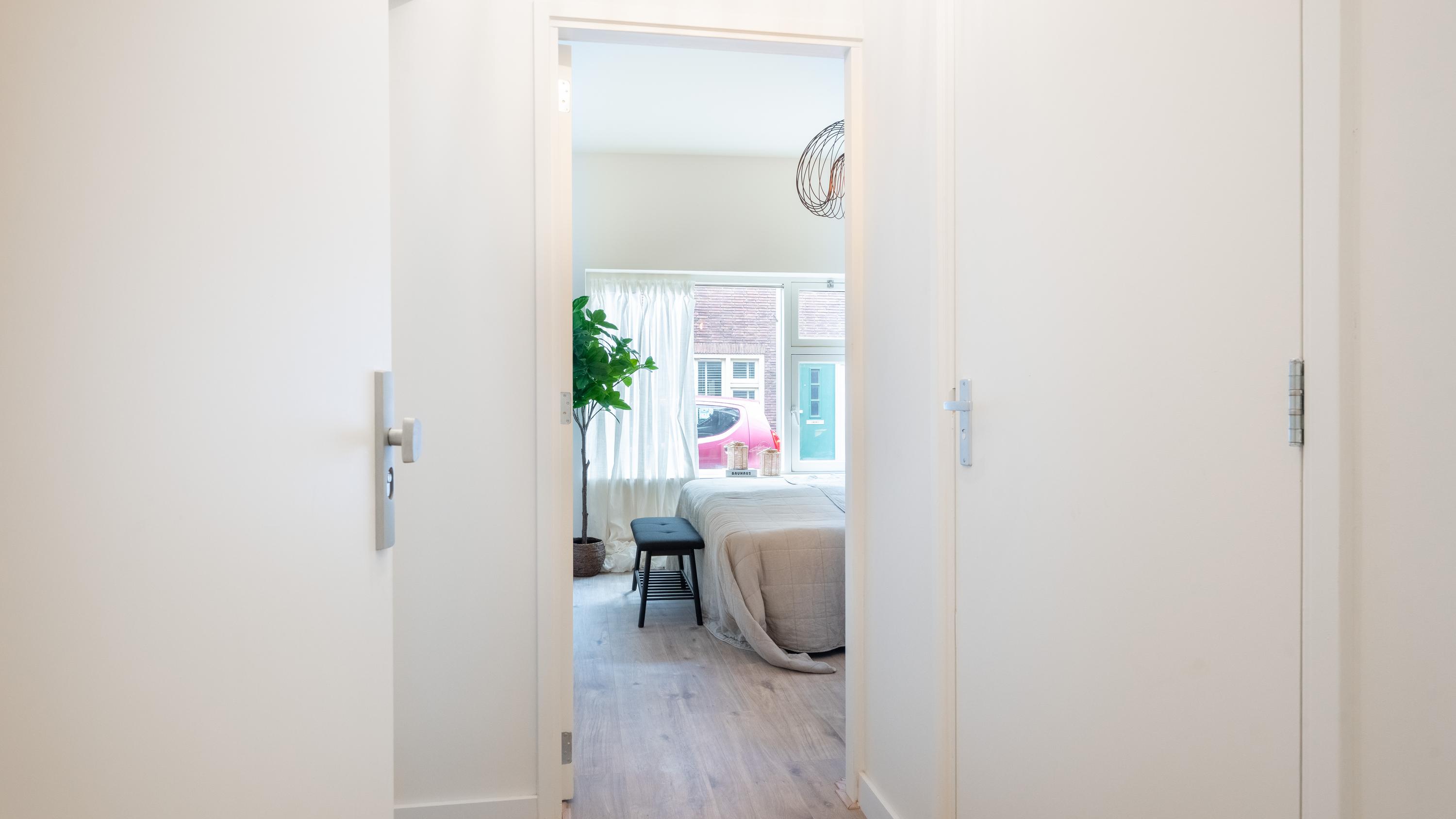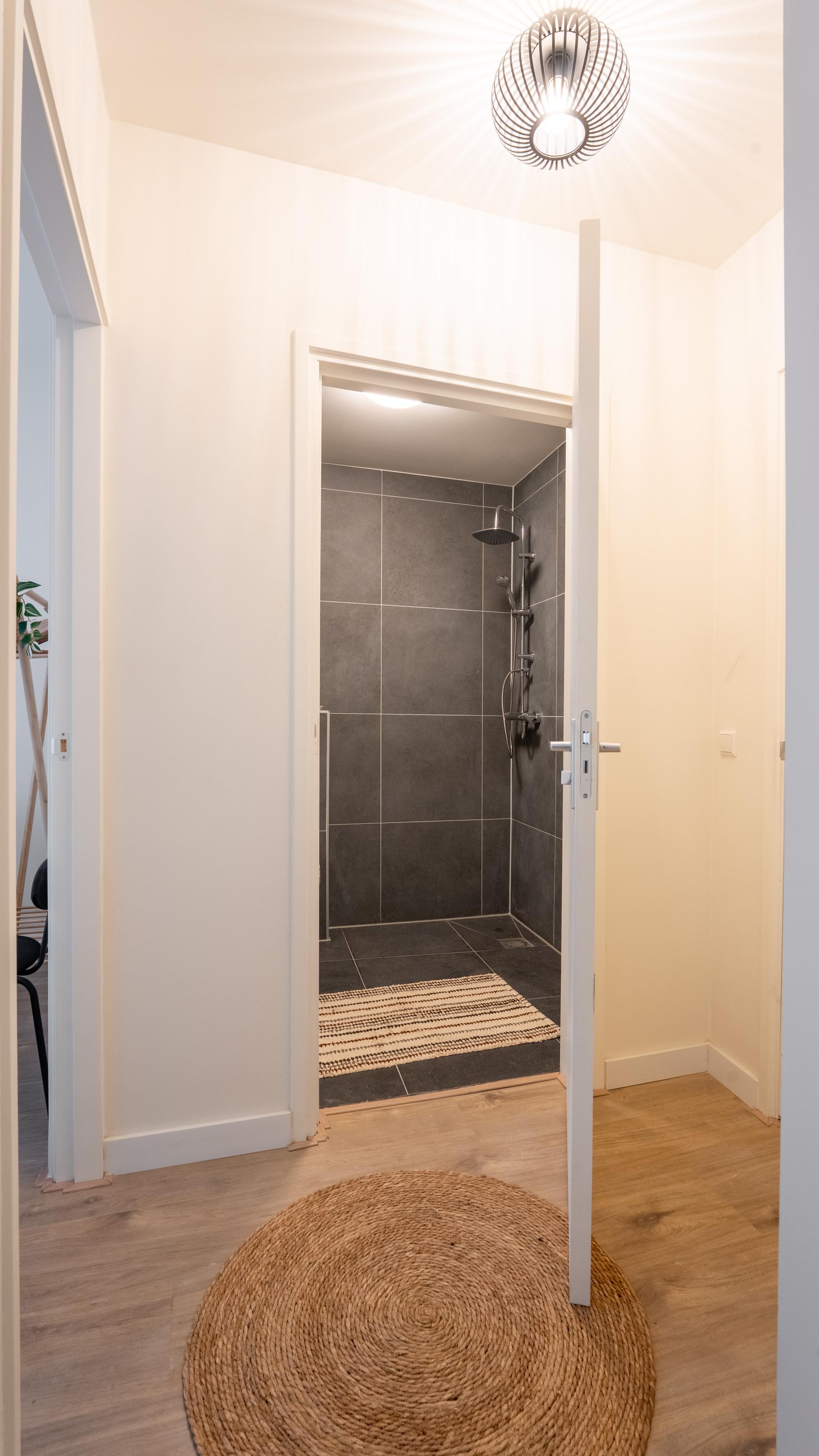 Vanuit de gezamenlijke entree waar zich tevens een bergkast en meterkast bevindt is er toegang tot de gang van de woning waarvandaan alle ruimtes waaronder de badkamer met toilet, slaapkamer en woonkamer met open keuken.