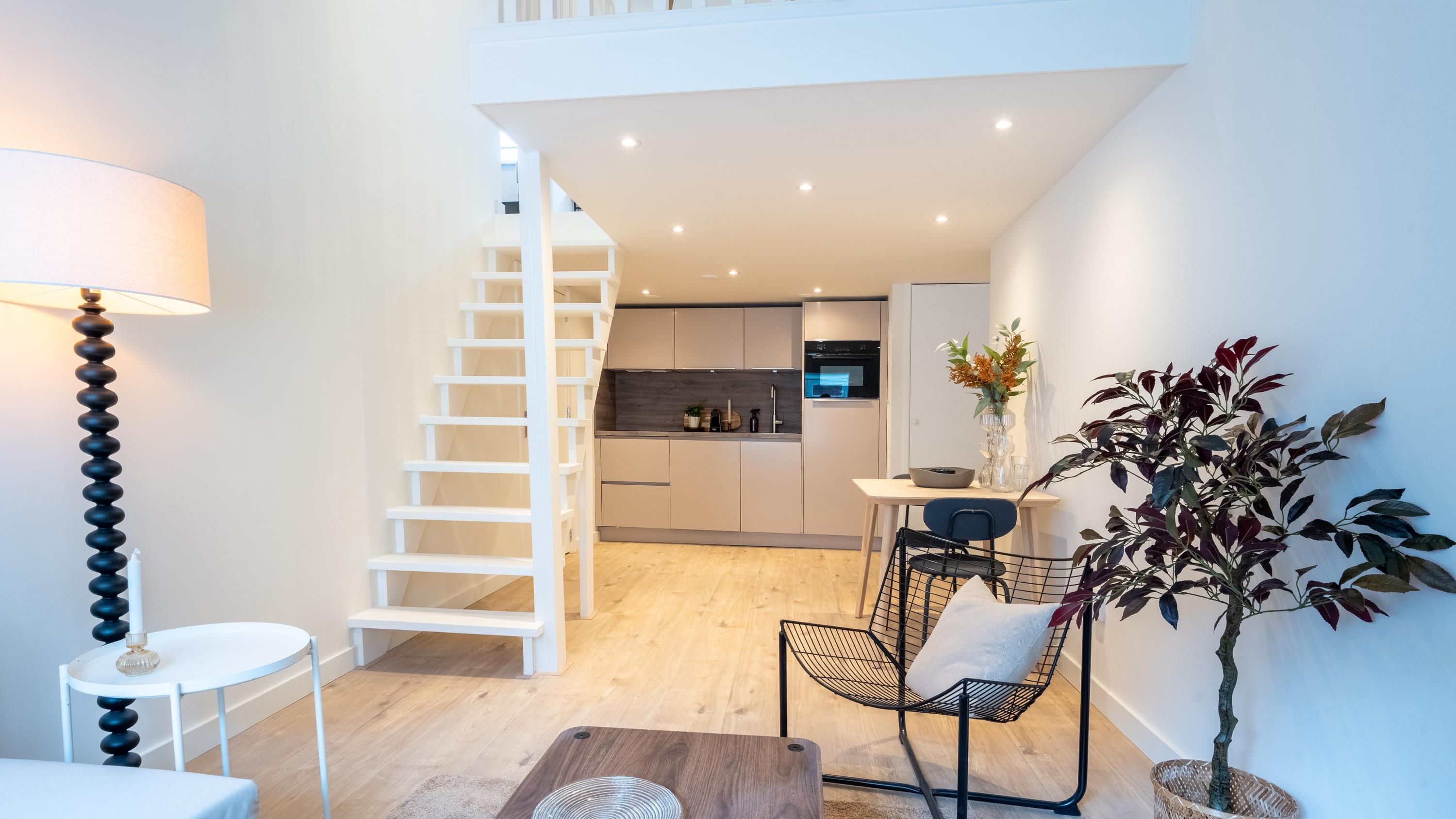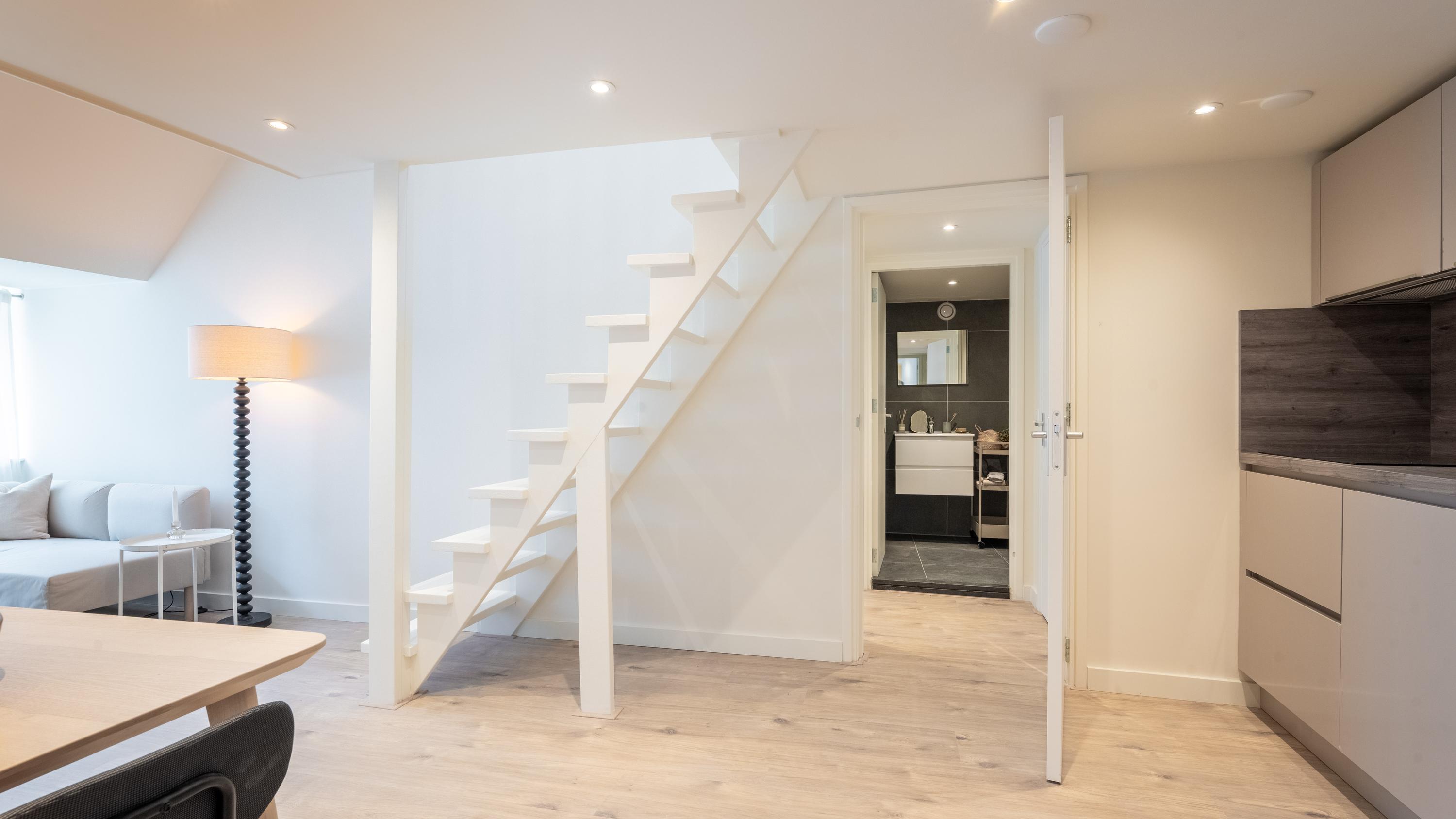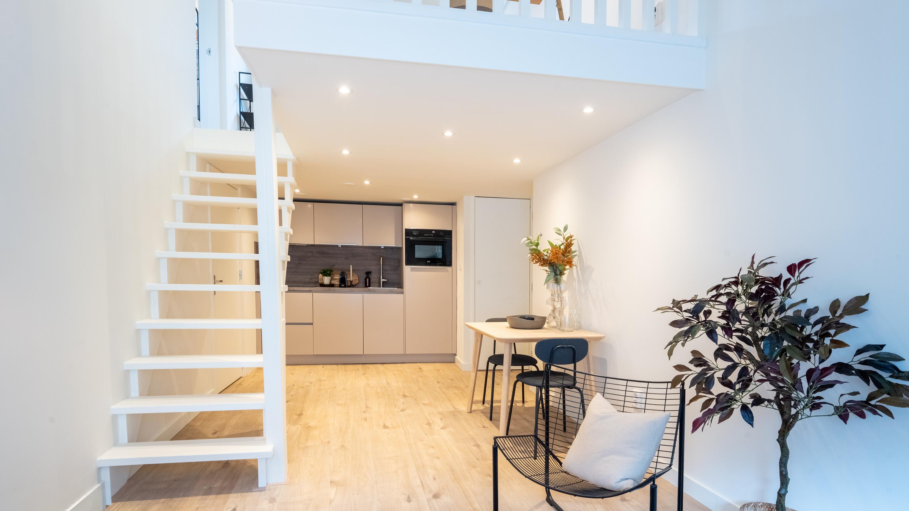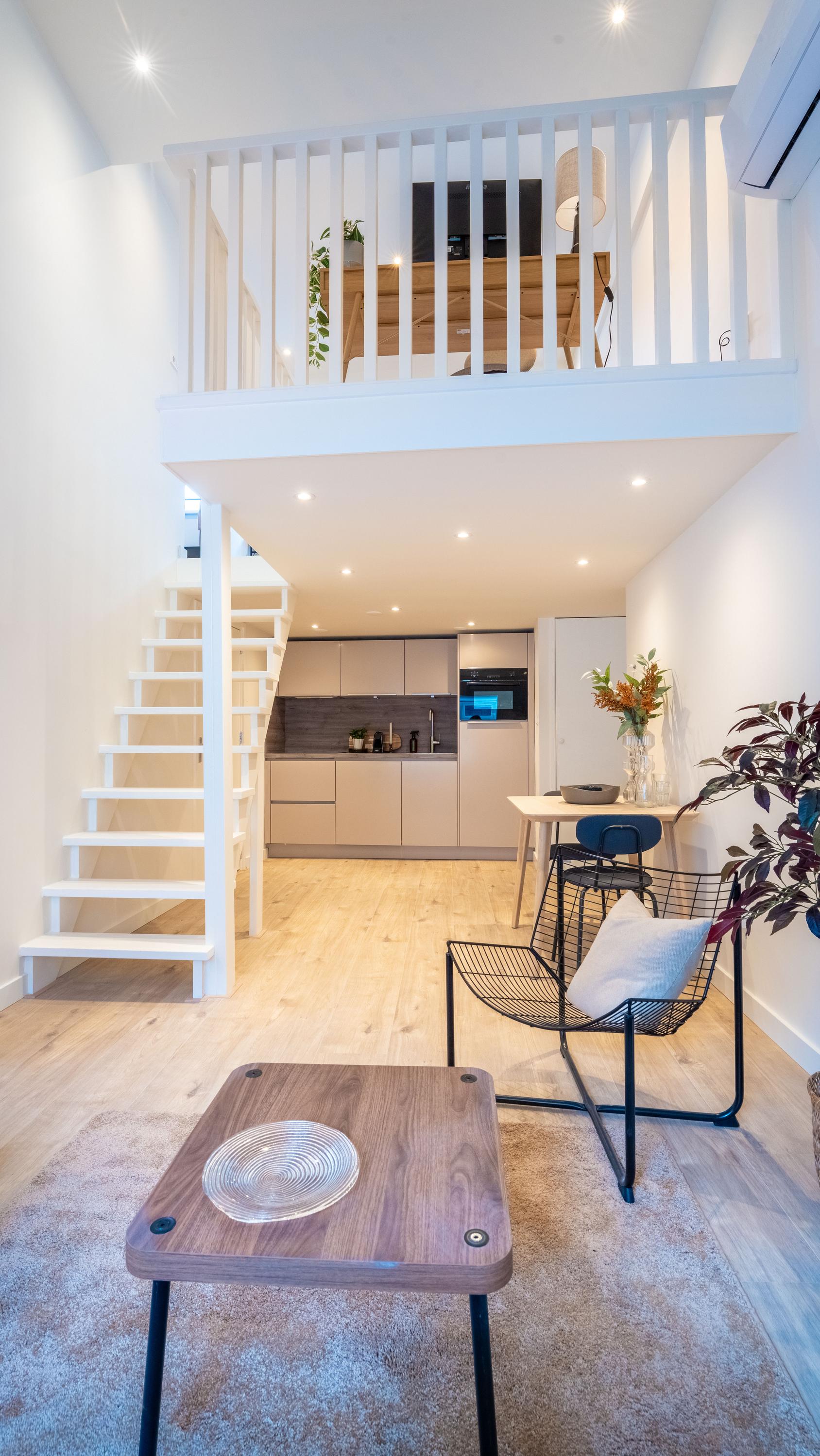 Gelegen op de eerste en tweede etage van volledig gerenoveerd kleinschalig complex is via de gezamenlijke entree de voordeur van dit heerlijke volledig nieuwe appartement beschikbaar. De woonkamer is met moderne en volledig uitgeruste keuken en separate kast voor wasmachine opstelling. Via hal is er toegang tot het losse toilet, de badkamer én ruime hoofdslaapkamer. De vaste trap in de woonkamer komt uit op de ruime overloop met meer dan voldoende ruimte voor een prettige werkplek en wellicht een leeshoek. Tevens bevindt zich op deze etage een tweede ruime slaapkamer.