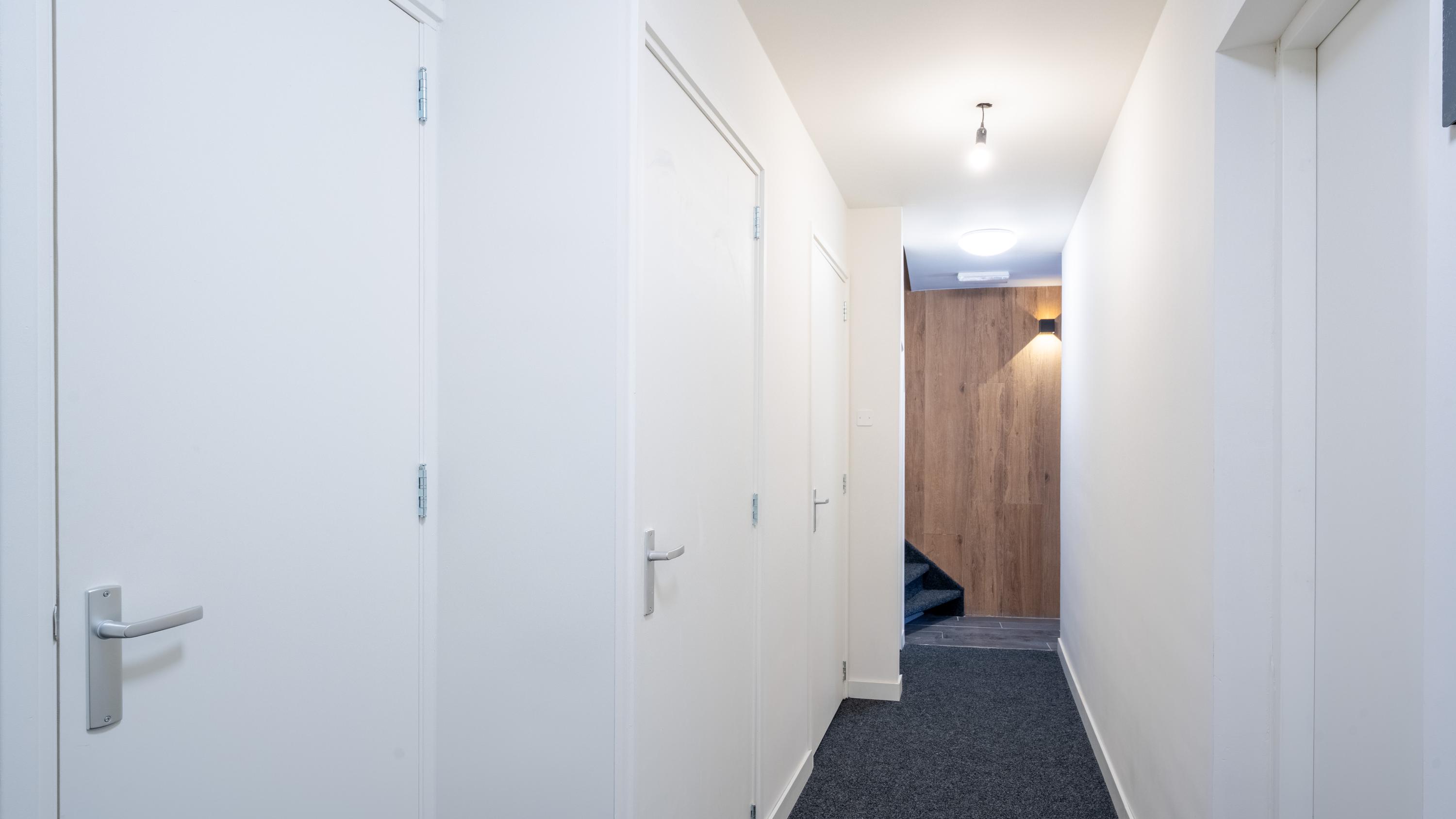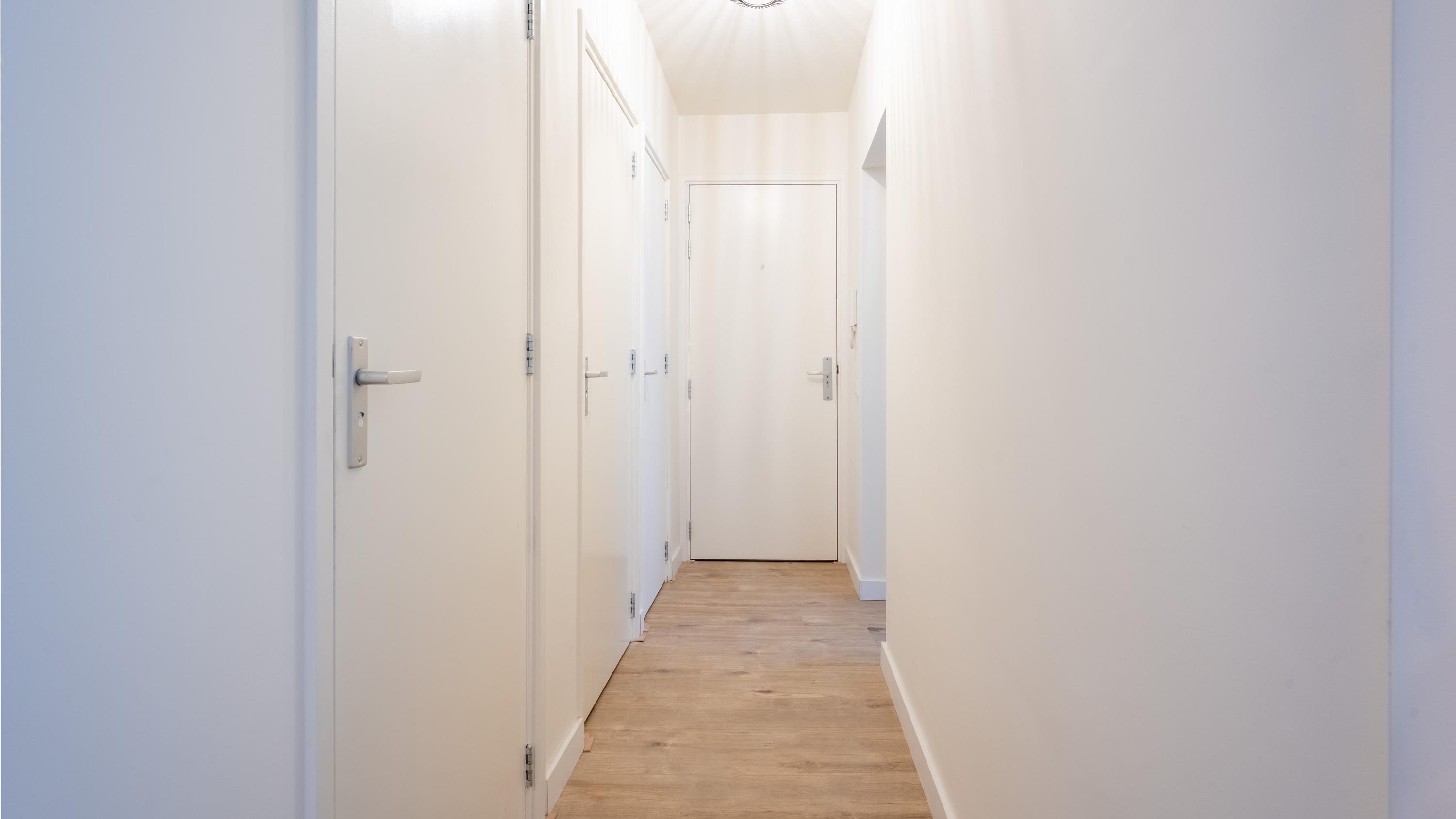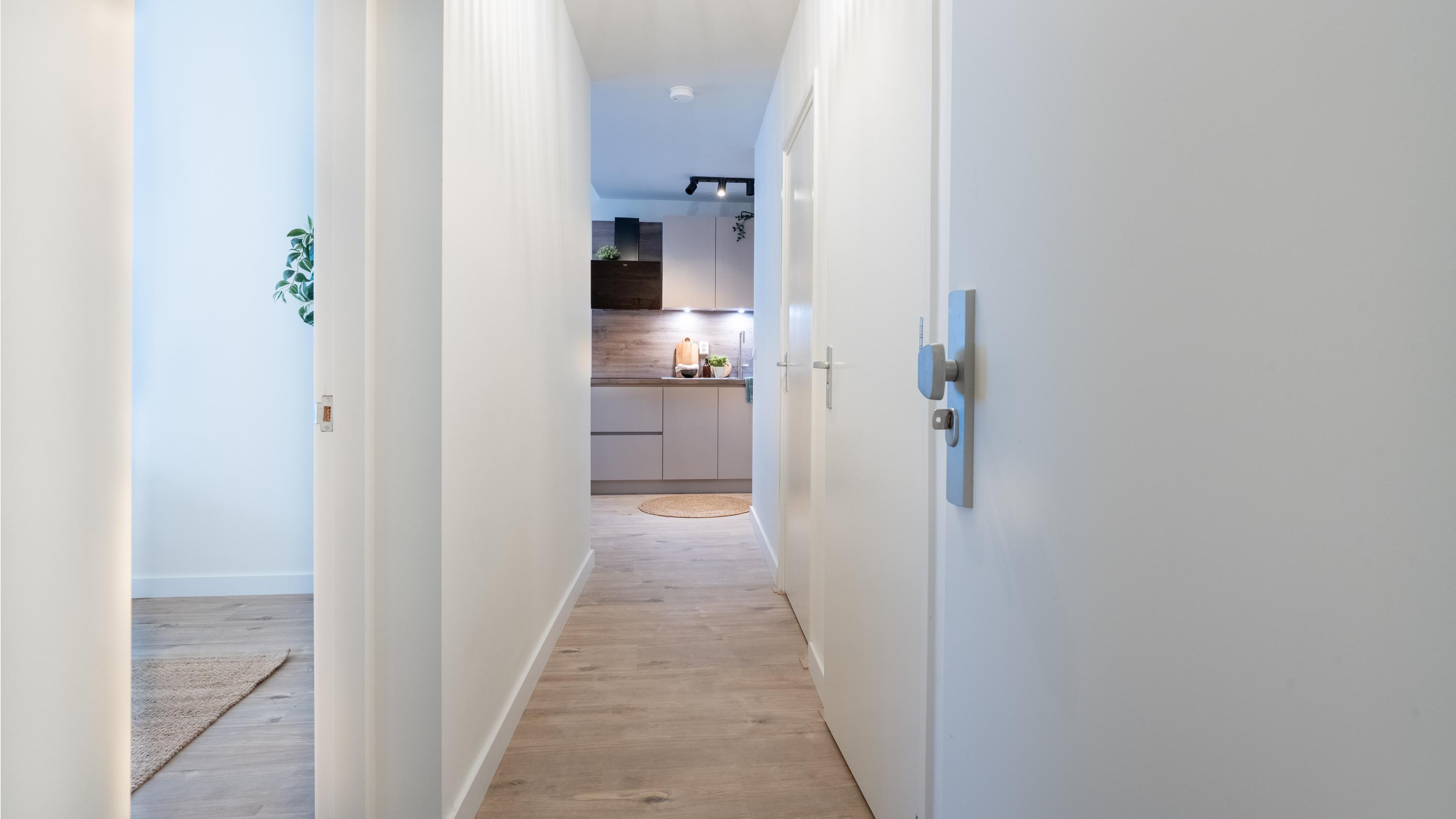 Vanuit de gezamenlijke entree waar zich tevens een bergkast en meterkast bevindt is er toegang tot de gang van de woning waarvandaan alle ruimtes waaronder een separaat toilet, wasmachine kast, slaapkamer en woonkamer bereikbaar zijn.