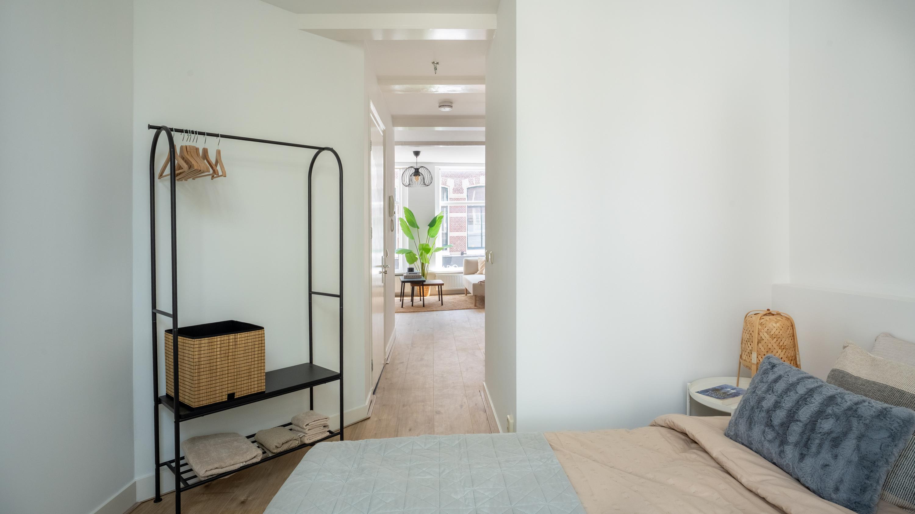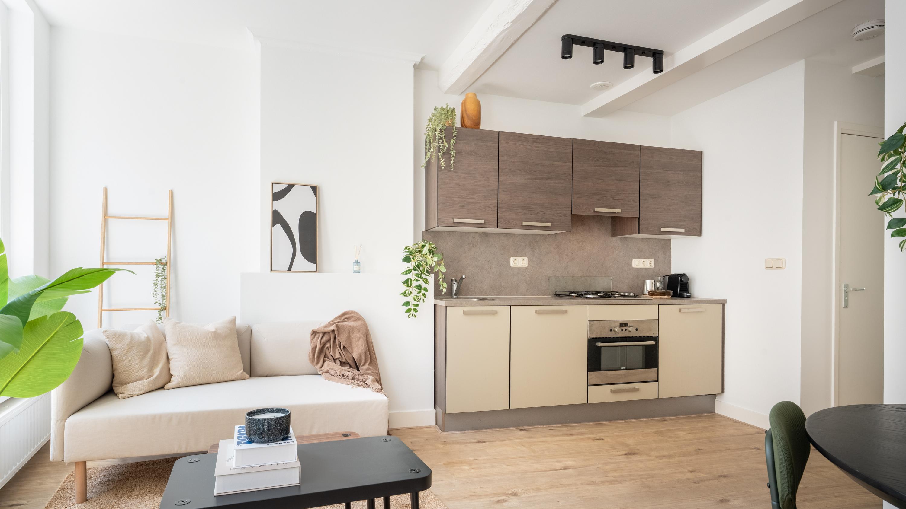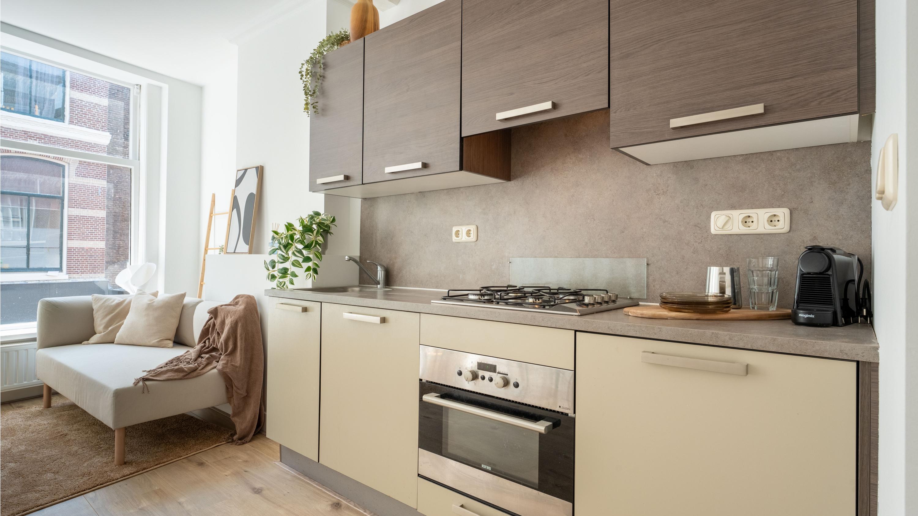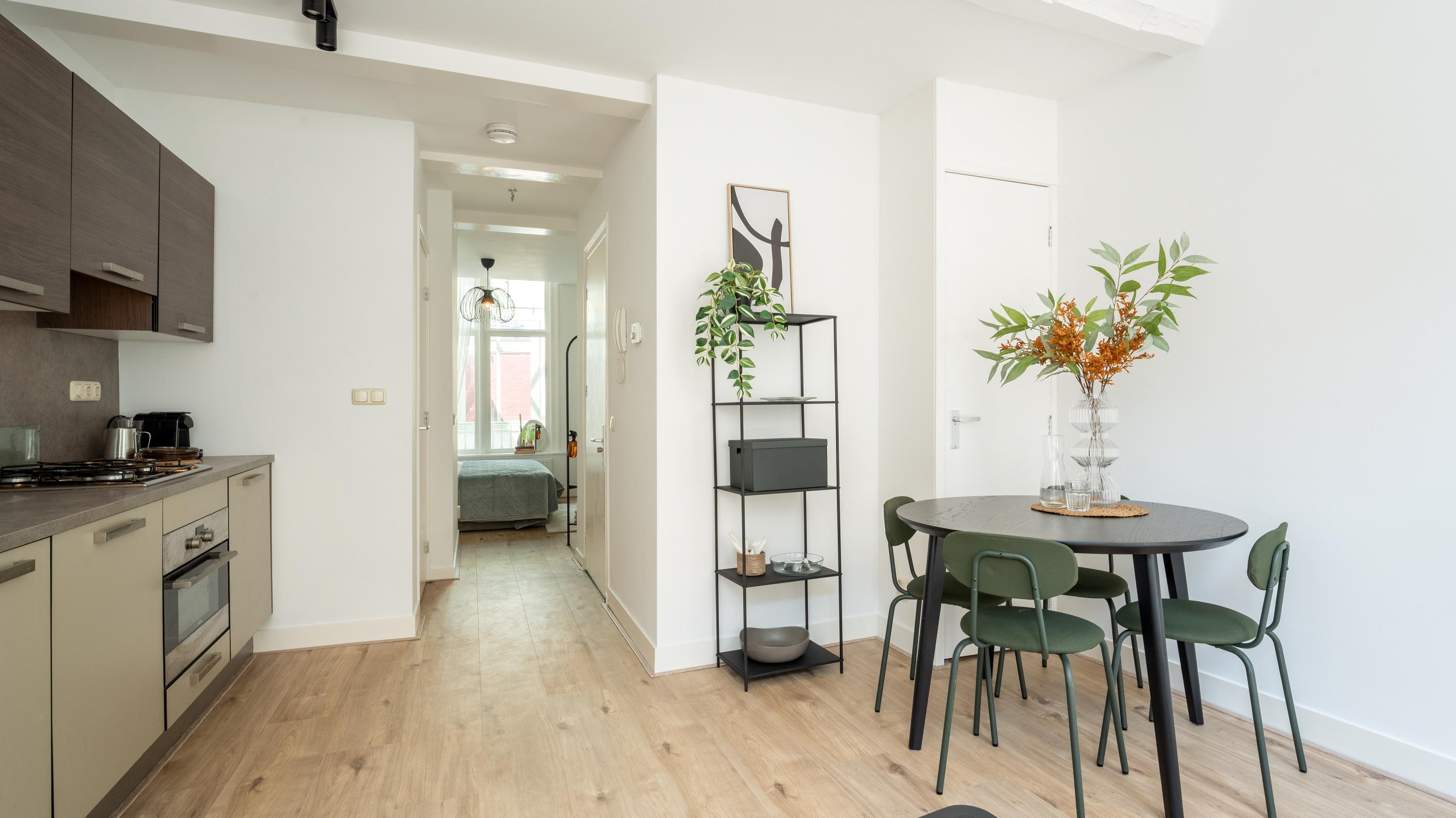 Vanaf de Haarlemmerstraat is bovenaan de trap het appartement bereikbaar waarbij je direct de sfeer proeft bij binnenkomst. Je staat in de woonkamer met moderne open keuken voorzien van diverse apparatuur. De schuiframen aan de voorzijde geven een authentiek gevoel en zicht over de gezellige winkelstraat. De hoge plafonds samen met de hoge ramen zorgen voor veel licht en een ruimtelijk gevoel.