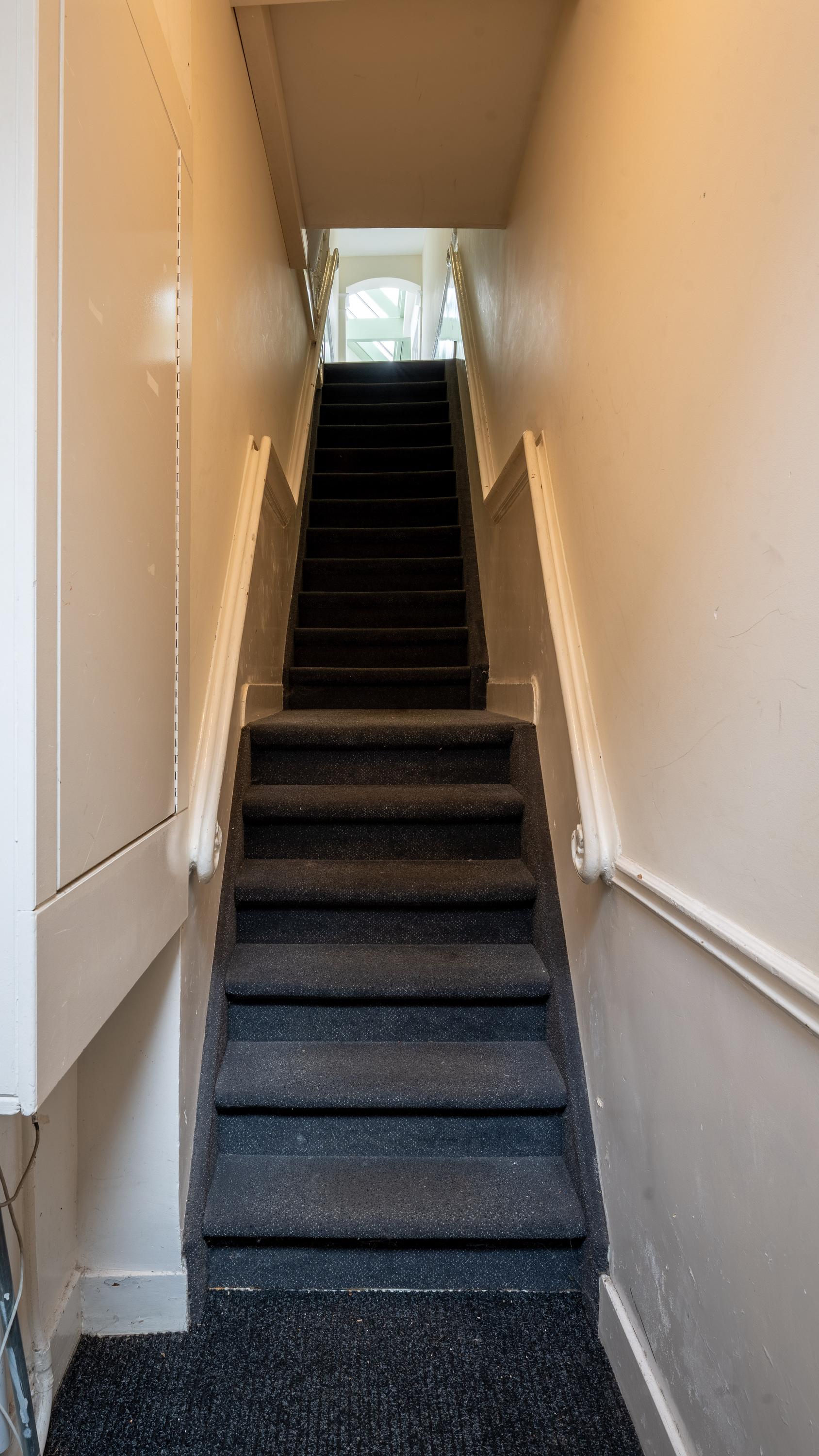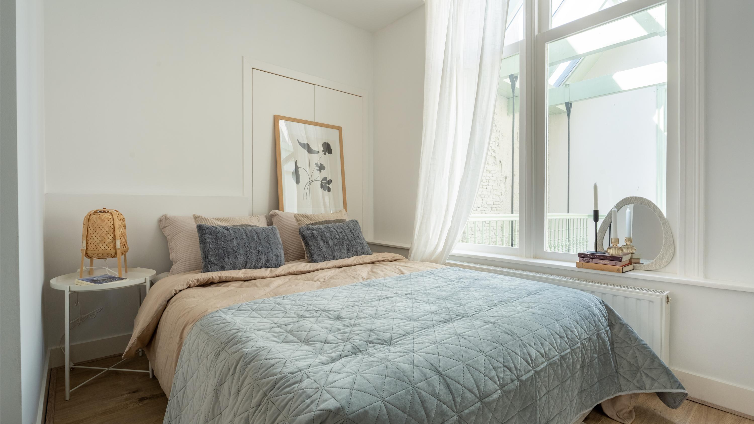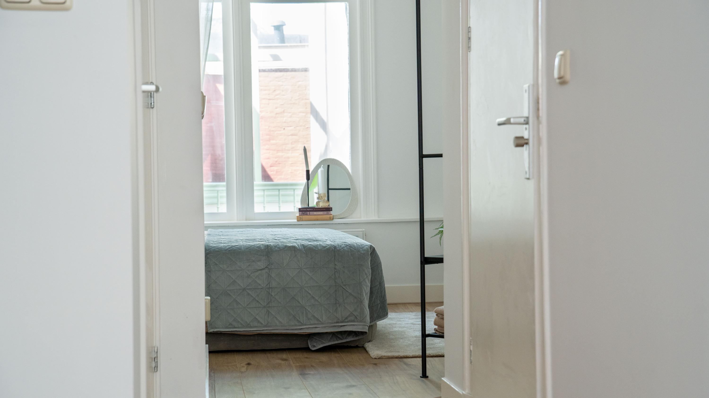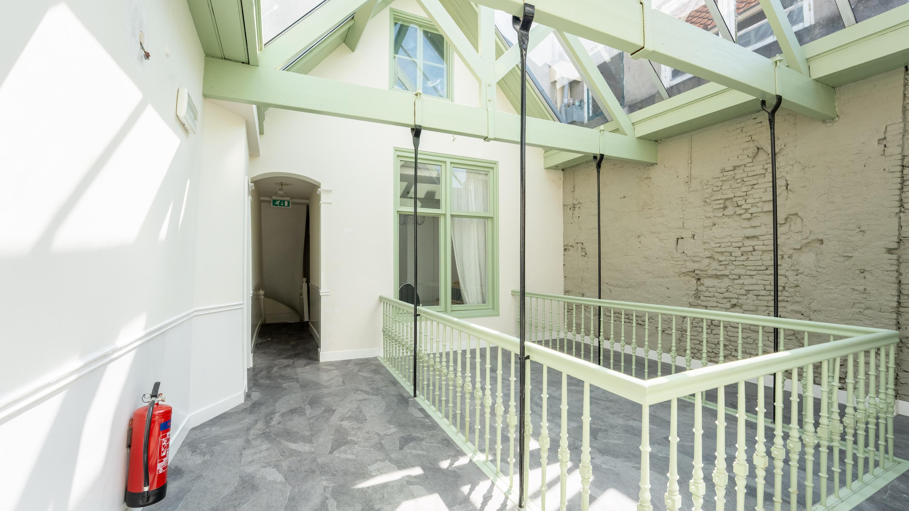 De slaapkamer is aan de achterzijde van de woning bereikbaar en geeft vanaf het bed prachtig zicht op de glazen kap constructie van de gemeenschappelijke verkeersruimte. Sfeervoller krijg je het niet.