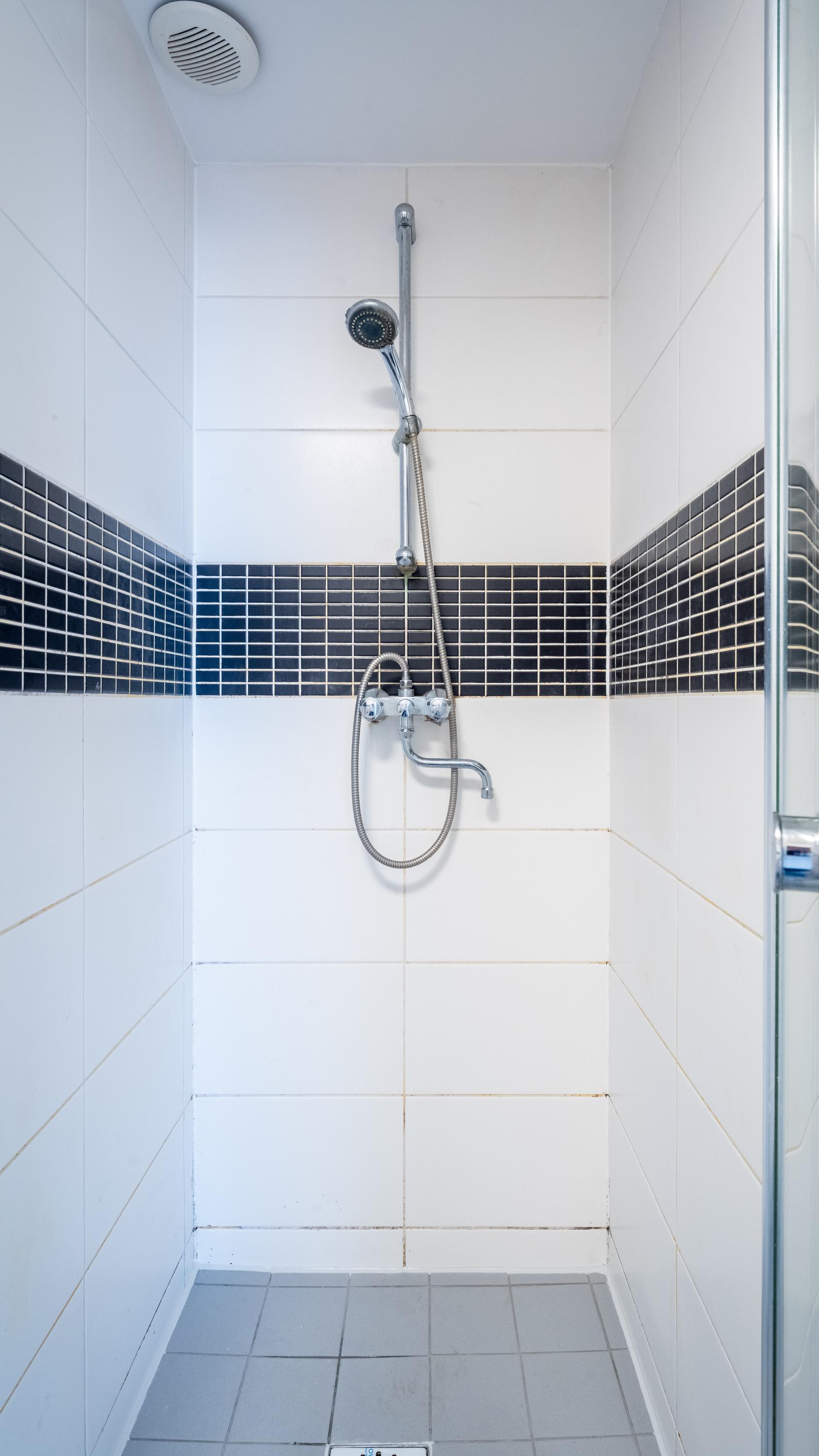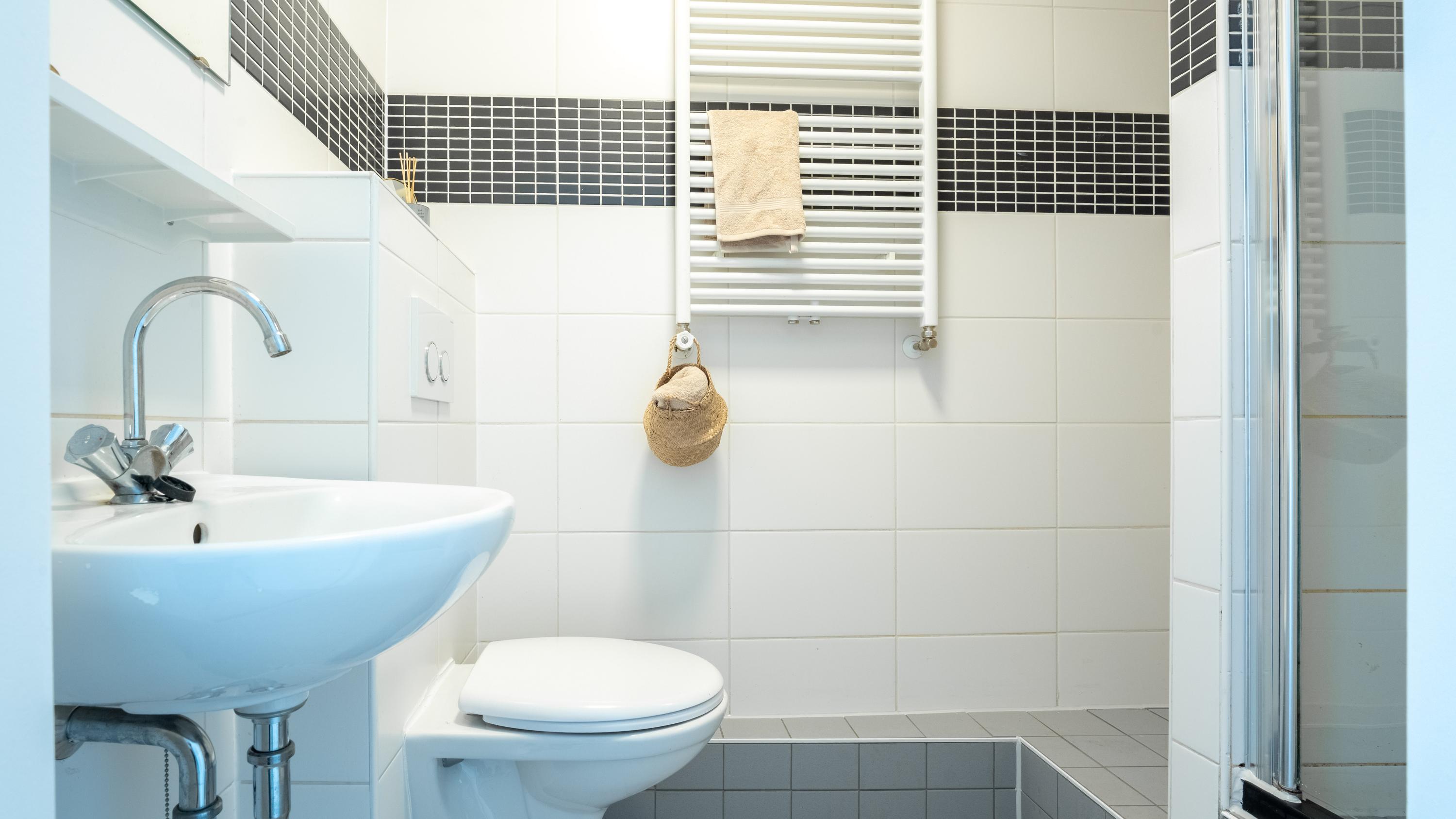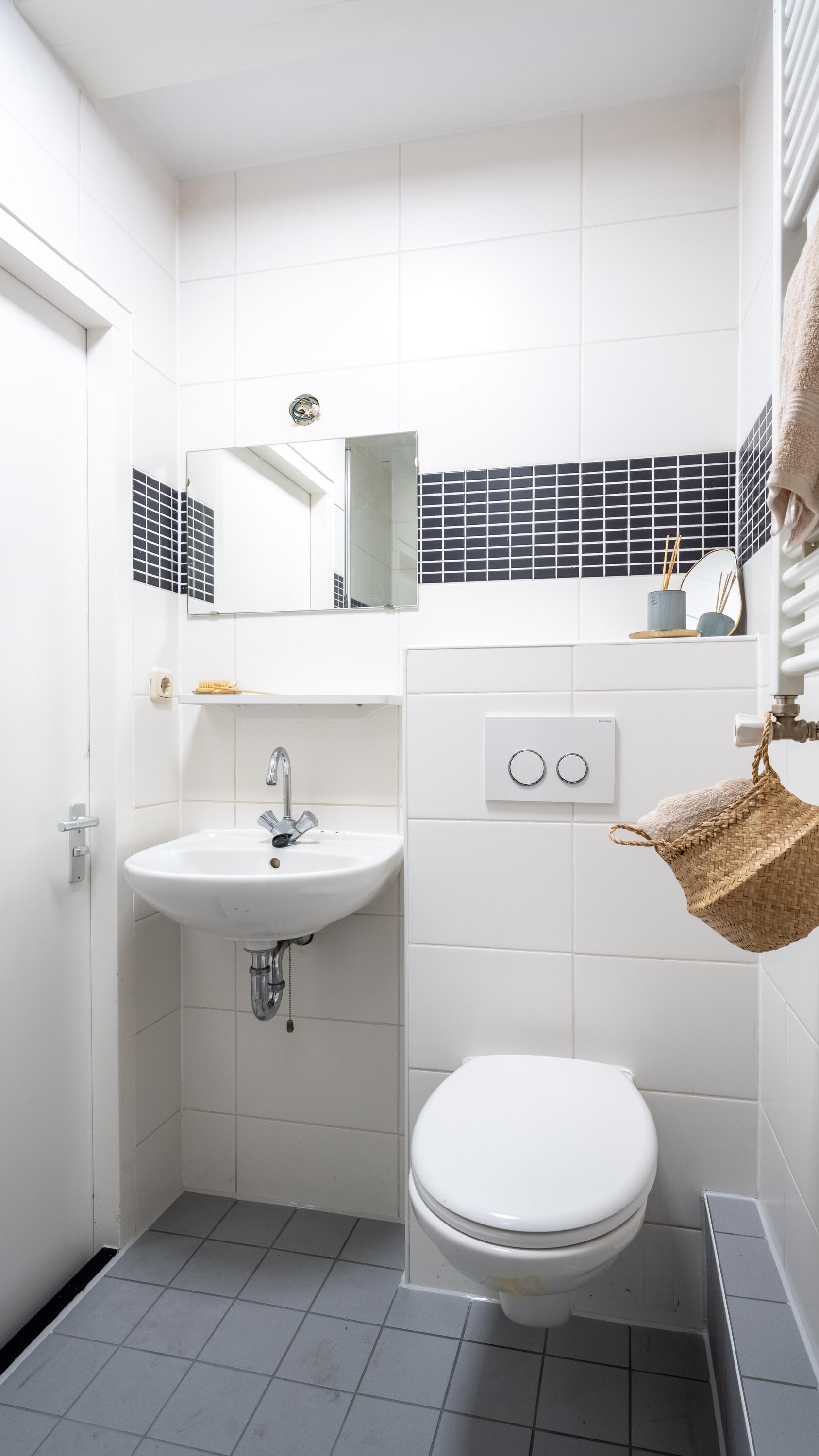 In het midden van de woning bevindt zich de volledig betegelde badkamer voorzien van douche, wastafel, toilet én wasmachine opstelmogelijkheid.