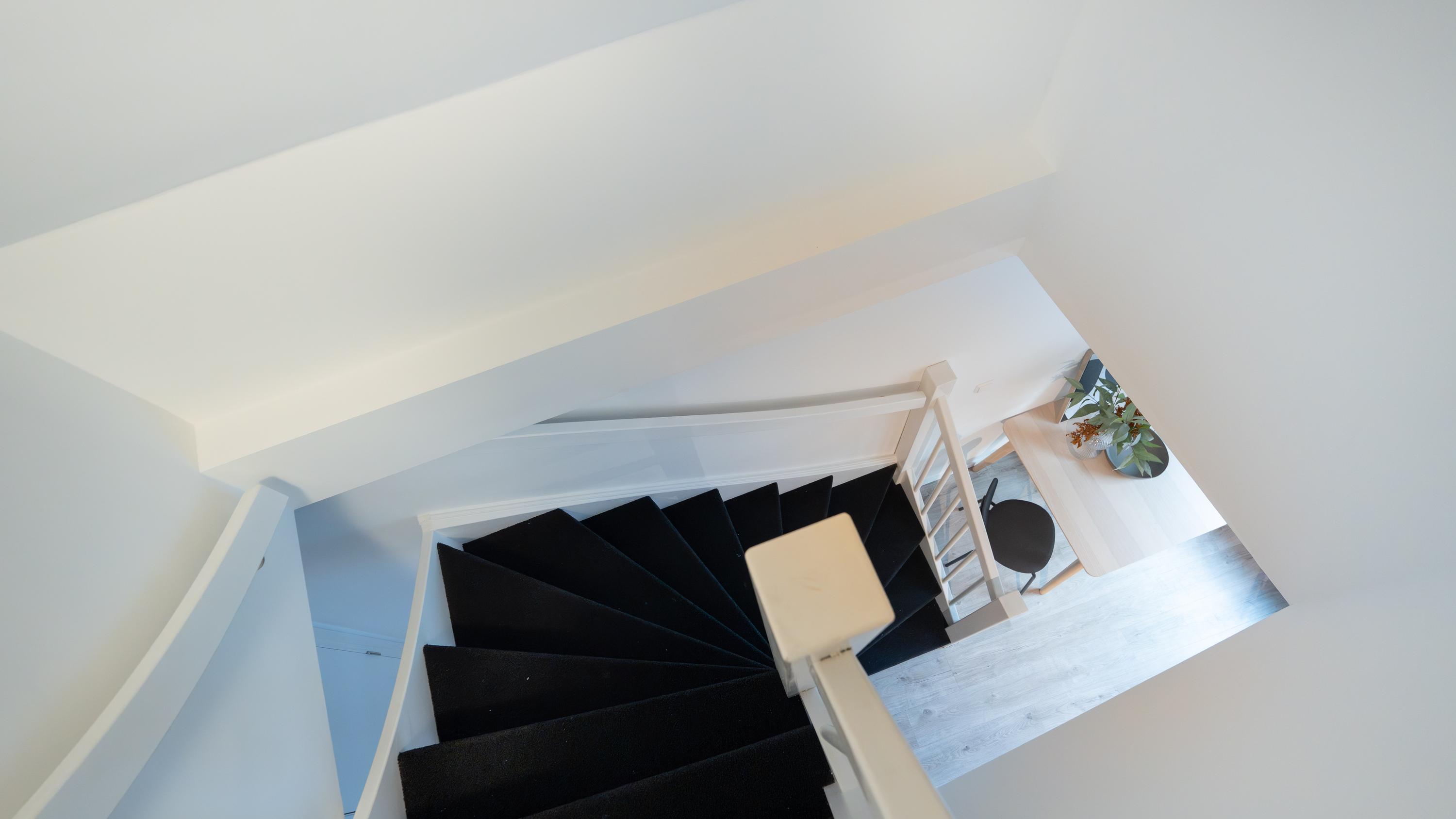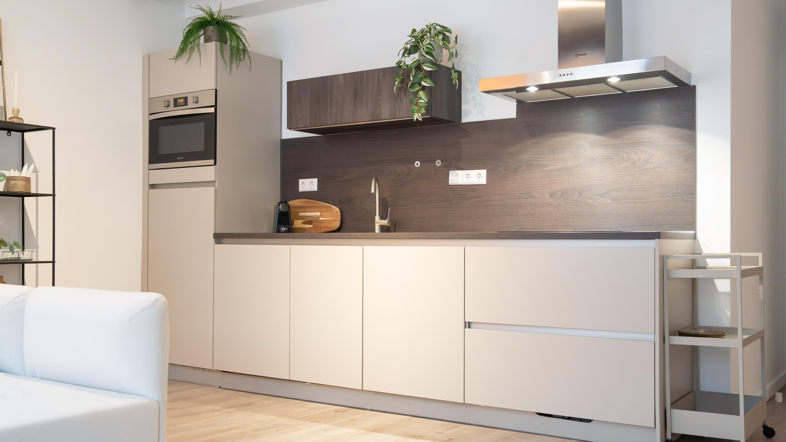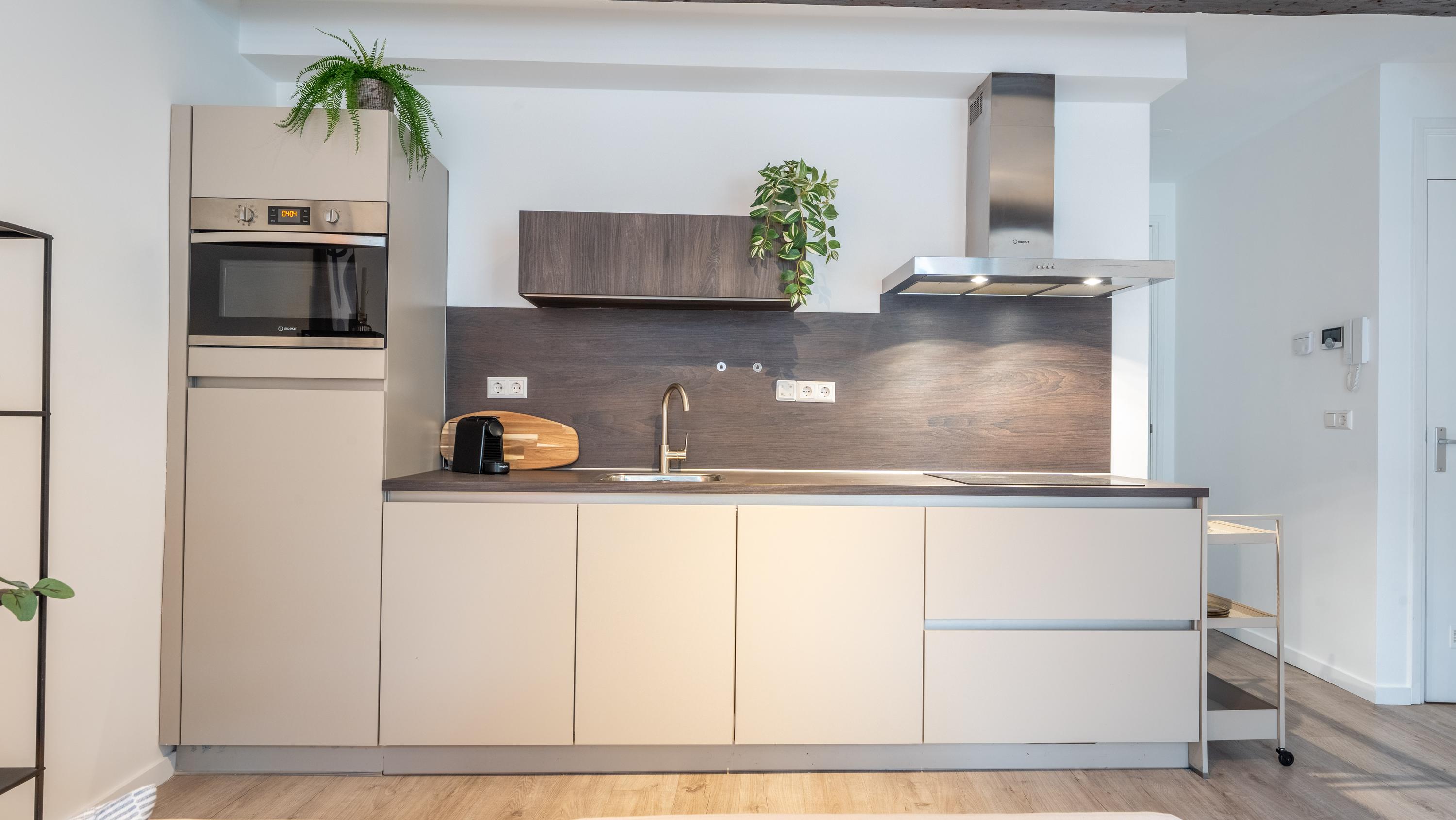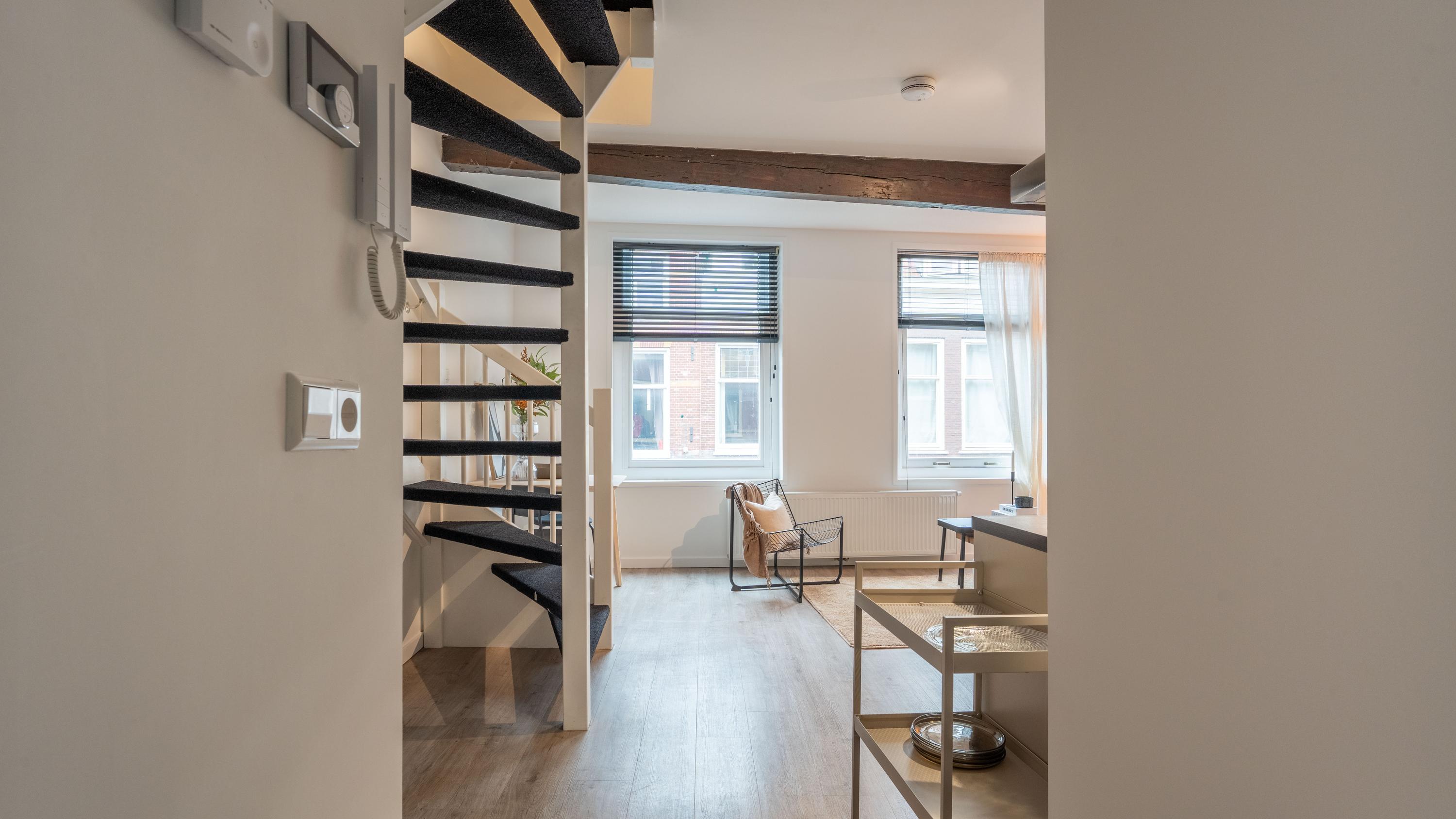 Via de gemeenschappelijke entree op de begane grond bereik je op de eerste etage de woning. Bij binnenkomst stap je na de hal direct de moderne keuken in (2022), voorzien van strakke inbouwapparatuur zoals een inductiekookplaat, vaatwasser, afzuigkap en een koelkast met vriesvak. Om optimaal van de ruimte gebruik te maken is er zelfs een wasmachine ingebouwd — praktisch en uit het zicht.
