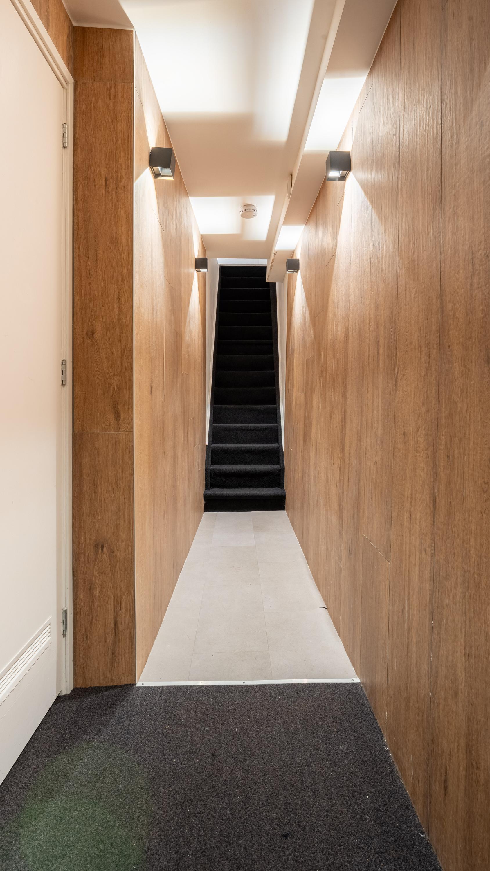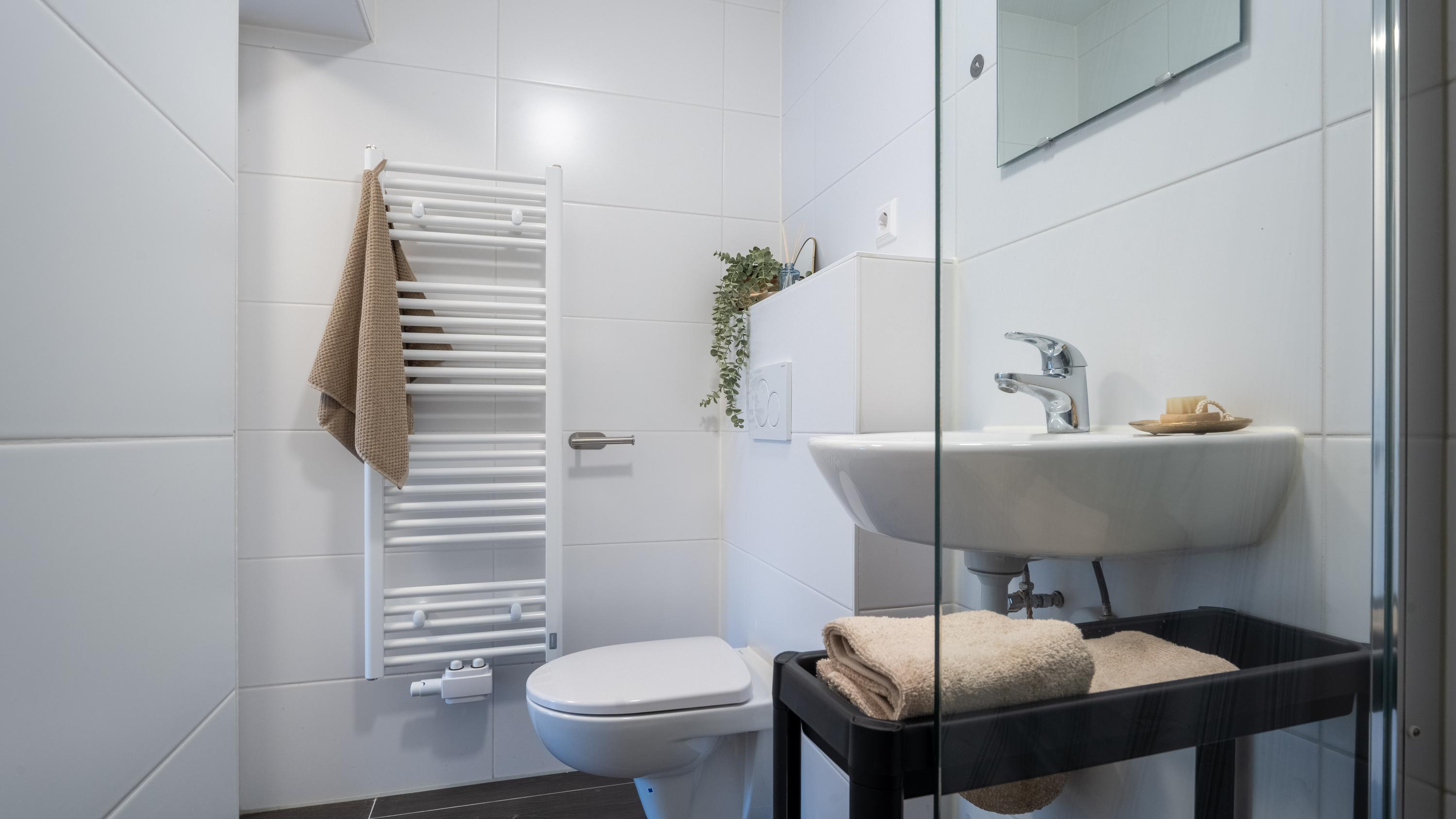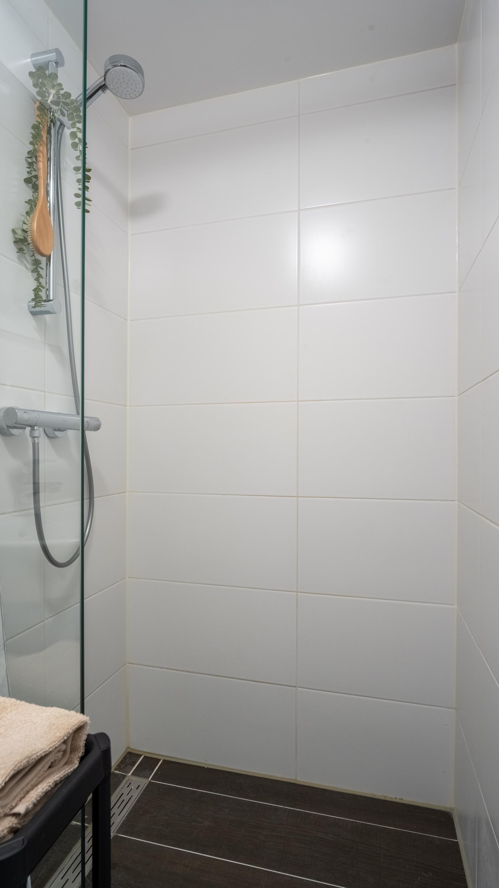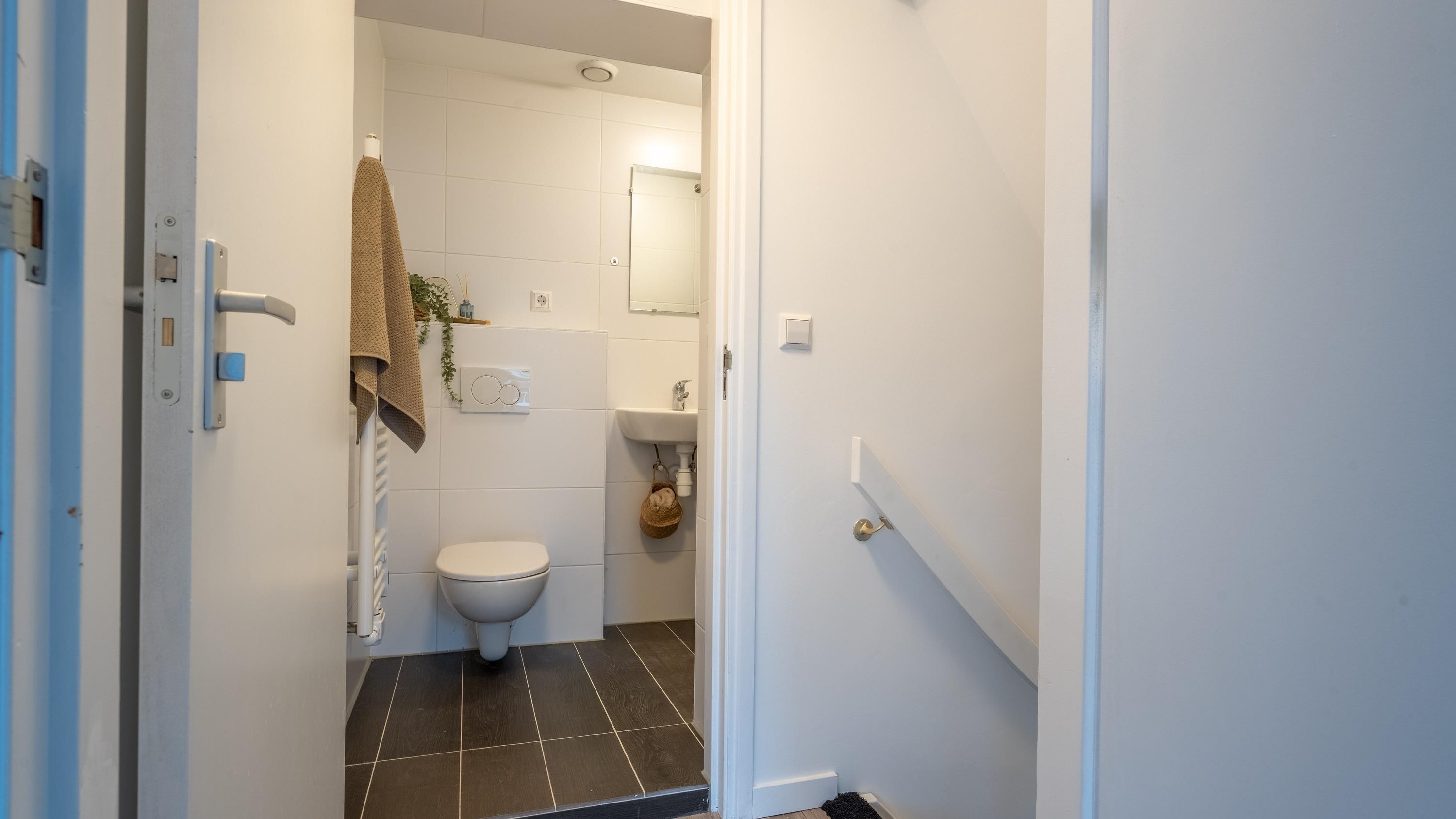 Via de gemeenschappelijke entree op de begane grond bereik je op de eerste etage de woning. Bij binnenkomst stap je na de hal direct de moderne keuken in (2022), voorzien van strakke inbouwapparatuur zoals een inductiekookplaat, vaatwasser, afzuigkap en een koelkast met vriesvak. Om optimaal van de ruimte gebruik te maken is er zelfs een wasmachine ingebouwd — praktisch en uit het zicht.