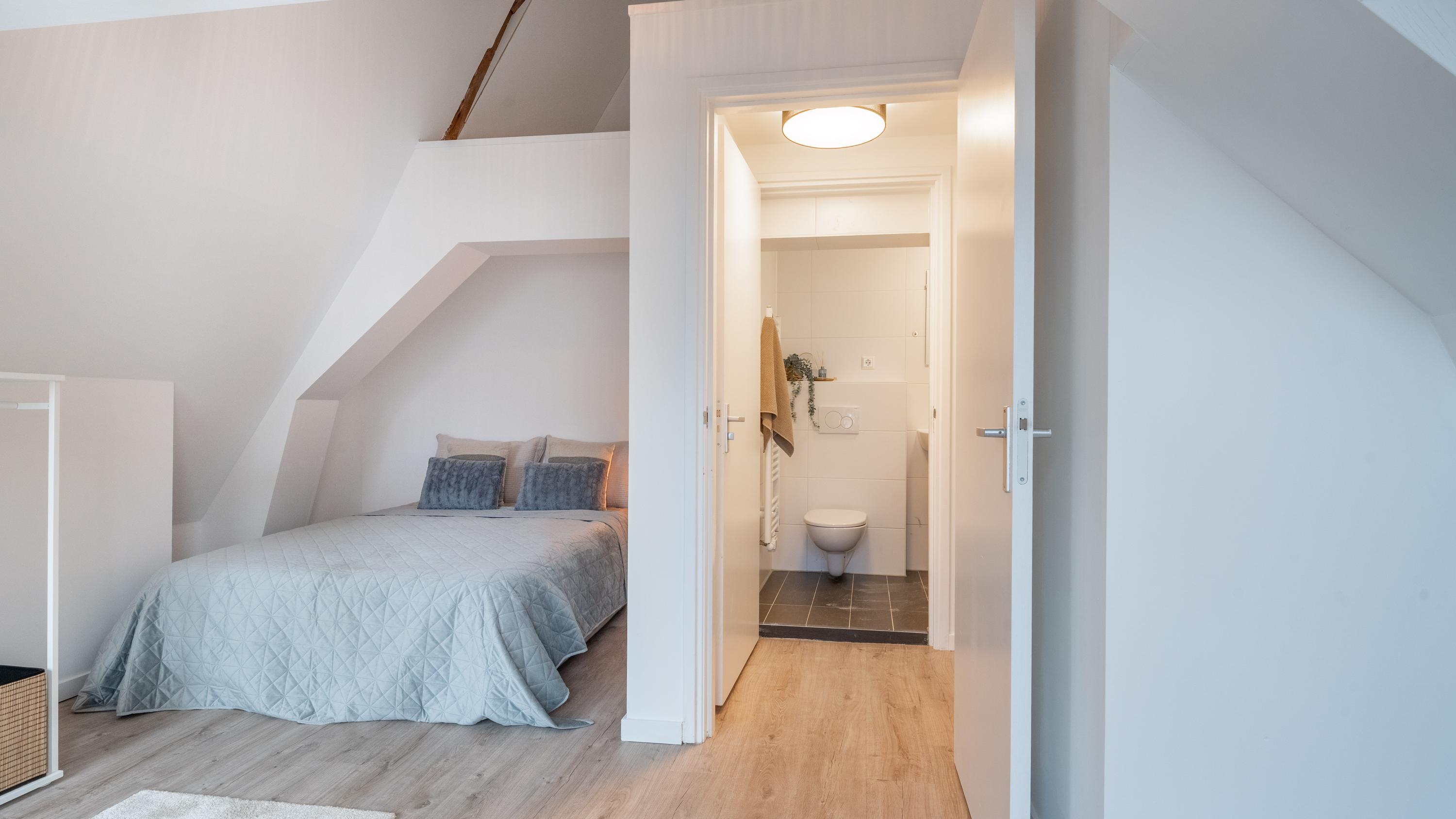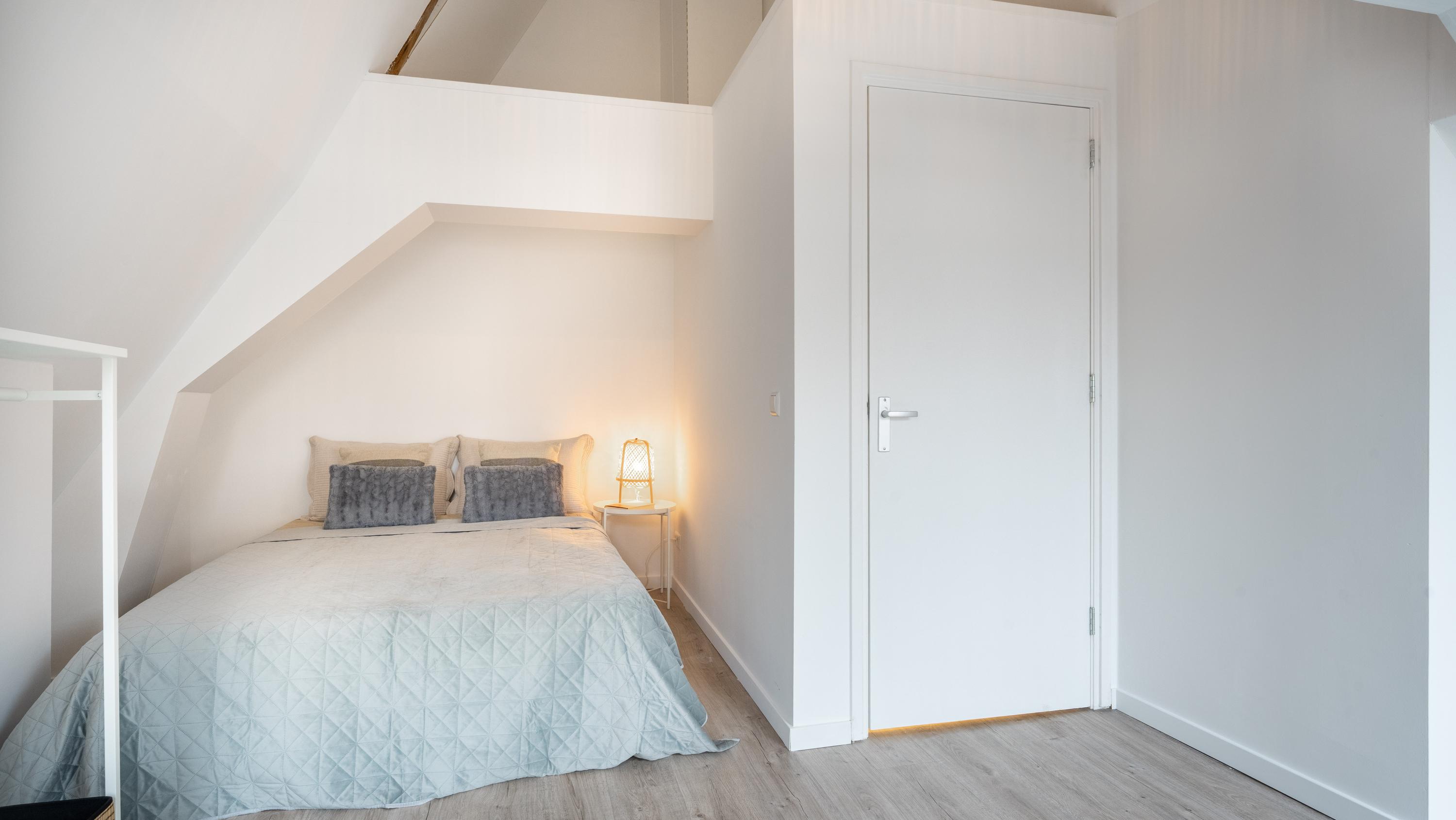De woonkamer is met de dubbele ramen prettig licht en met sfeervol uitzicht op de winkelstraat. Middels vaste trap naar de tweede etage is er vanaf de overloop toegang tot de badkamer. Deze is compact maar stijlvol, met een inloopdouche, toilet en wastafel. De ruime, lichte slaapkamer is prettig ingedeeld en door de hoge nok is er zelfs een entresol gecreëerd voor de nodige opslagruimte alsmede technische kast voor cv en ventilatie box.