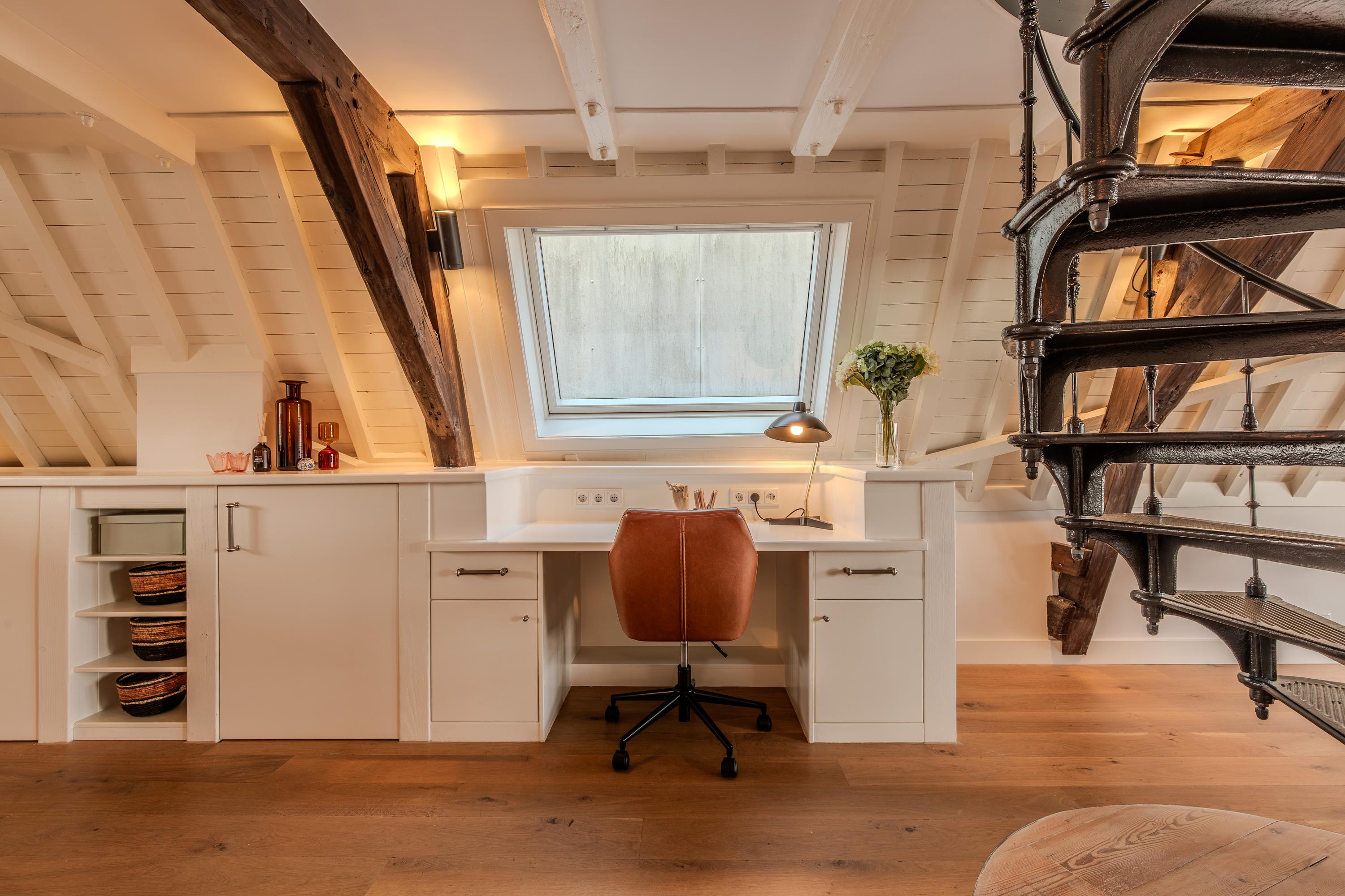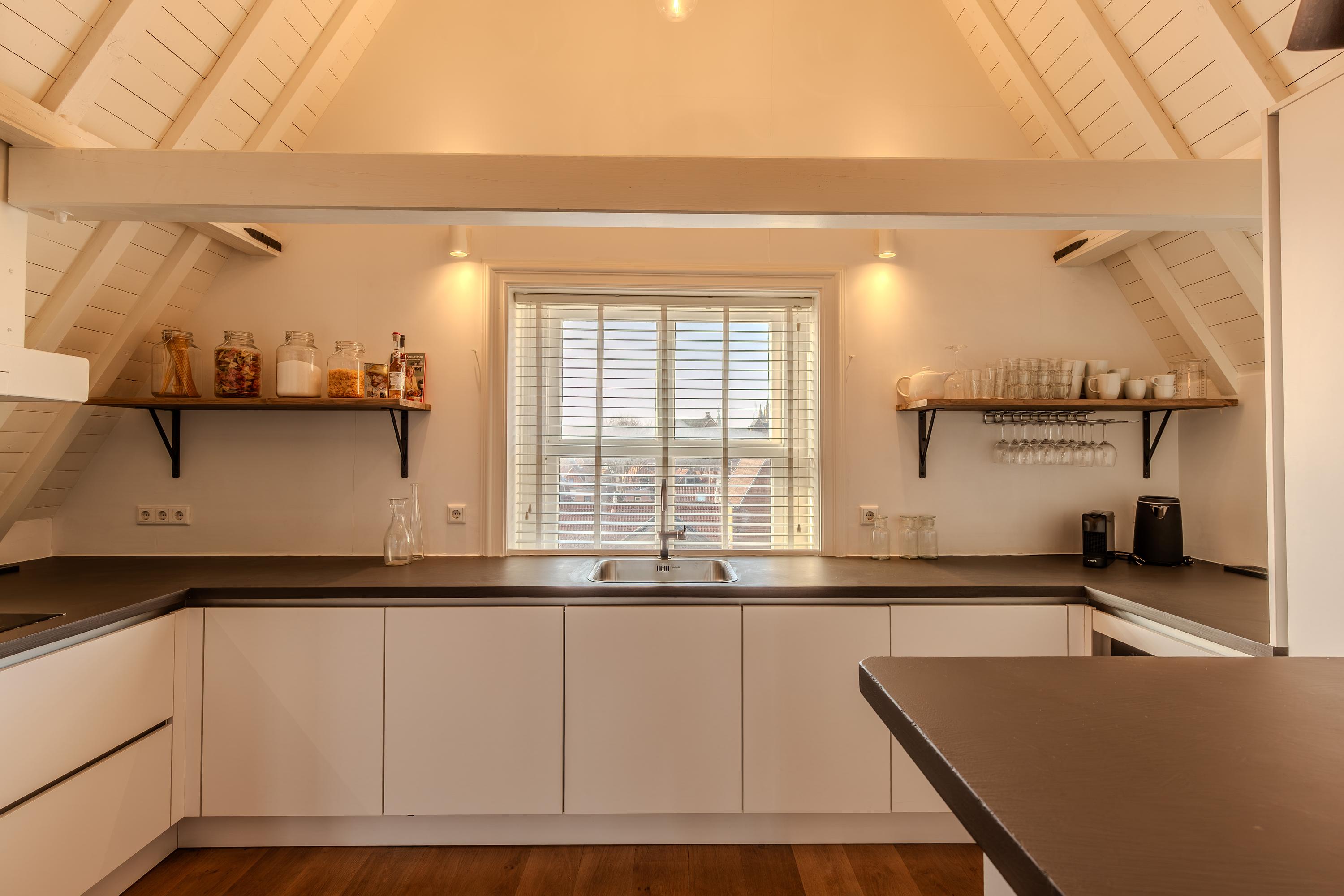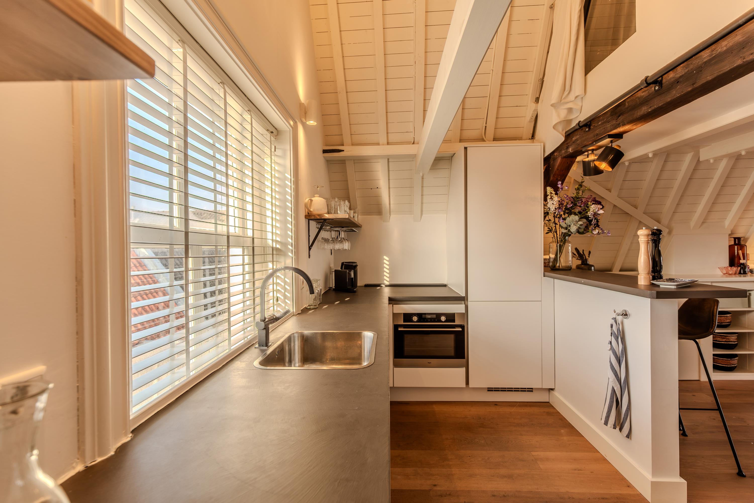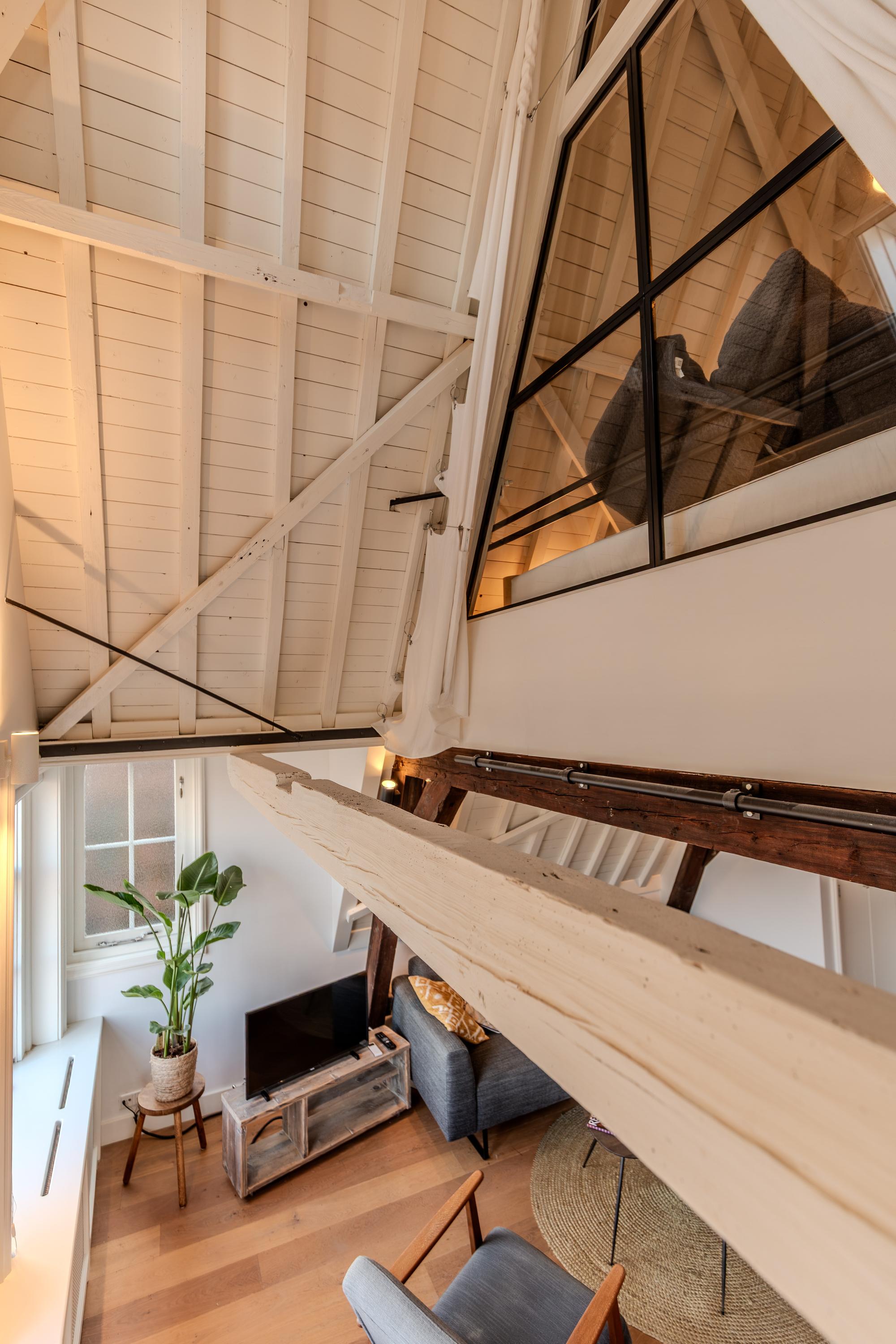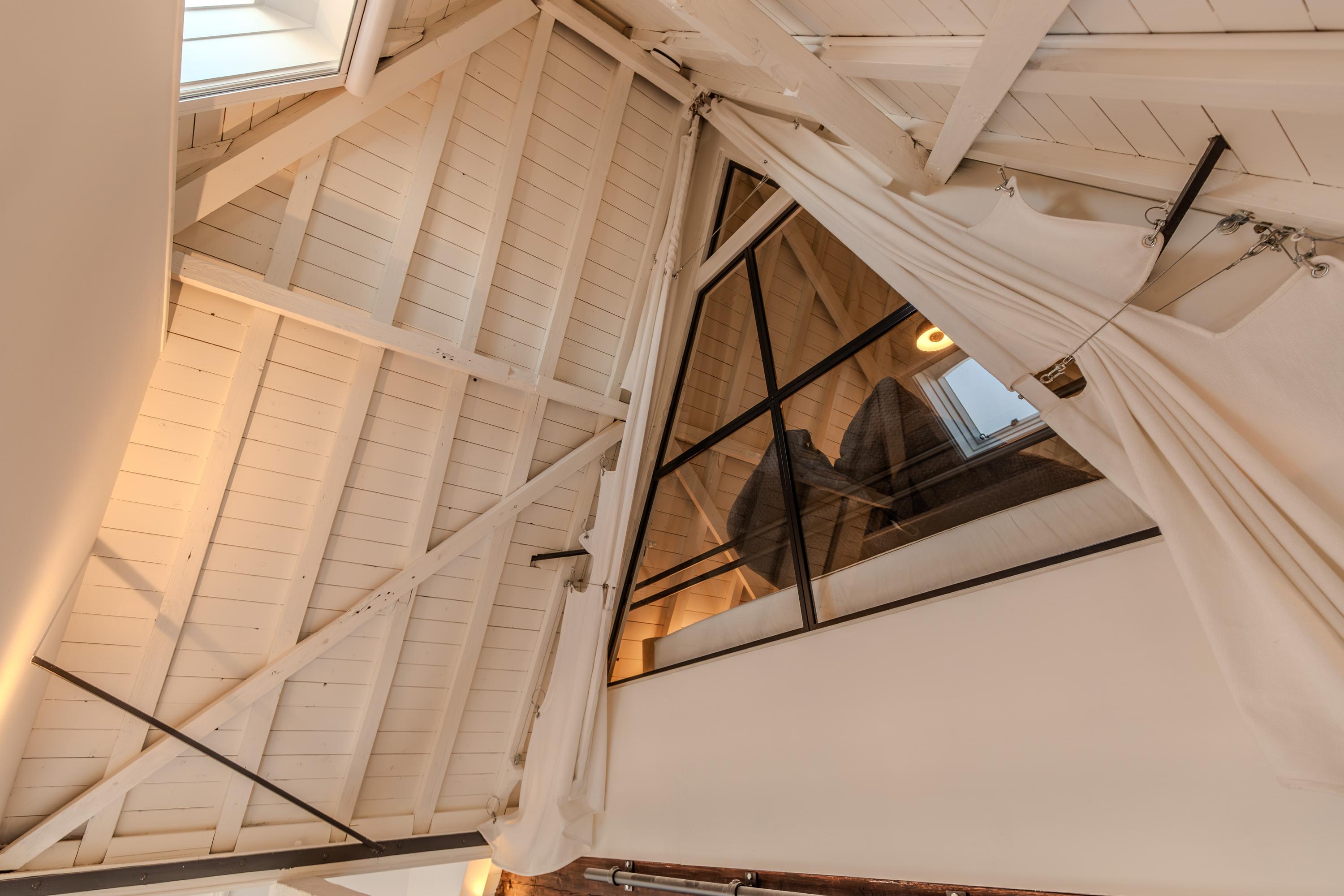 Indirecte verlichting en de positie in de kapconstructie van het pand maken het geheel nóg sfeervoller. Met tactisch geplaatste raamkozijnen is er sfeervol zicht over de vides van woonkamer en keuken.