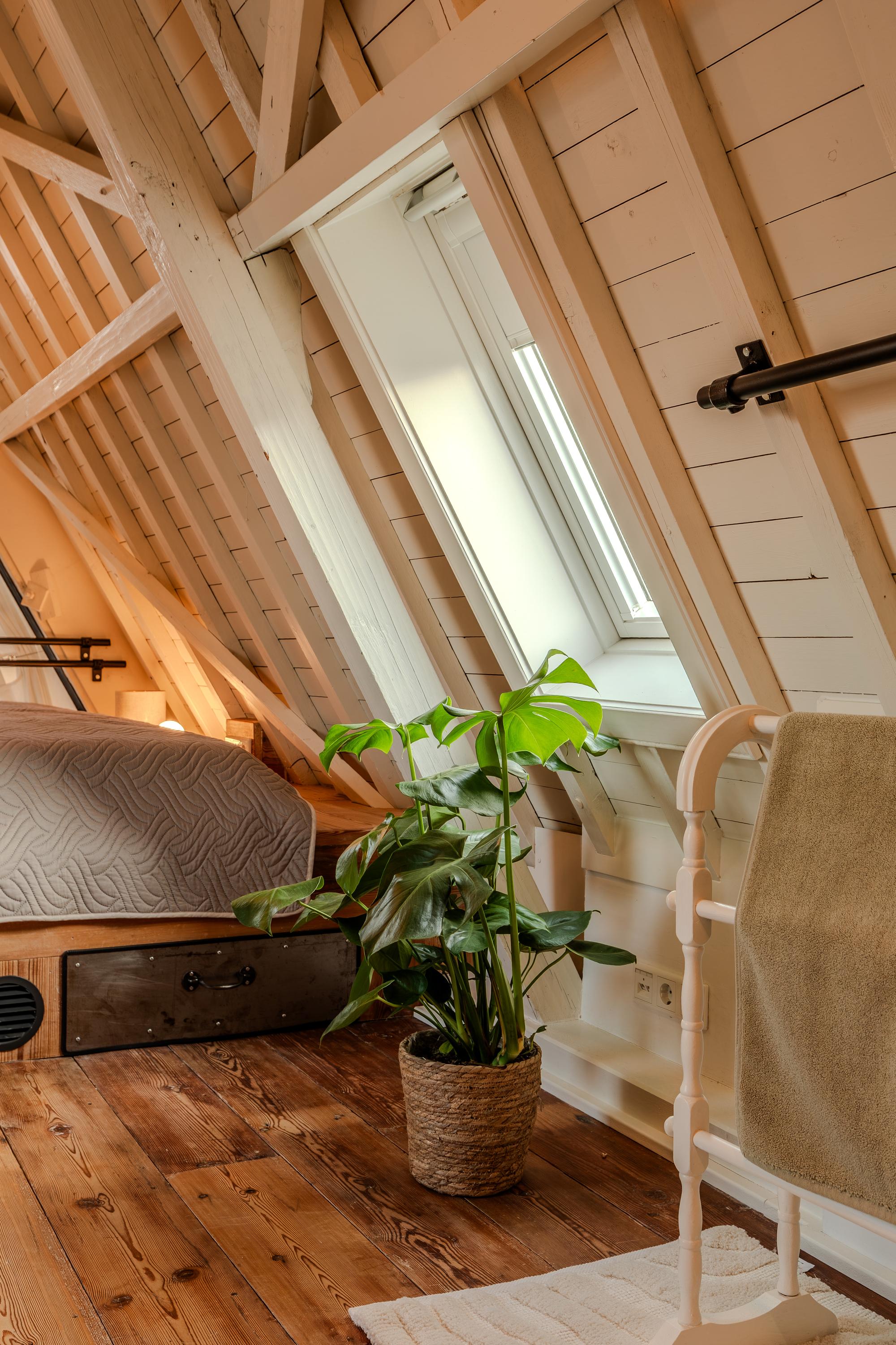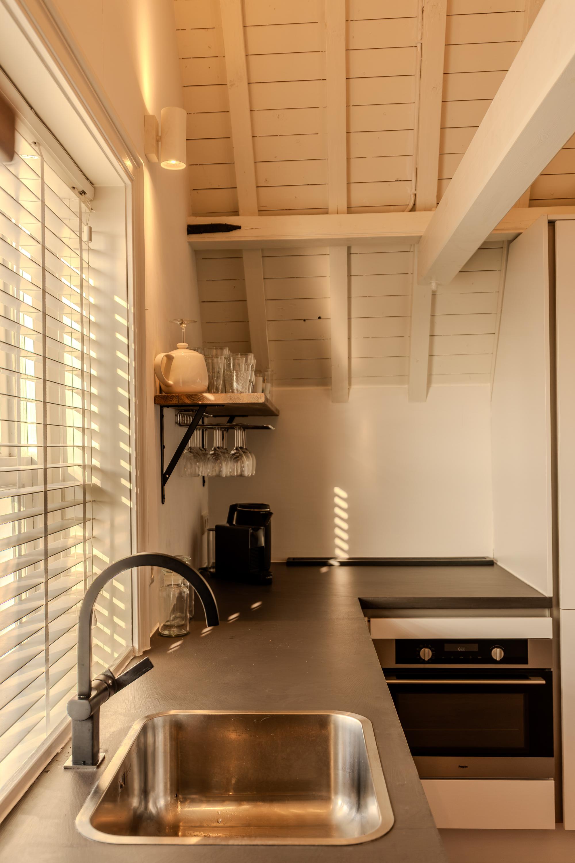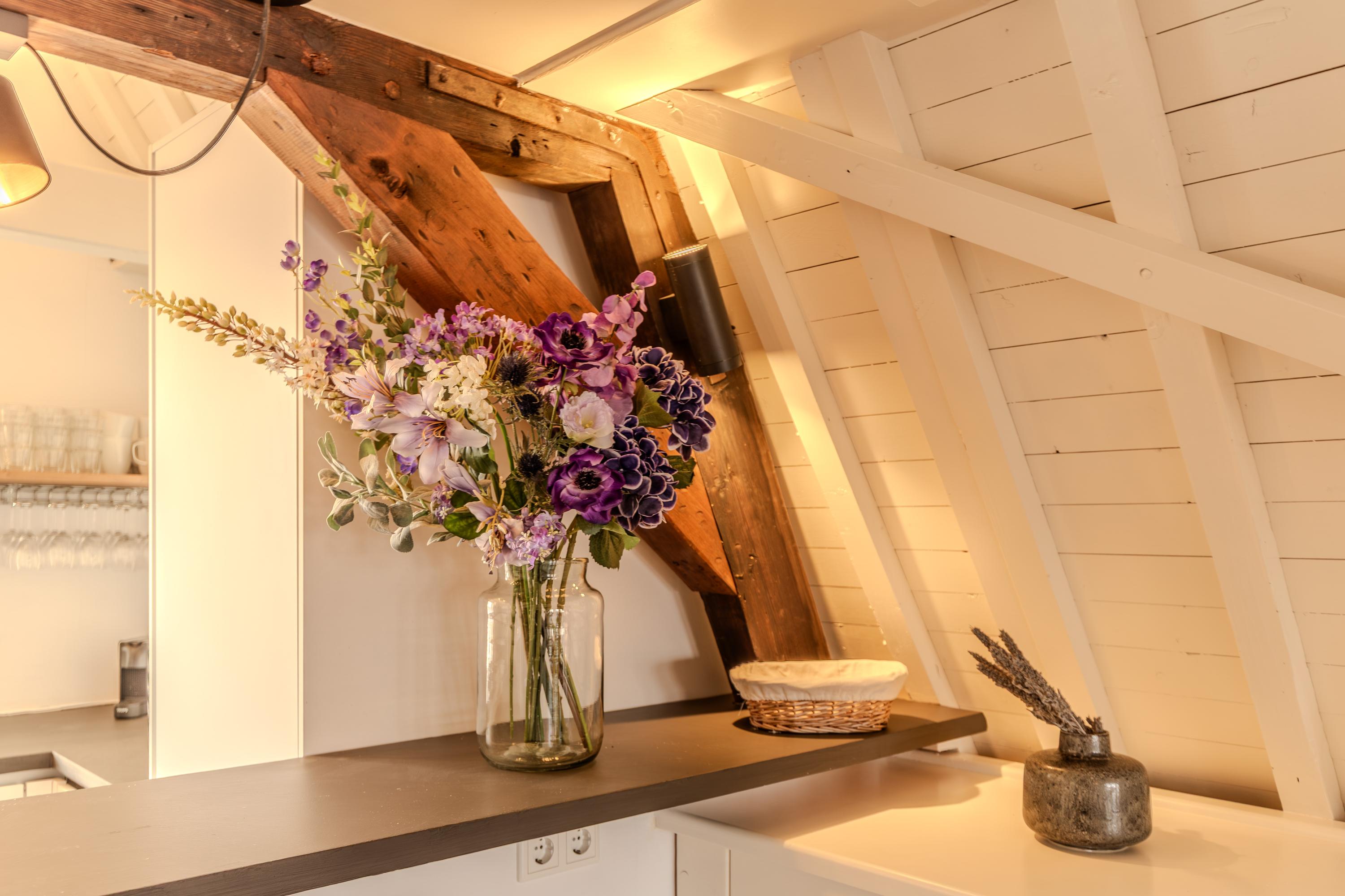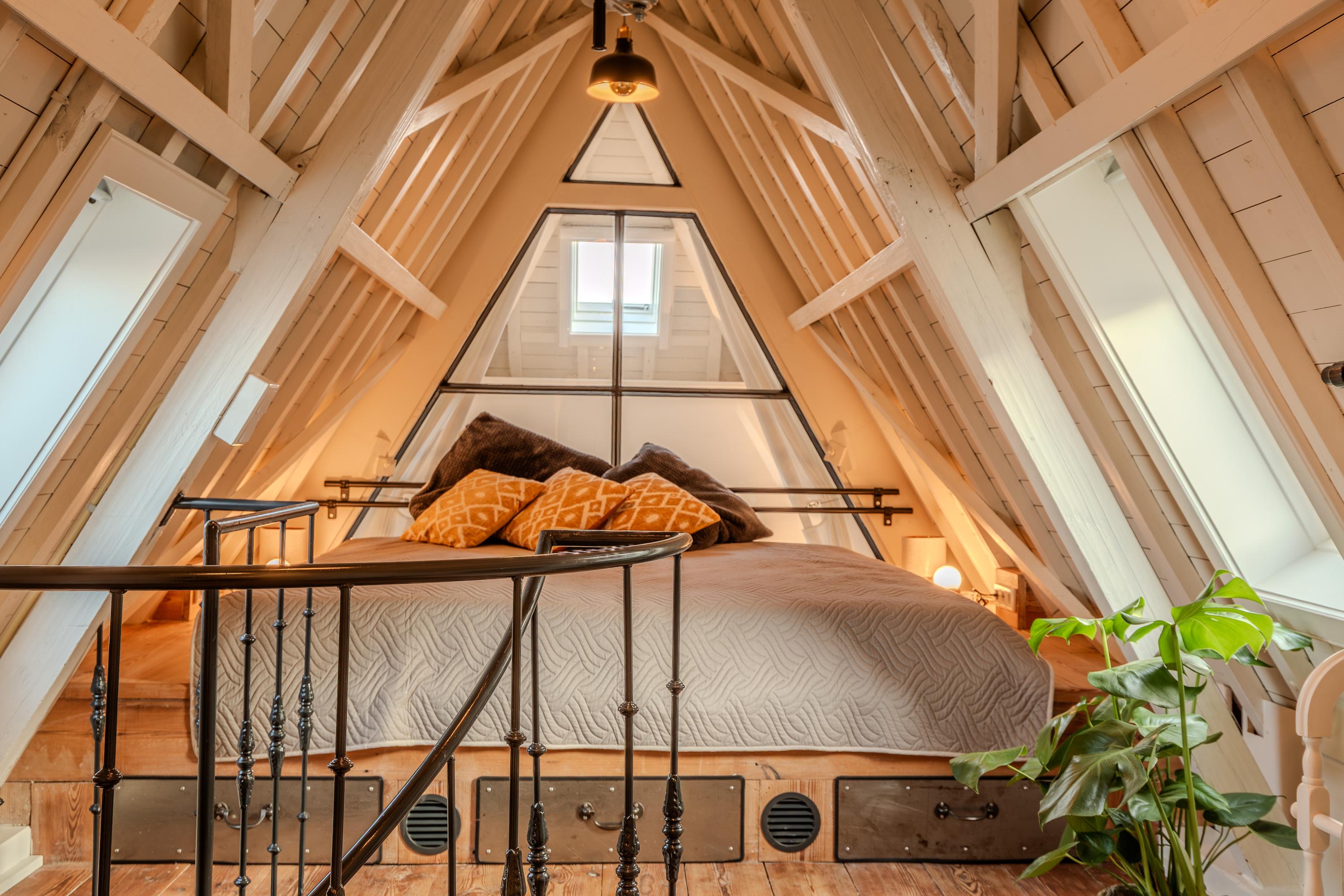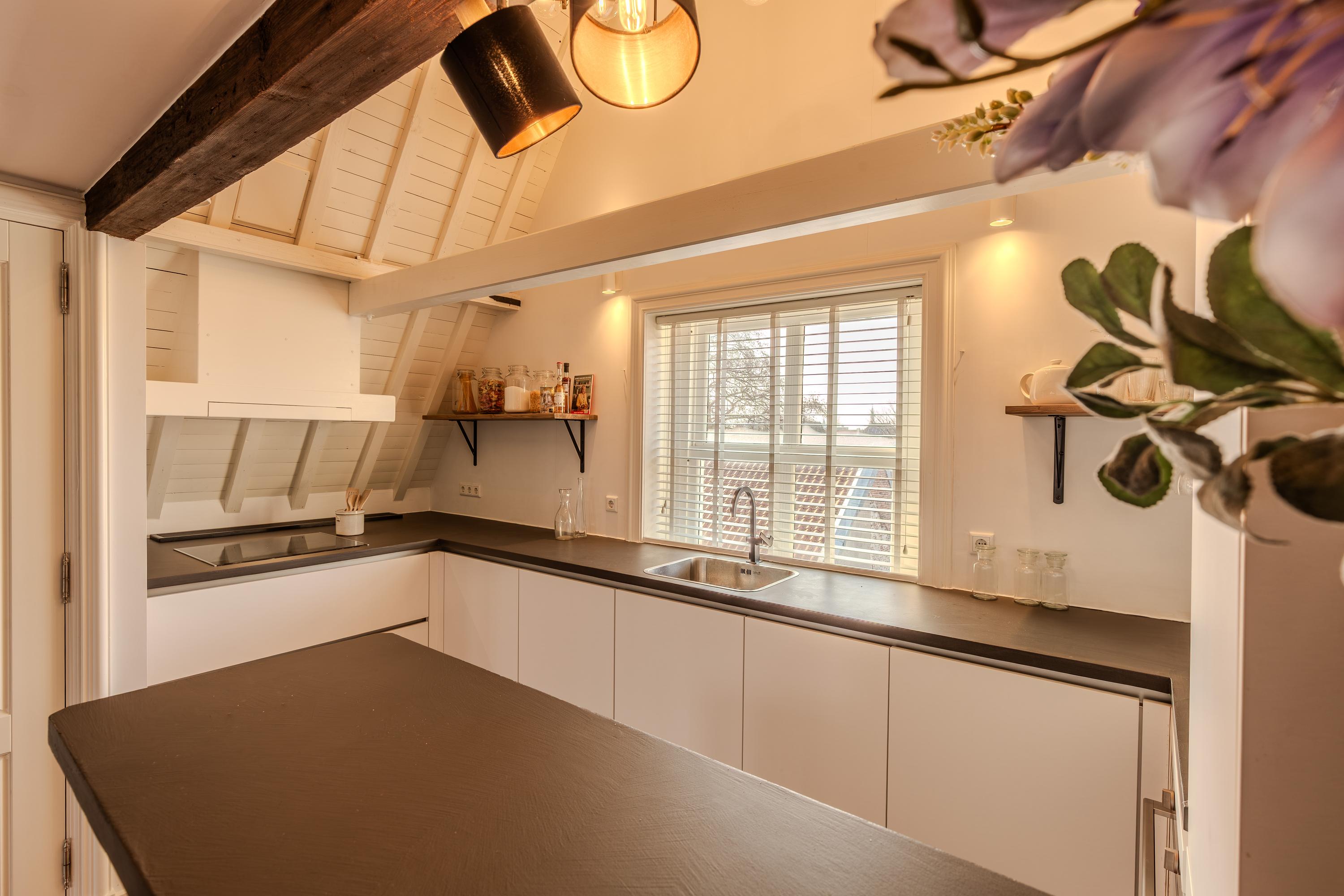 Indirecte verlichting en de positie in de kapconstructie van het pand maken het geheel nóg sfeervoller. Met tactisch geplaatste raamkozijnen is er sfeervol zicht over de vides van woonkamer en keuken.