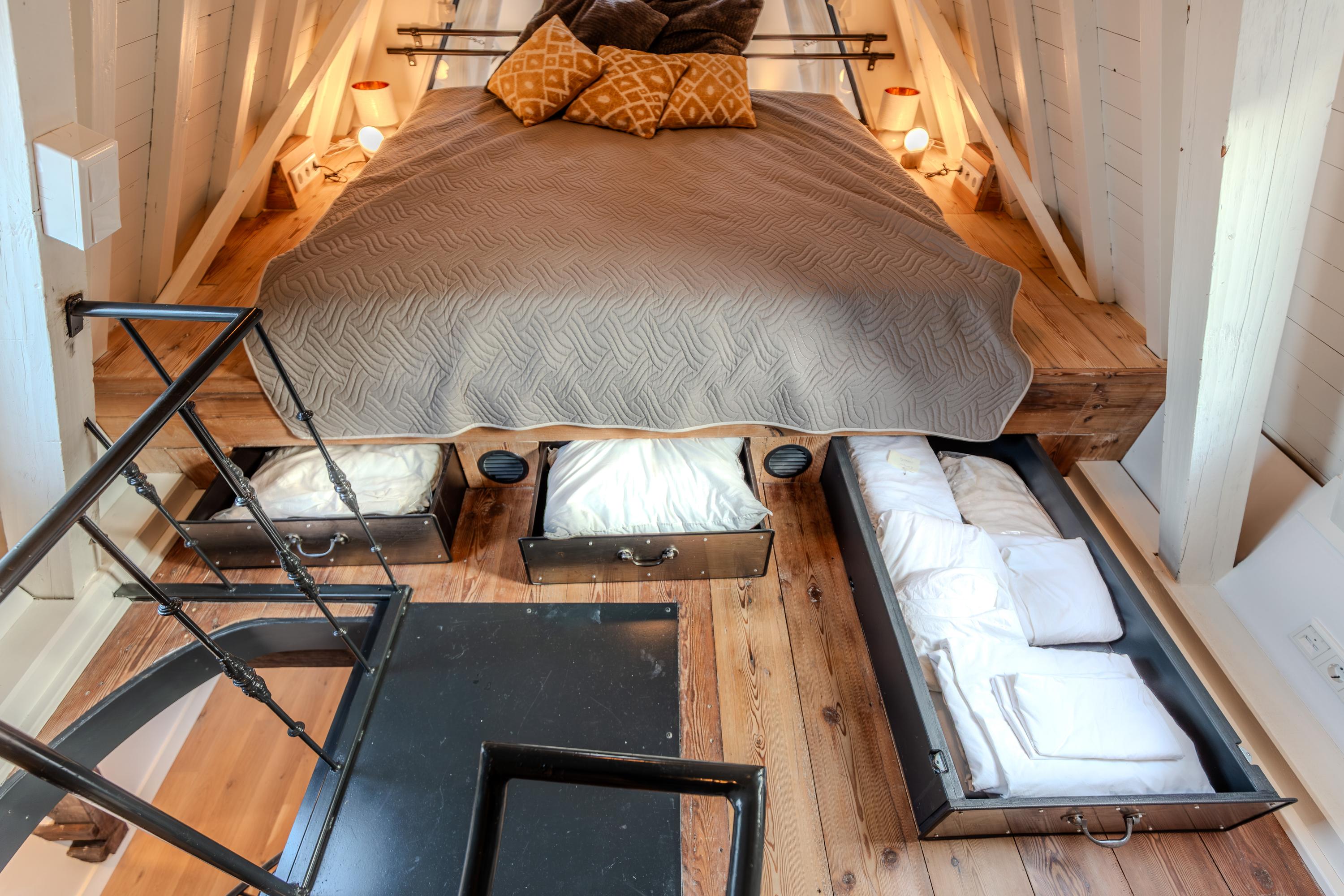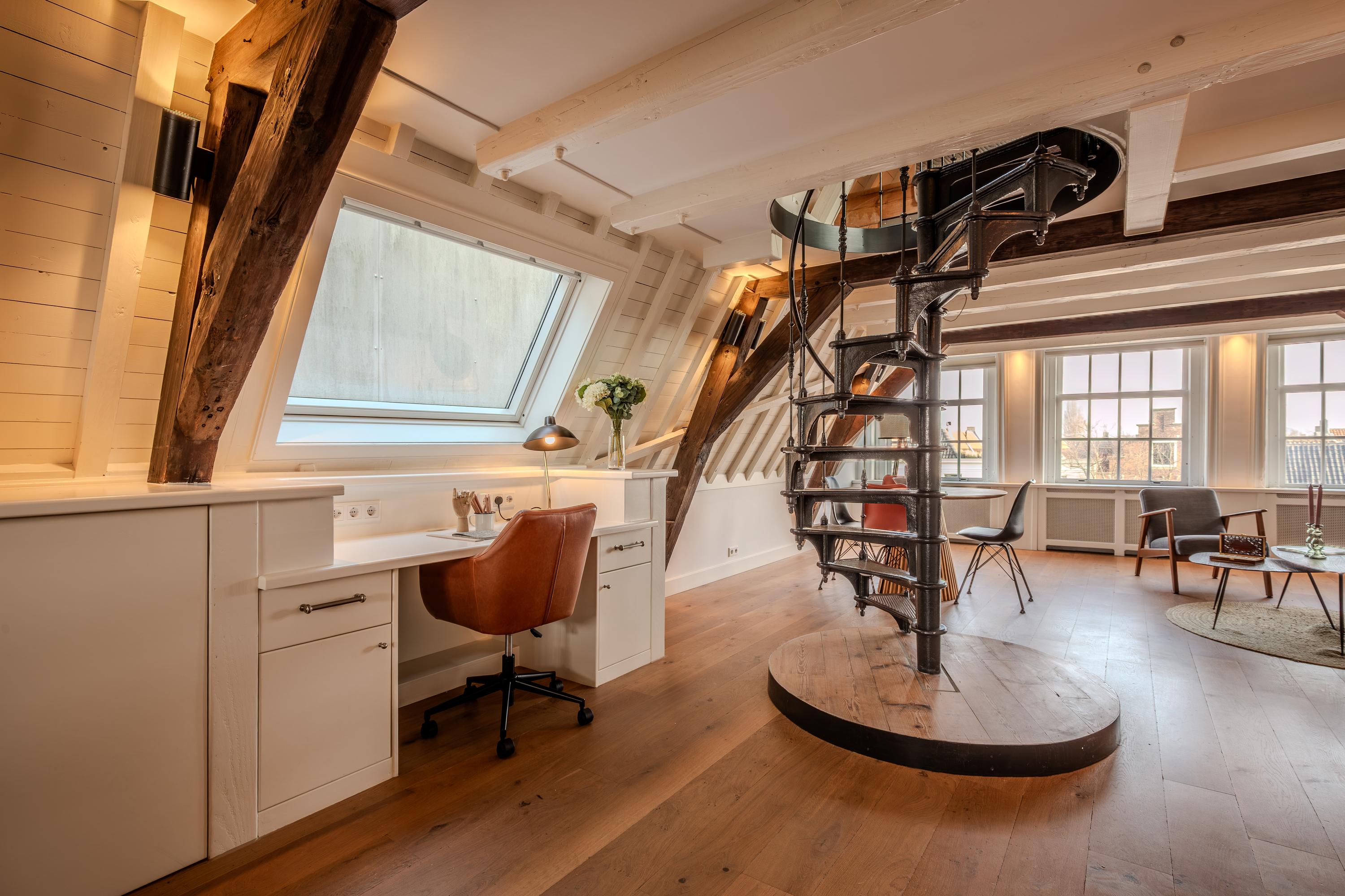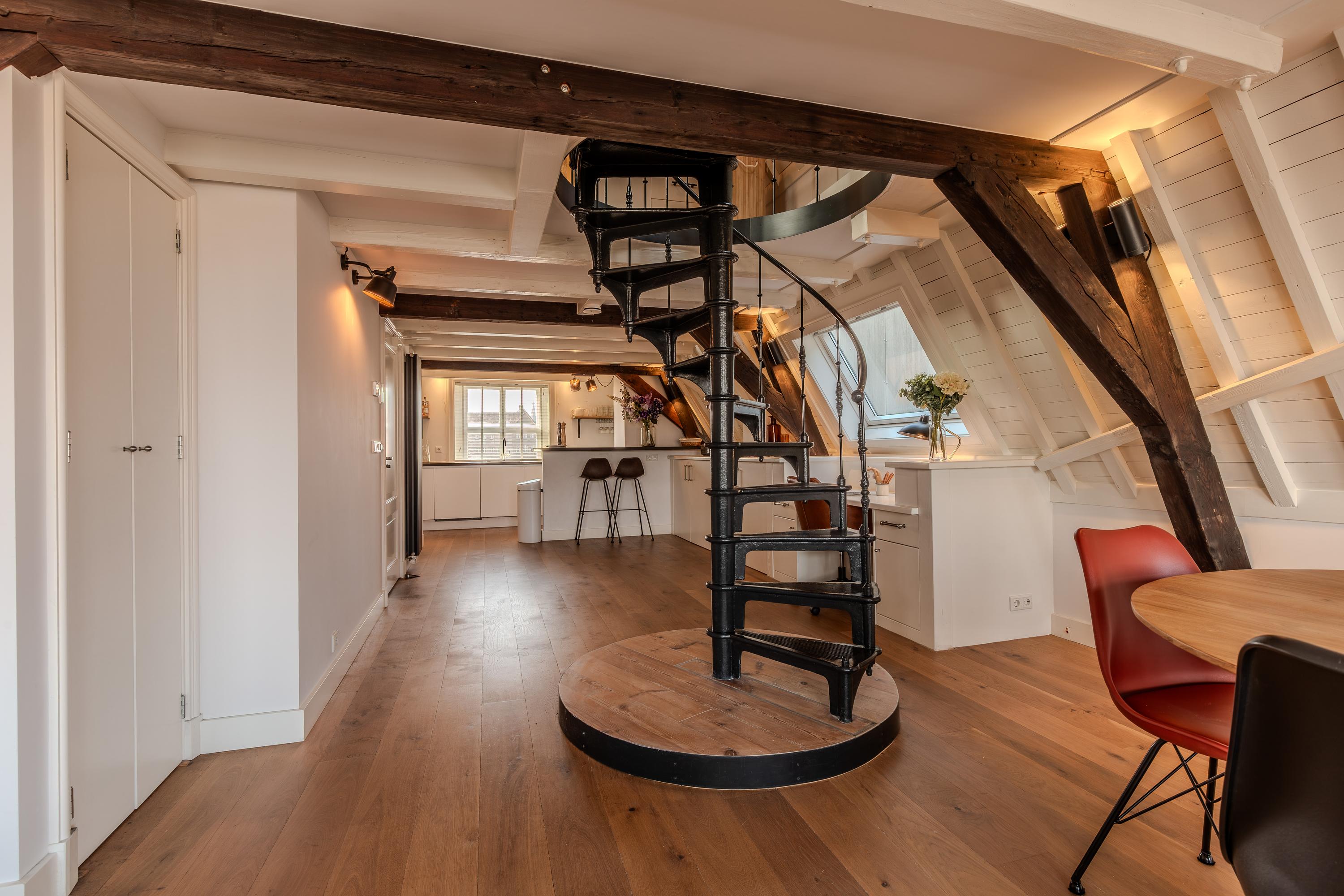 De speciaal voor de woning gemaakte, gietijzeren wenteltrap is behalve praktisch voor de ruimte ook nog eens tril en geluidsarm gemonteerd ten behoeve van het eigen én burencomfort.