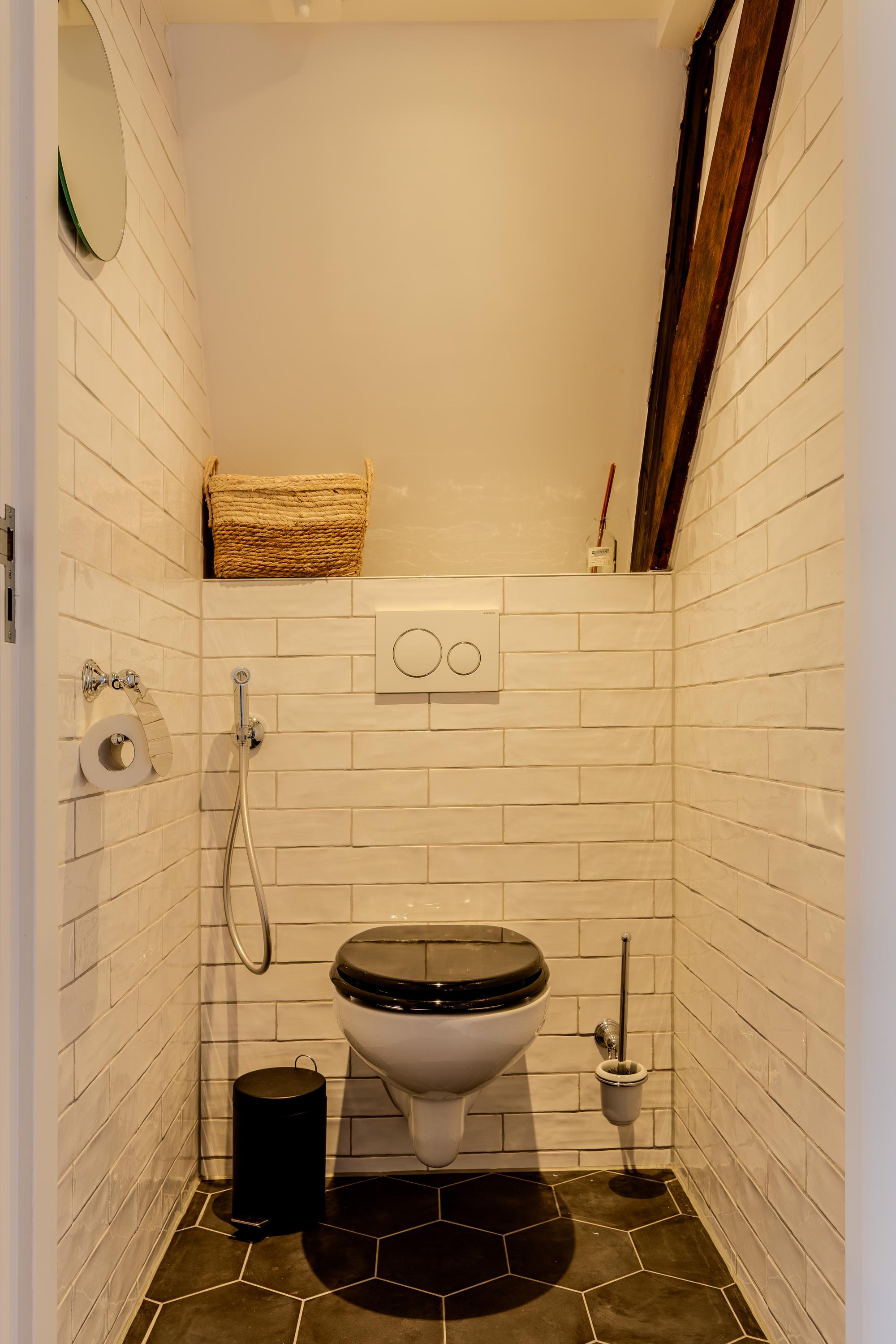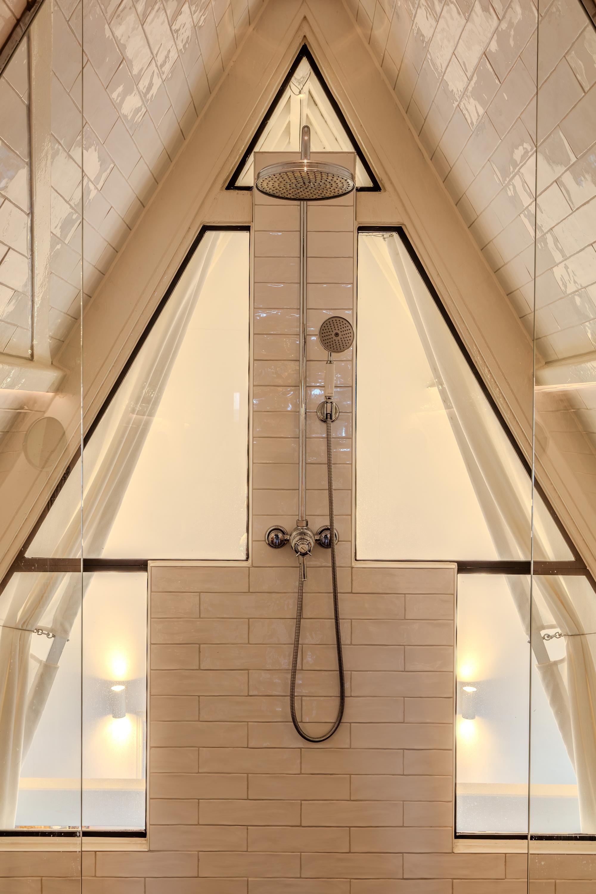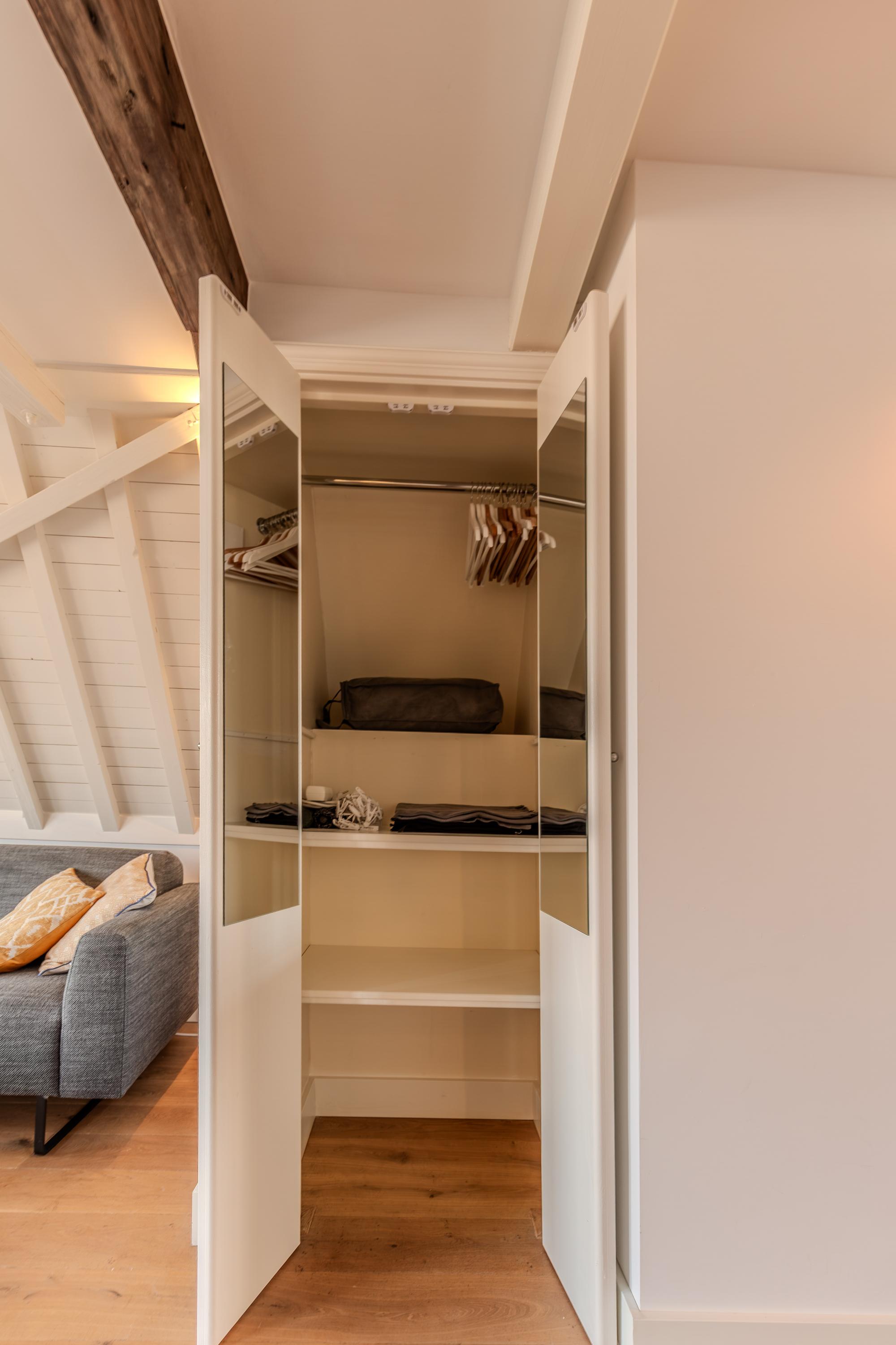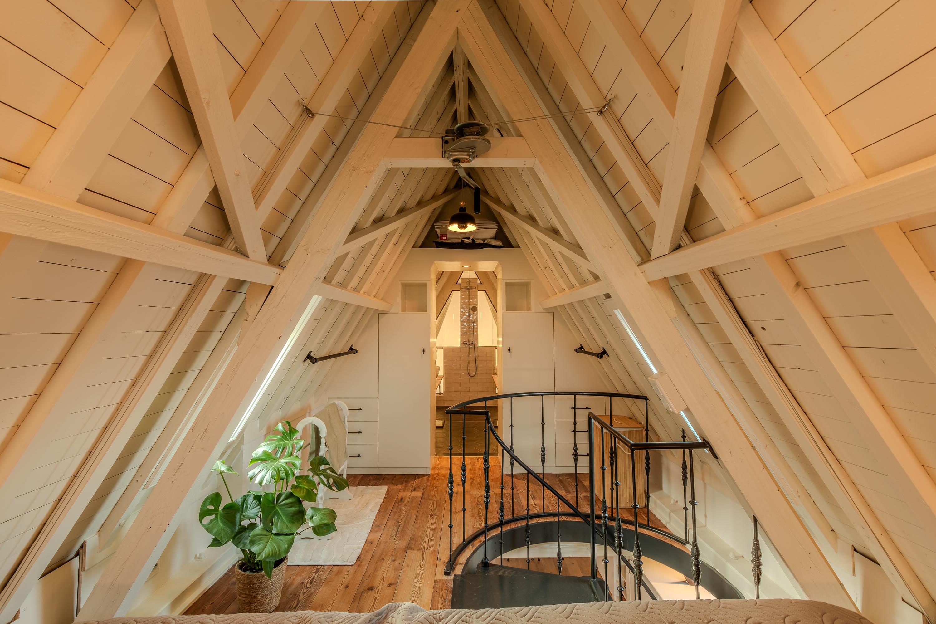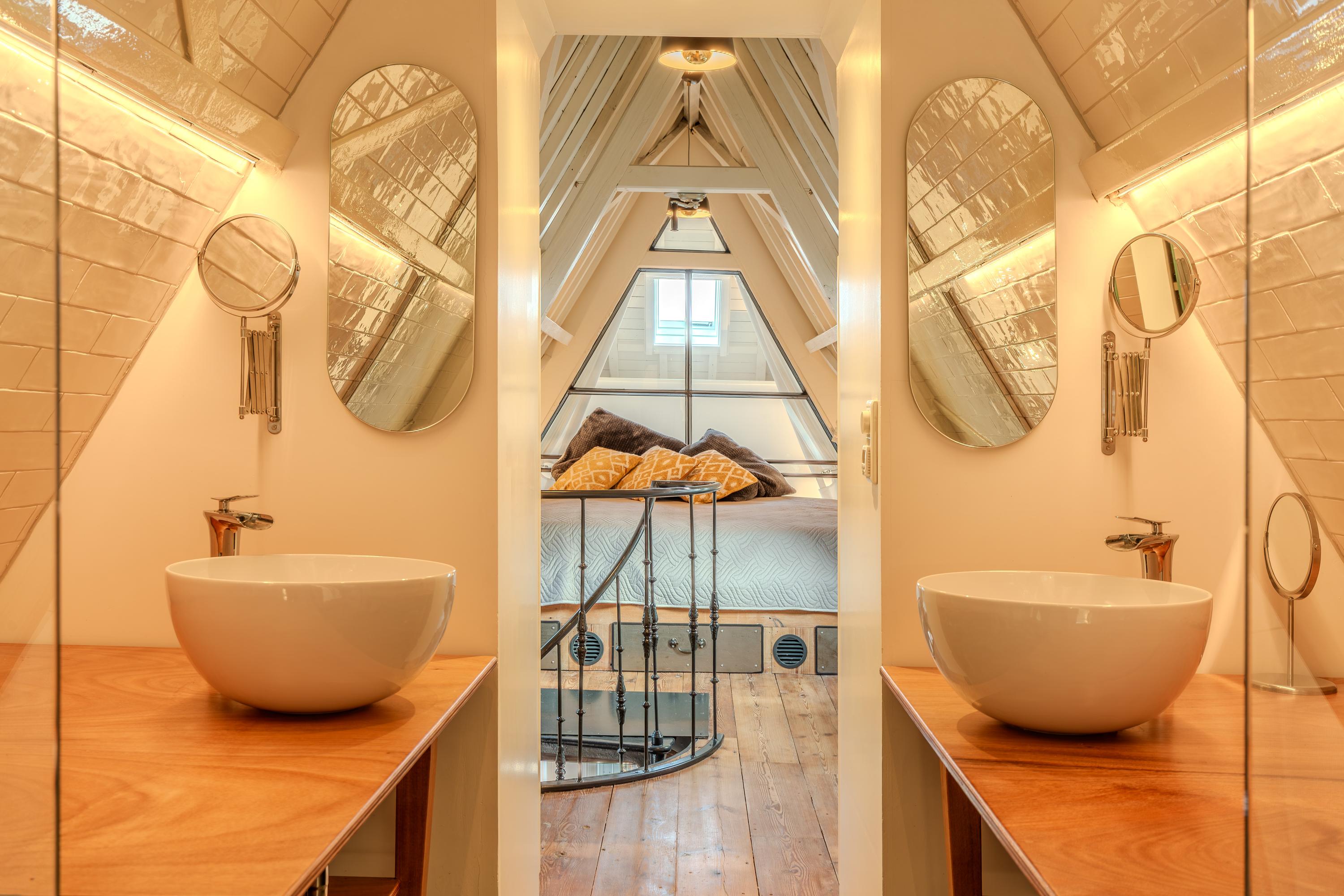 De slaapkamer, gelegen in de nok van het pand, biedt directe toegang tot de luxe en-suite badkamer. Hier geniet u van een ruime inloopdouche met regendouche, een dubbele wastafel met op maat gemaakt meubel, en een speelse kastenwand die zowel praktisch als stijlvol is.