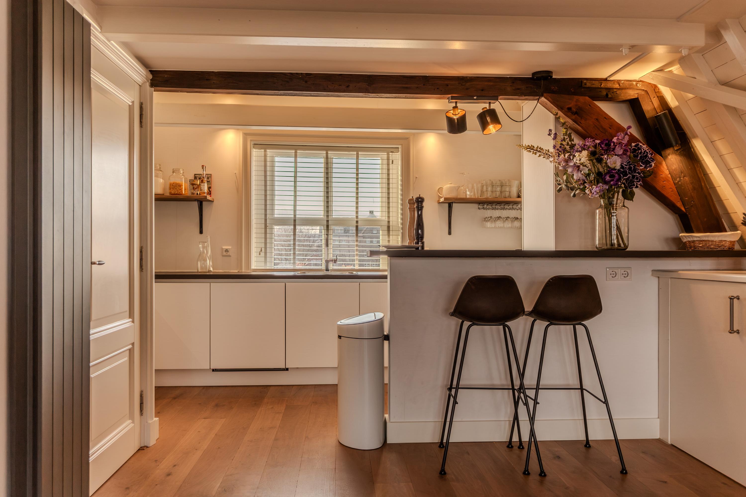 Het appartement ademt luxe en vakmanschap. De parketvloer, de kapconstructie en vele raampartijen zorgen voor een lichte en sfeervolle woonruimte met een prachtig uitzicht over de gracht. De moderne en ruime open keuken, uitgevoerd met een stijlvolle bar, is voorzien van moderne apparatuur, waaronder een inductiekookplaat, oven-magnetroncombinatie, vaatwasser en koel-vriescombinatie. Er is volop opbergruimte alsmede handige wandplanken, waardoor de keuken niet alleen esthetisch, maar ook functioneel is.