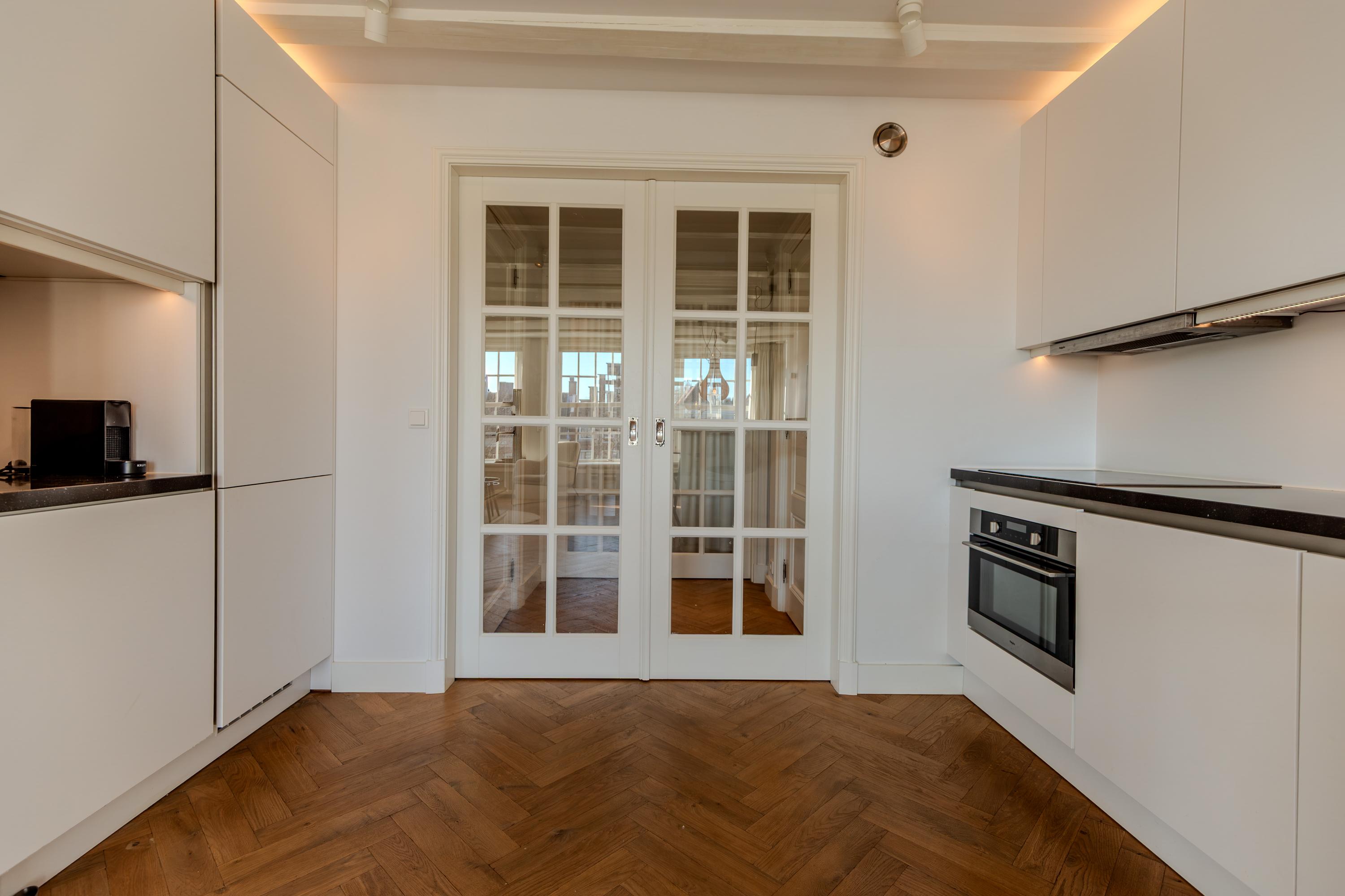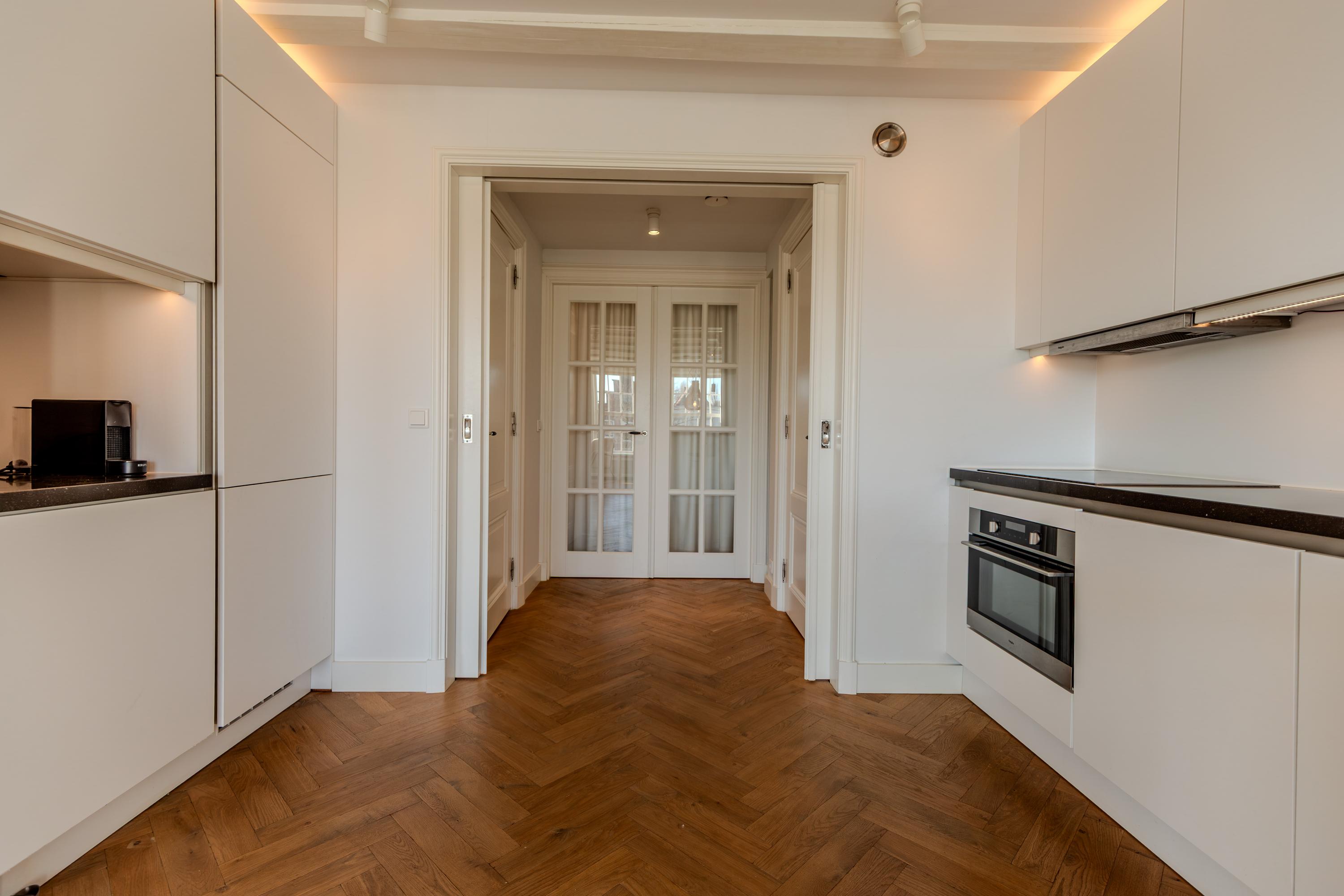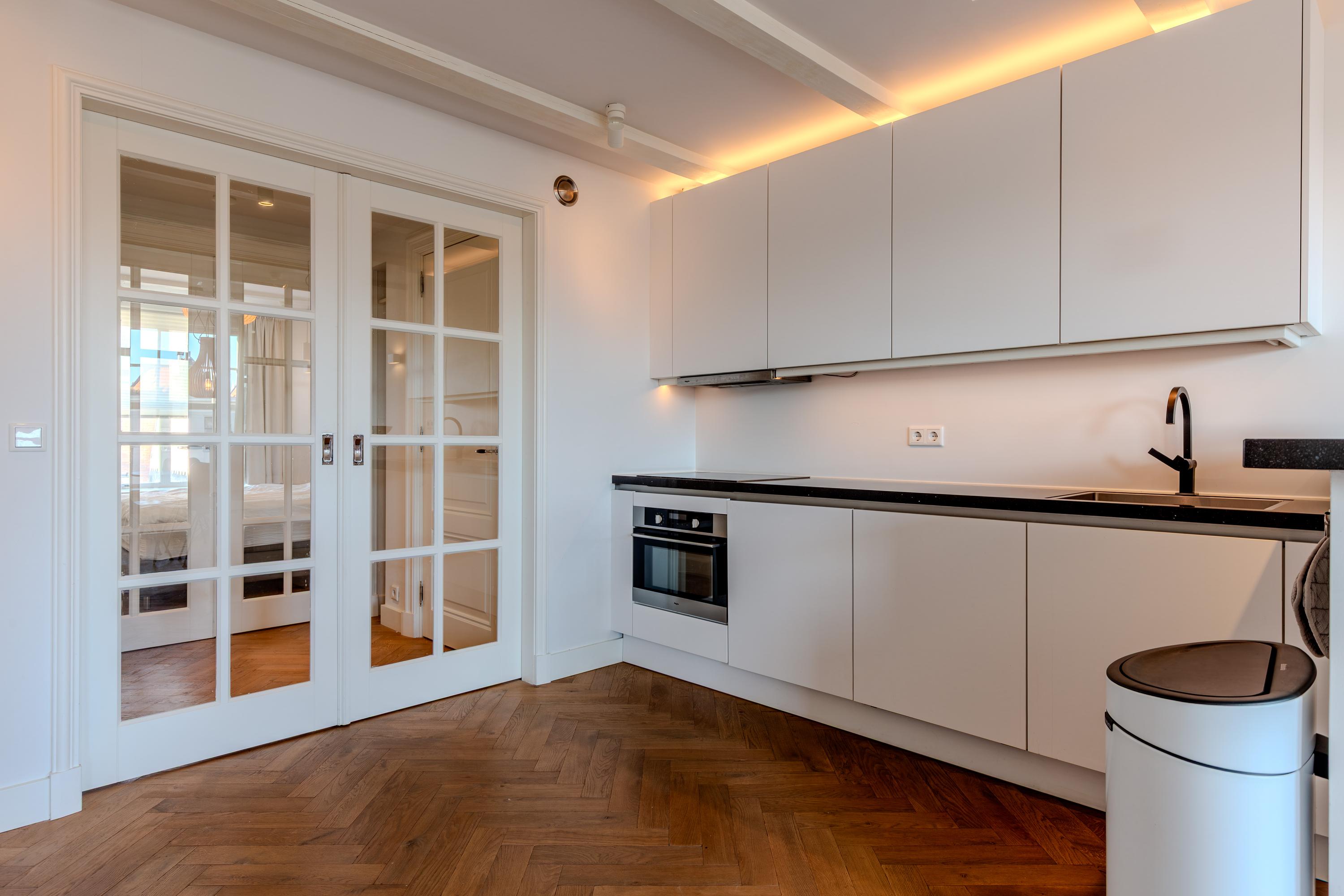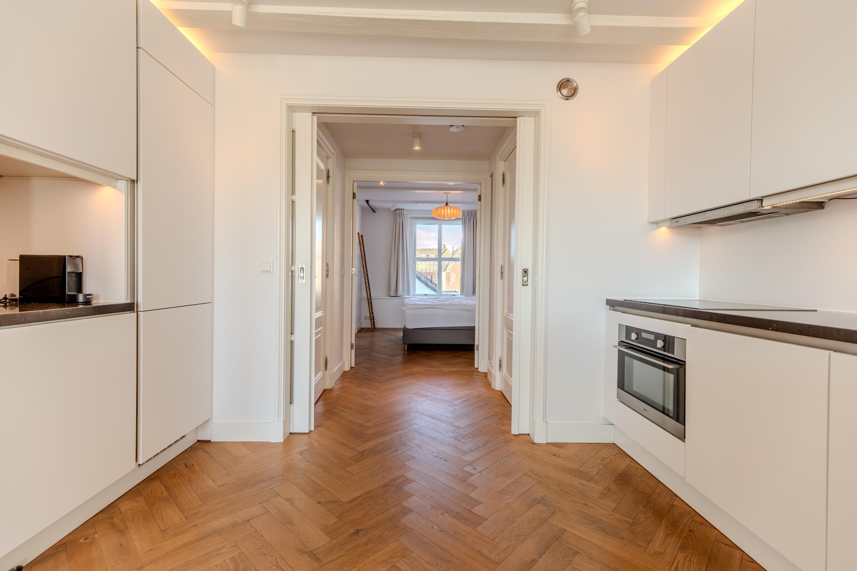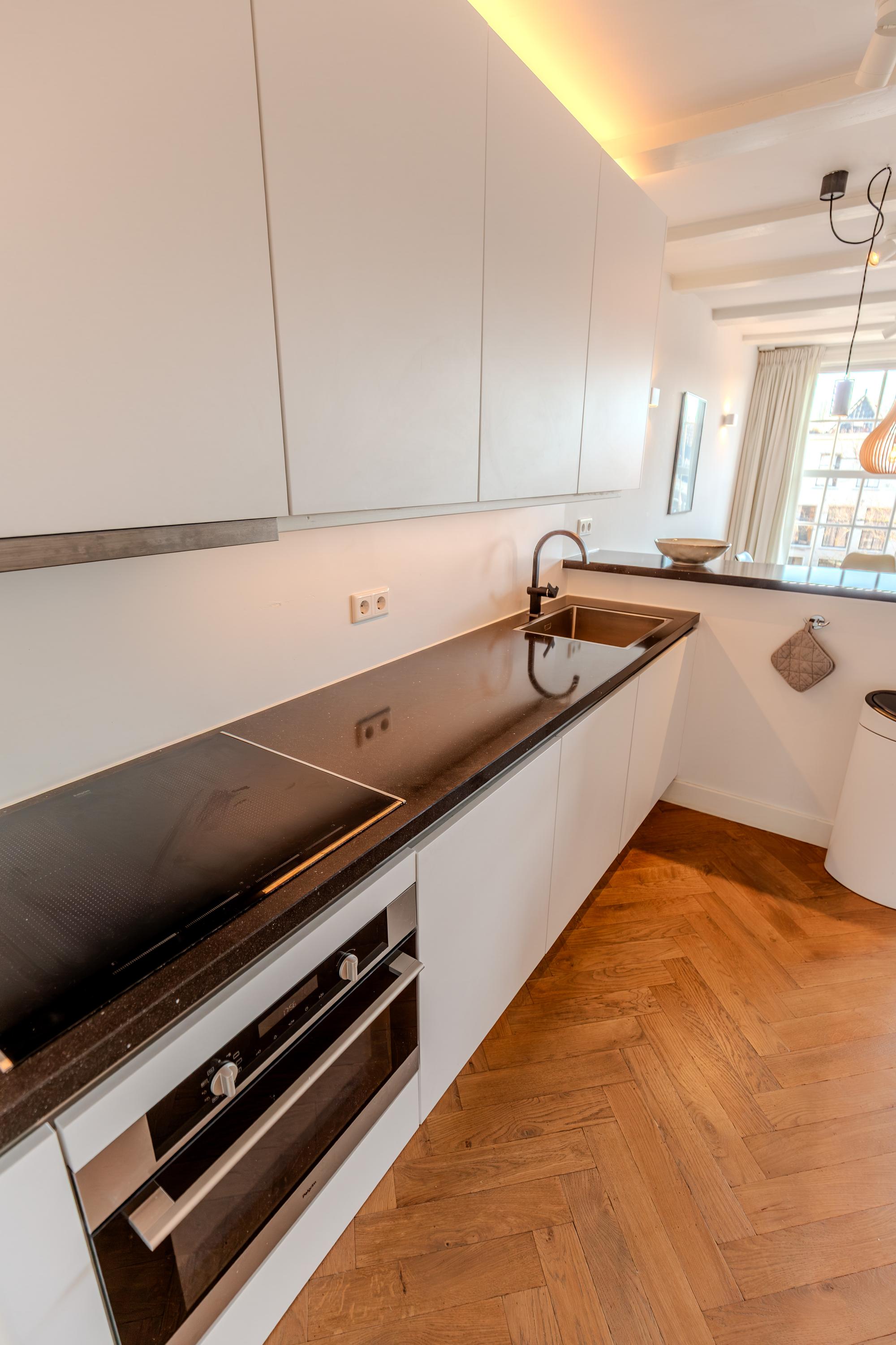 Het appartement ademt luxe en vakmanschap. De visgraat parketvloer, en grote raampartijen zorgen voor een lichte en sfeervolle woonruimte met een prachtig uitzicht over de gracht. De moderne open keuken, uitgevoerd met een stijlvolle bar, is voorzien van de nodige apparatuur, waaronder een inductiekookplaat, oven-magnetroncombinatie, vaatwasser en koel-vriescombinatie.