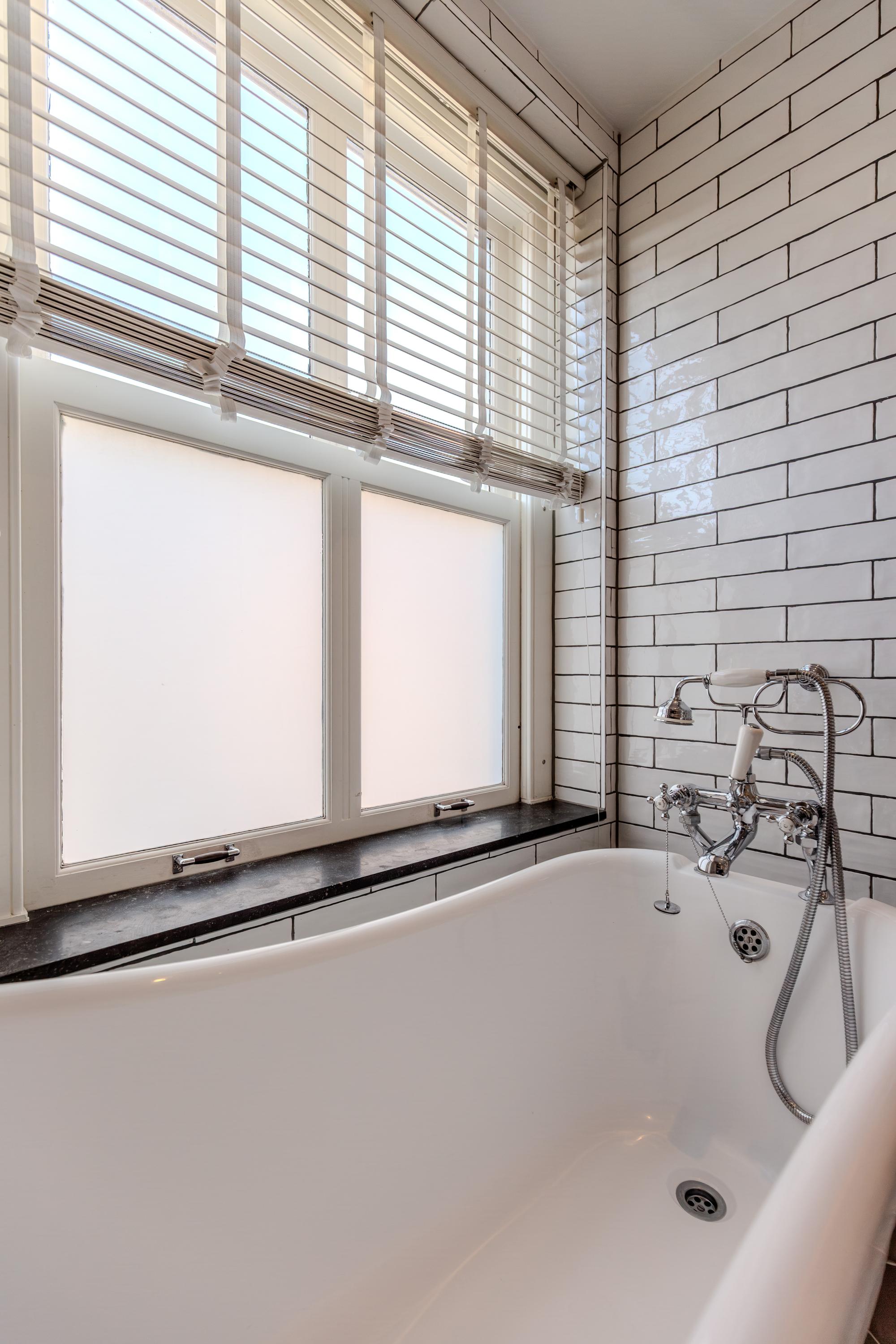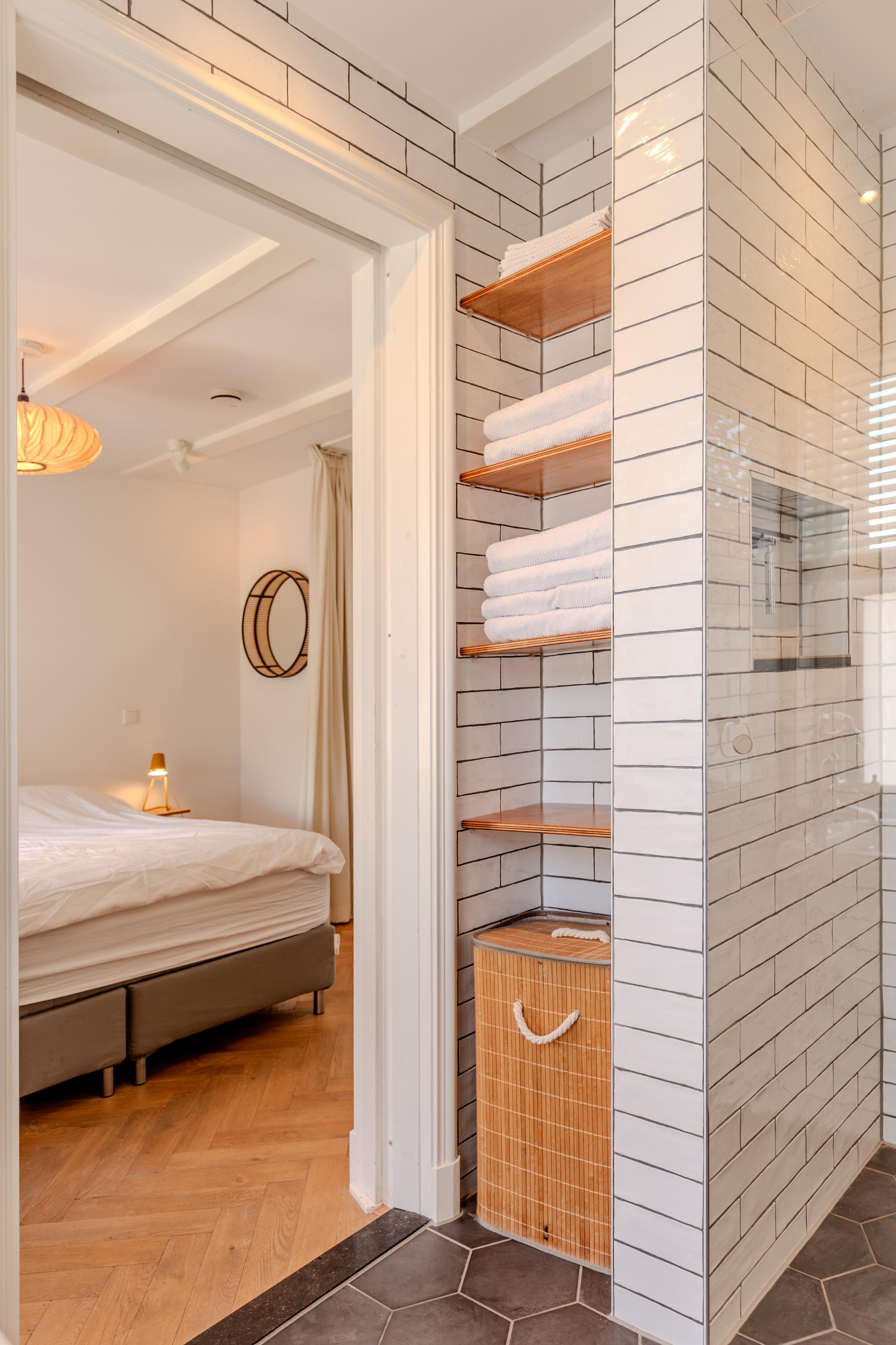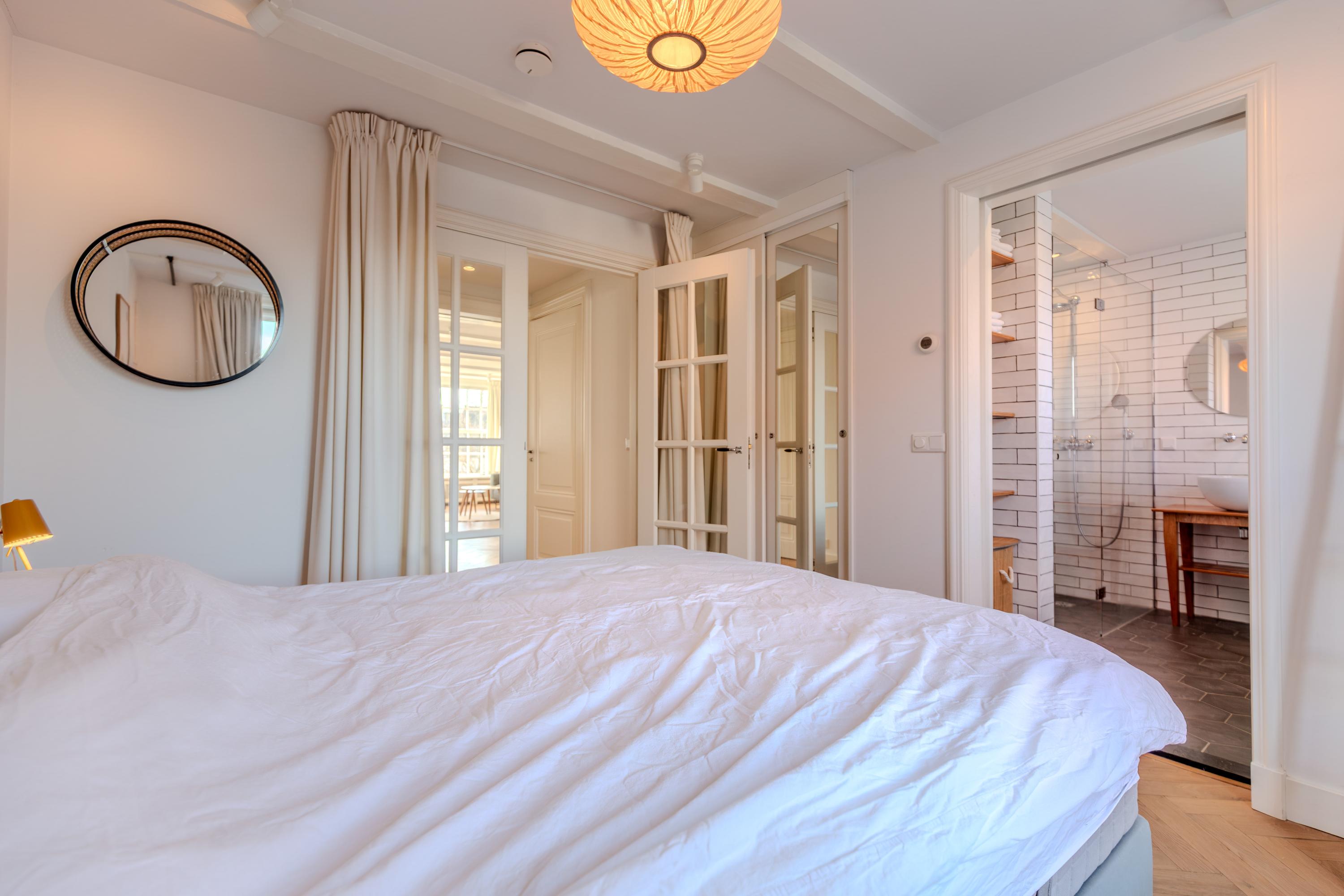 De ruime slaapkamer, rustig gelegen aan de achterzijde van het pand, biedt directe toegang tot de luxe en-suite badkamer. Hier geniet u van een ruime inloopdouche met regendouche, een wastafel met op maat gemaakt meubel, en een stijlvol, vrijstaand ligbad. Daarnaast is er een separate hal met toegang tot een toilet en een bergkast met wasmachine-opstelling.