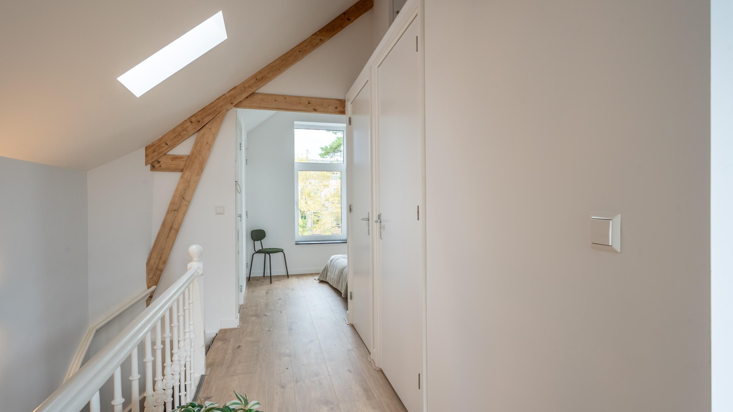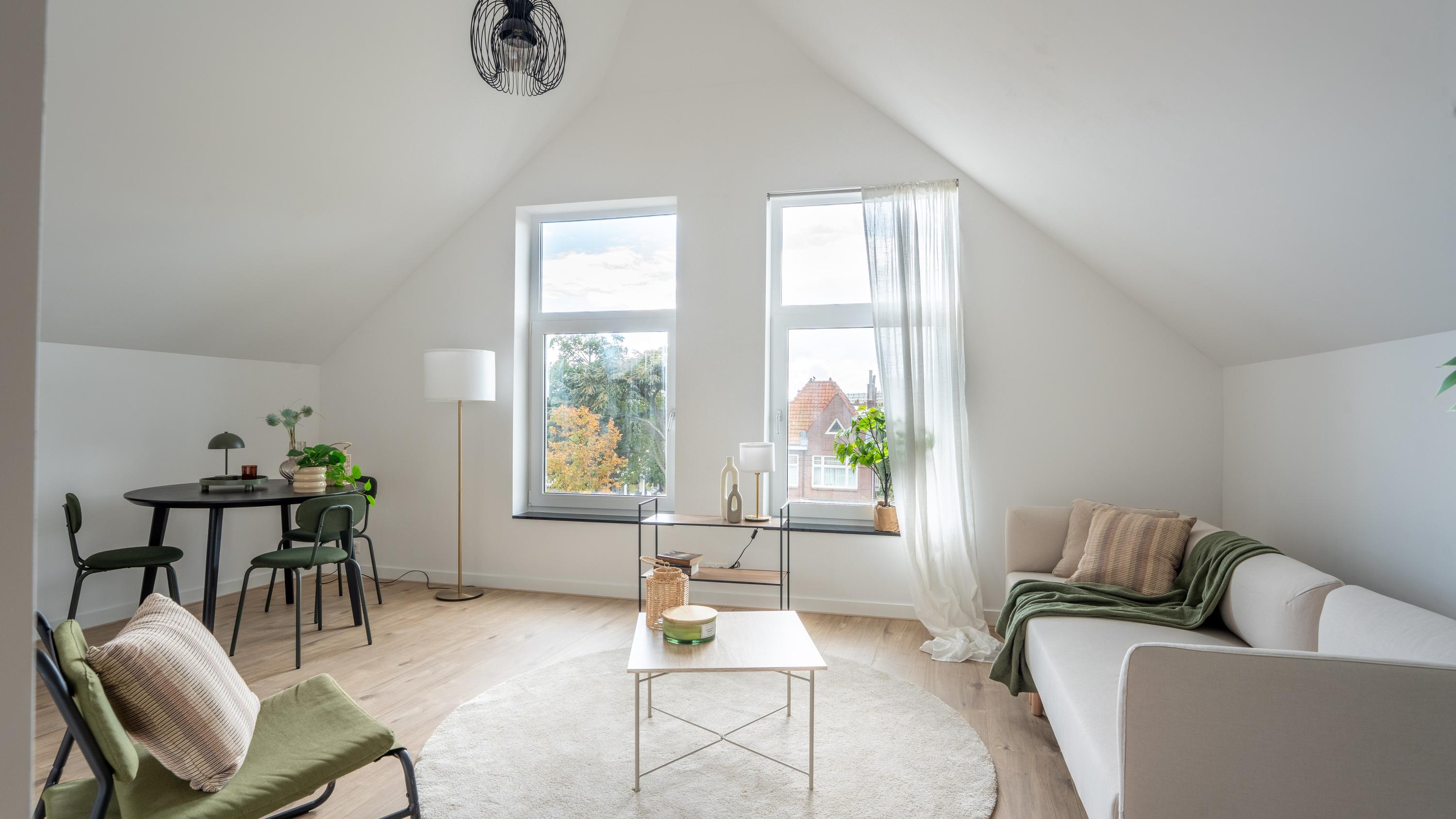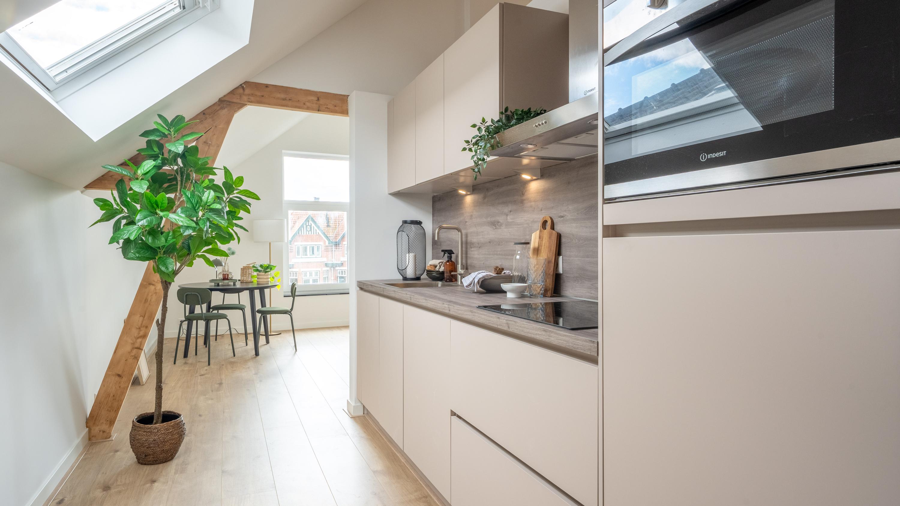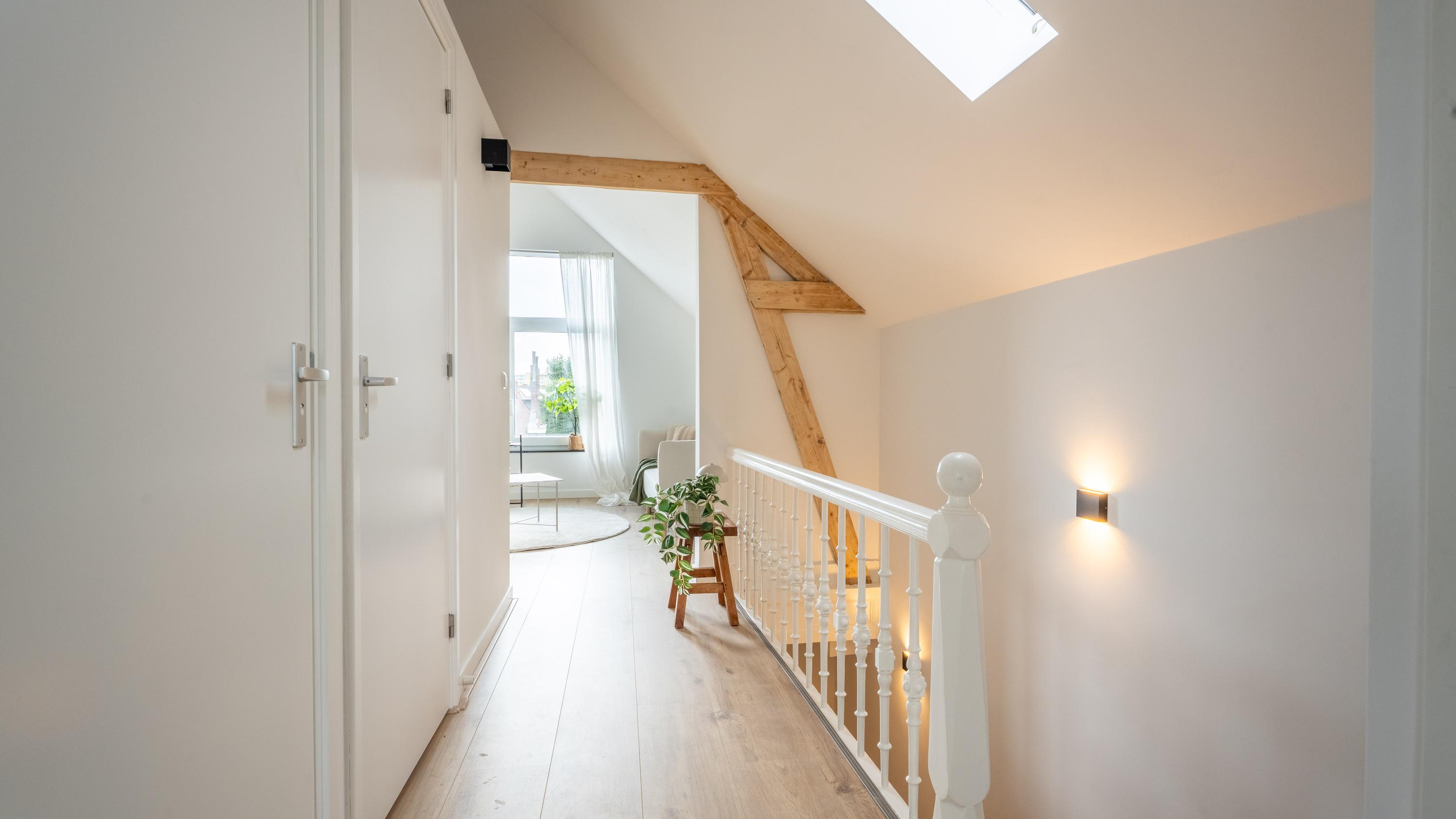 Op de tweede etage van het gebouw bevindt zich dit recent gerenoveerde appartement met een loft-uitstraling. De hoge nok en de zichtbare dakspanten geven de woning veel karakter en sfeer. Dankzij de ruime en lichte woon- en zitkamer voelt het geheel open en uitnodigend aan, met bovendien de mogelijkheid om de slaapkamer af te sluiten.