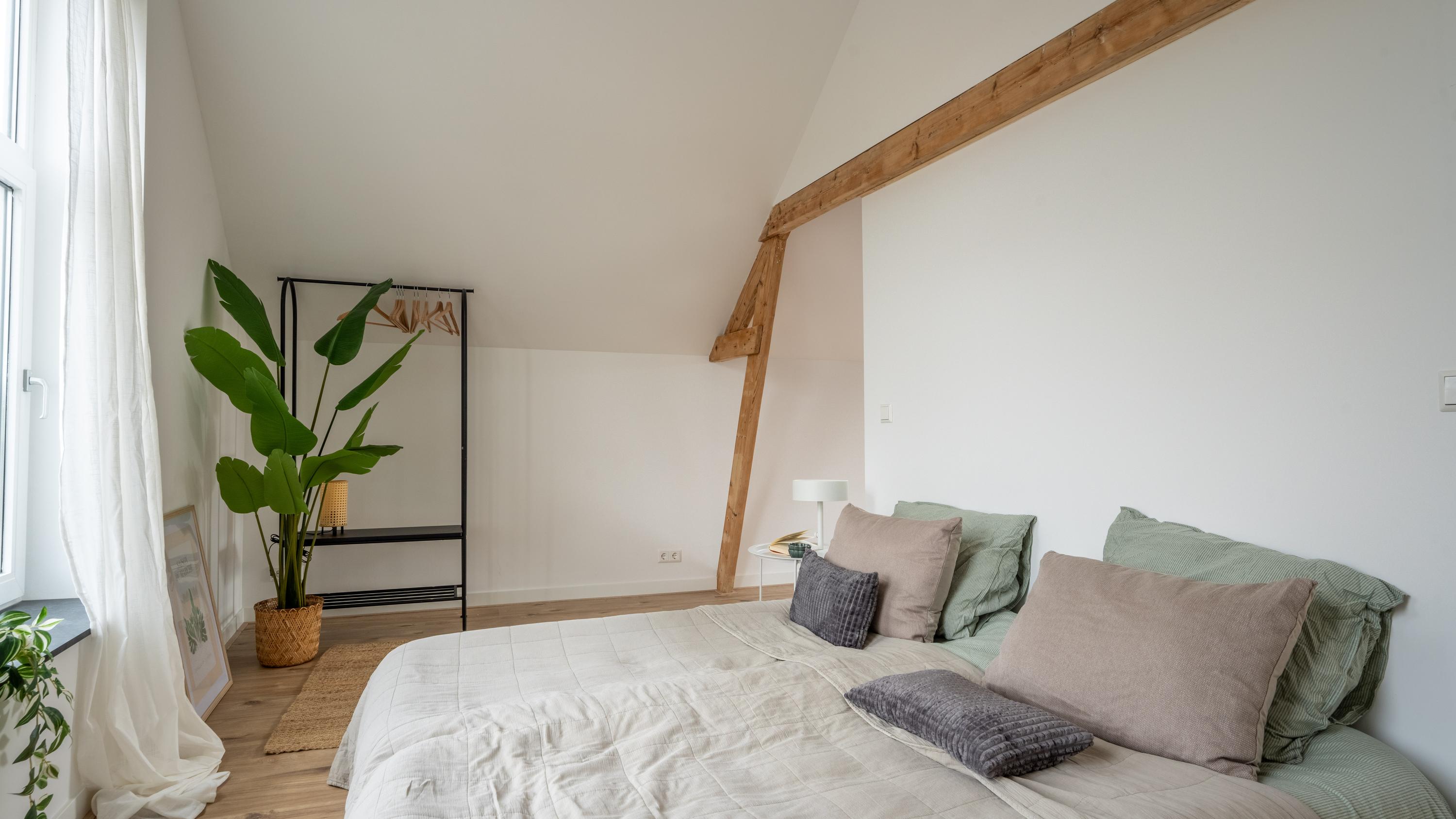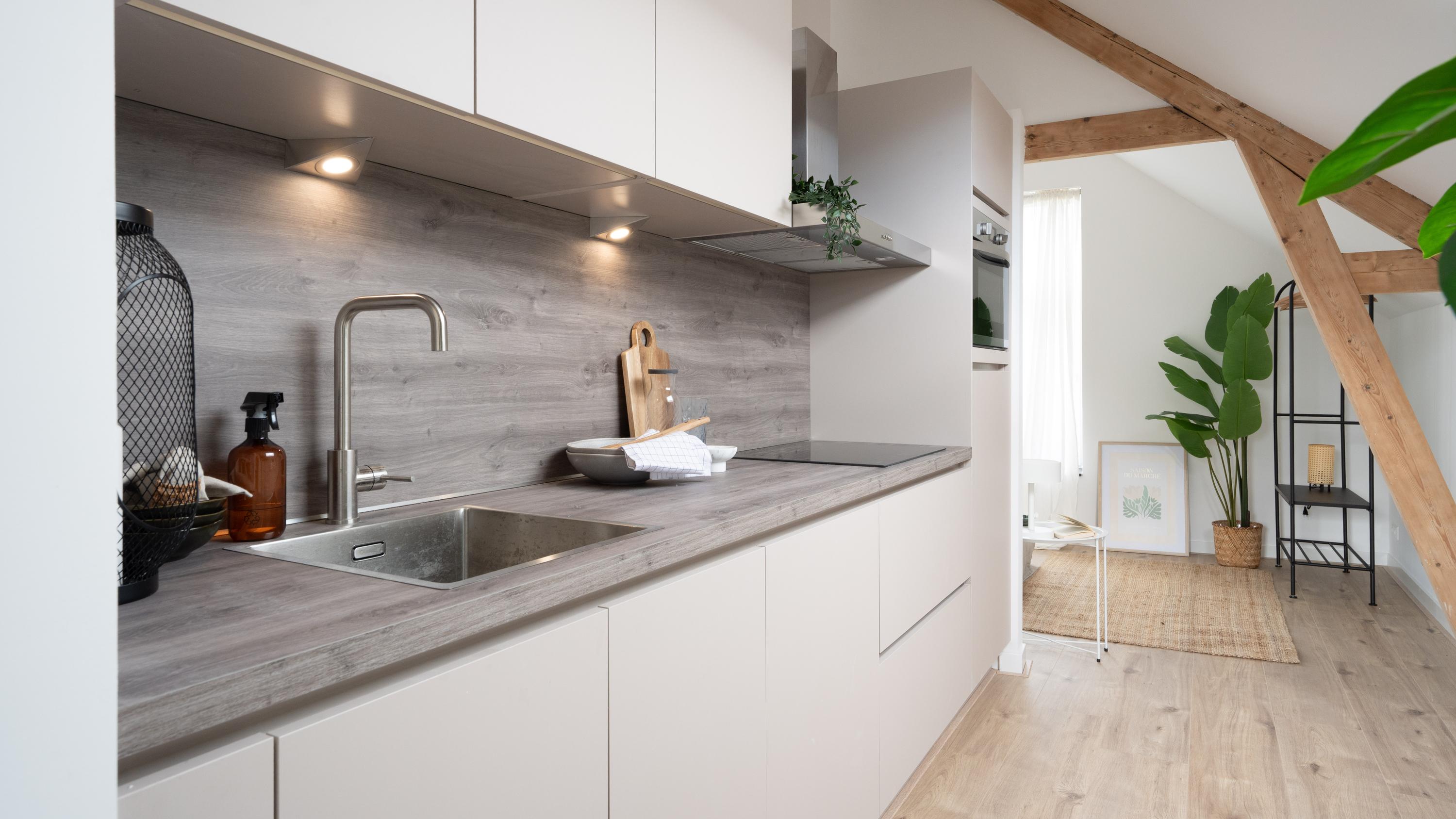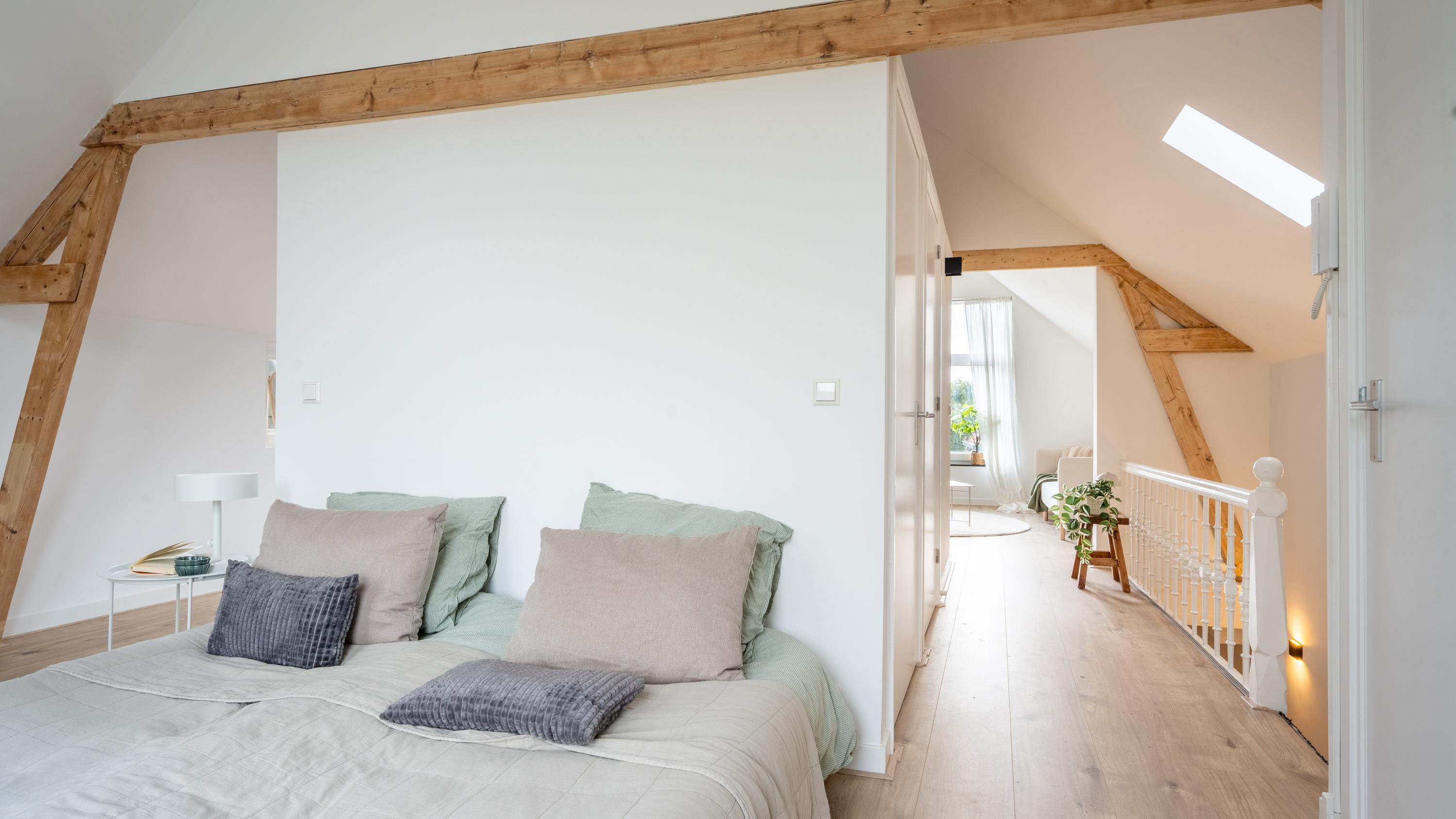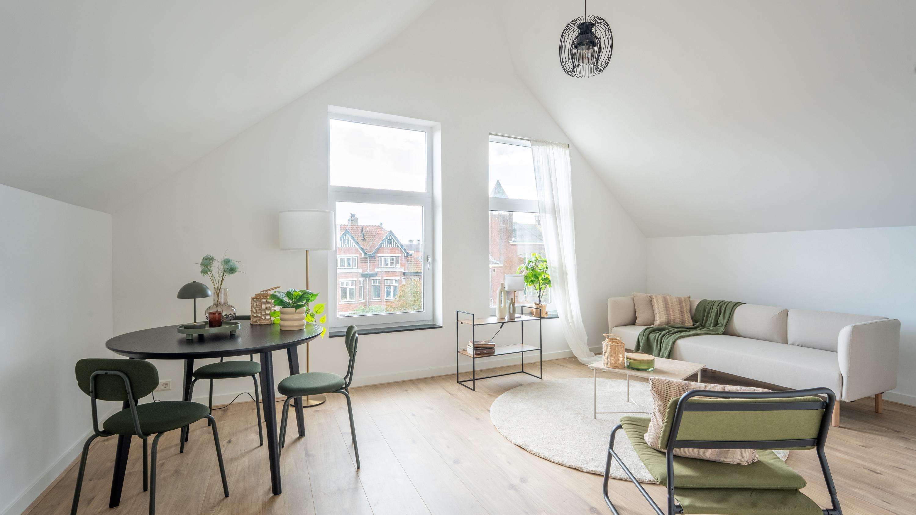 Op de tweede etage van het gebouw bevindt zich dit recent gerenoveerde appartement met een loft-uitstraling. De hoge nok en de zichtbare dakspanten geven de woning veel karakter en sfeer. Dankzij de ruime en lichte woon- en zitkamer voelt het geheel open en uitnodigend aan, met bovendien de mogelijkheid om de slaapkamer af te sluiten.