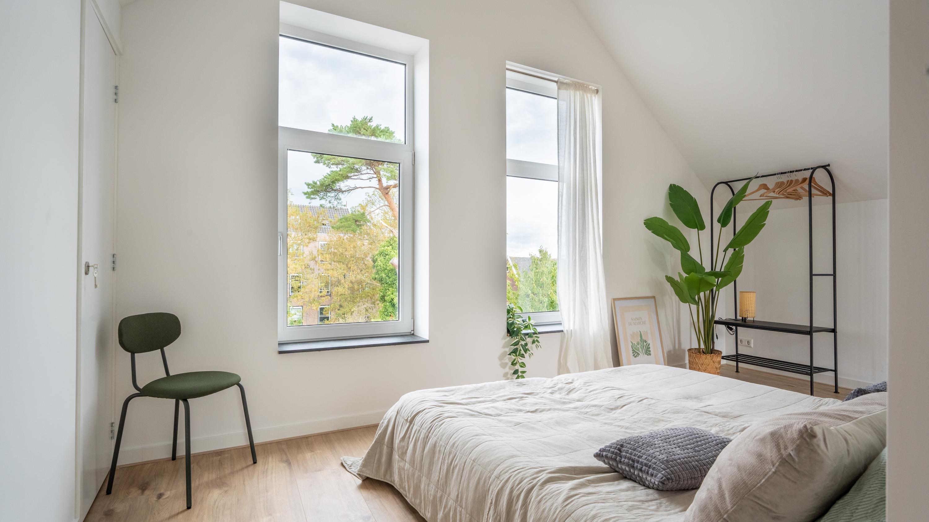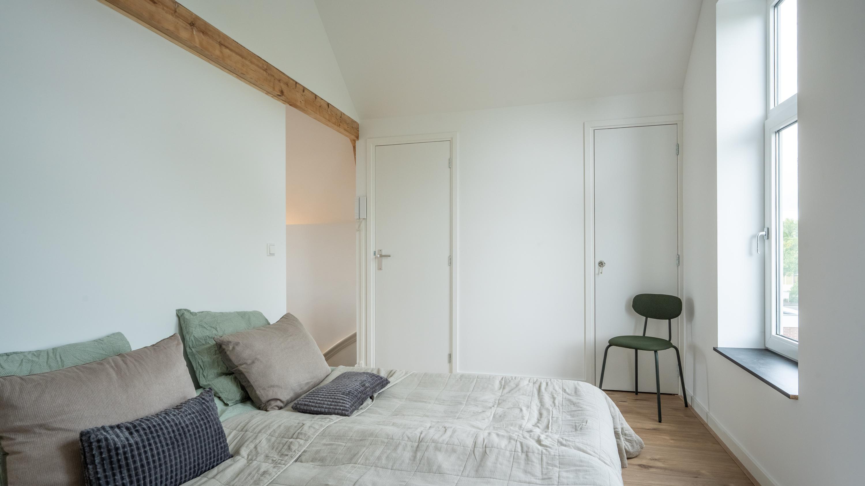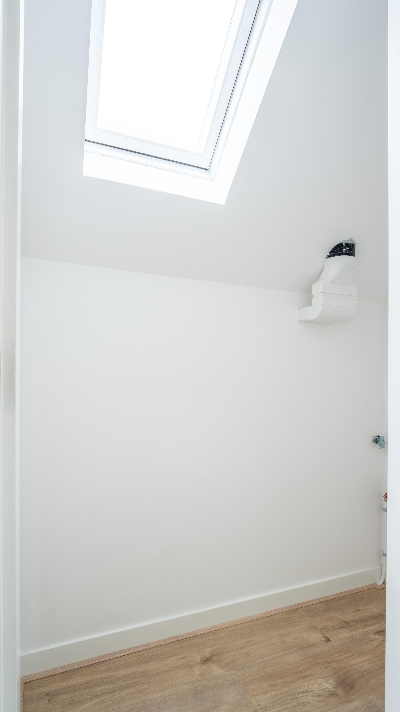 De slaapkamer ligt aan de achterzijde van de woning en beschikt over een praktische inbouwkast met wasmachine-aansluiting.