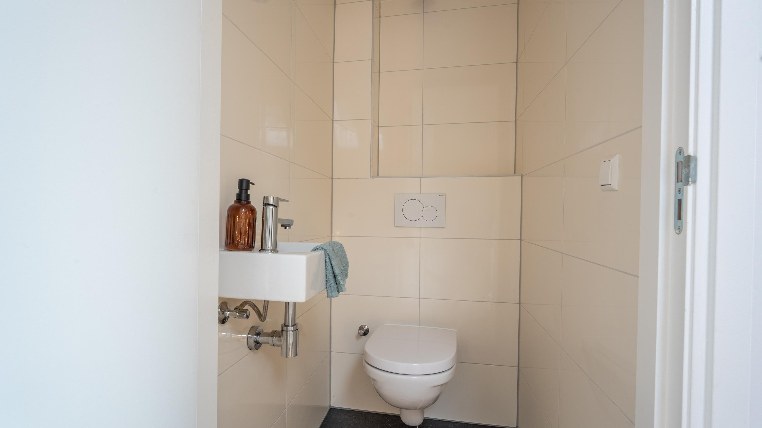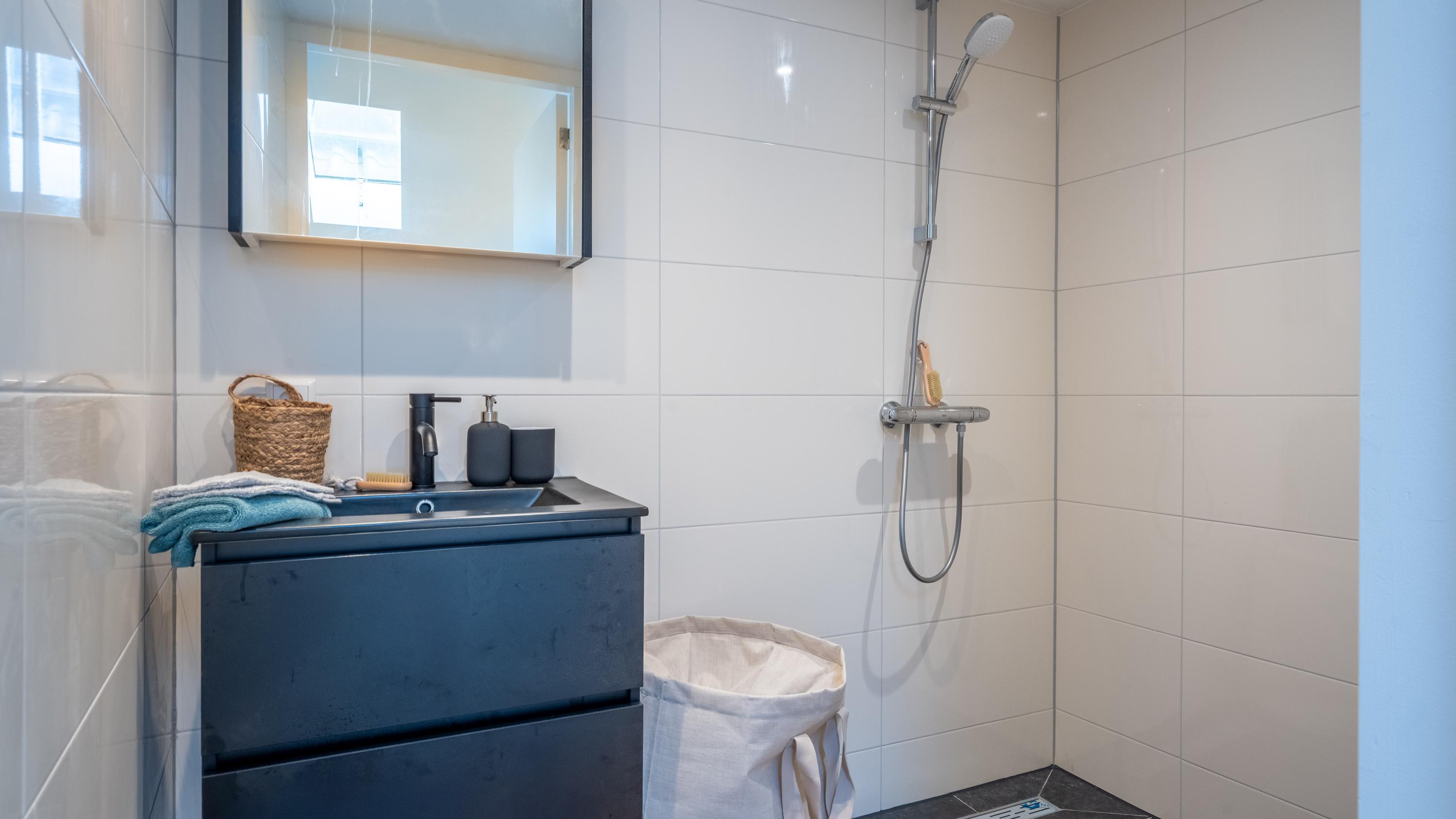 Centraal in de woning is een architectonische kern geplaatst. Aan de ene zijde bevindt zich een separaat toilet en een moderne badkamer met inloopdouche en wastafel met lademeubel. Aan de andere zijde ligt de nieuwe keuken, voorzien van alle benodigde inbouwapparatuur.
