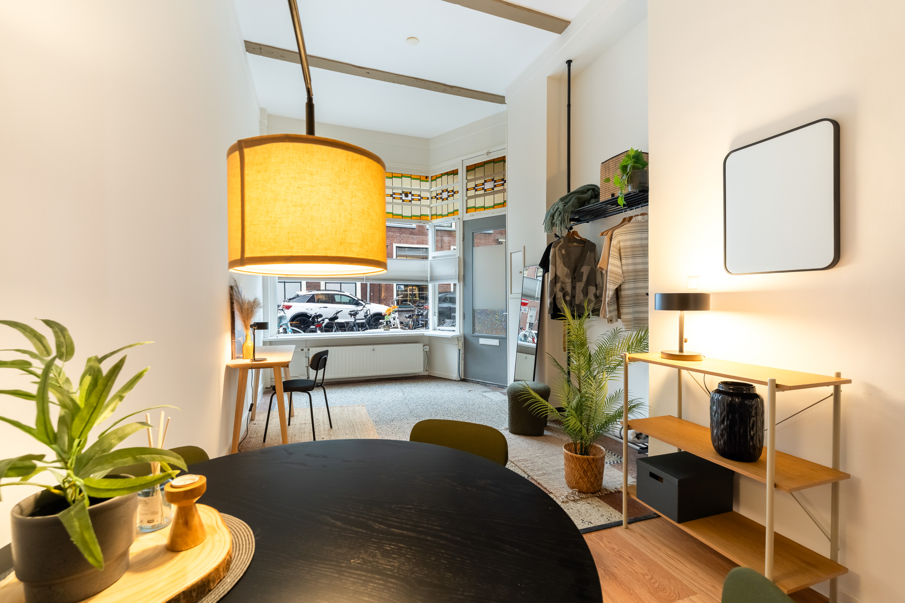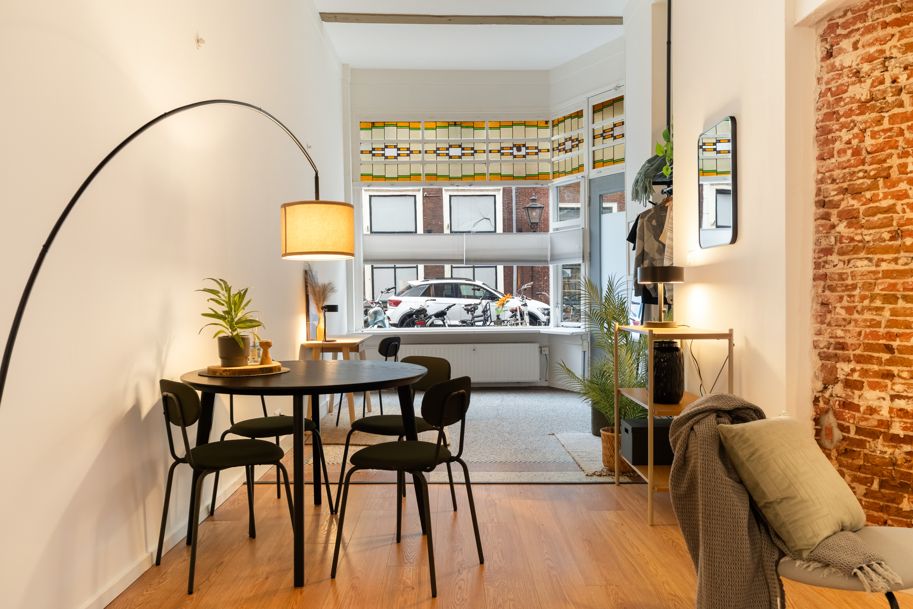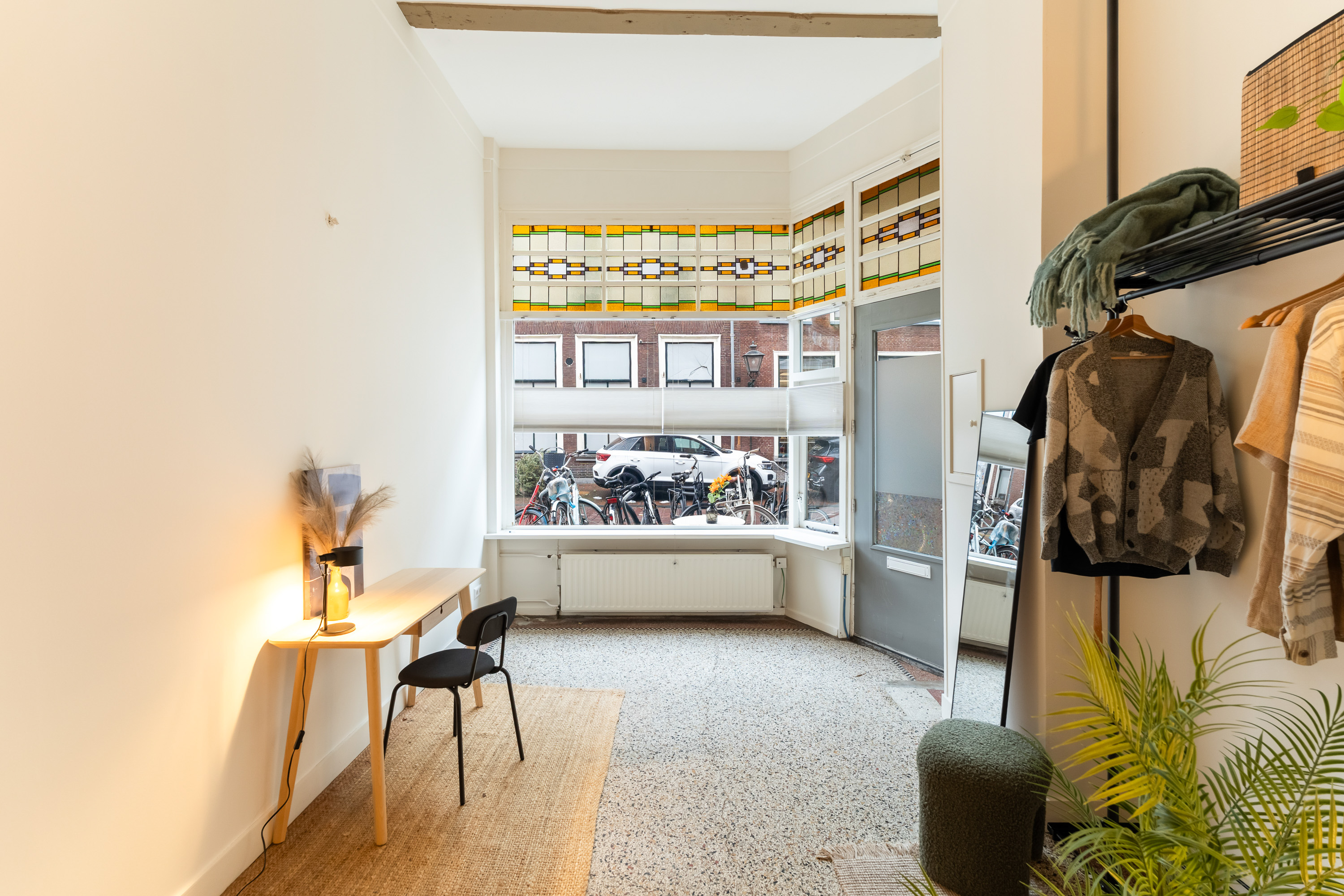 Bij binnenkomst valt direct de gedeeltelijk originele granitovloer in de entree op – een subtiele verwijzing naar het verleden van dit rijksmonument. De grote open leefruimte wordt gekenmerkt door glas-in-lood ramen, zichtbaar metselwerk en een prettige flow van licht en ruimte.