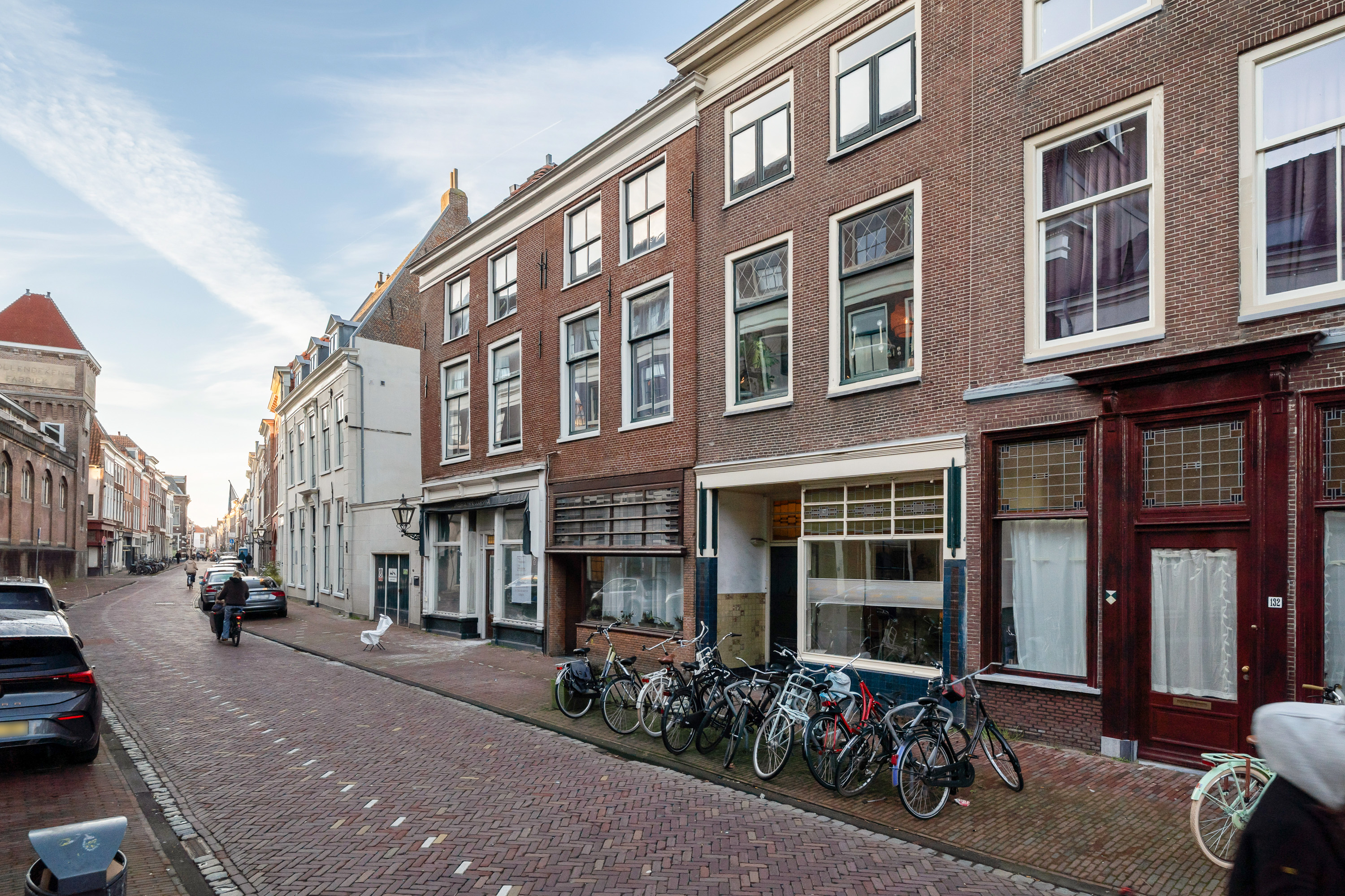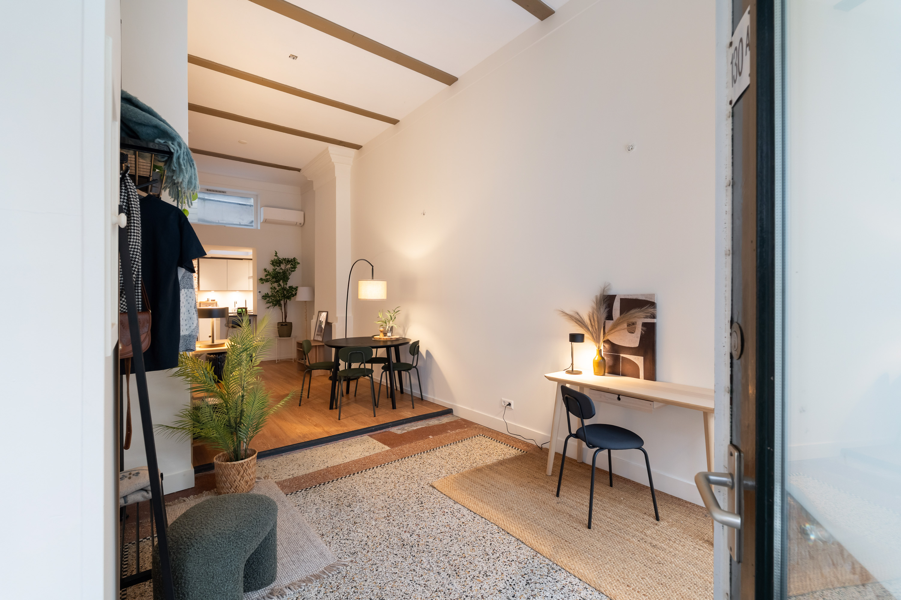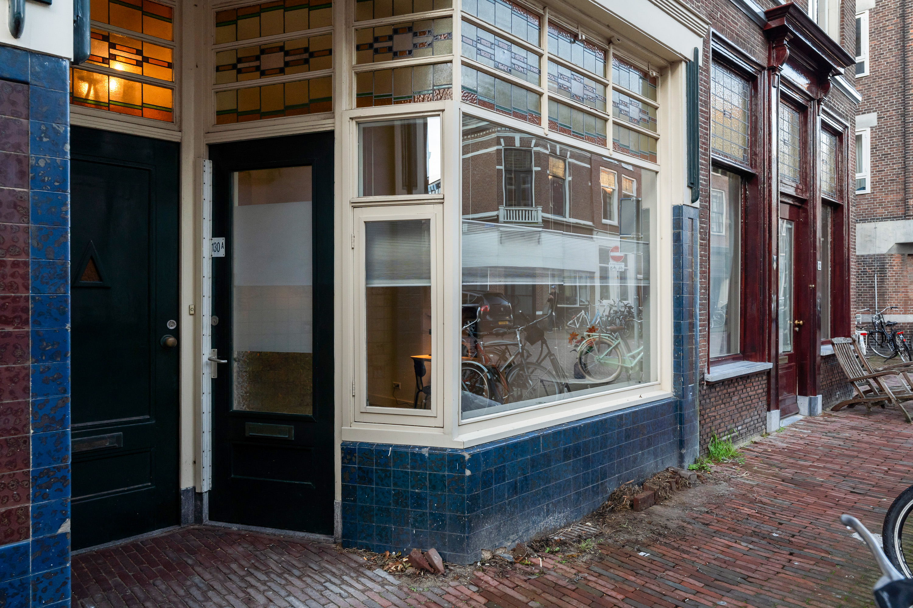 Bij binnenkomst valt direct de gedeeltelijk originele granitovloer in de entree op – een subtiele verwijzing naar het verleden van dit rijksmonument. De grote open leefruimte wordt gekenmerkt door glas-in-lood ramen, zichtbaar metselwerk en een prettige flow van licht en ruimte.
