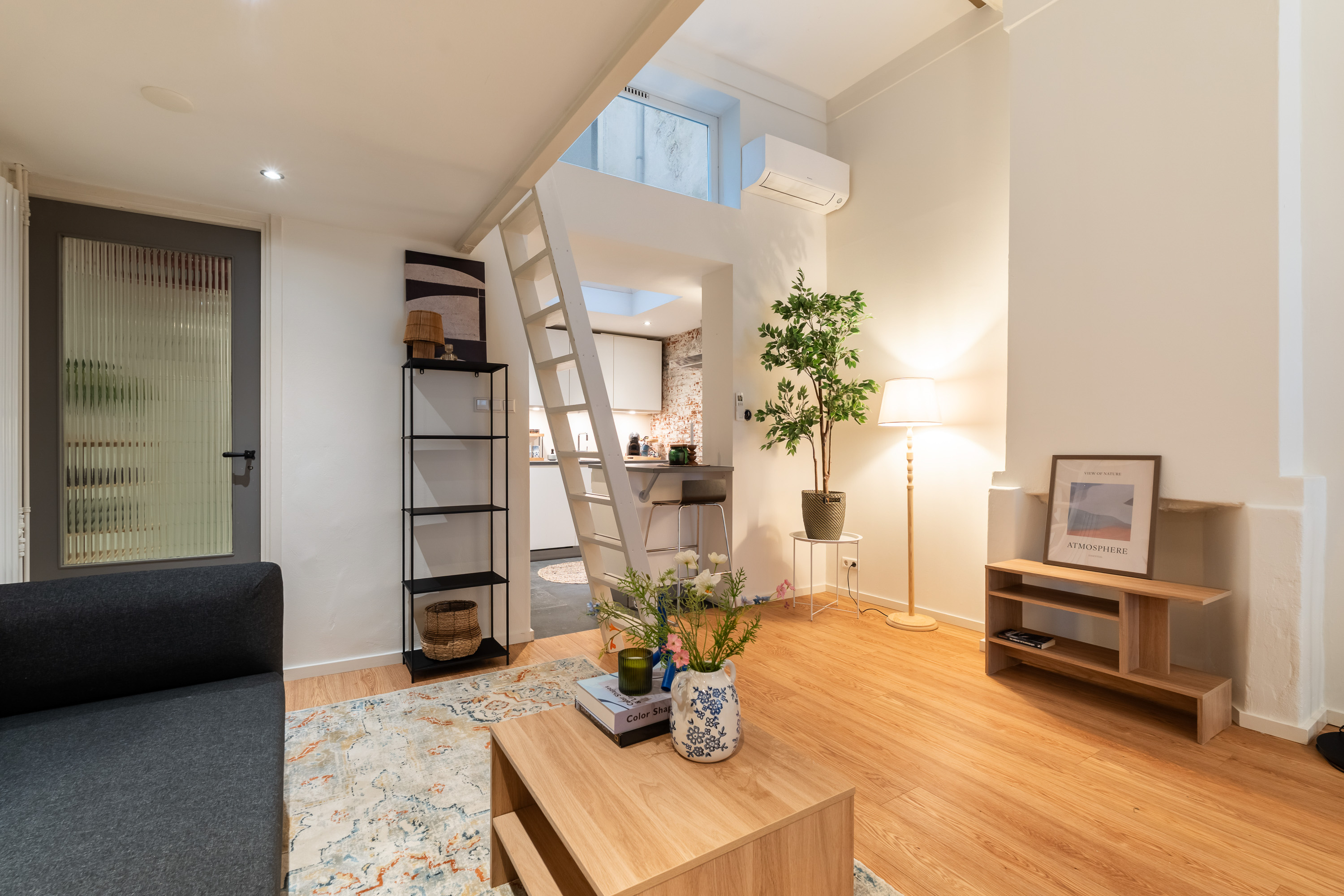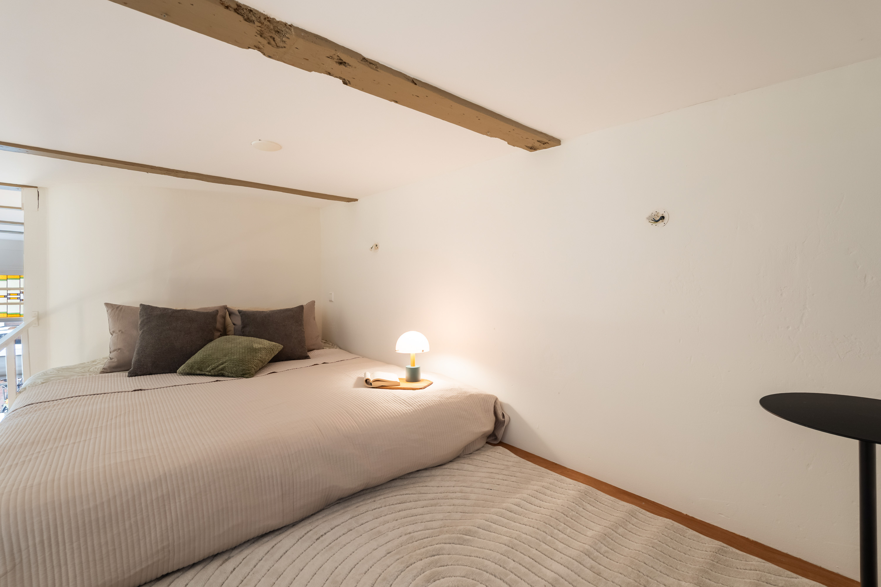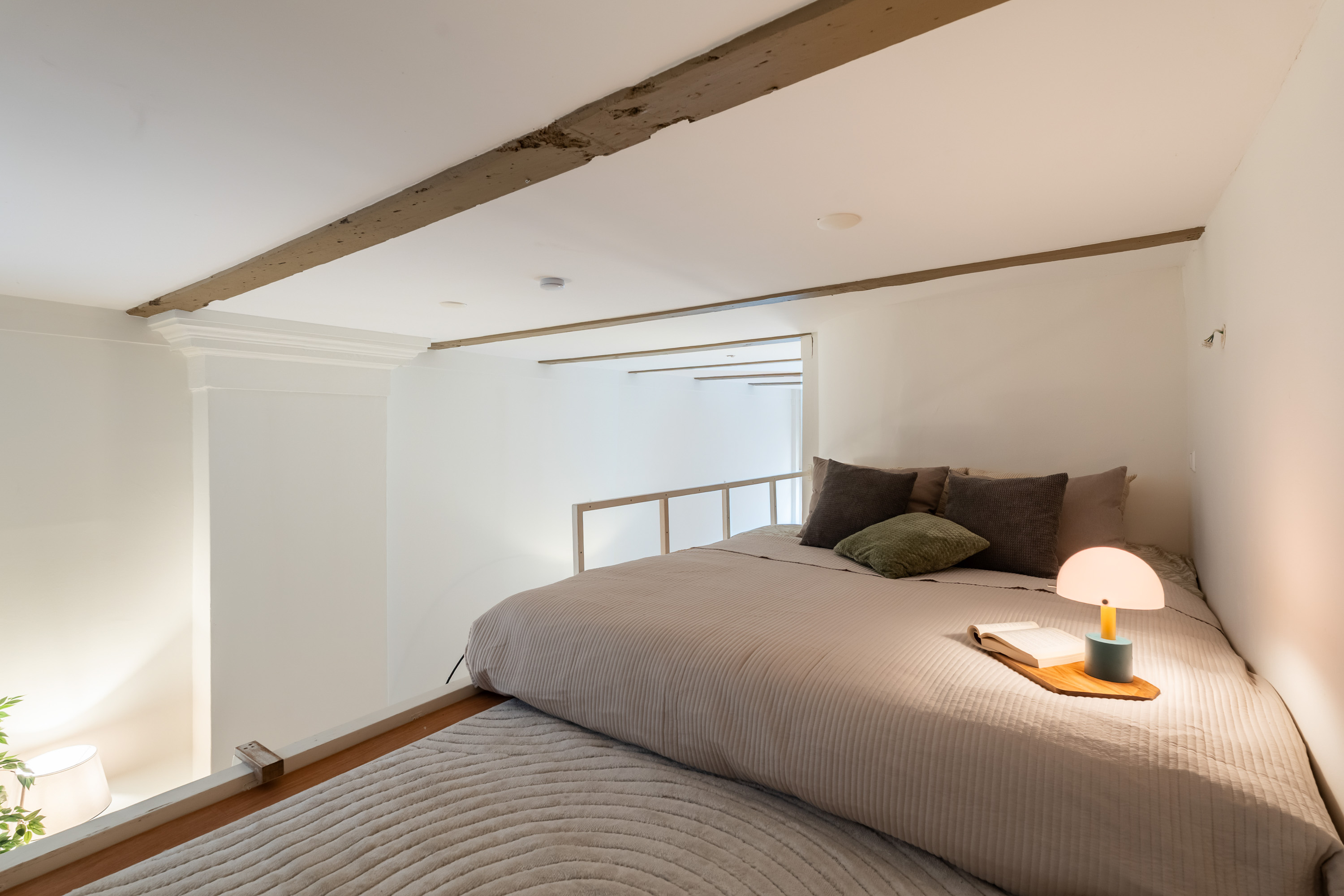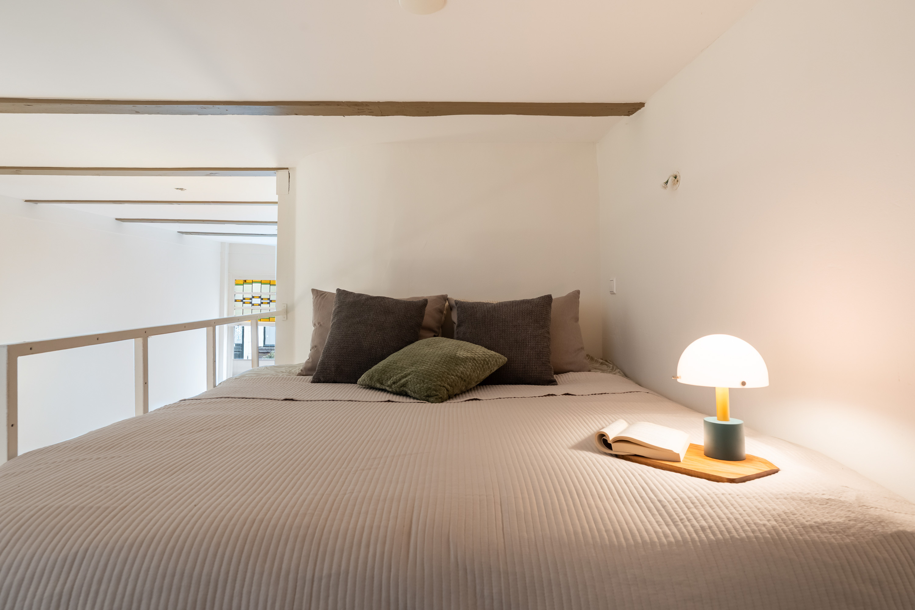 Via de open ruimte bereik je de slaapentresol: een knusse, rustige plek die perfect past bij het loftgevoel en de hoogte van het appartement optimaal benut.