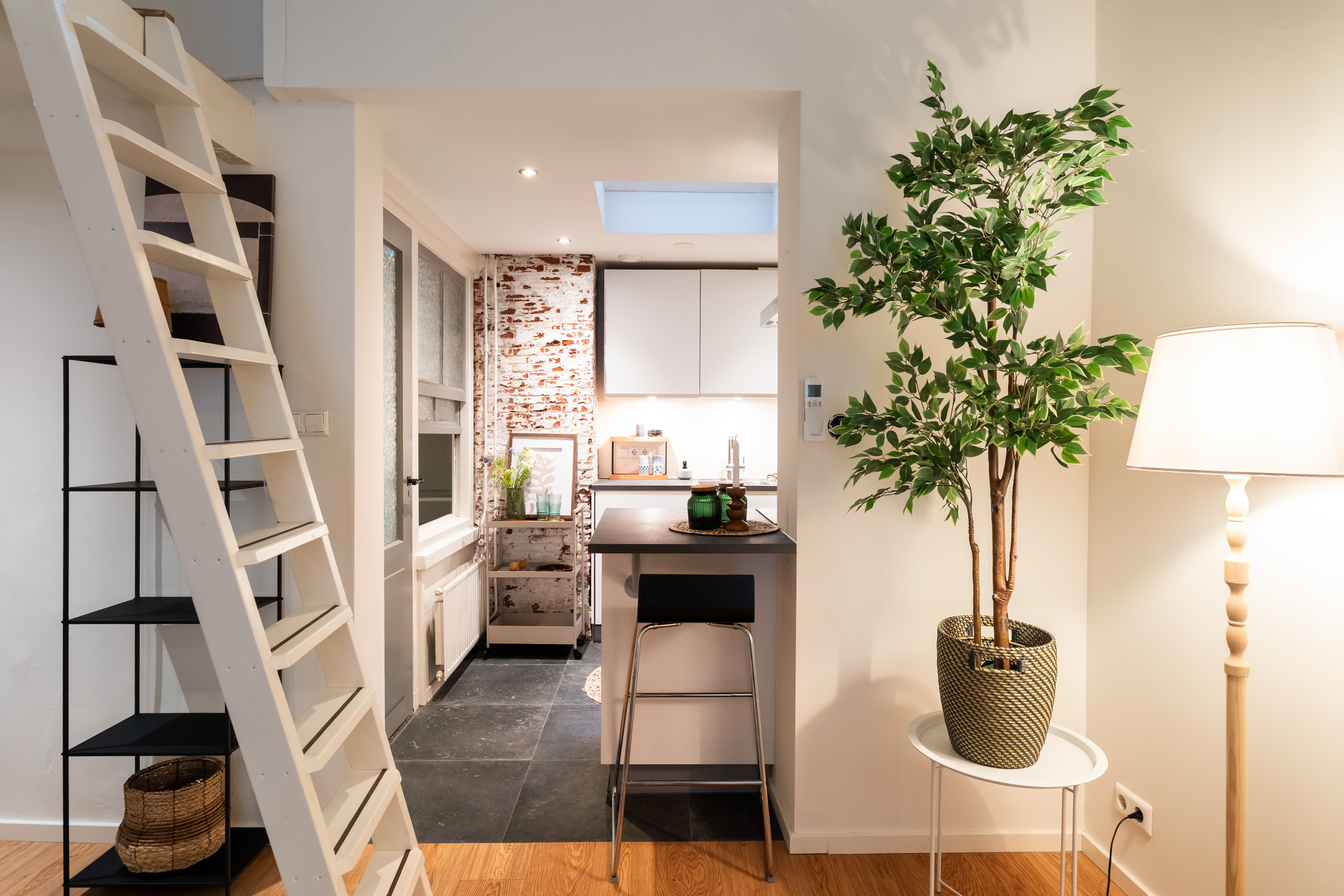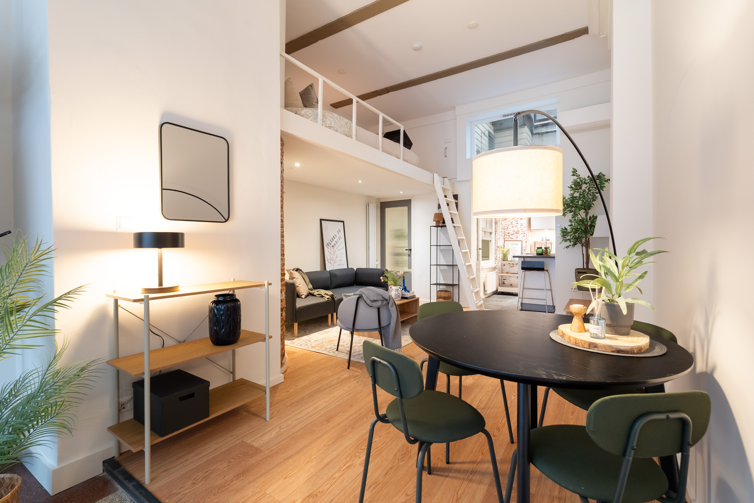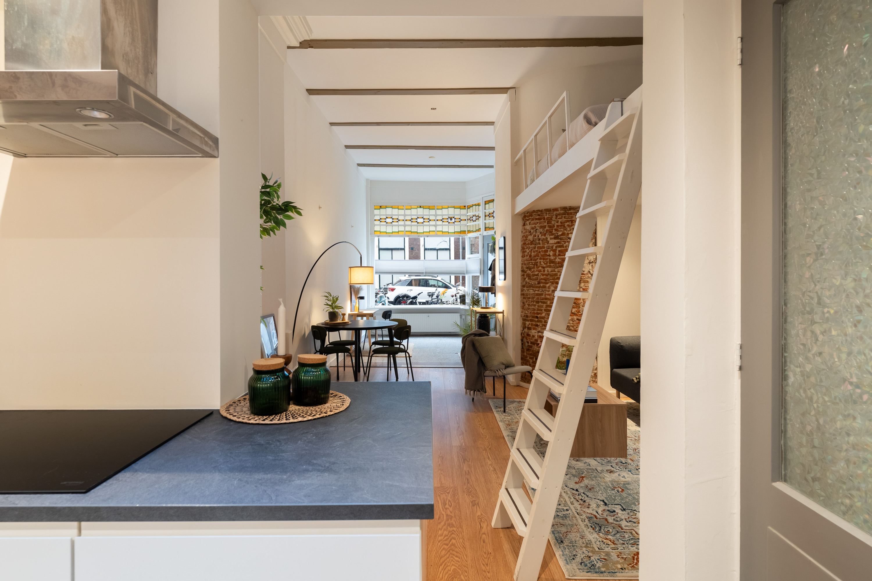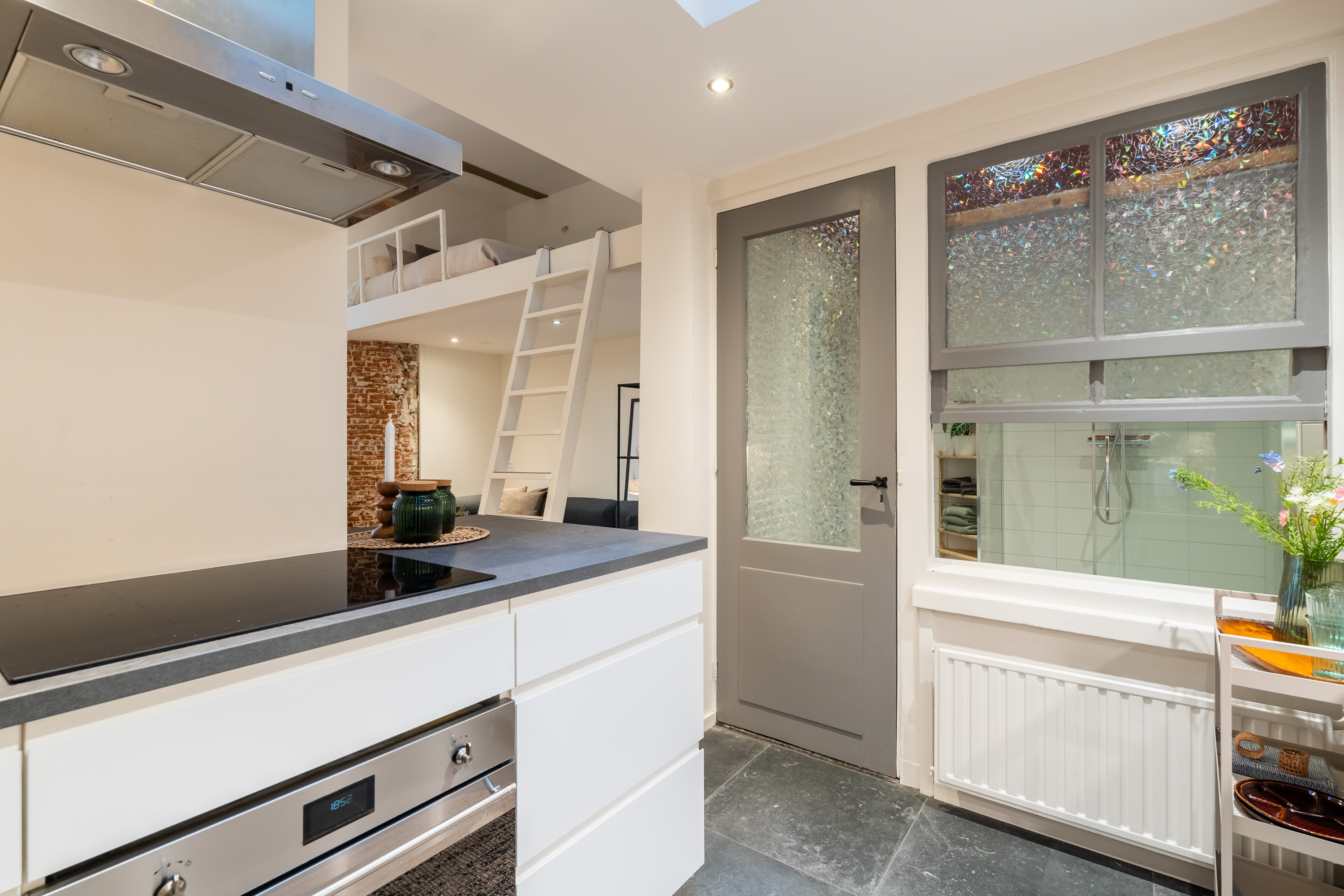 Via de open ruimte bereik je de slaapentresol: een knusse, rustige plek die perfect past bij het loftgevoel en de hoogte van het appartement optimaal benut.