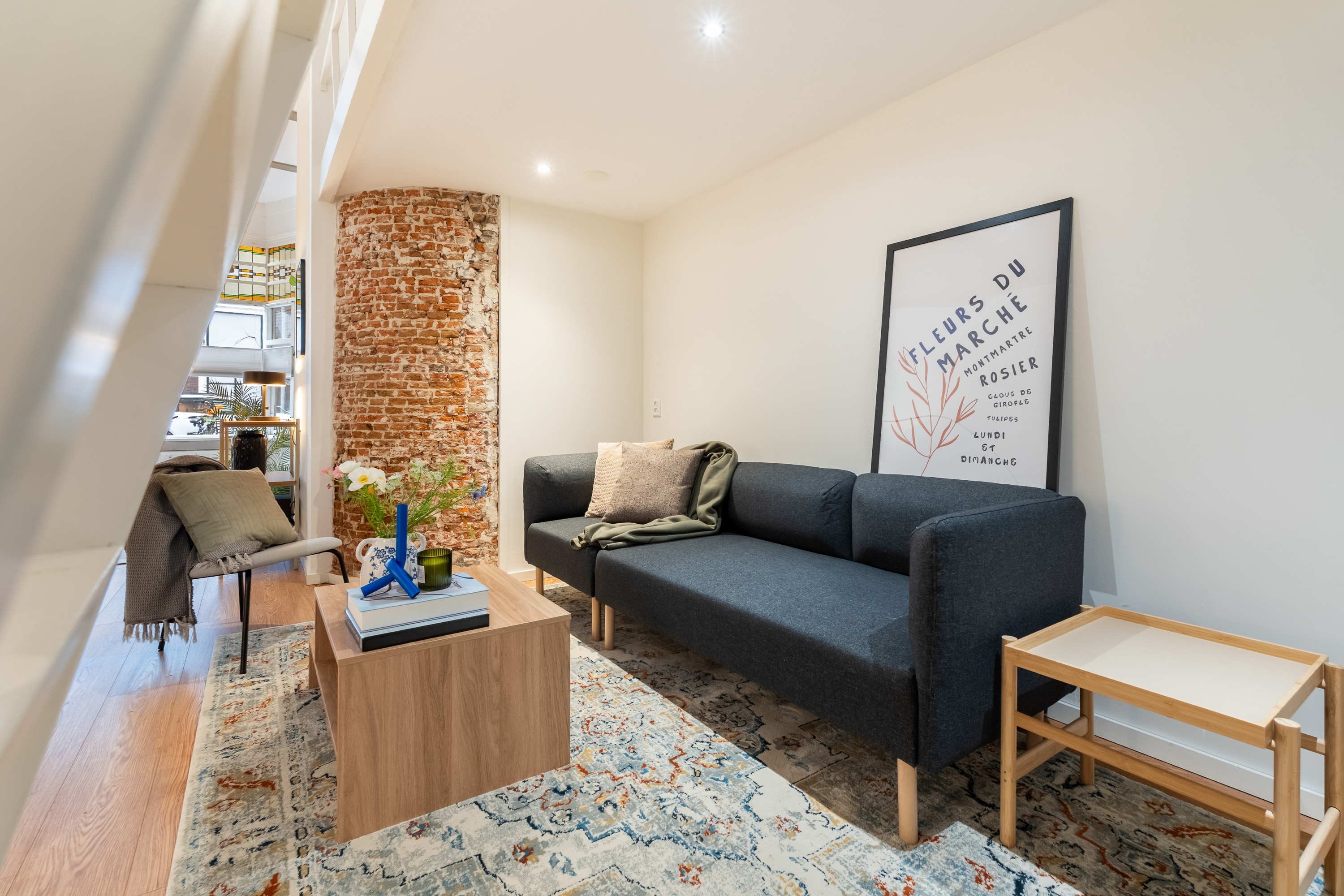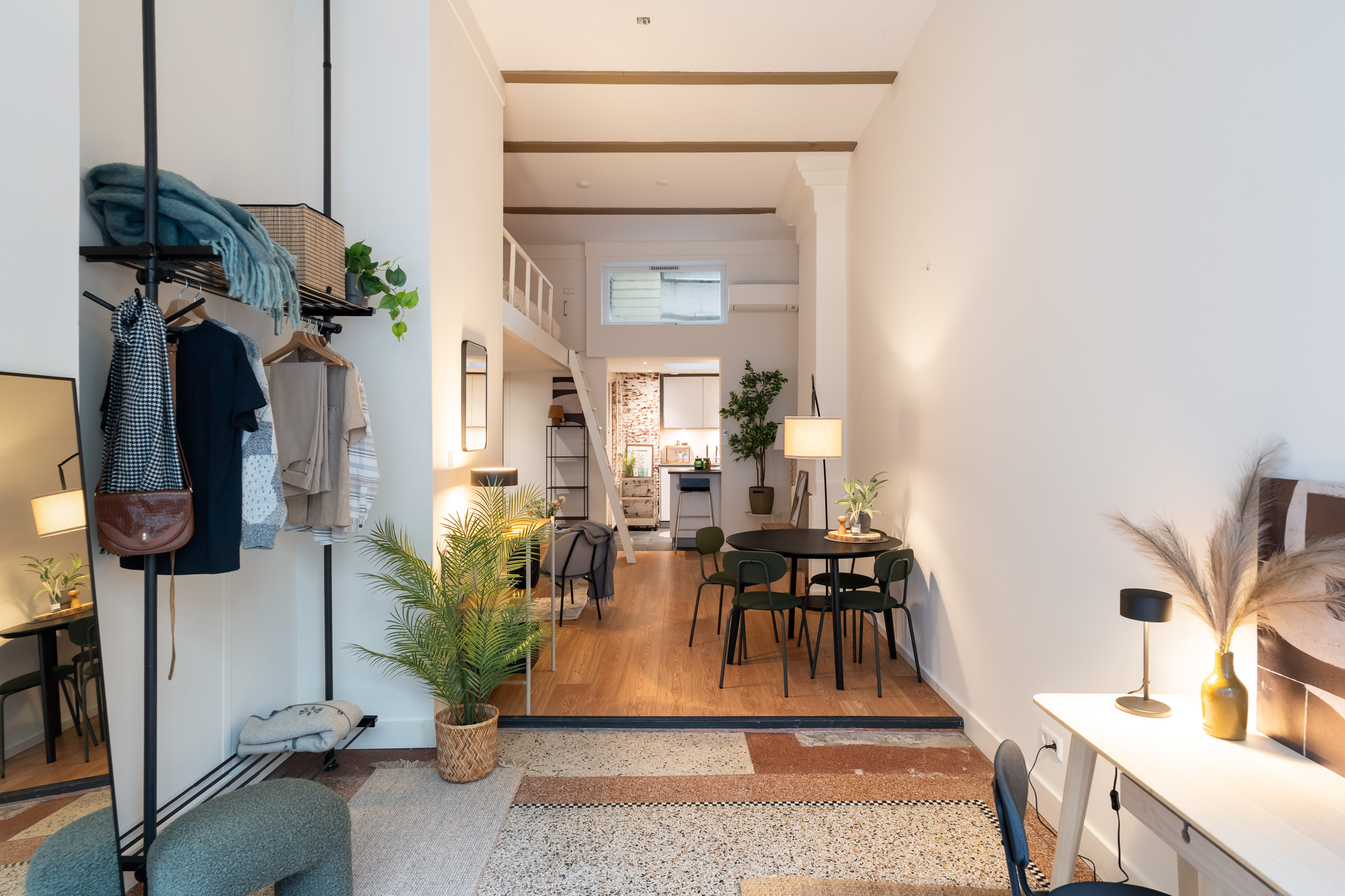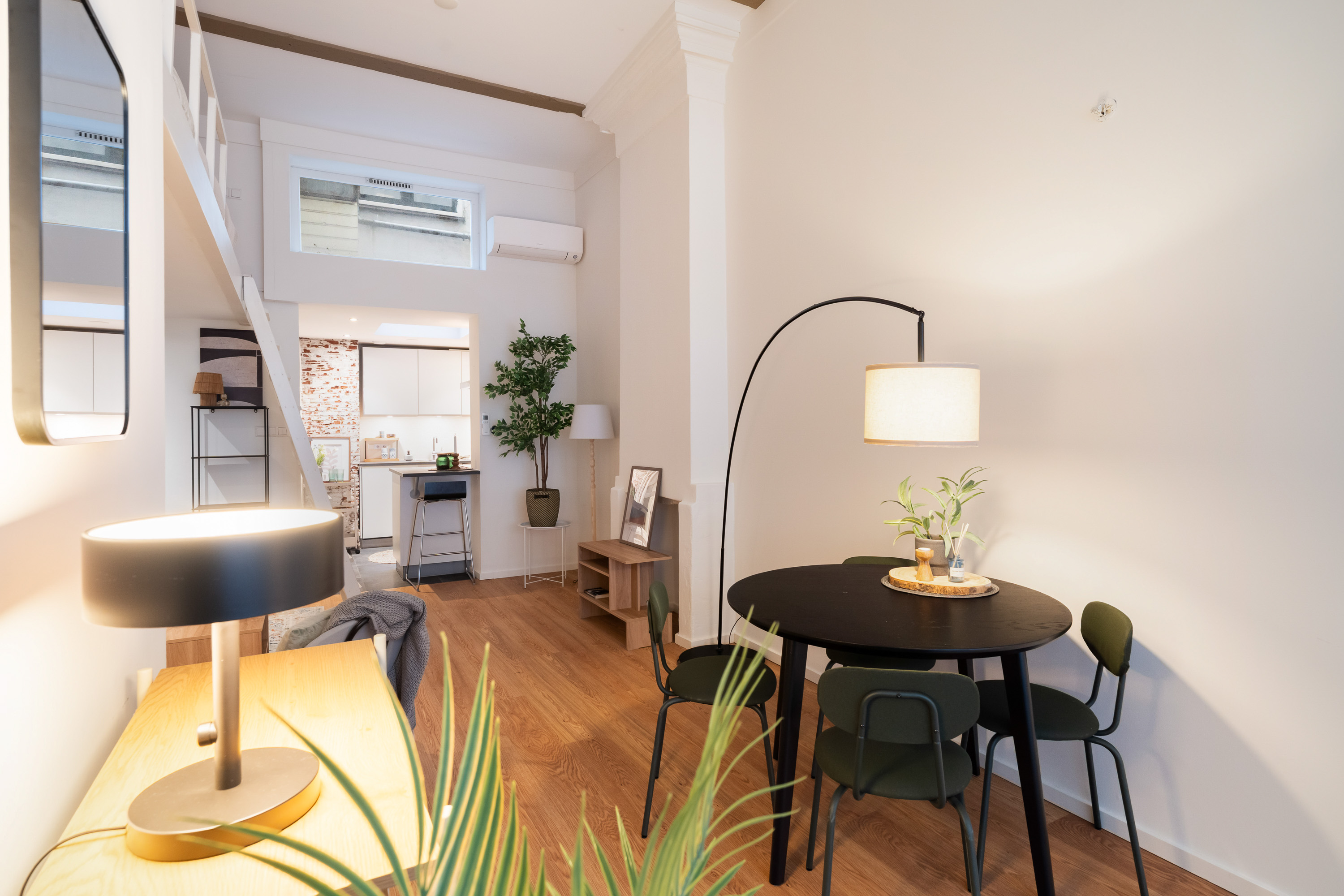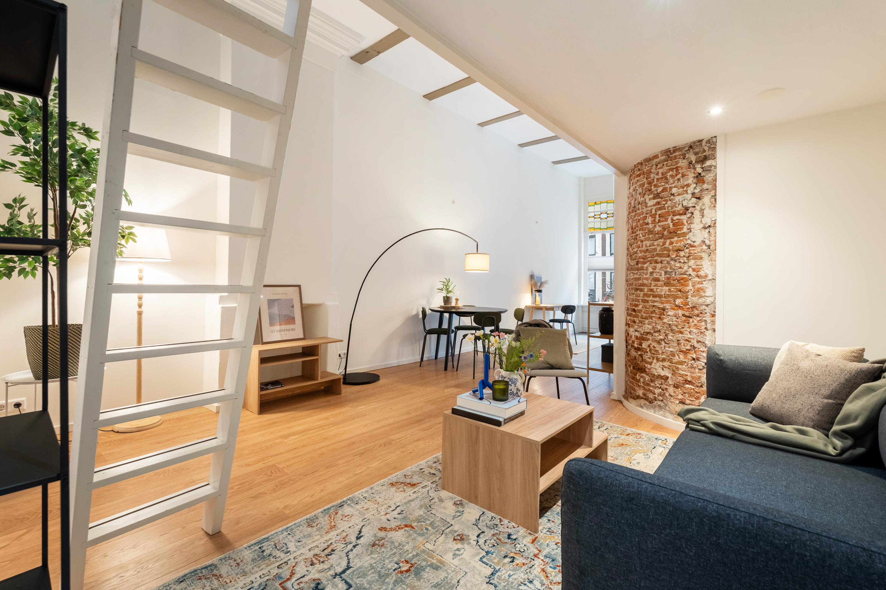 Via de open ruimte bereik je de slaapentresol: een knusse, rustige plek die perfect past bij het loftgevoel en de hoogte van het appartement optimaal benut.