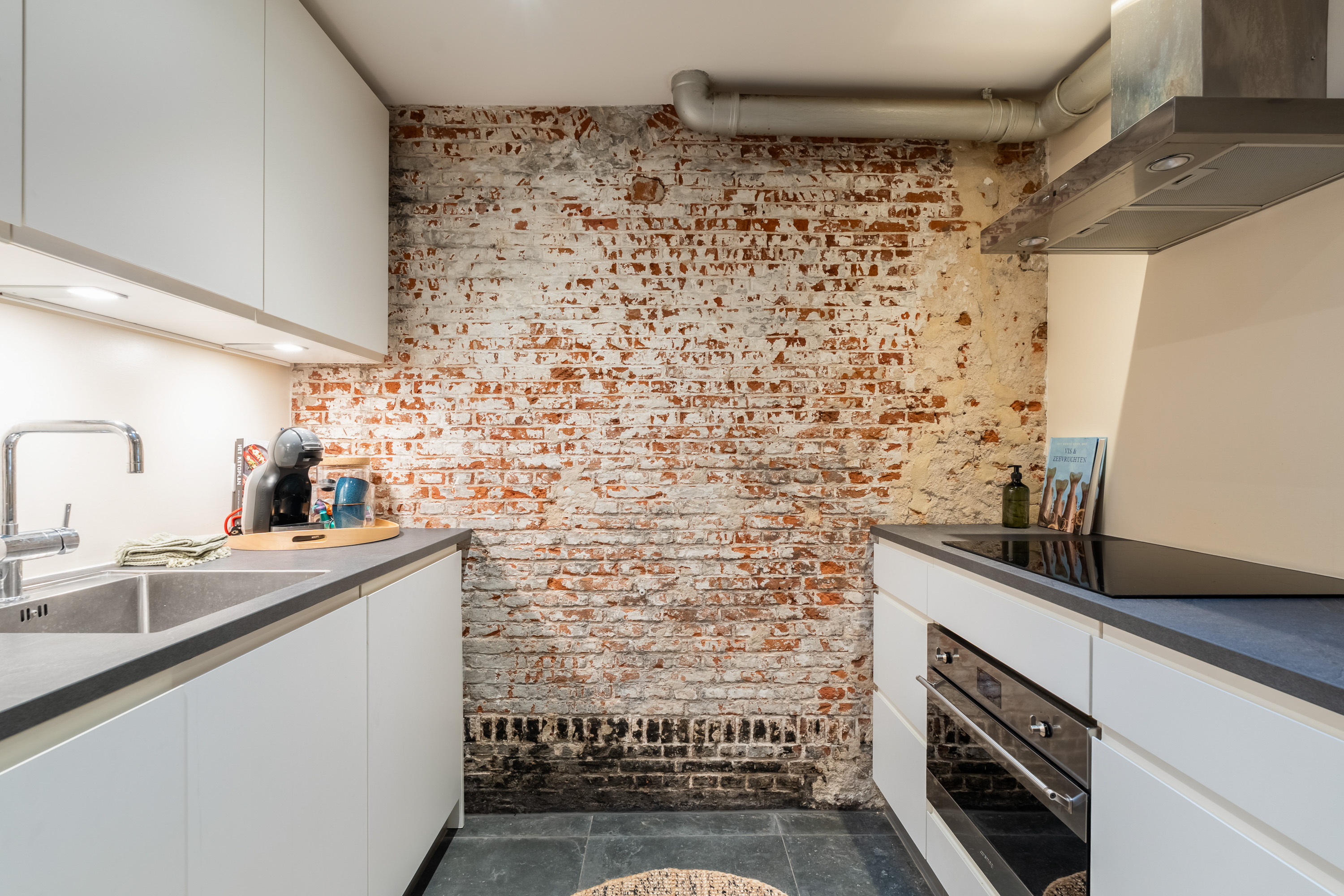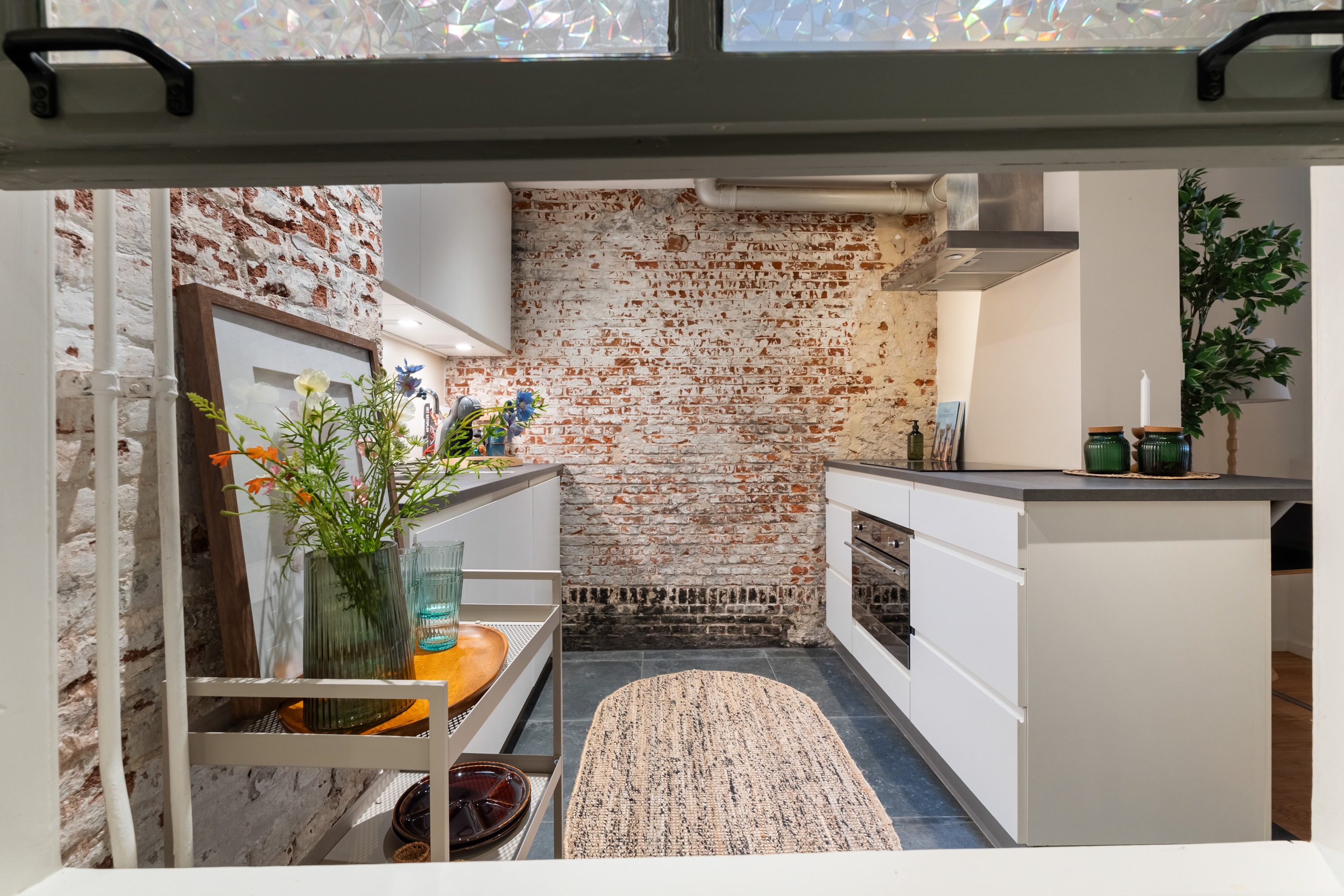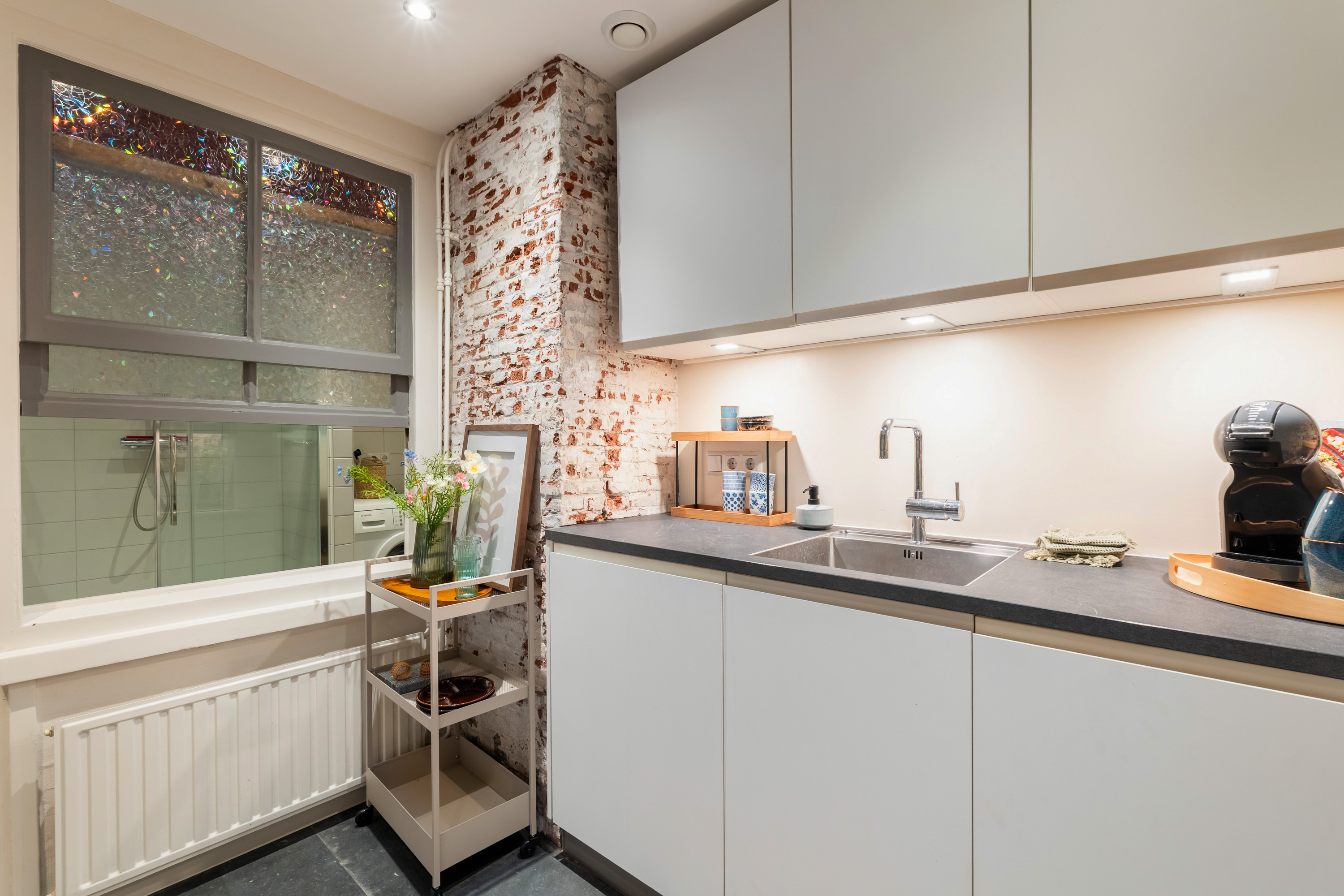 De overkapte patio, momenteel in gebruik als moderne keuken, is een echte eyecatcher. Een fijne plek om te koken en te leven, uitgerust met alle gebruikelijke gemakken en met een open, stedelijk gevoel. Het originele schuifraam tussen keuken en badkamer voegt een speels en authentiek detail toe dat je zelden tegenkomt.