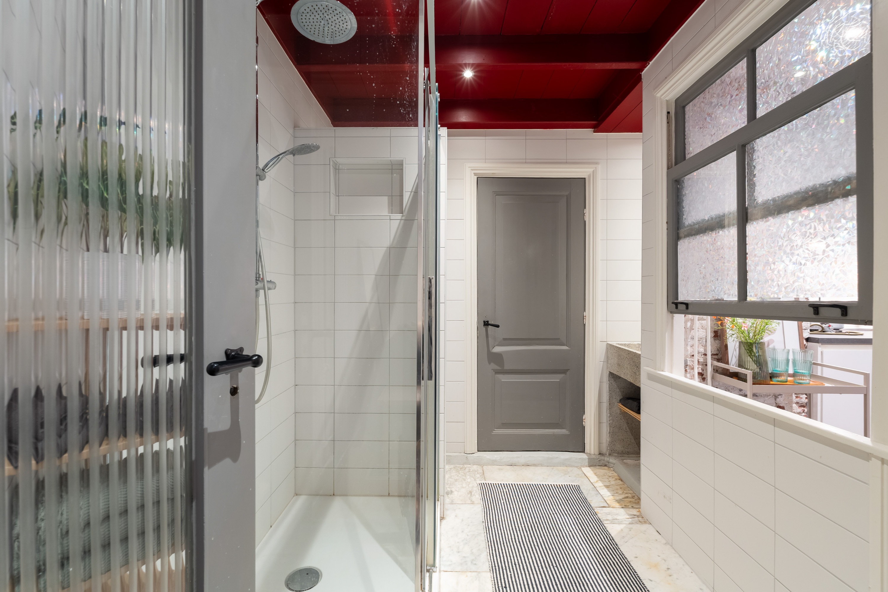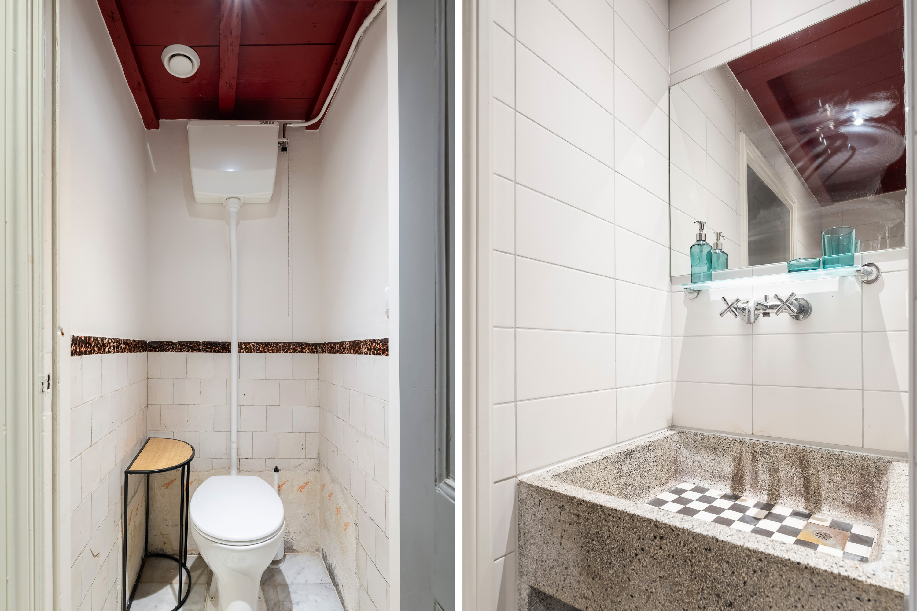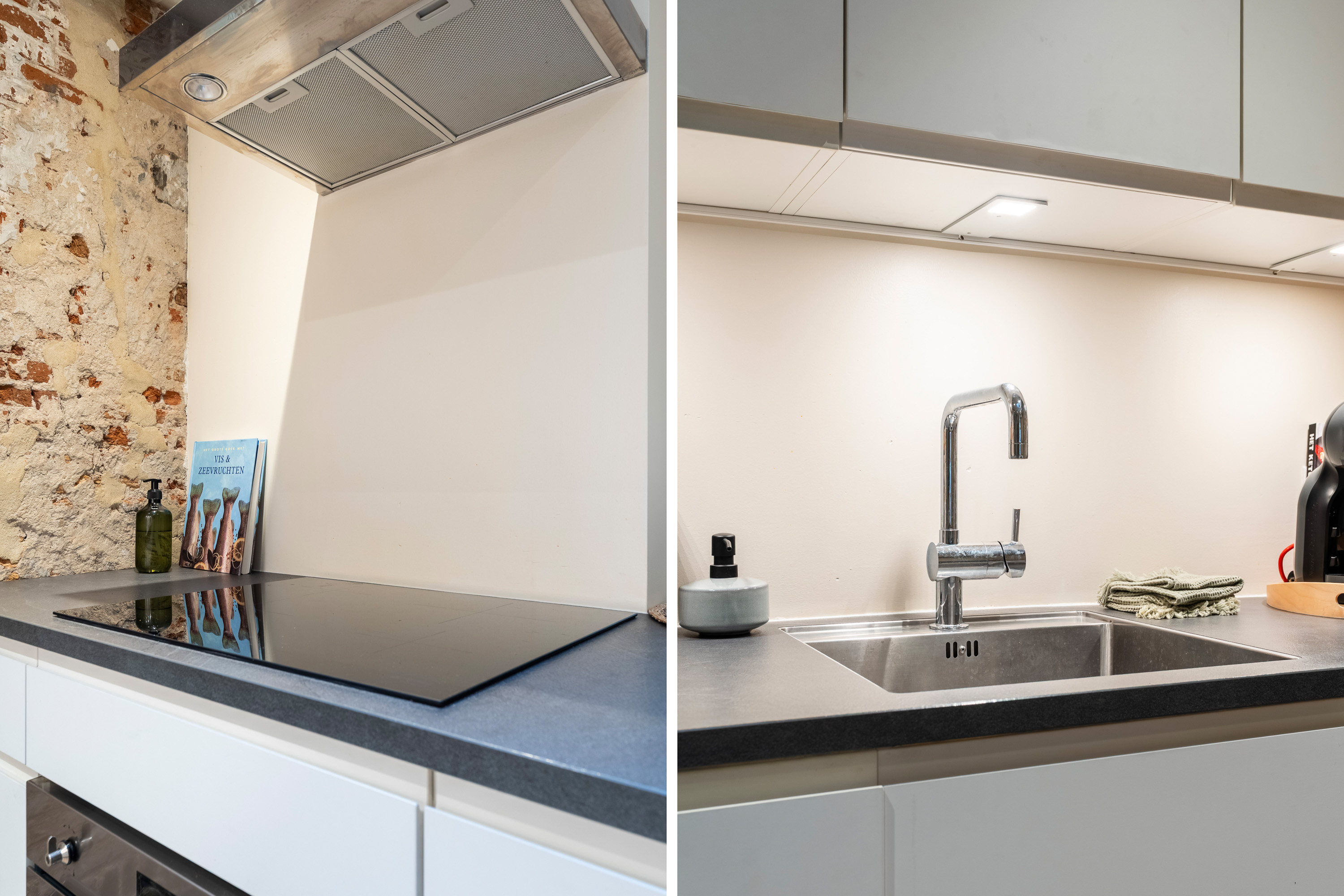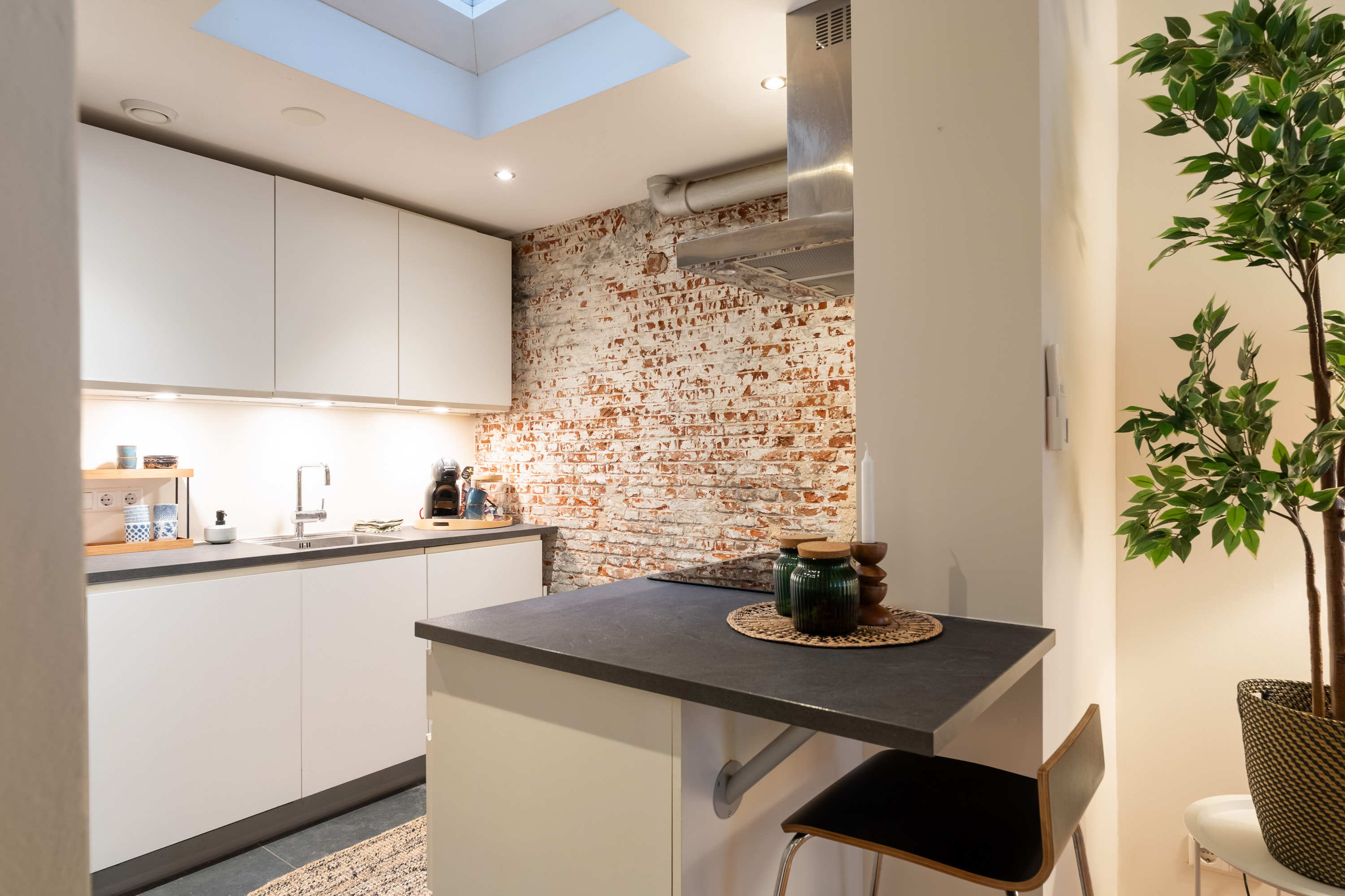 De overkapte patio, momenteel in gebruik als moderne keuken, is een echte eyecatcher. Een fijne plek om te koken en te leven, uitgerust met alle gebruikelijke gemakken en met een open, stedelijk gevoel. Het originele schuifraam tussen keuken en badkamer voegt een speels en authentiek detail toe dat je zelden tegenkomt.