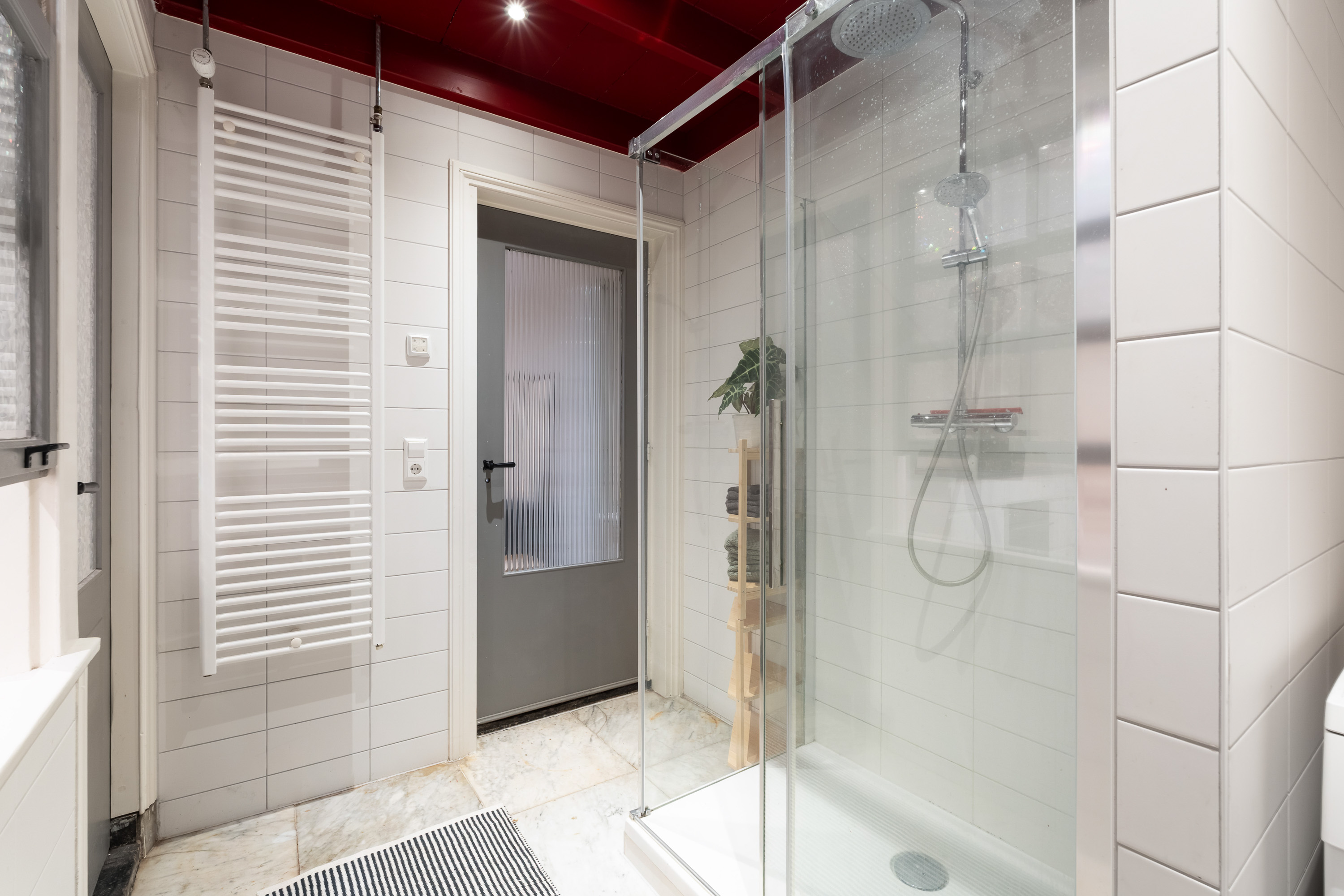 De badkamer is slim en stijlvol ingericht met een ruime douche, een prettige wastafelopstelling, aansluiting voor wasmachine én droger, en een separaat toilet. Zichtbare balken geven ook hier extra karakter.