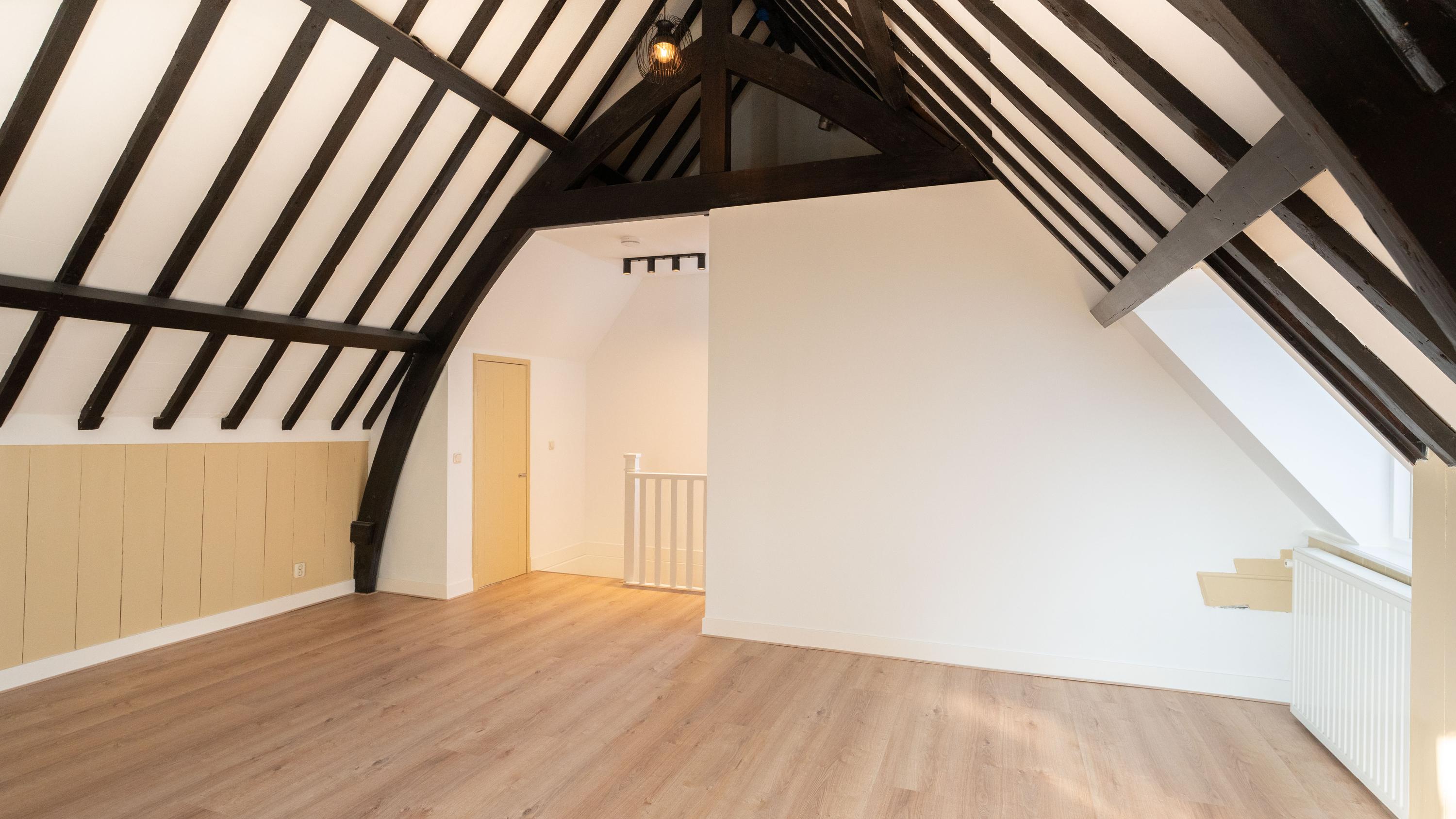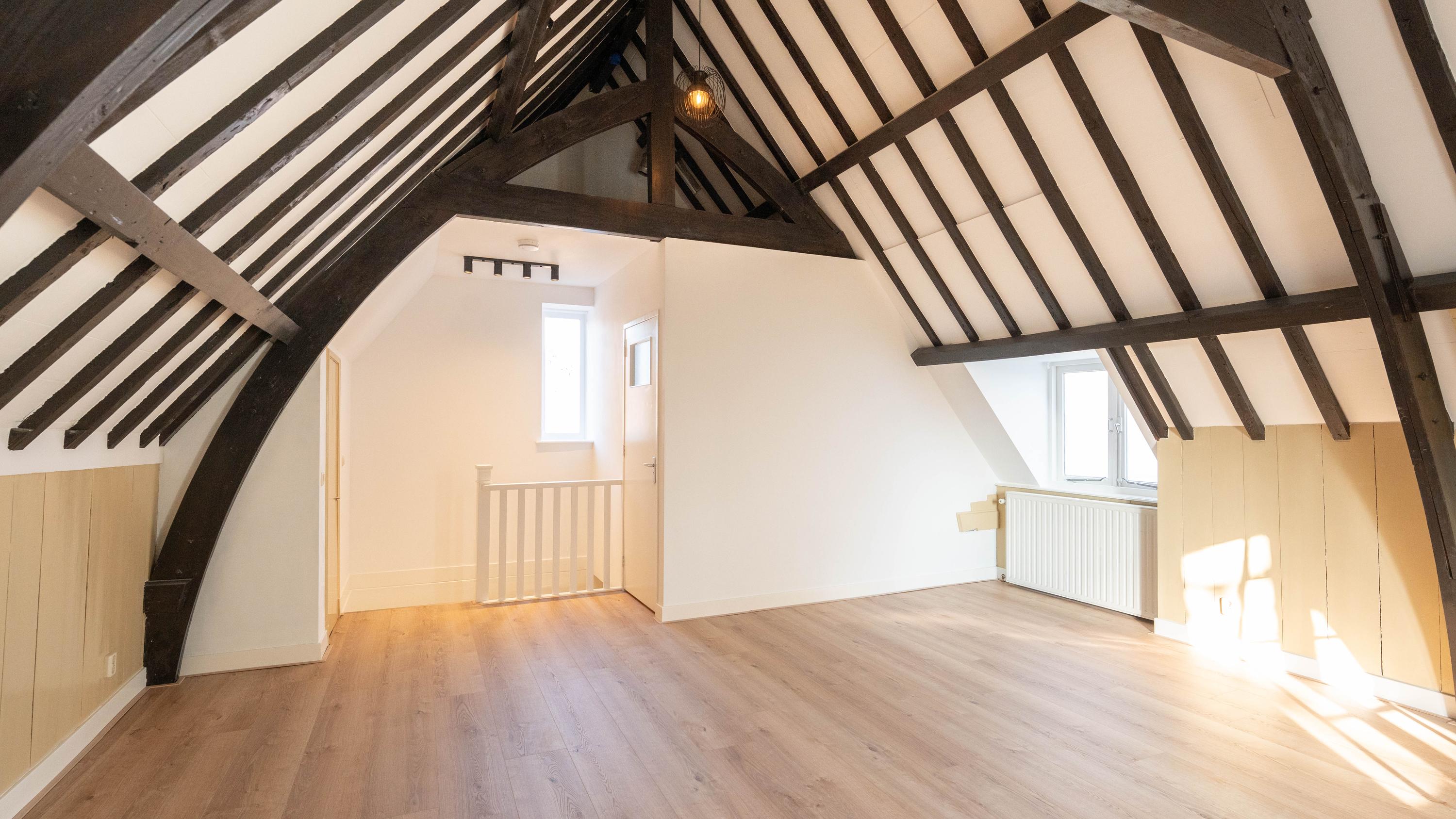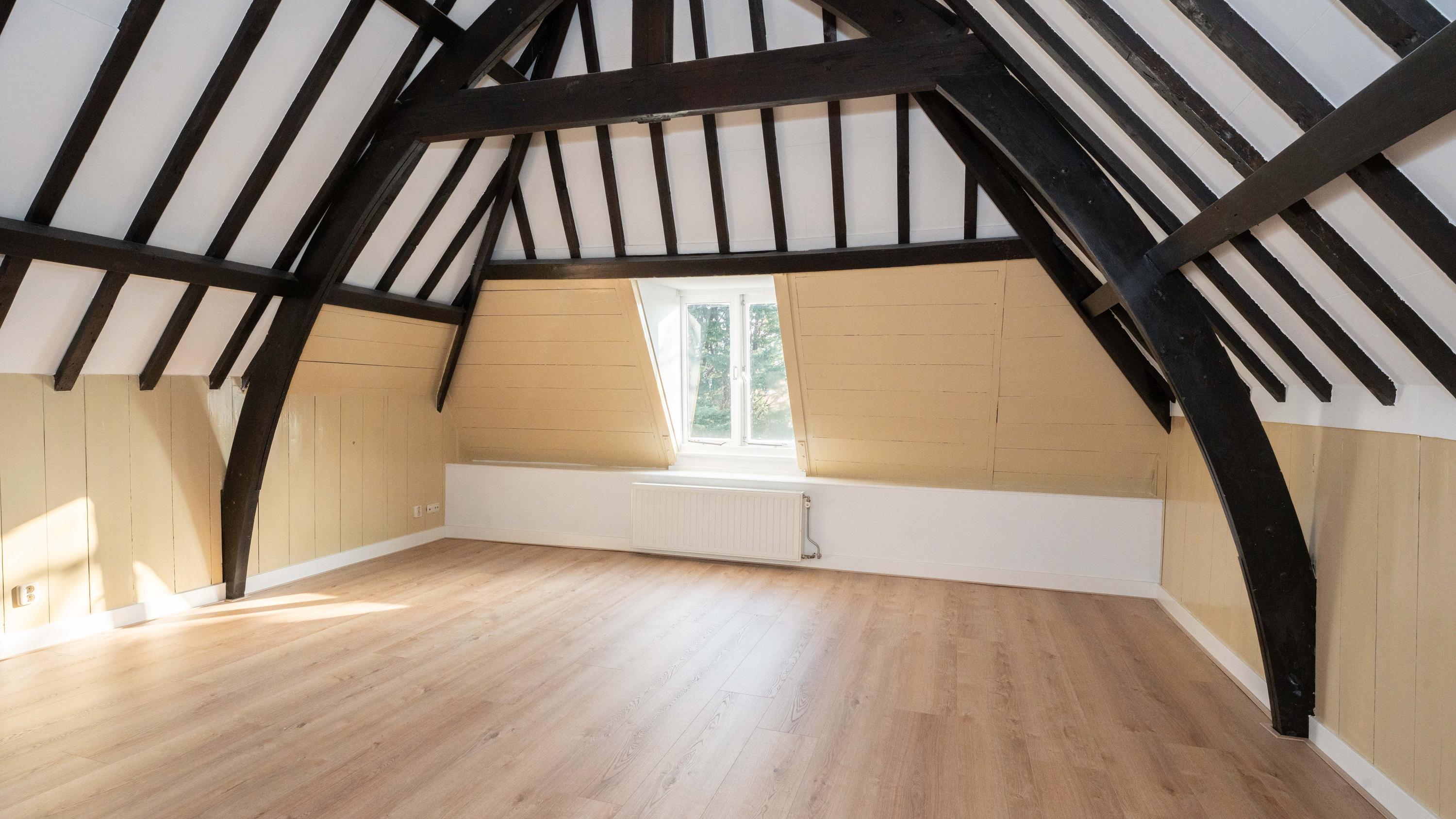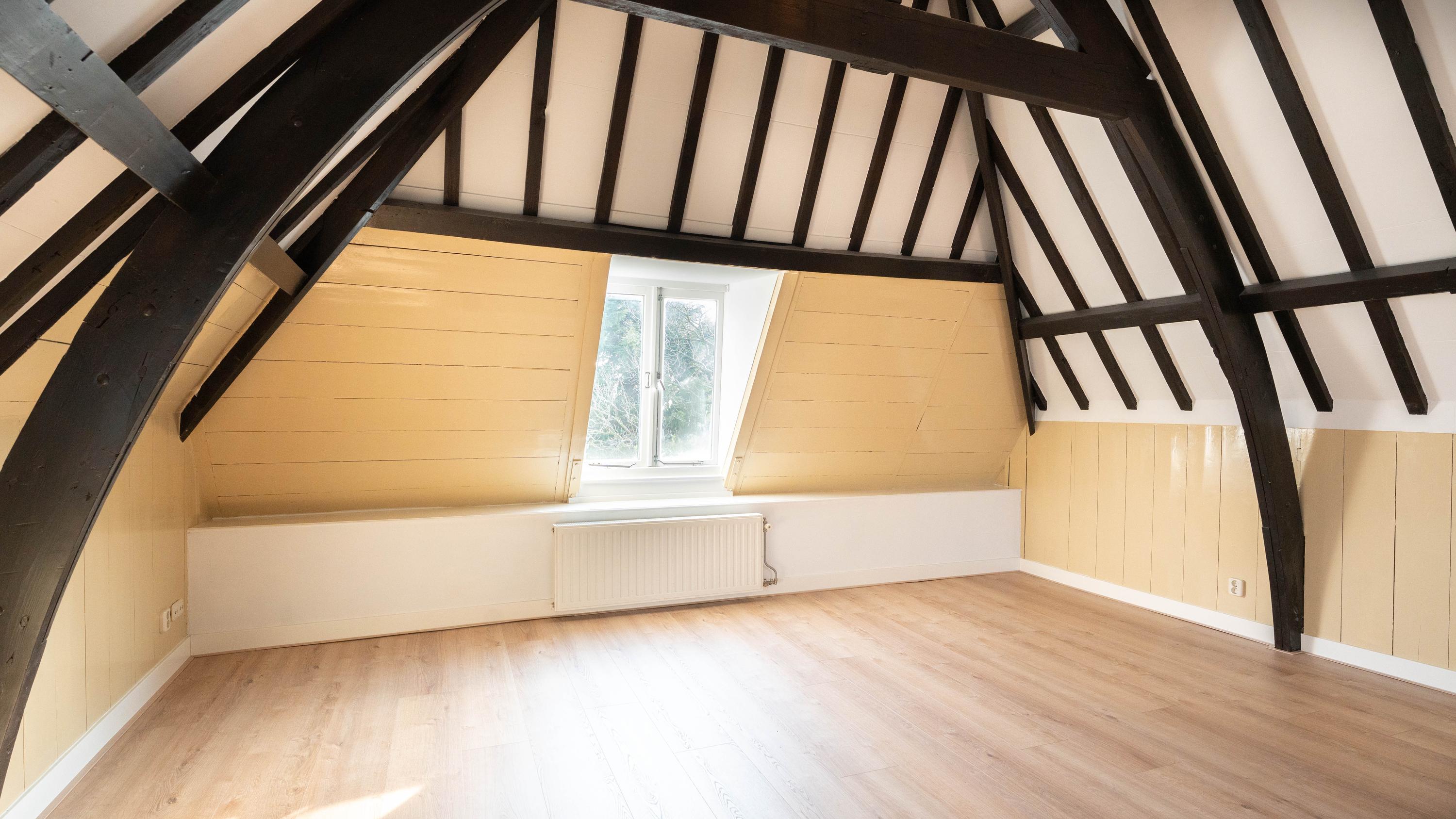 De tweede etage is geheel ingericht als een royale slaapkamer, waar de prachtige schilddak kapconstructie in het zicht blijft. Dankzij de uitzonderlijke grootte van deze ruimte is er de mogelijkheid om meerdere kamers te creëren, ideaal voor wie flexibiliteit zoekt. Extra opbergruimte is te vinden op de zolder en in de technische ruimte.