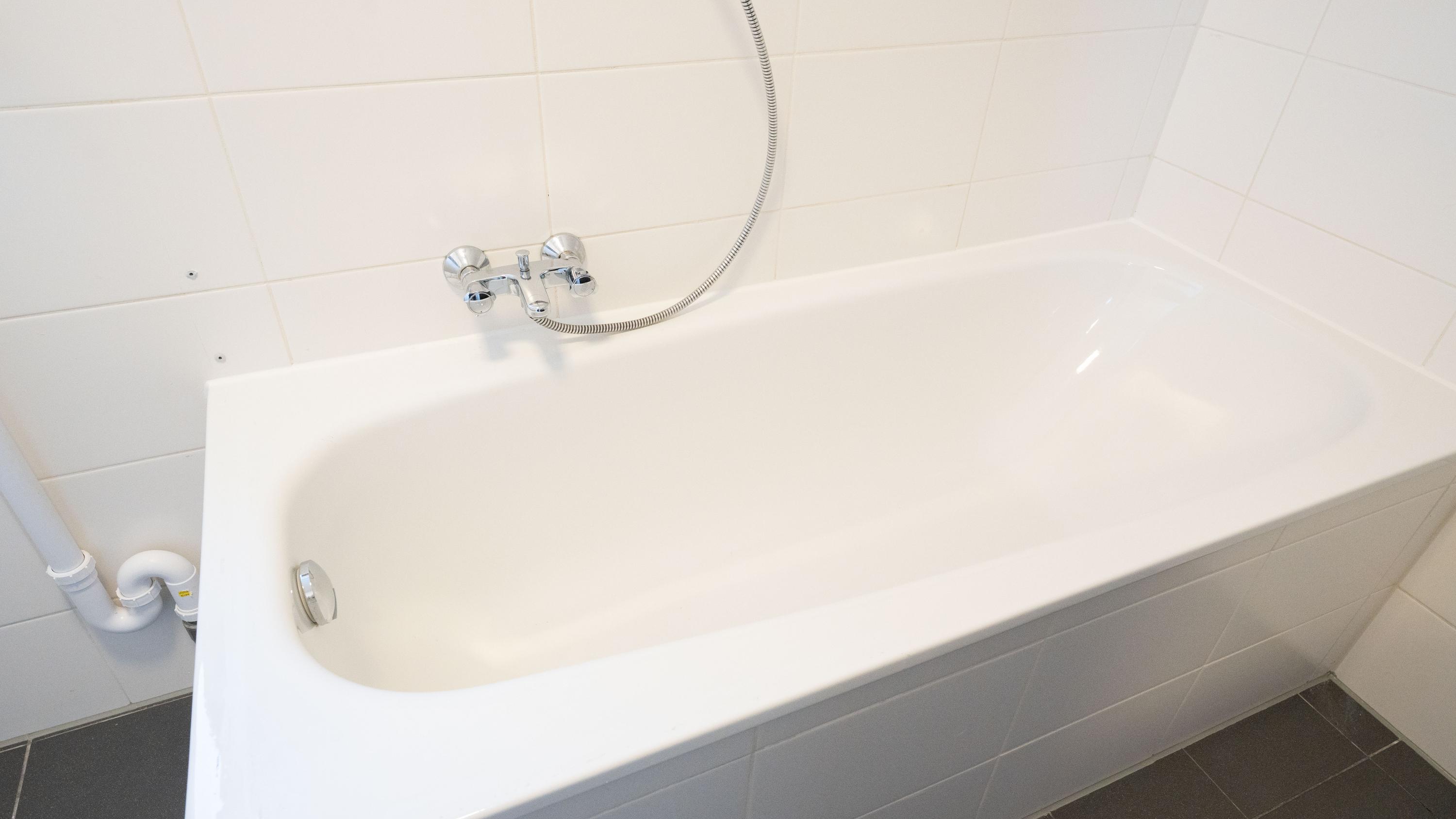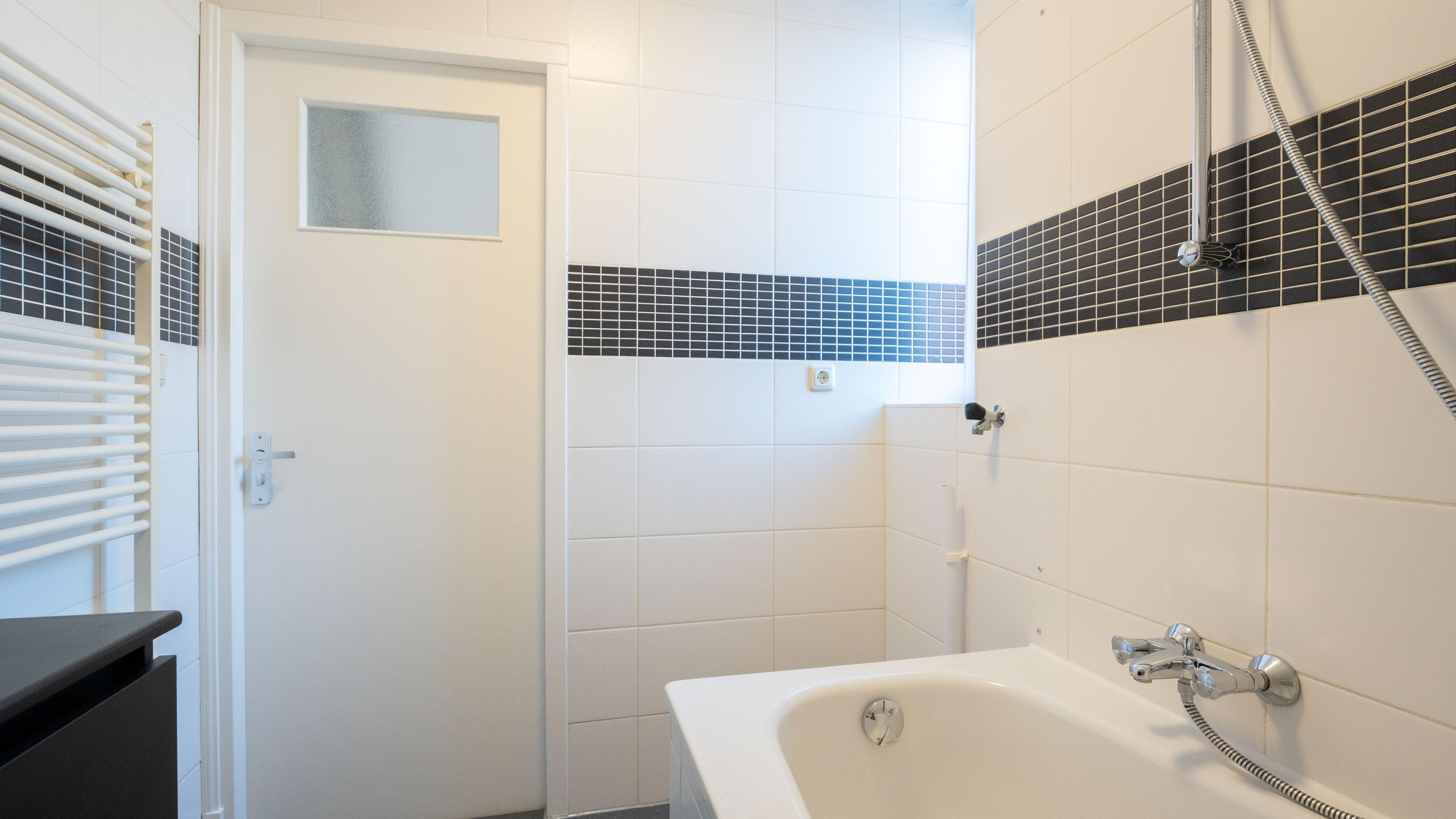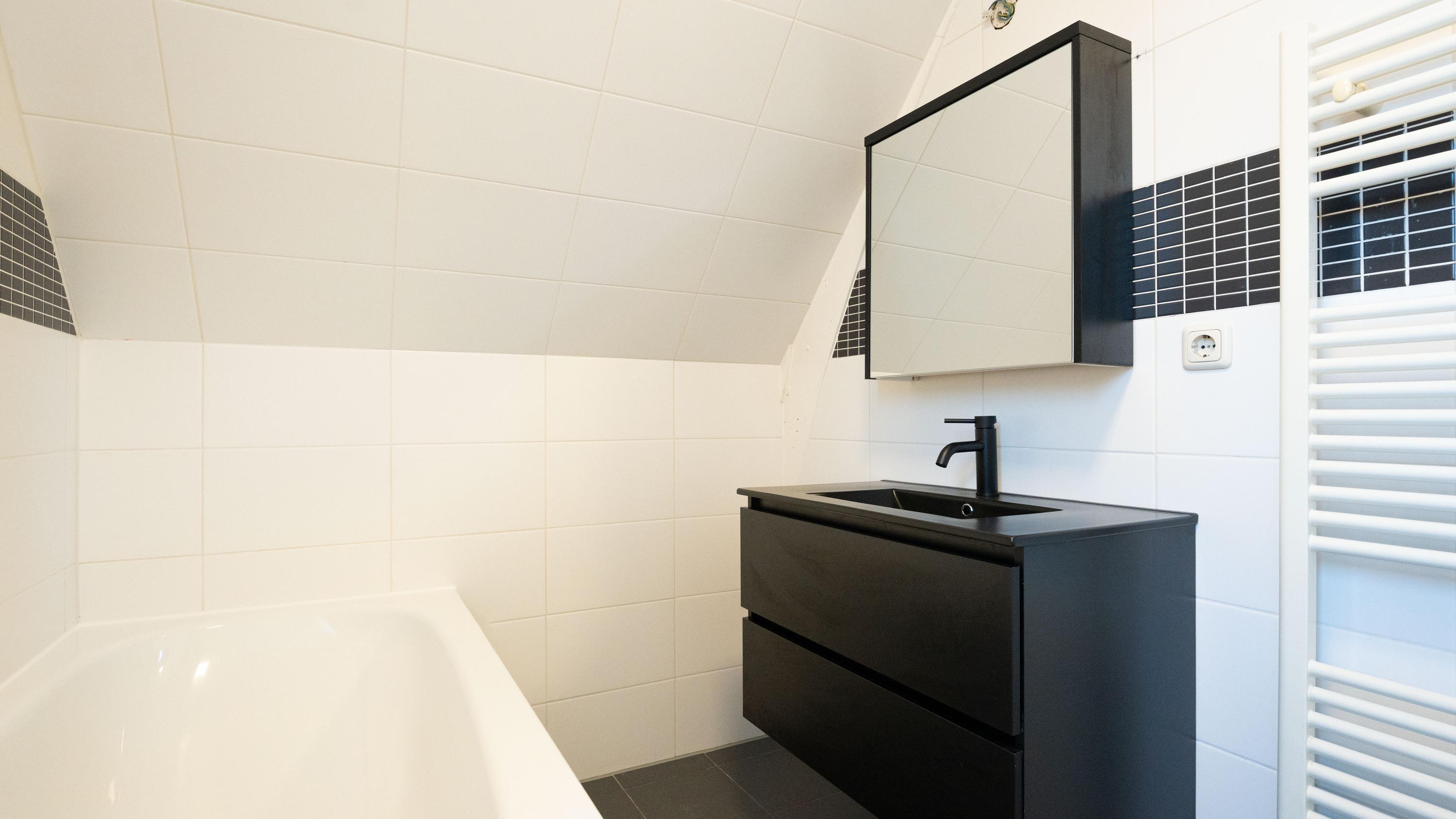 De badkamer is voorzien van een ligbad, wastafel met spiegel, een aansluiting voor de wasmachine en profiteert van natuurlijke lichtinval. Dit zorgt voor een fijne, ontspannen sfeer.