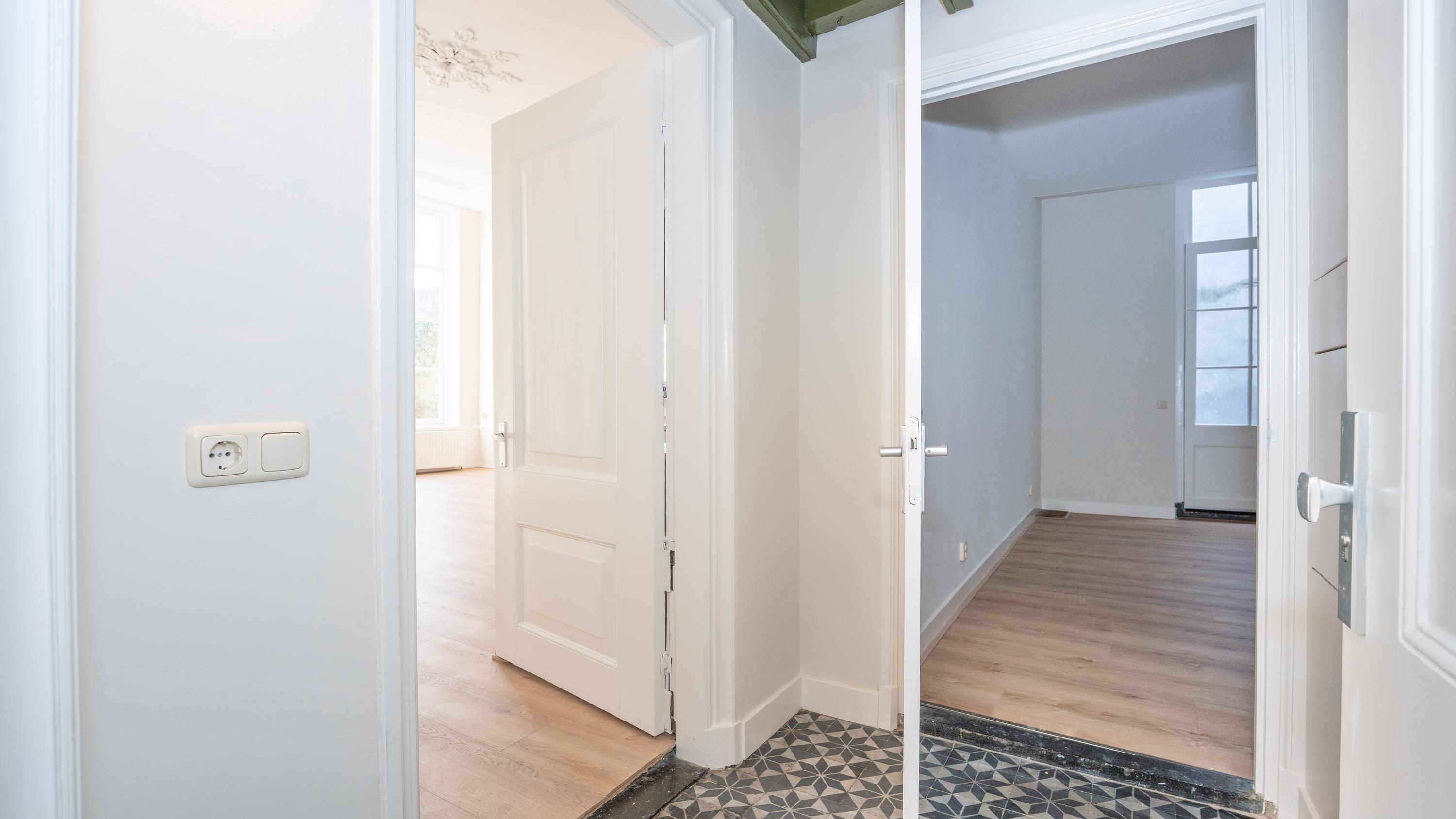 Kom thuis op een van de mooiste en meest centraal gelegen locaties van Leiden. Het imposante exterieur van het Rijksmonumentale pand verwelkomt je via de wijnrode voordeur naar de gemeenschappelijke entree. De sfeervolle glas-in-lood deuren en gepolijste marmeren vloer in de hal openen de weg naar dit bijzondere appartement.