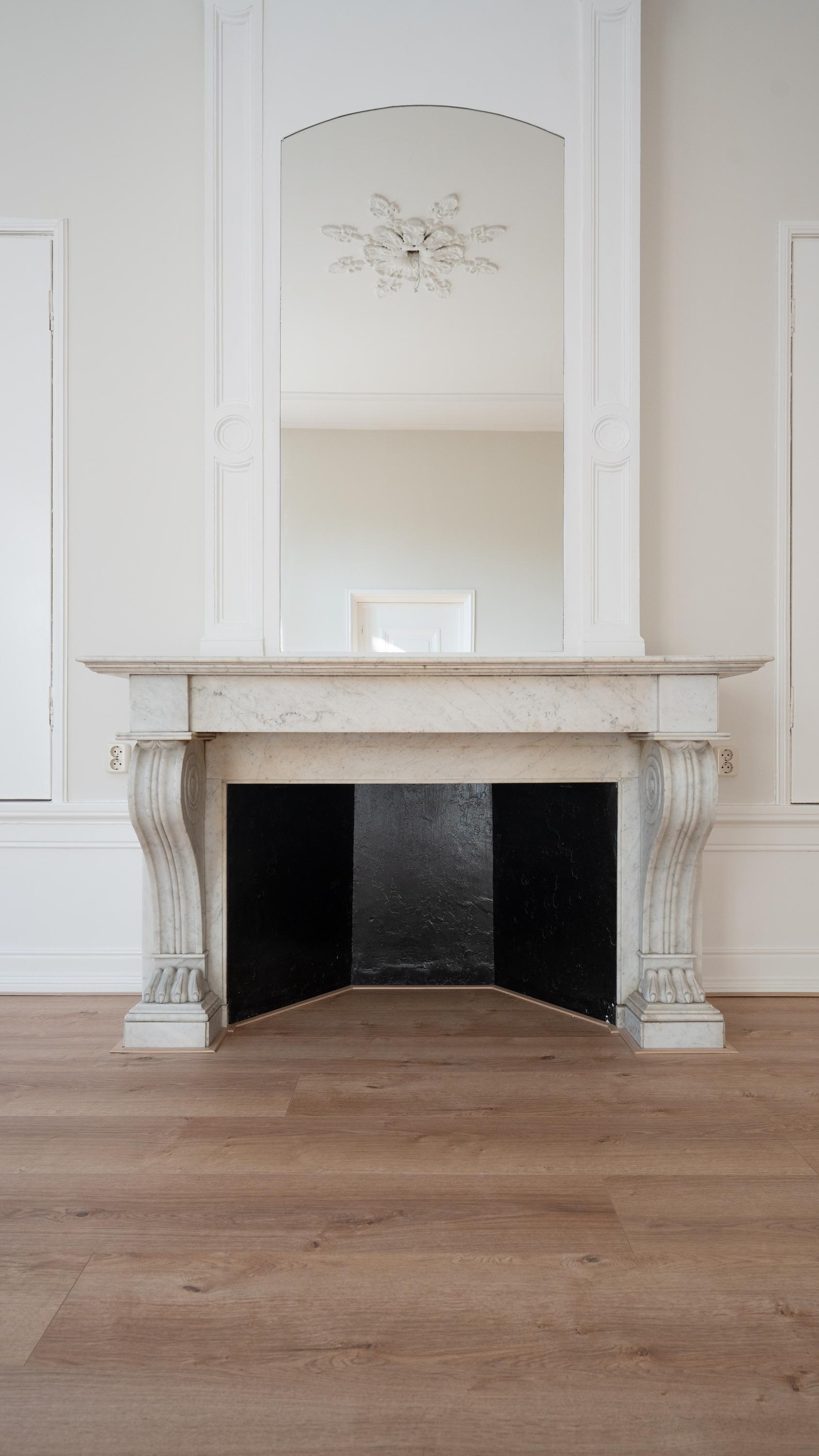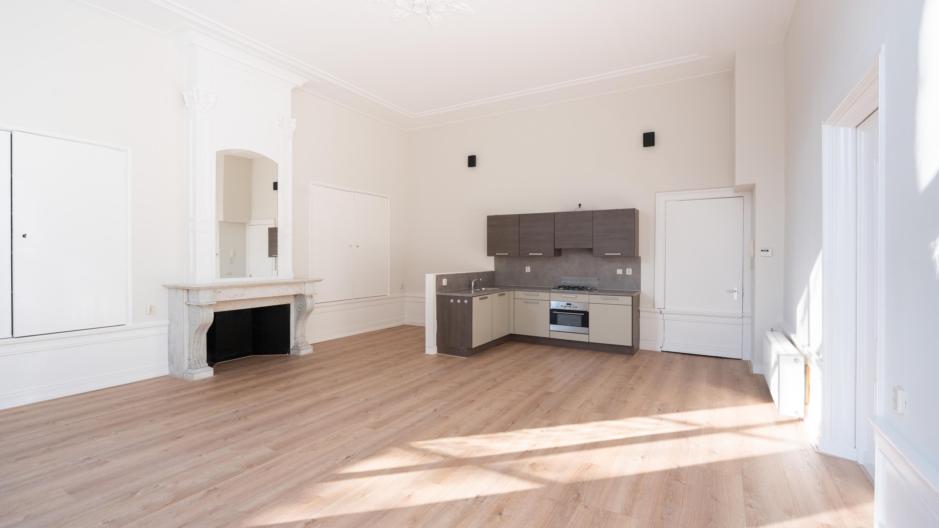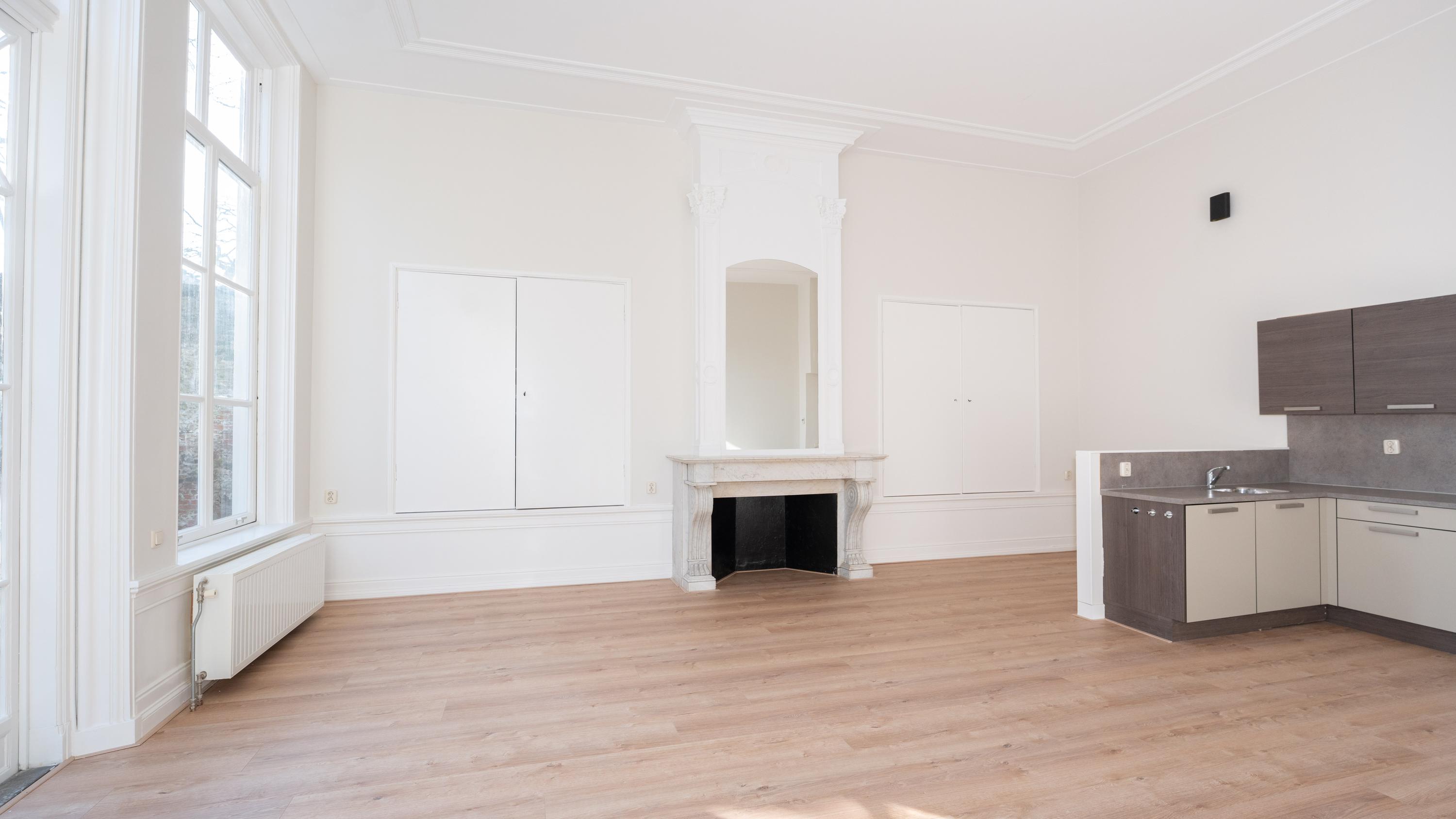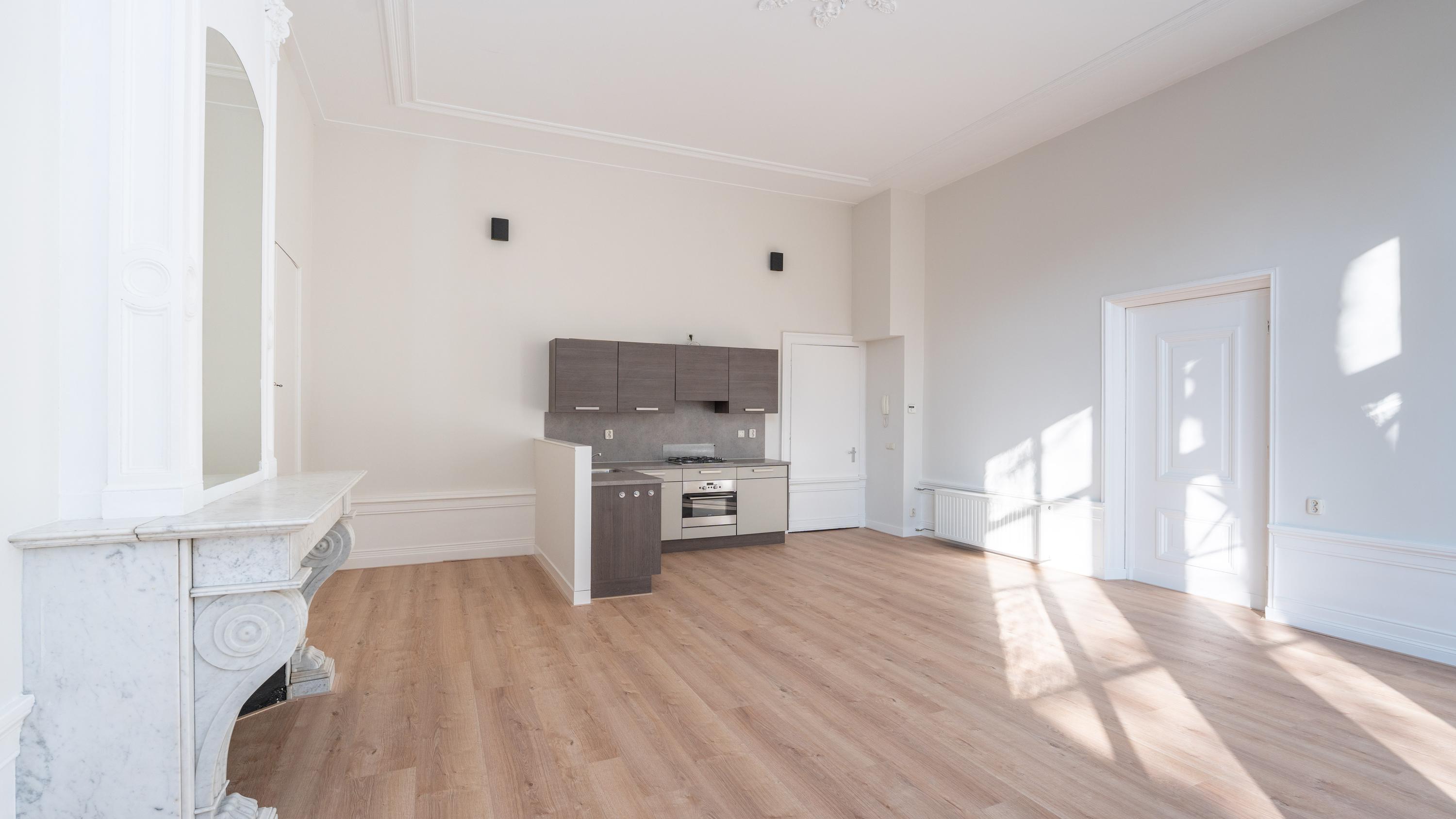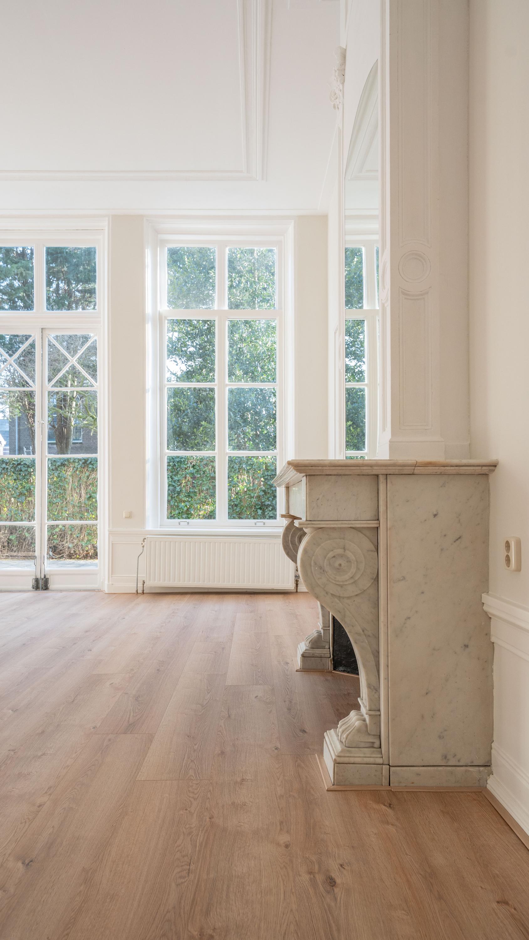 Vanuit de entreehal zijn alle ruimtes bereikbaar. Bij binnenkomst in de woonkamer, valt direct de plafondhoogte in het oog. Het appartement geeft een statig en rijk gevoel waar lucht en licht elkaar perfect complementeren. De grote romantische raampartijen zorgen voor een overvloed aan natuurlijk licht. Deze openslaande deuren bieden toegang tot de ruime privé buitenruimte. Hier, in de tuin van je eigen stadspaleis, omringd door het gekwetter van de vogels in de eeuwenoude bomen kan het genieten beginnen.