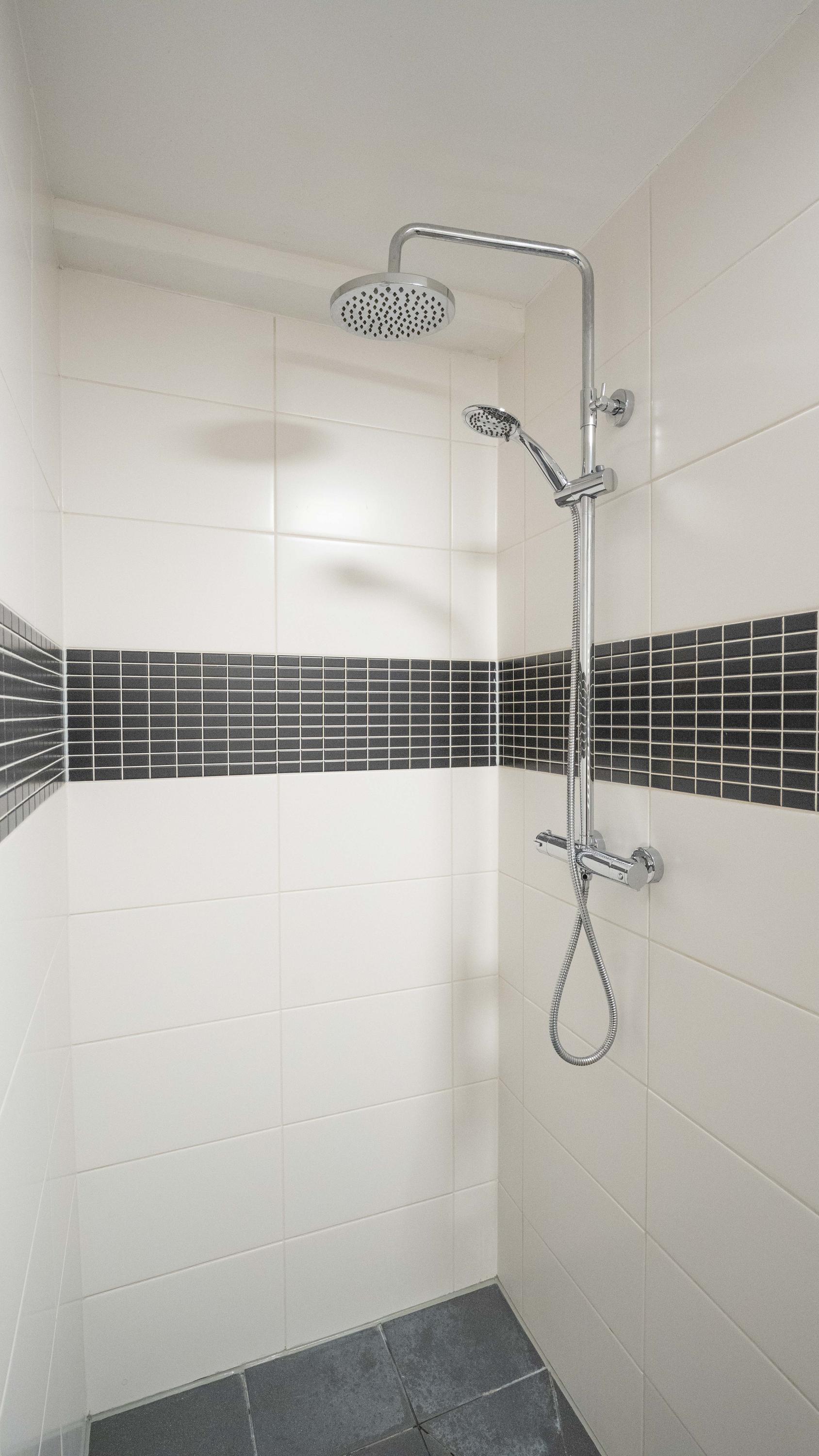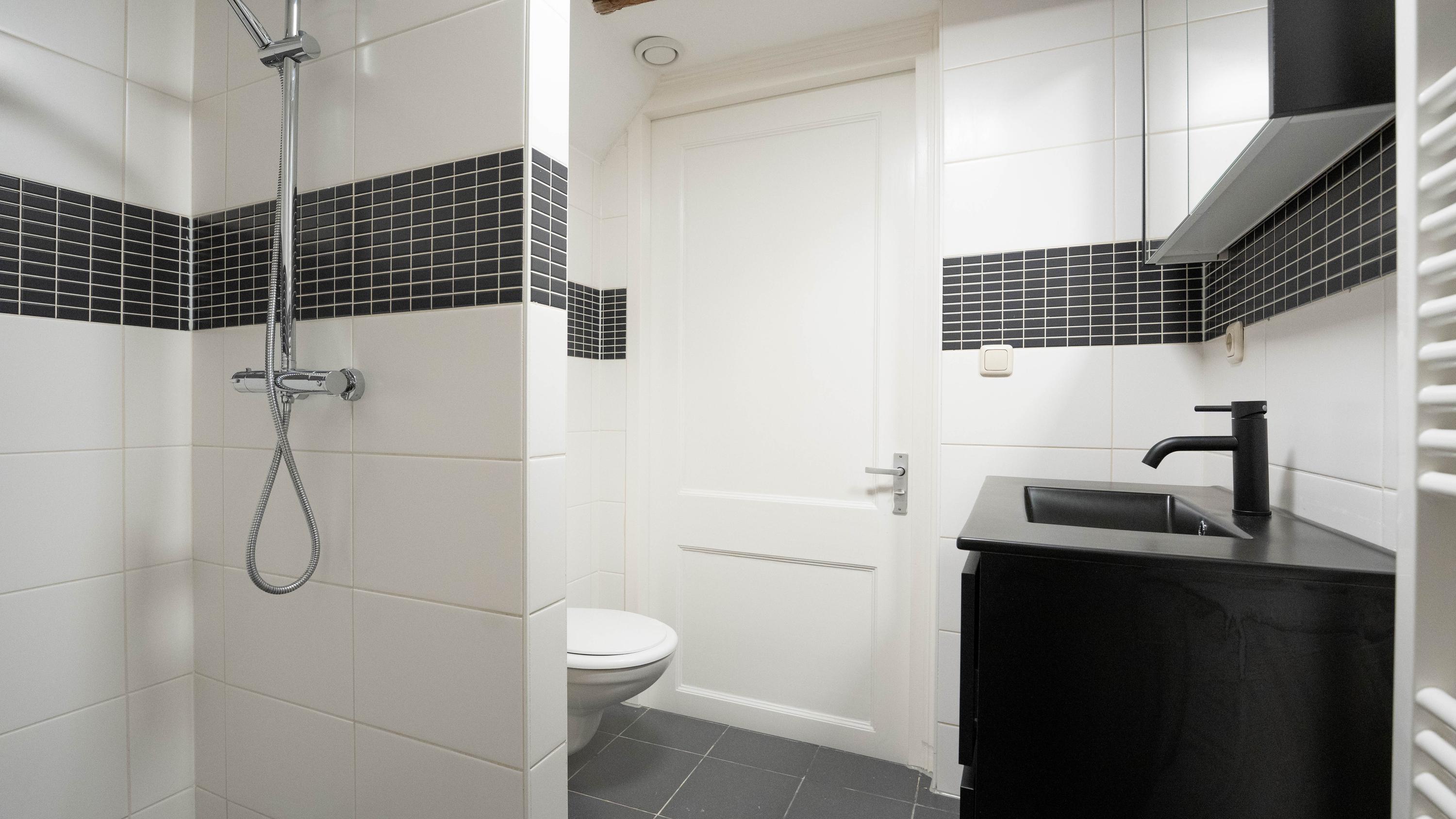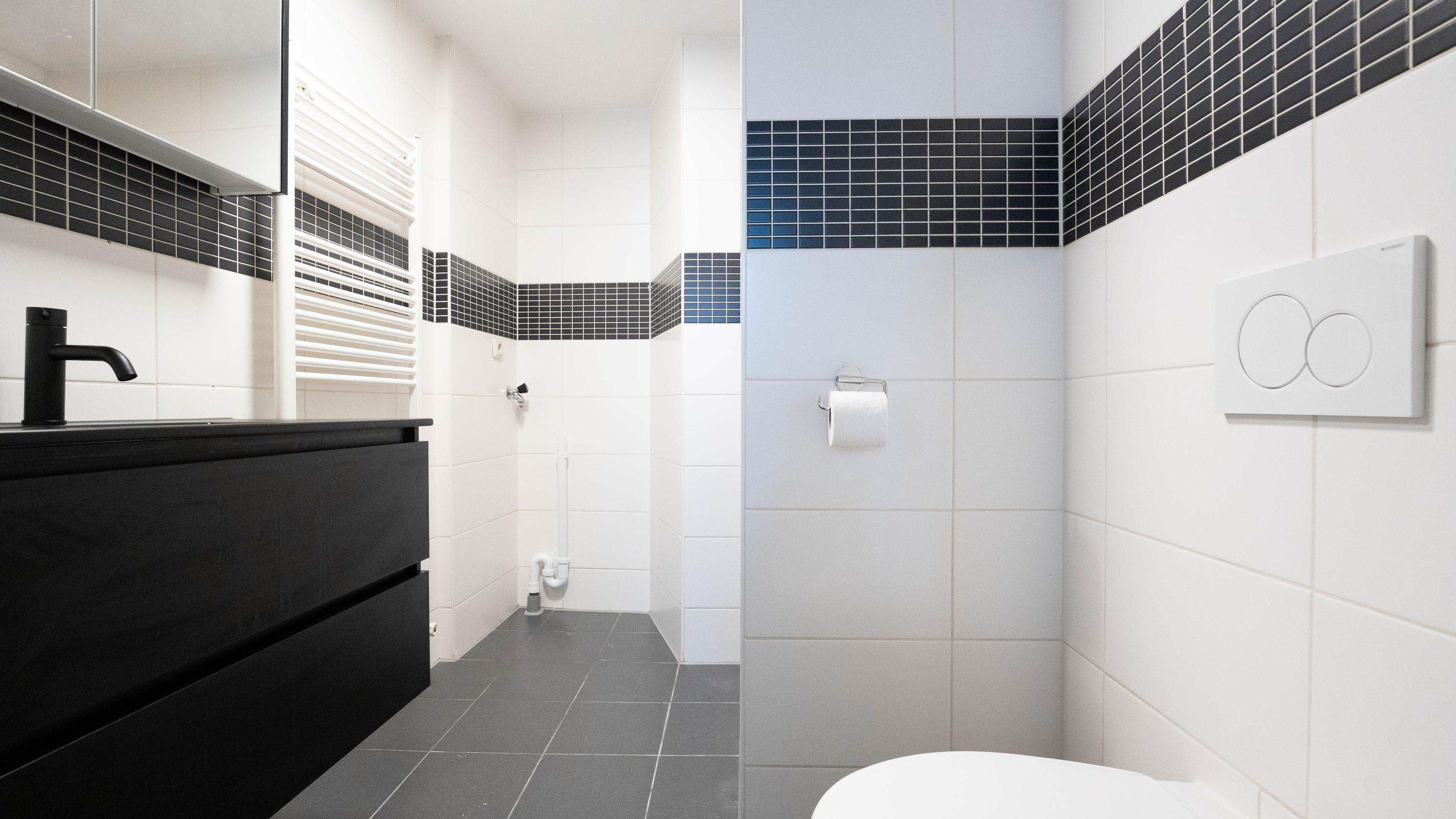 De badkamer beschikt over een douche, wastafelmeubel, toilet en handdoekenradiator. Tevens is er een aansluiting voor het opstellen van de wasmachine en droger.