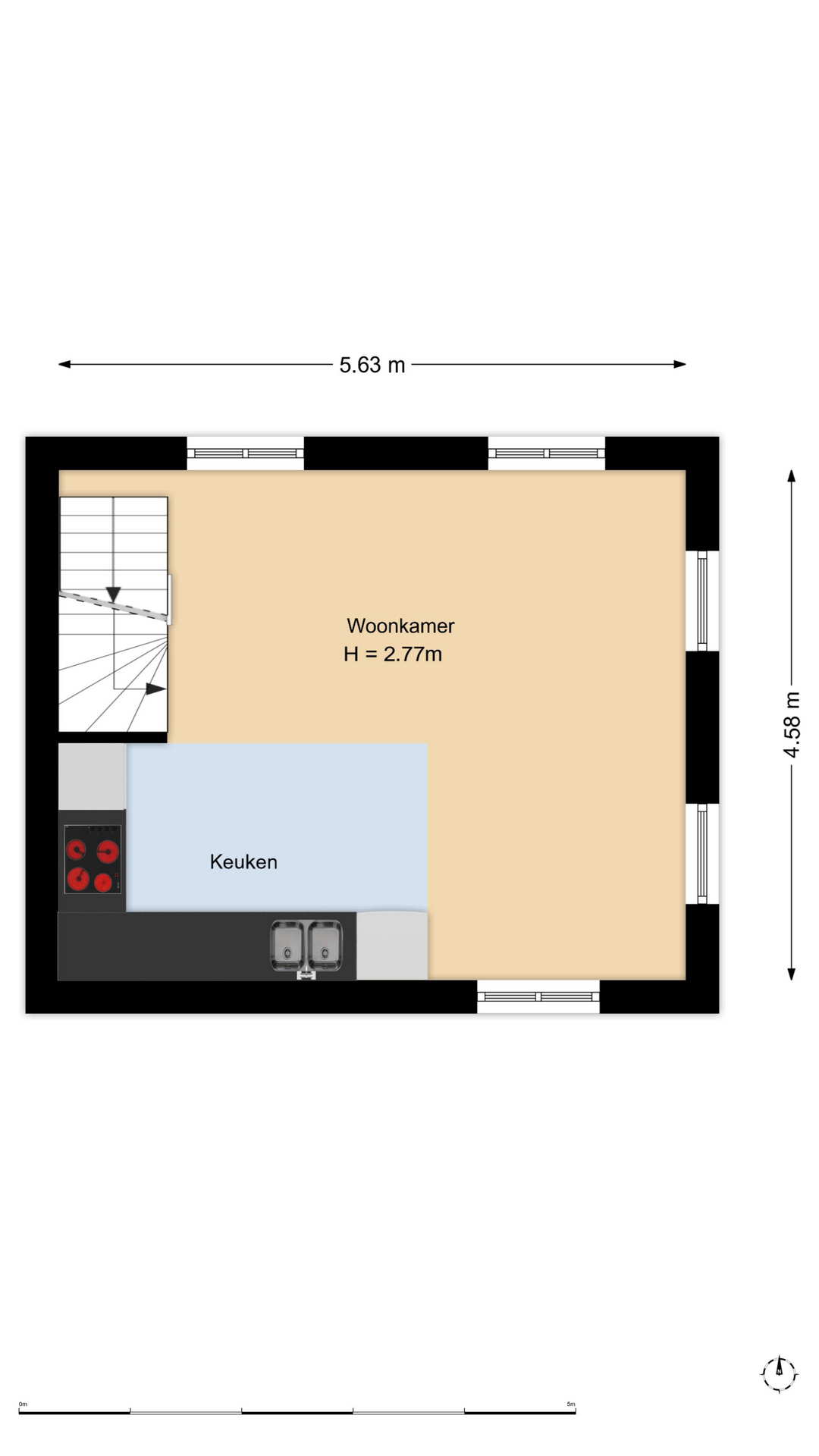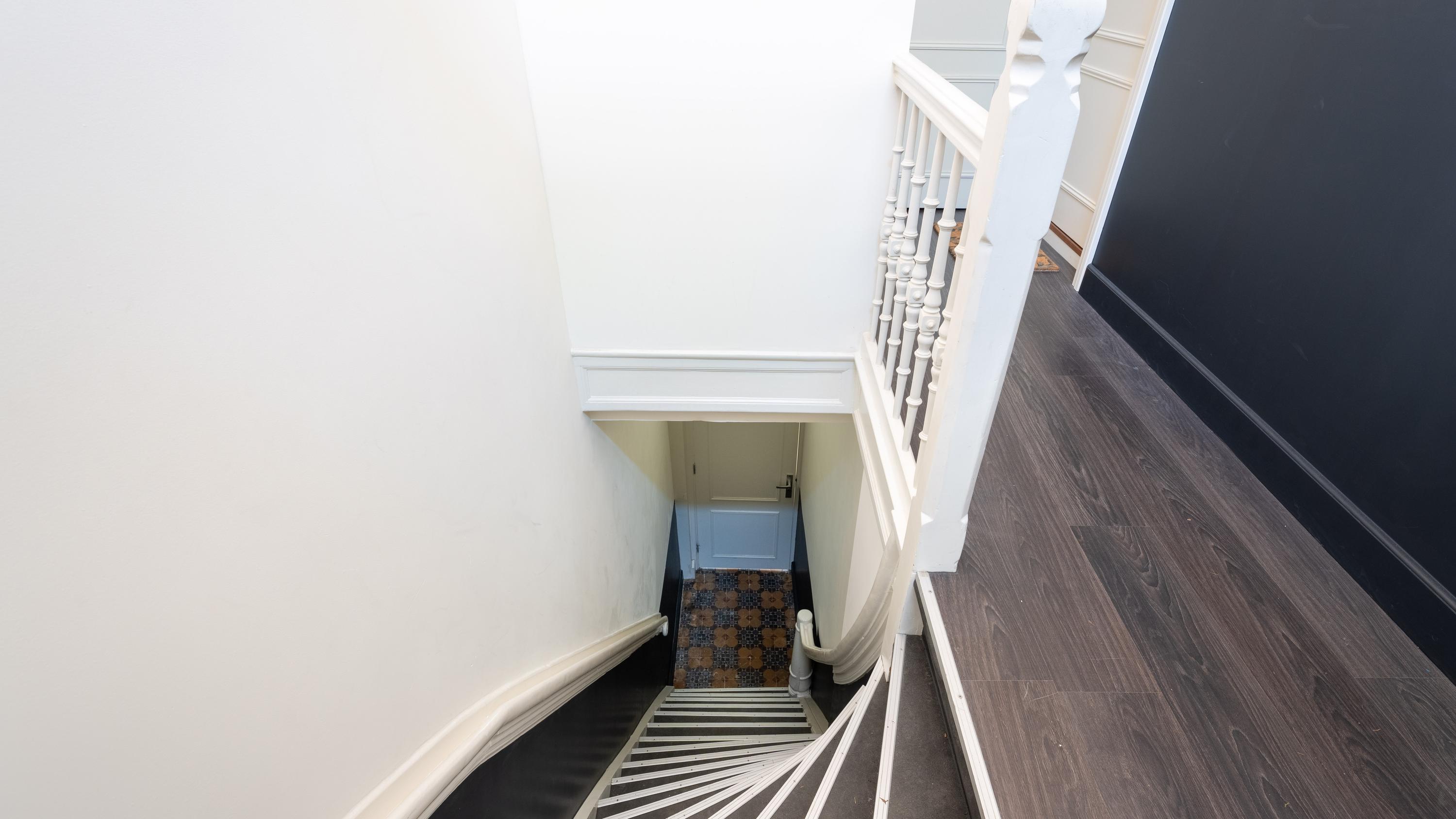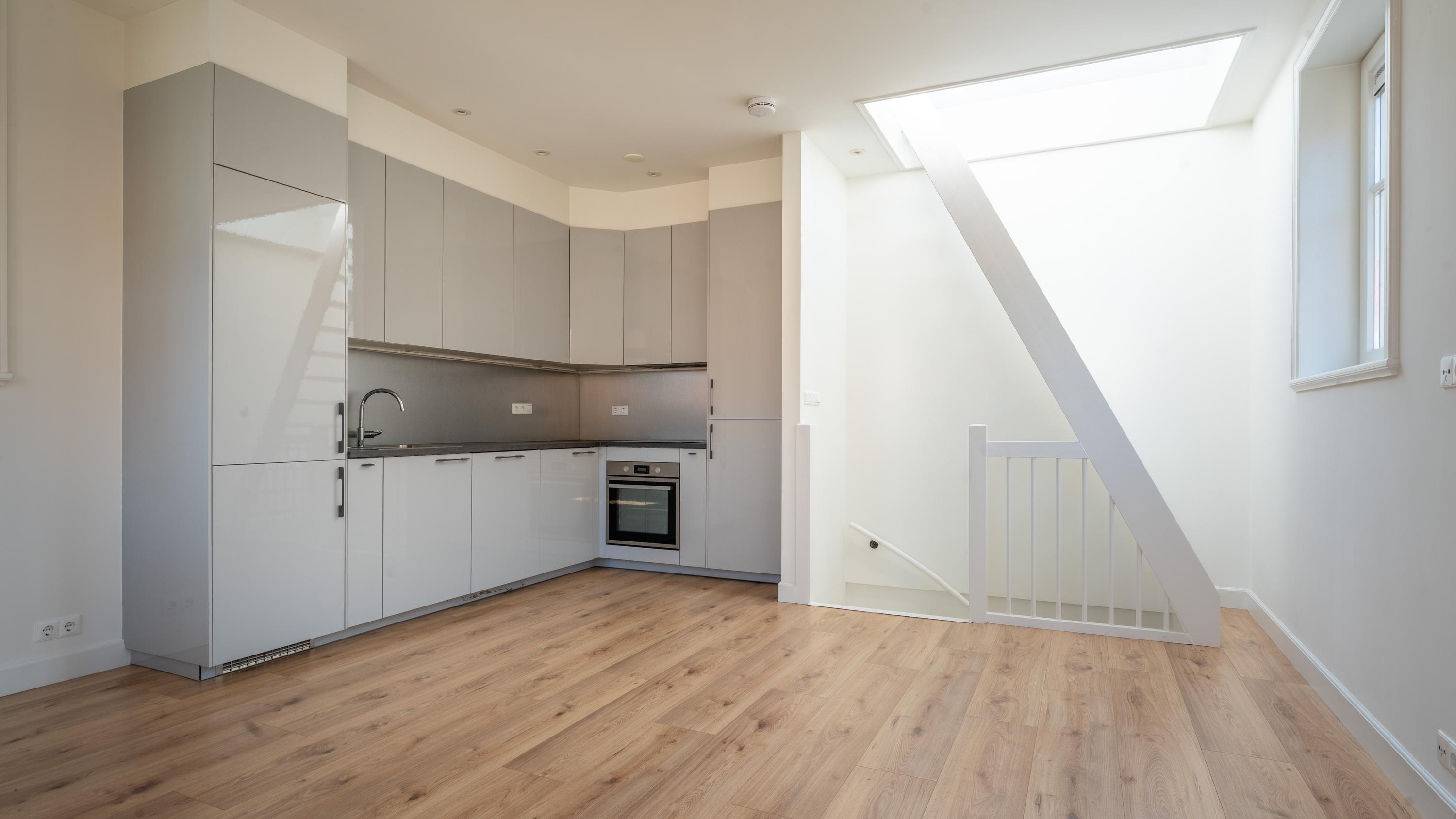– Lichte woonkamer met hoge plafonds en vaste trap naar plat dak (mogelijkheden voor een dakterras?)