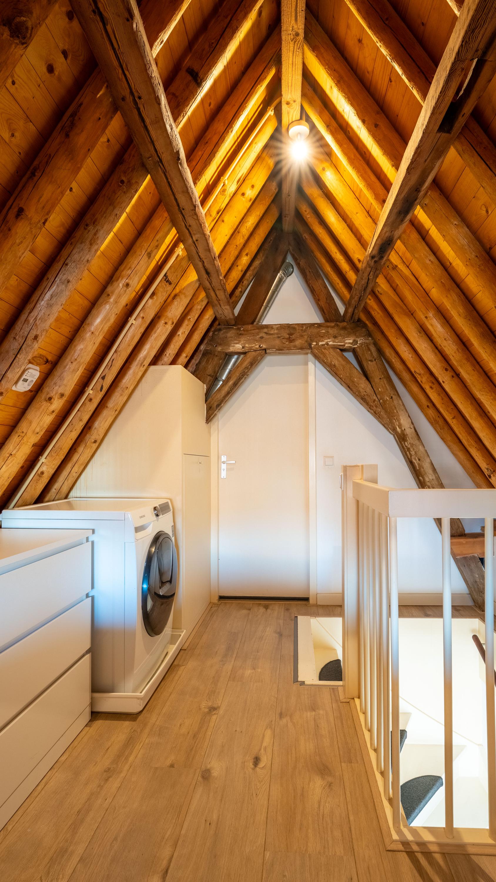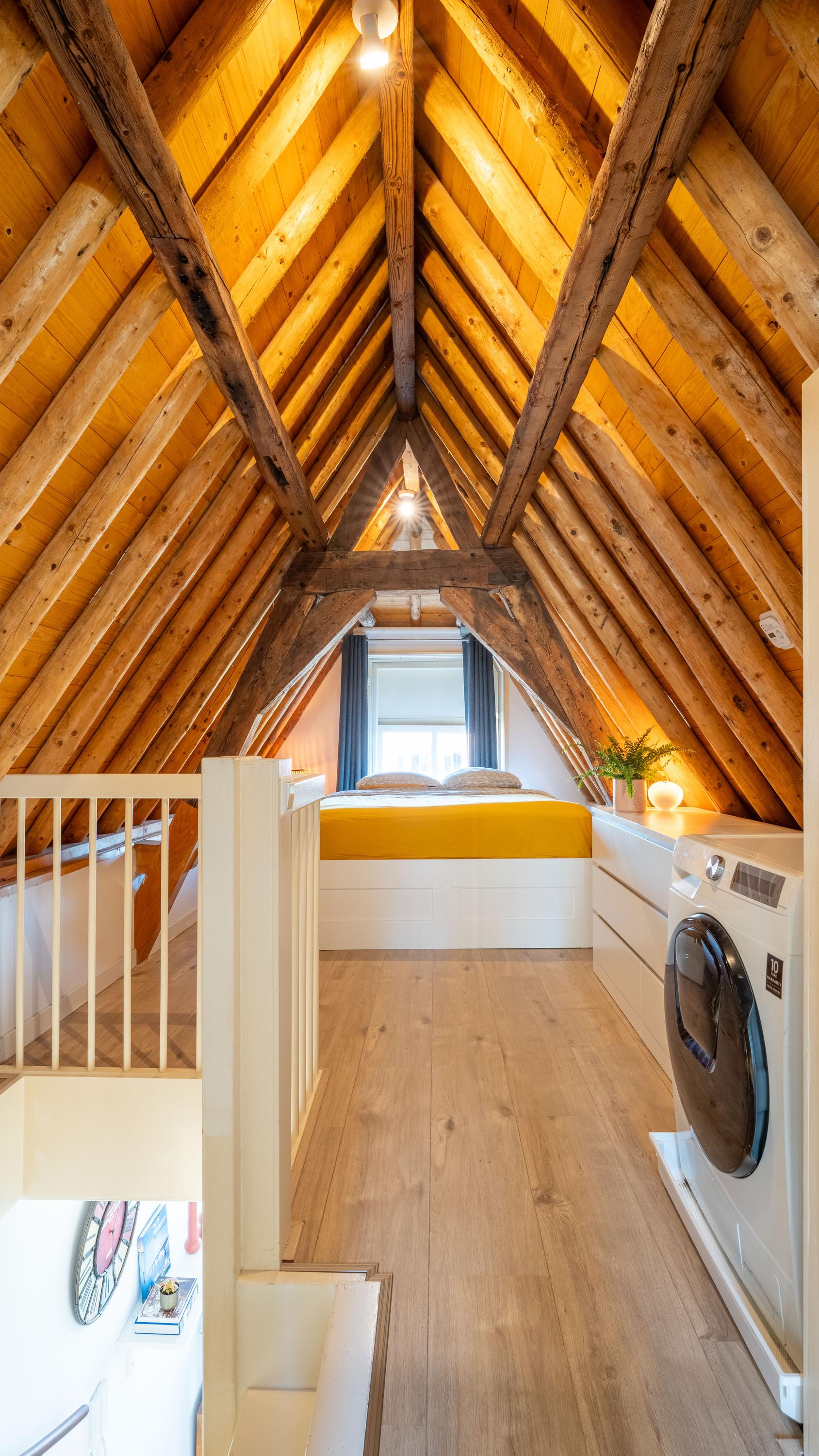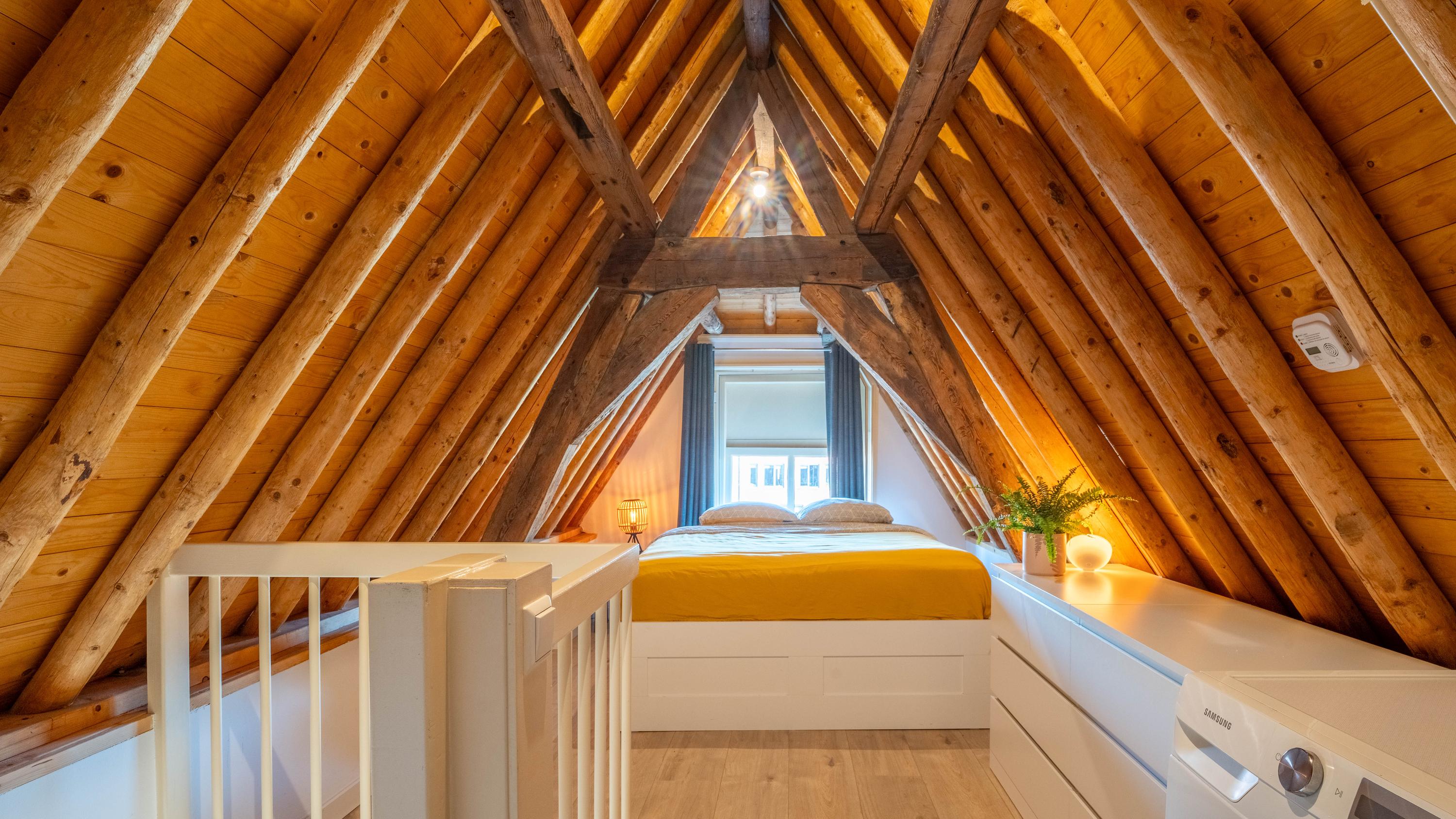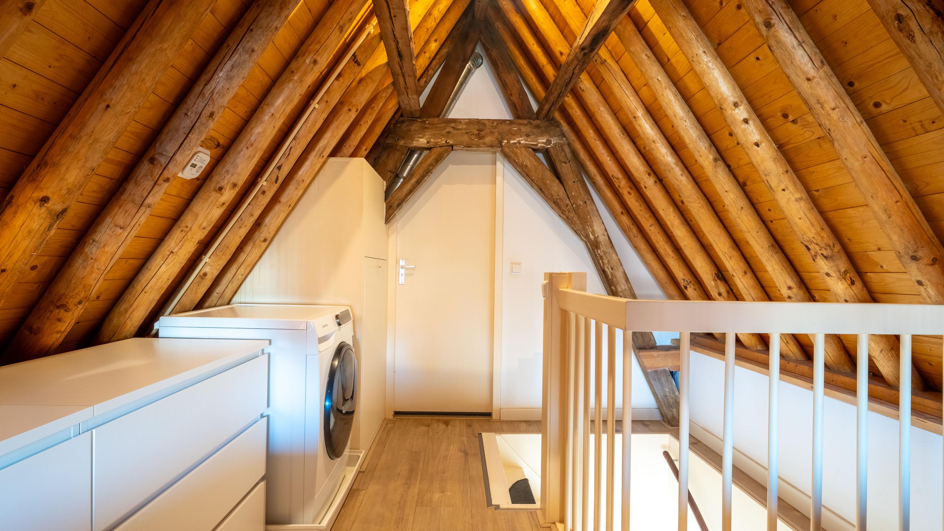 Met de vaste trap bereik je de tweede etage, waar direct de sfeer opvalt van de zichtbare kapconstructie. De slaapkamer is ondergebracht in deze romantische en karaktervolle verdieping, waar de fraaie houten balken een warme en unieke uitstraling geven. Ook de badkamer bevindt zich op deze etage en sluit qua sfeer mooi aan bij de rest van de woning. Deze is voorzien van een toilet, inloopdouche en wastafel. Het resultaat is een bijzonder sfeervol appartement waarin het moderne afwerkingsniveau niets afdoet aan het monumentale karakter.