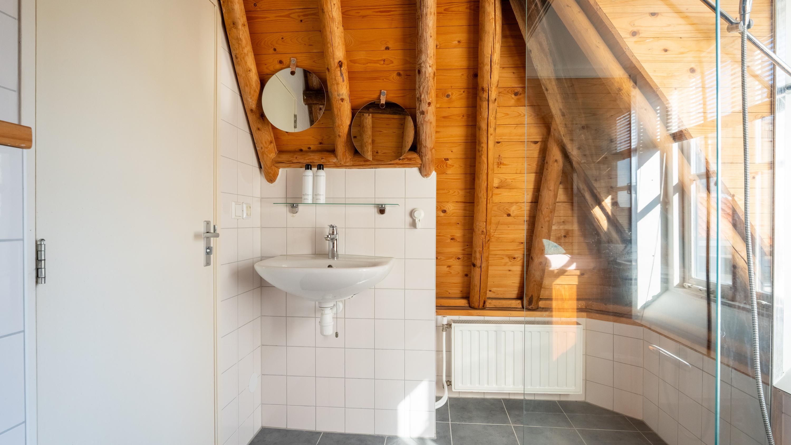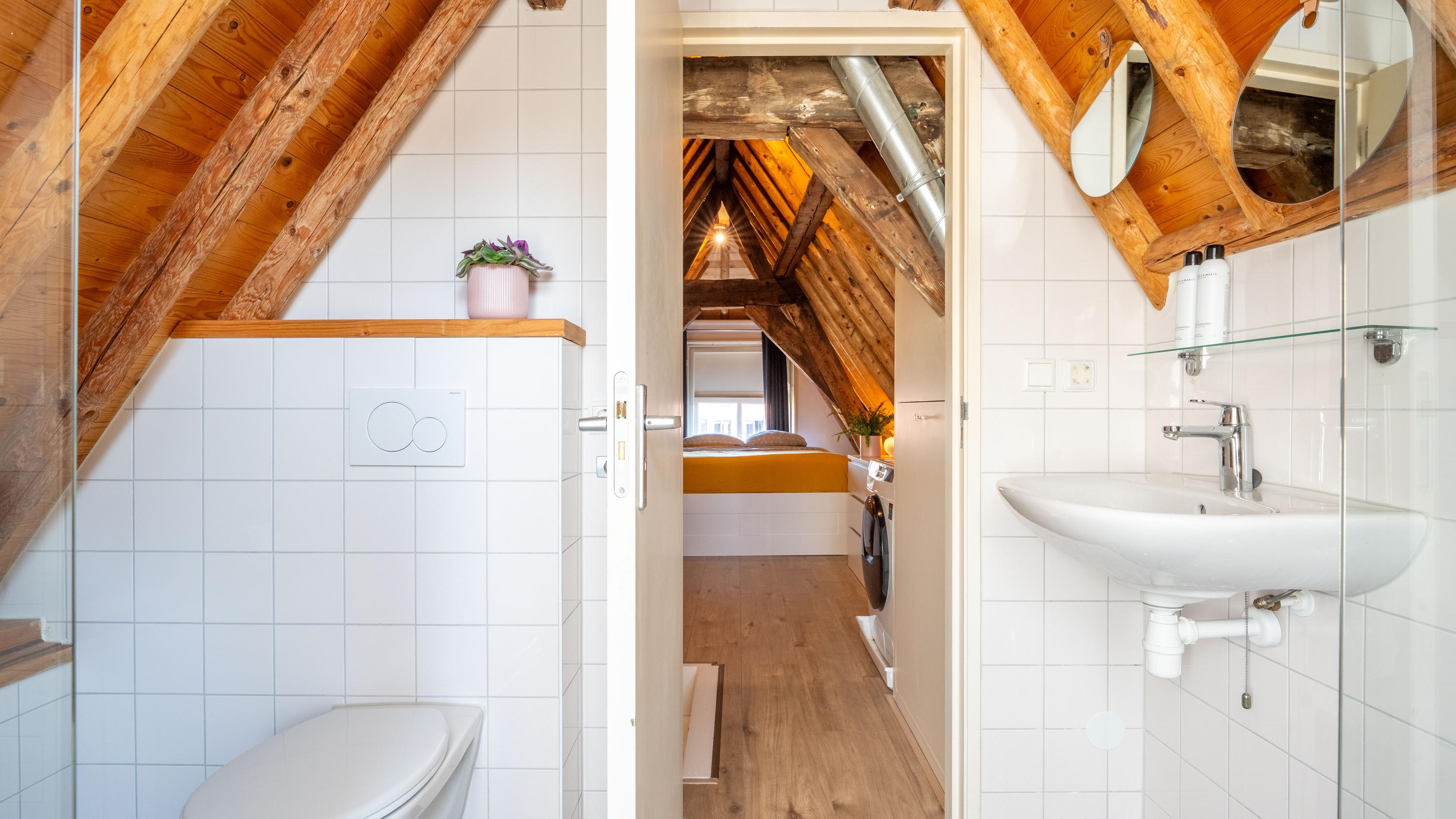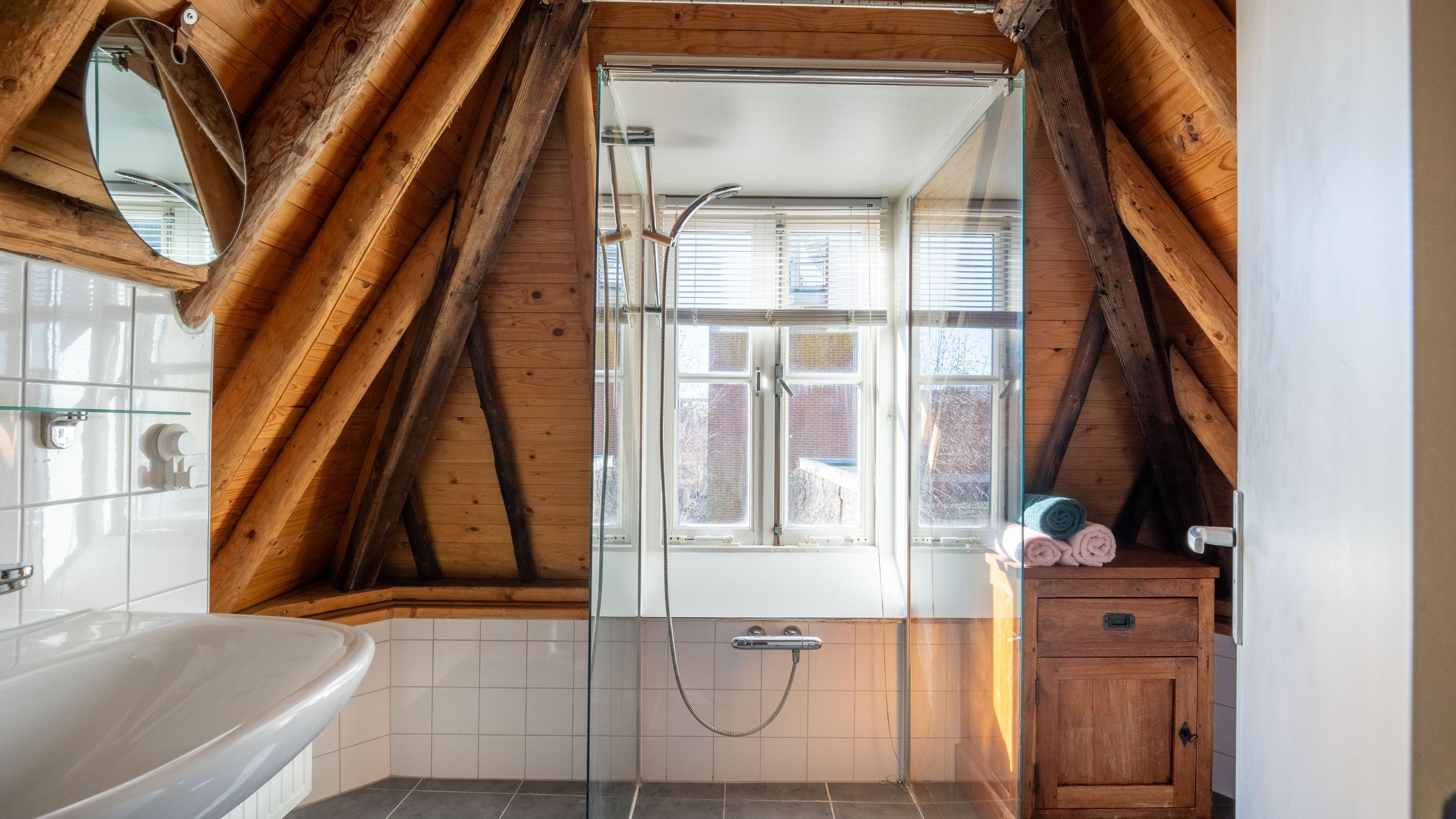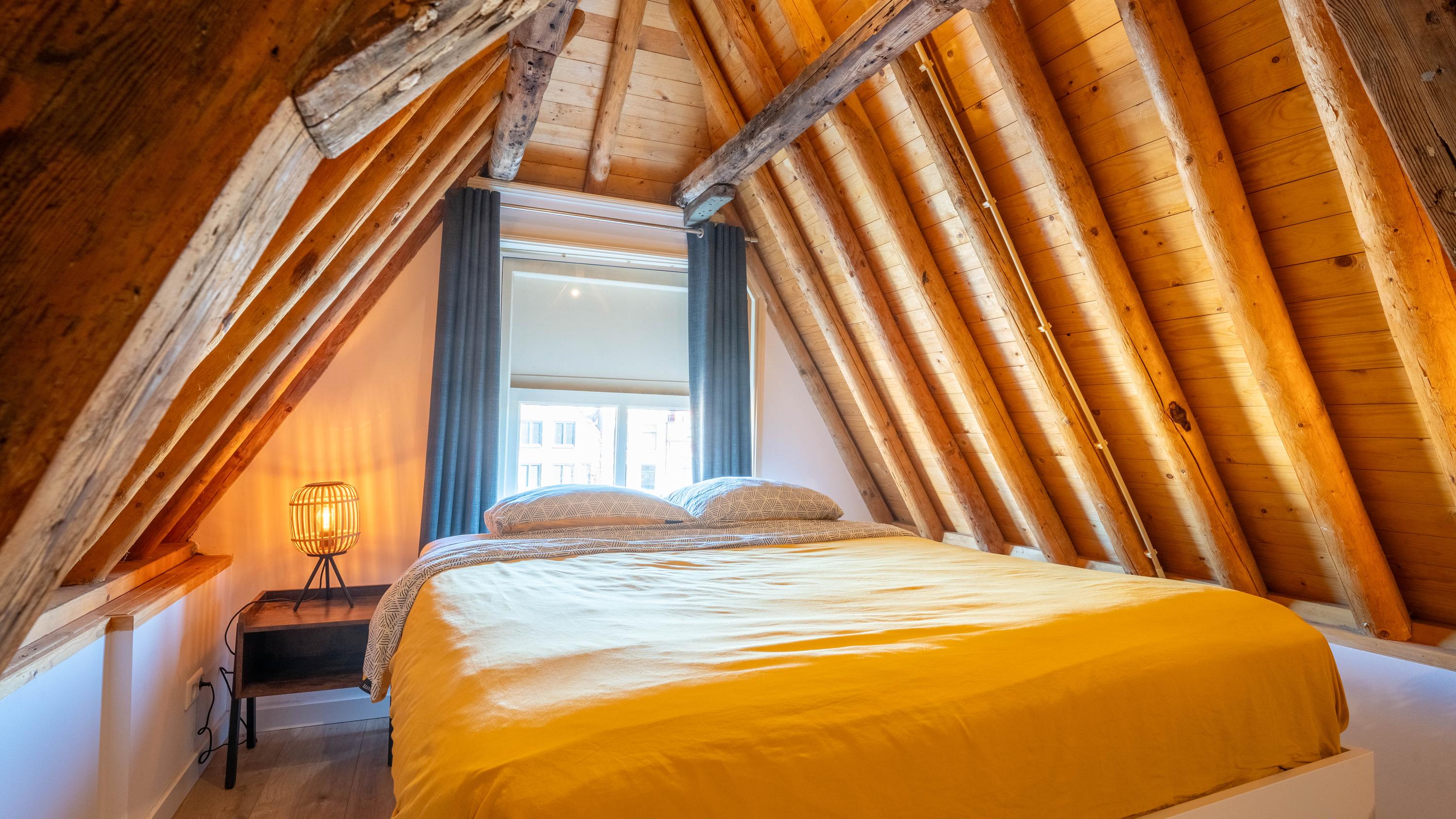 Met de vaste trap bereik je de tweede etage, waar direct de sfeer opvalt van de zichtbare kapconstructie. De slaapkamer is ondergebracht in deze romantische en karaktervolle verdieping, waar de fraaie houten balken een warme en unieke uitstraling geven. Ook de badkamer bevindt zich op deze etage en sluit qua sfeer mooi aan bij de rest van de woning. Deze is voorzien van een toilet, inloopdouche en wastafel. Het resultaat is een bijzonder sfeervol appartement waarin het moderne afwerkingsniveau niets afdoet aan het monumentale karakter.