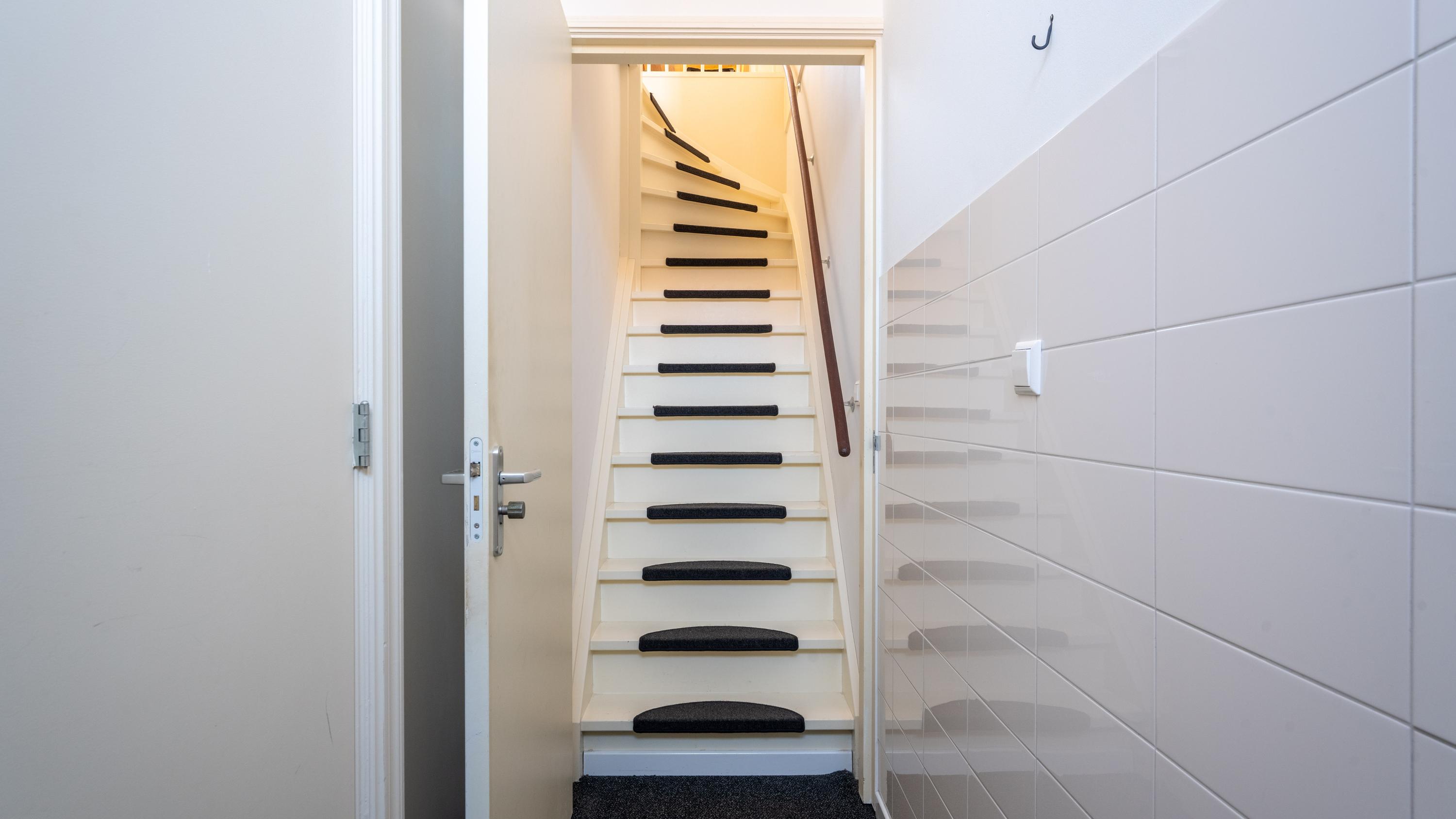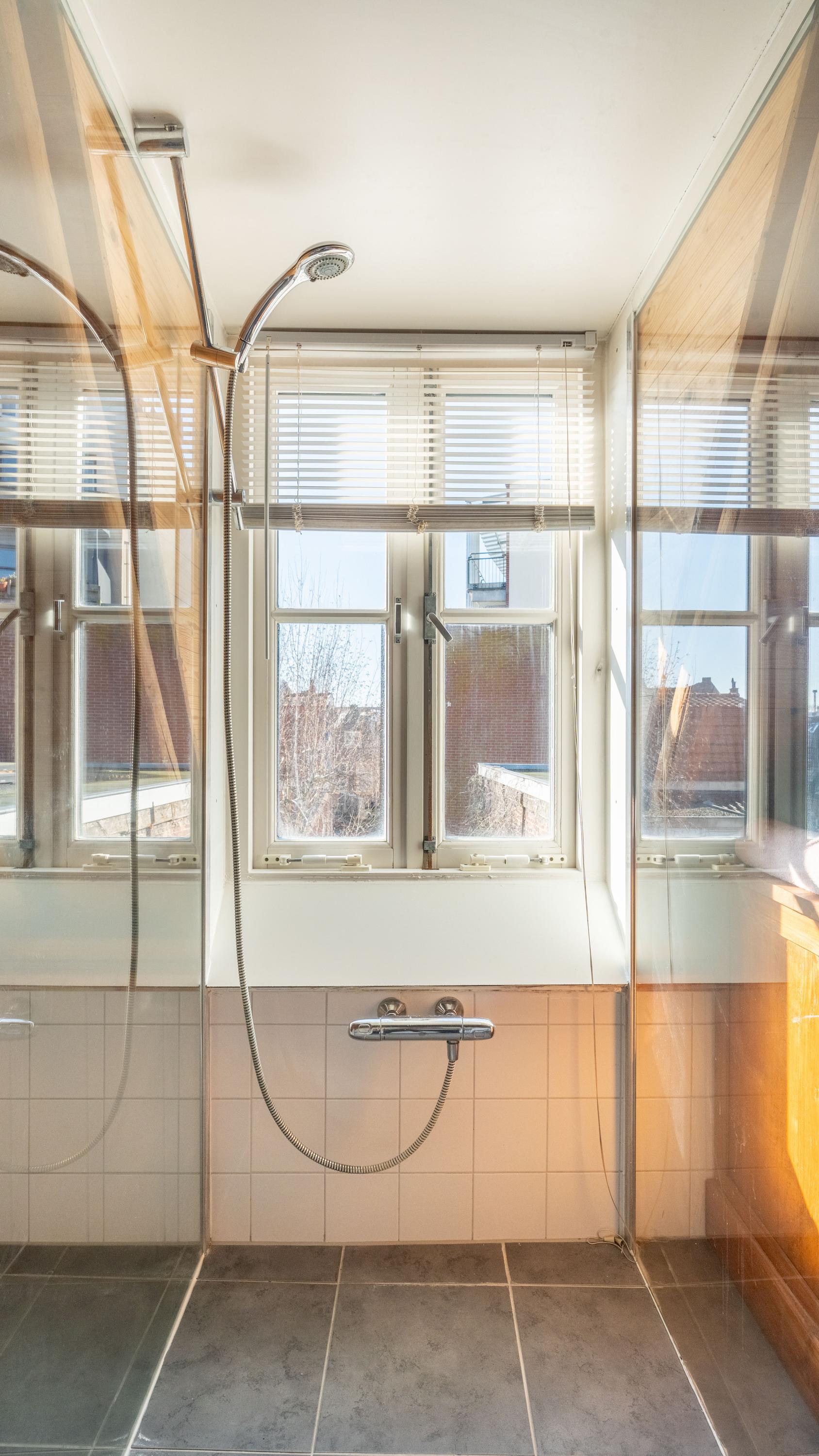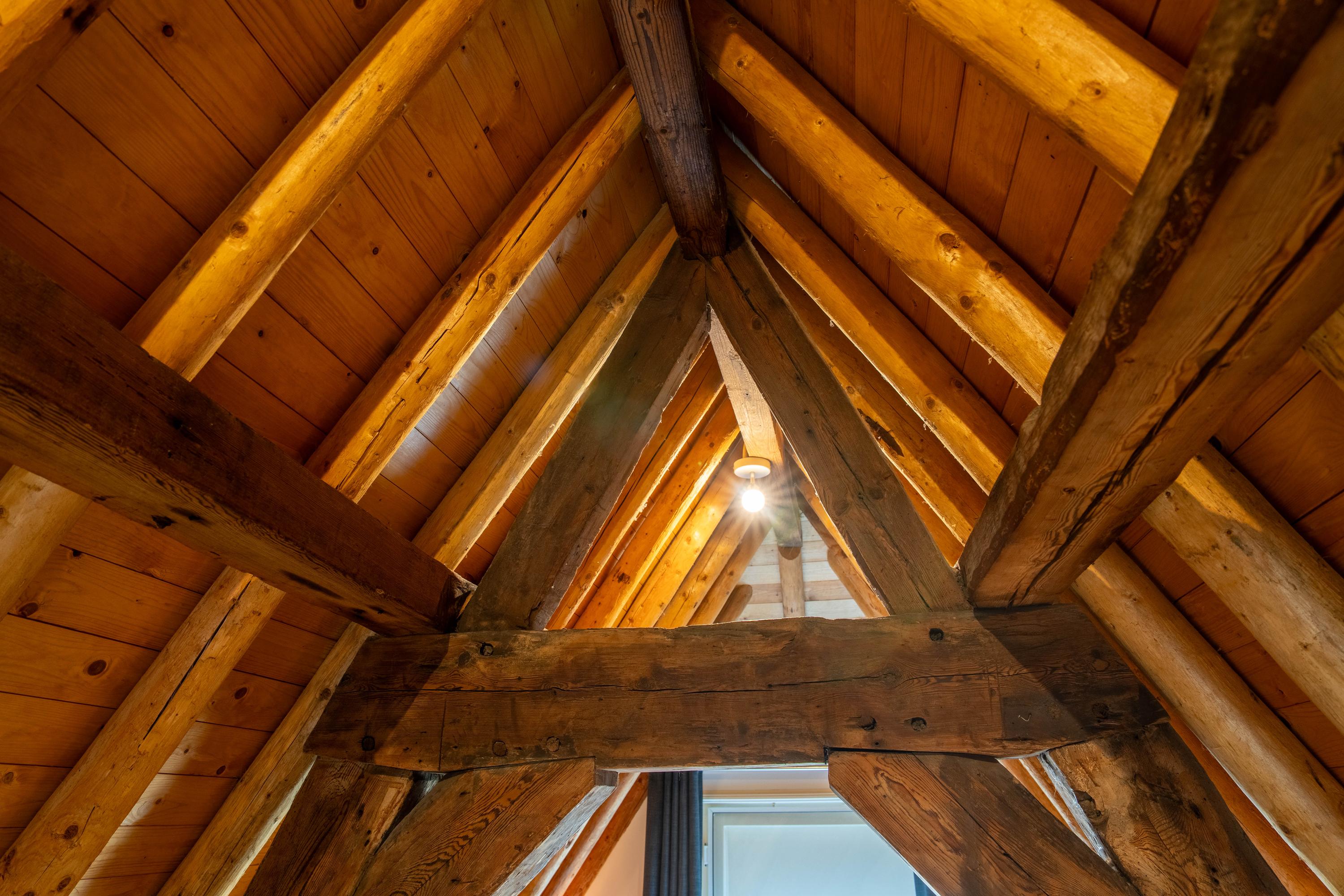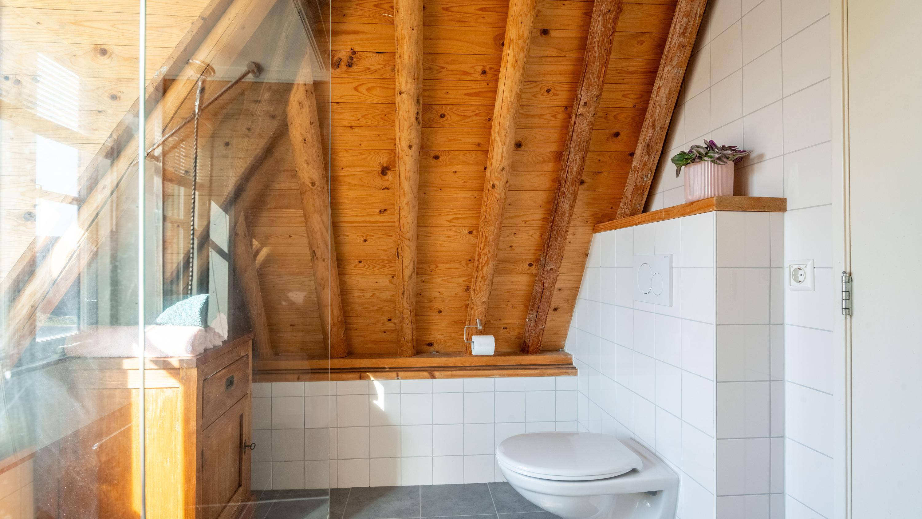 Met de vaste trap bereik je de tweede etage, waar direct de sfeer opvalt van de zichtbare kapconstructie. De slaapkamer is ondergebracht in deze romantische en karaktervolle verdieping, waar de fraaie houten balken een warme en unieke uitstraling geven. Ook de badkamer bevindt zich op deze etage en sluit qua sfeer mooi aan bij de rest van de woning. Deze is voorzien van een toilet, inloopdouche en wastafel. Het resultaat is een bijzonder sfeervol appartement waarin het moderne afwerkingsniveau niets afdoet aan het monumentale karakter.