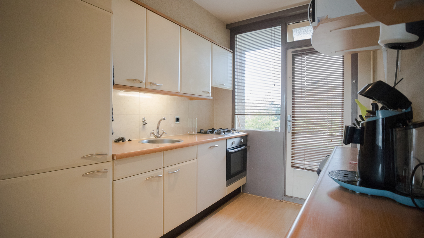 De keuken is praktisch ingericht en voorzien van een ingebouwde koelkast en vriezer, een gasstel én toegang tot een tweede balkon. Daarnaast is er extra opbergruimte aanwezig, ideaal voor de kookliefhebber.