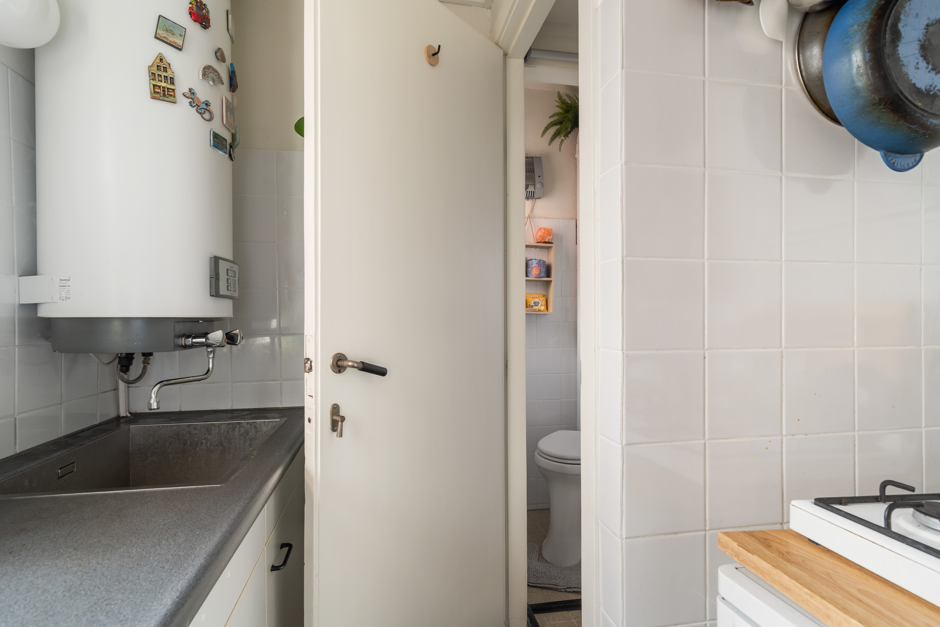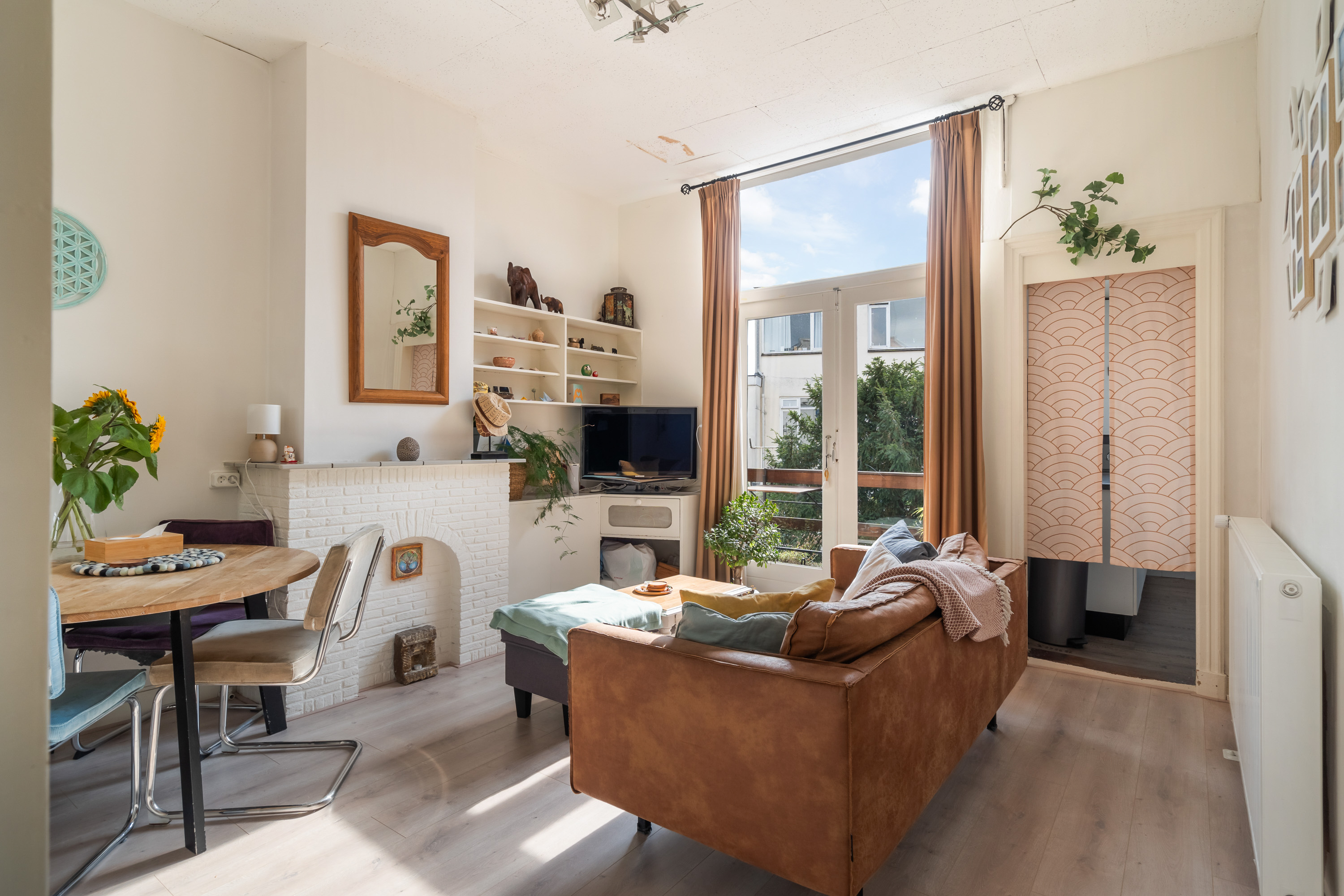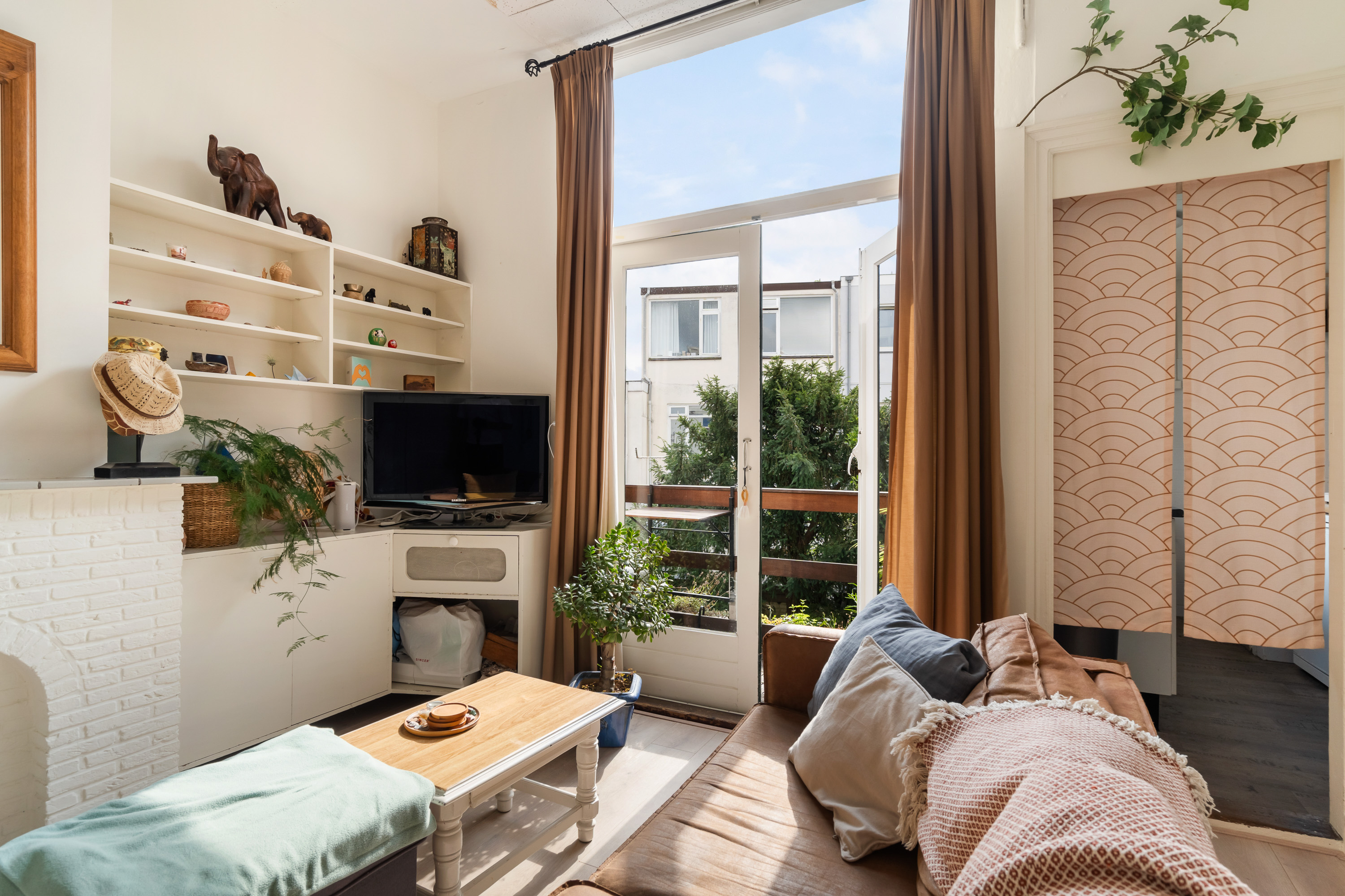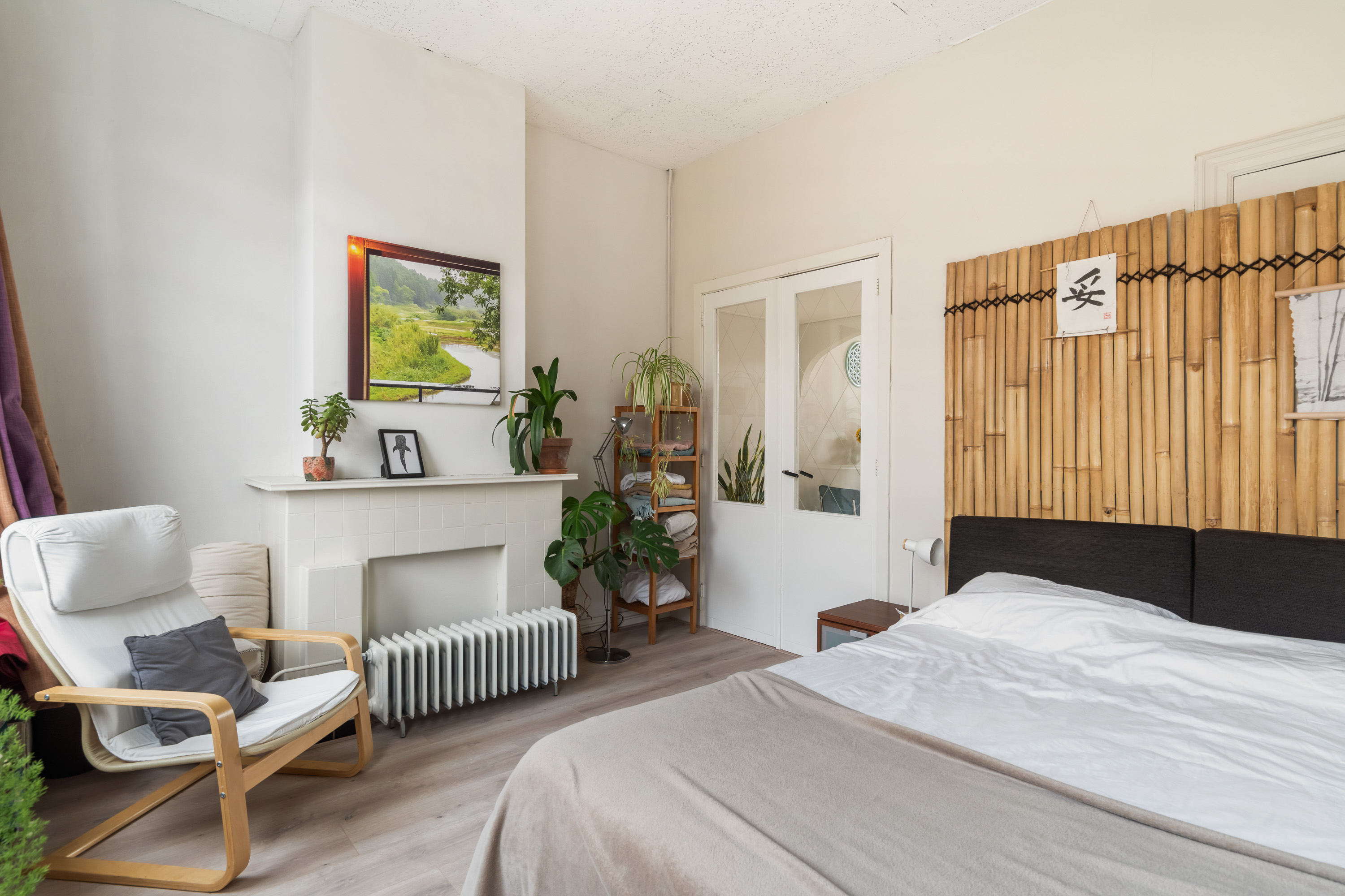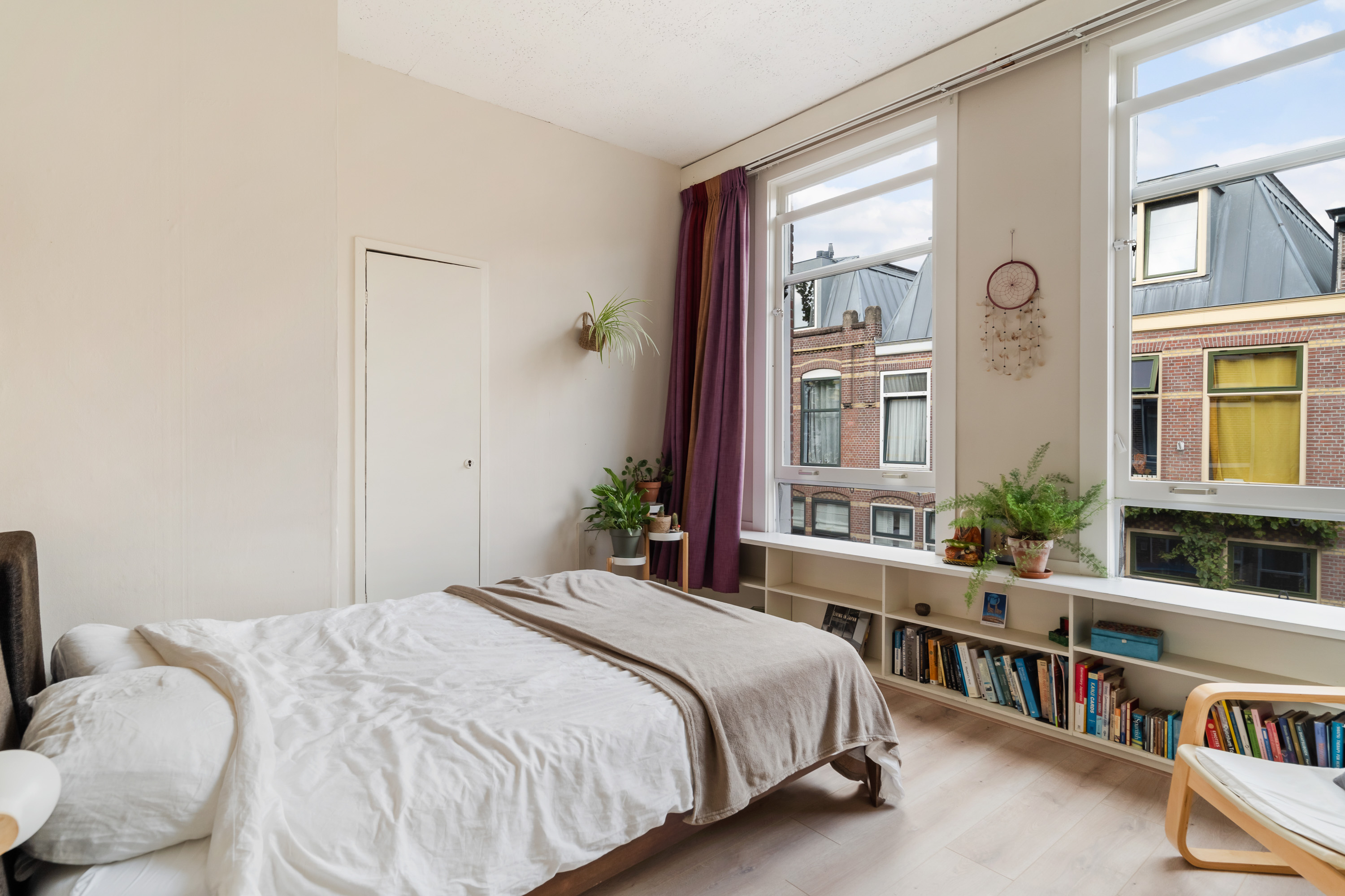 De ruime slaapkamer aan de voorzijde vangt zacht daglicht en biedt plek voor een groot bed én een werkhoek. Met een keukentje, badkamer en vele vaste inbouwkasten heb je hier alles wat je nodig hebt, zonder onnodige franje.