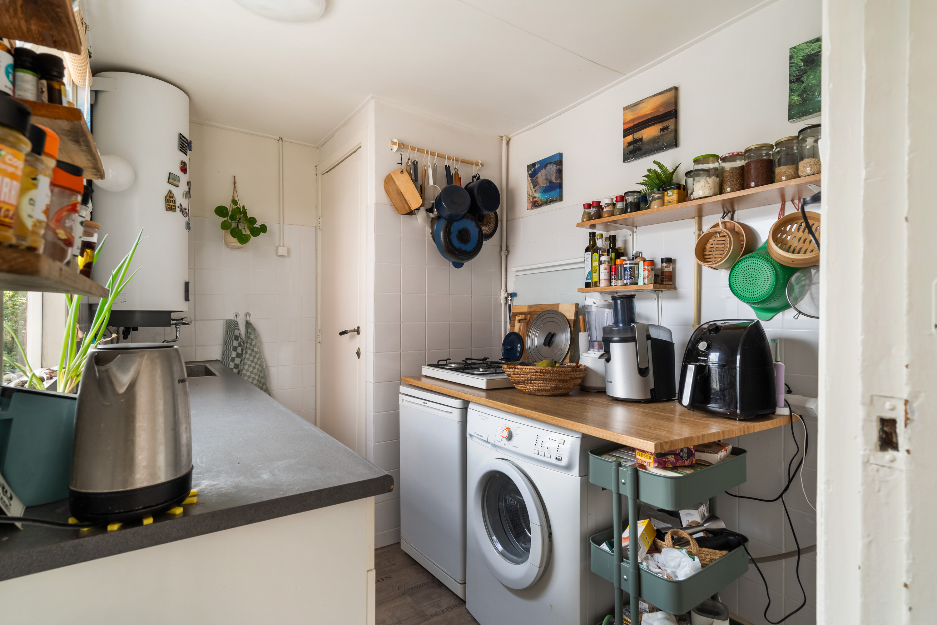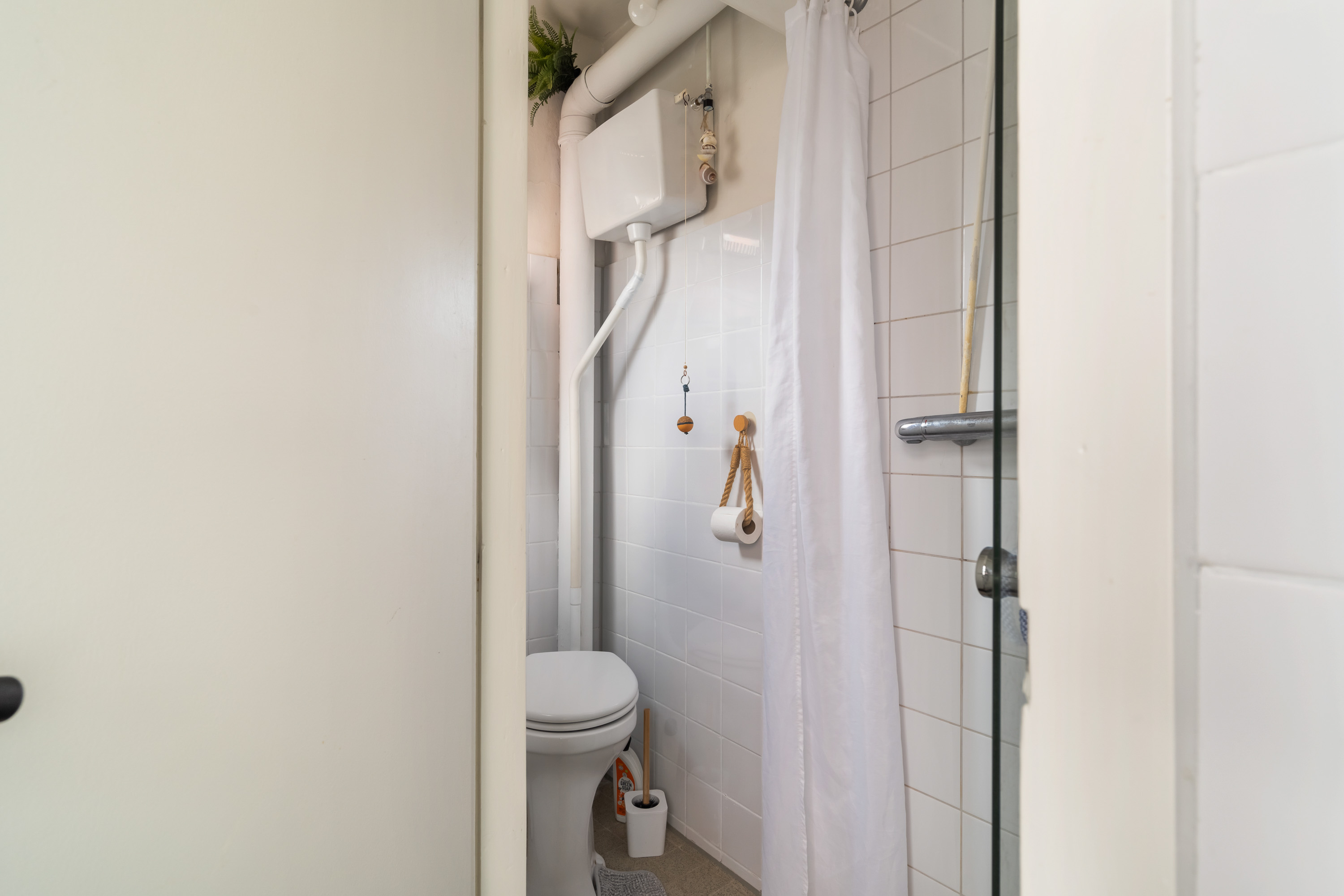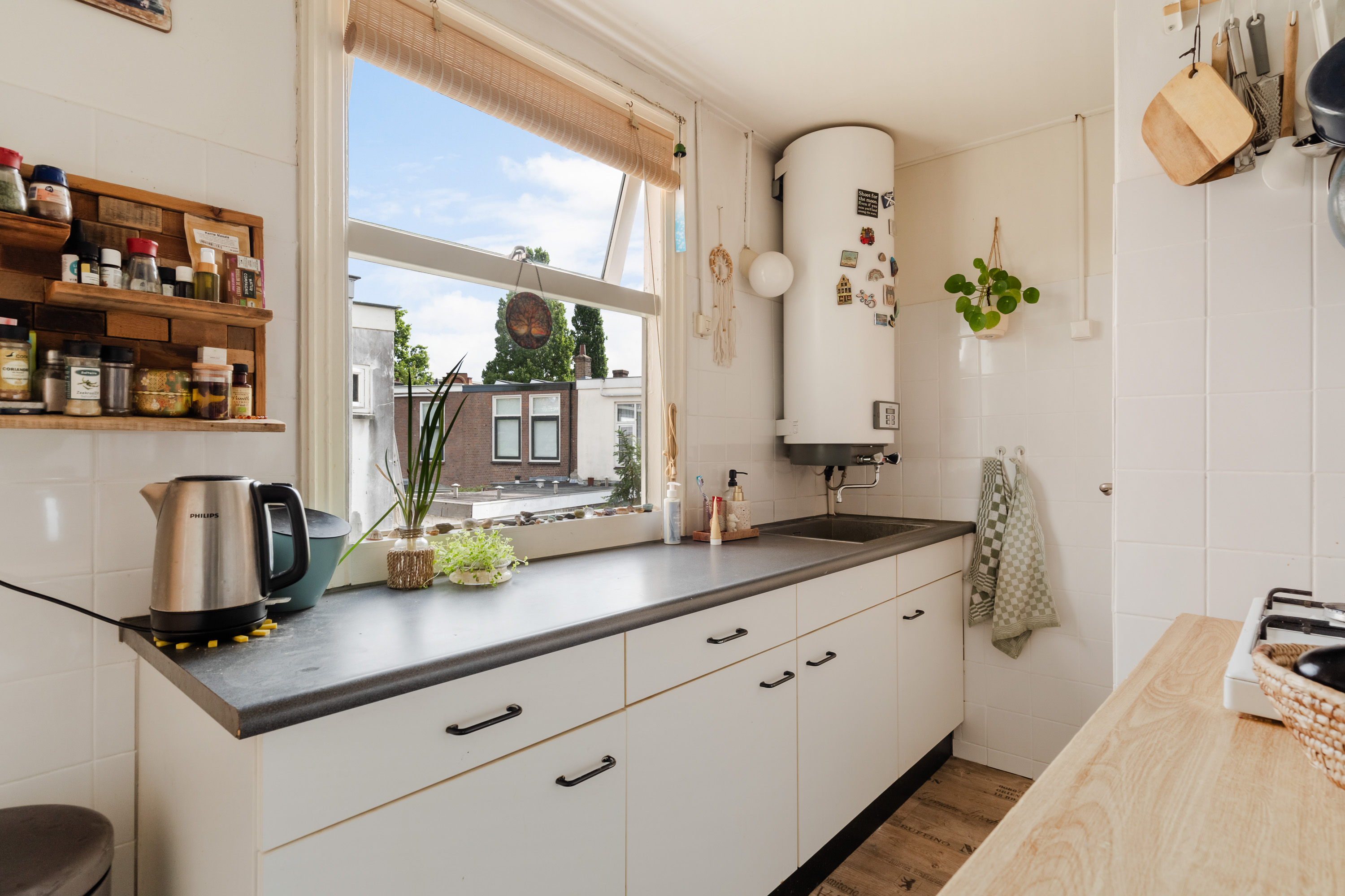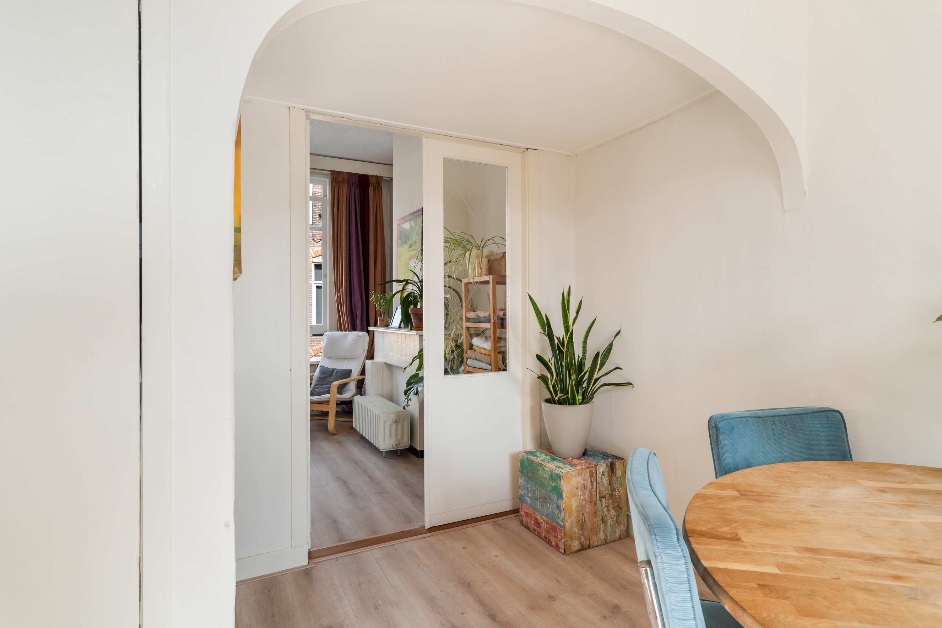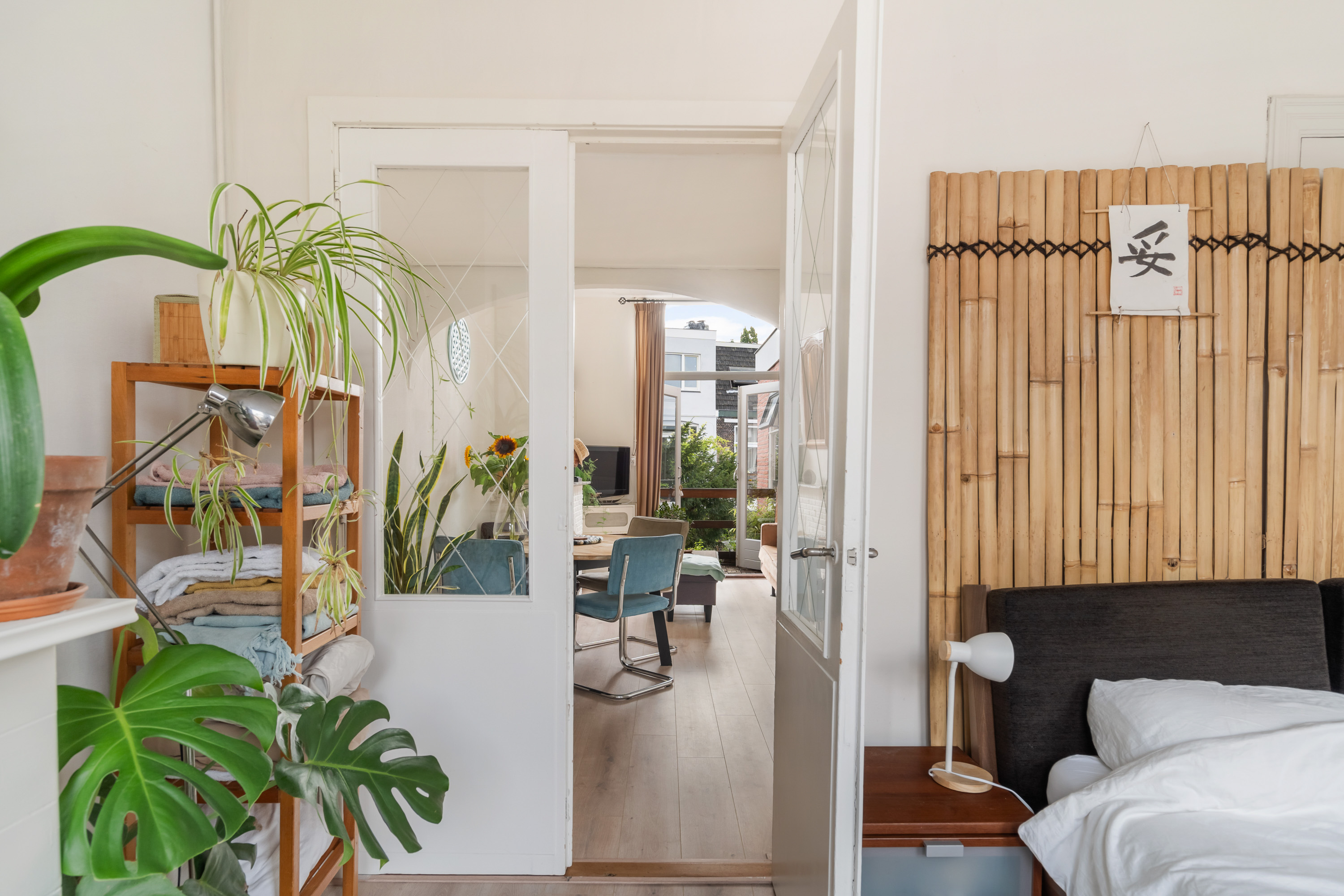 De ruime slaapkamer aan de voorzijde vangt zacht daglicht en biedt plek voor een groot bed én een werkhoek. Met een keukentje, badkamer en vele vaste inbouwkasten heb je hier alles wat je nodig hebt, zonder onnodige franje.