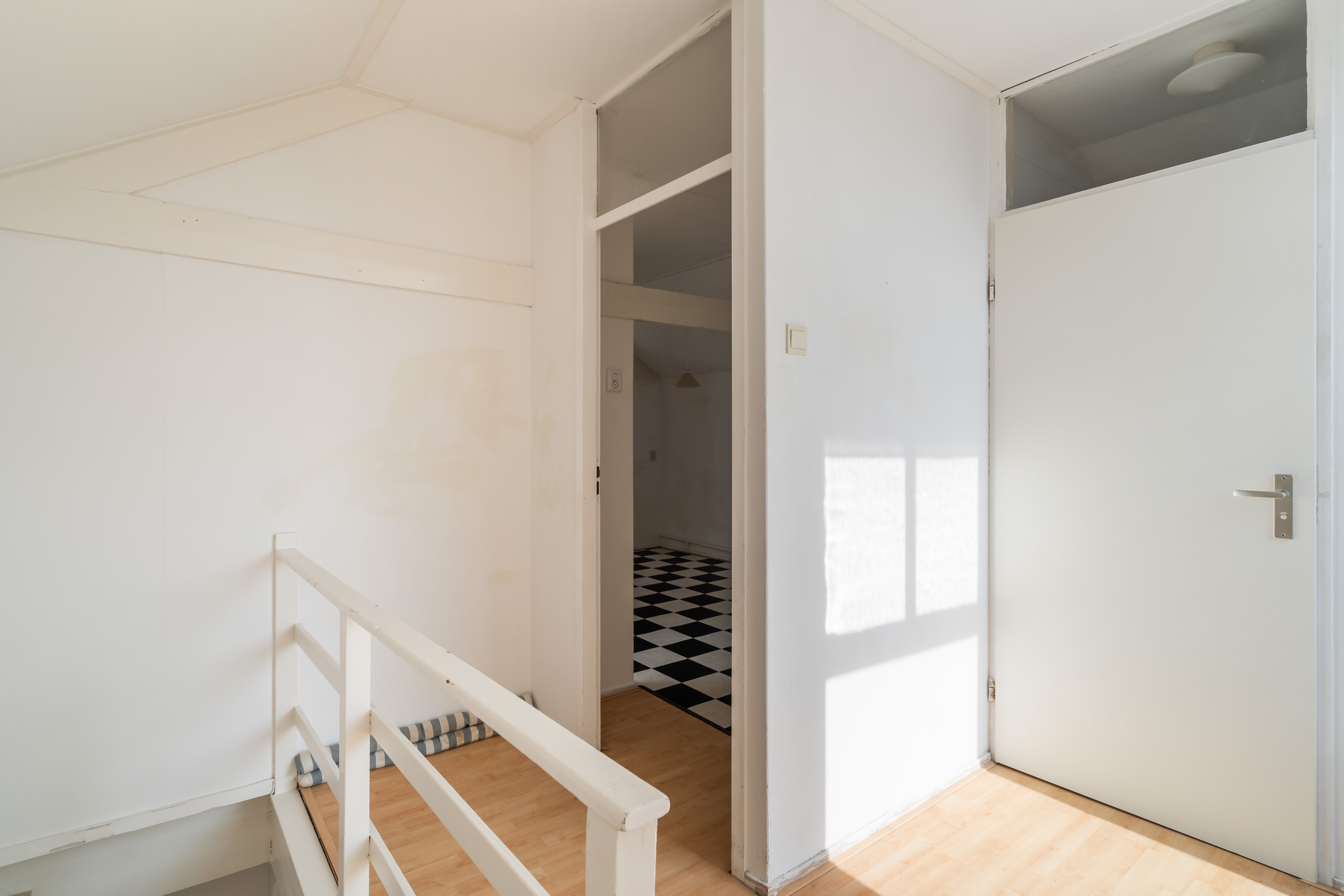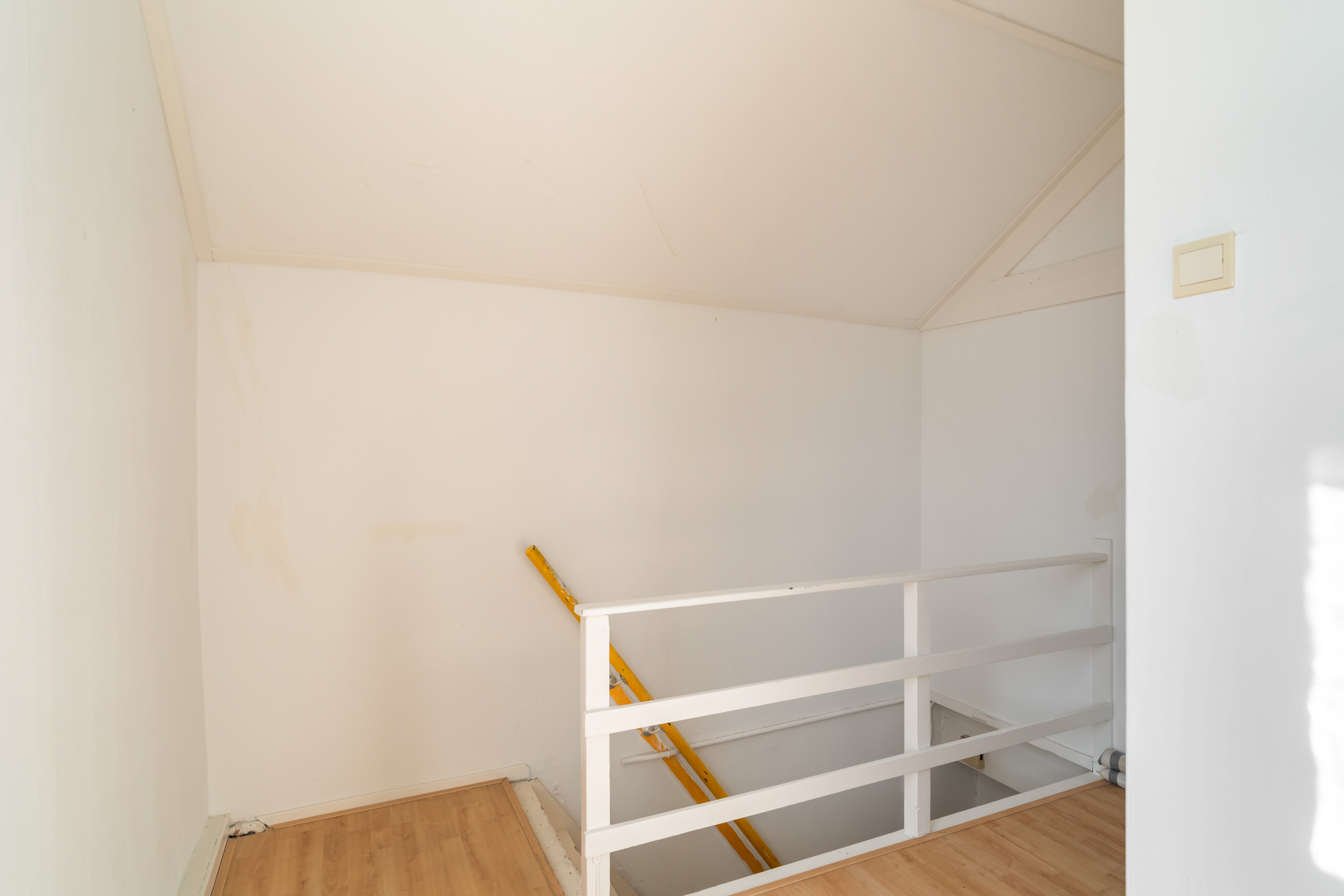 Onder de schuine kap op de tweede etage voel je meteen de sfeer. De zichtbare dakconstructie geeft karakter, de woonkamer aan de voorzijde is intiem en knus.
